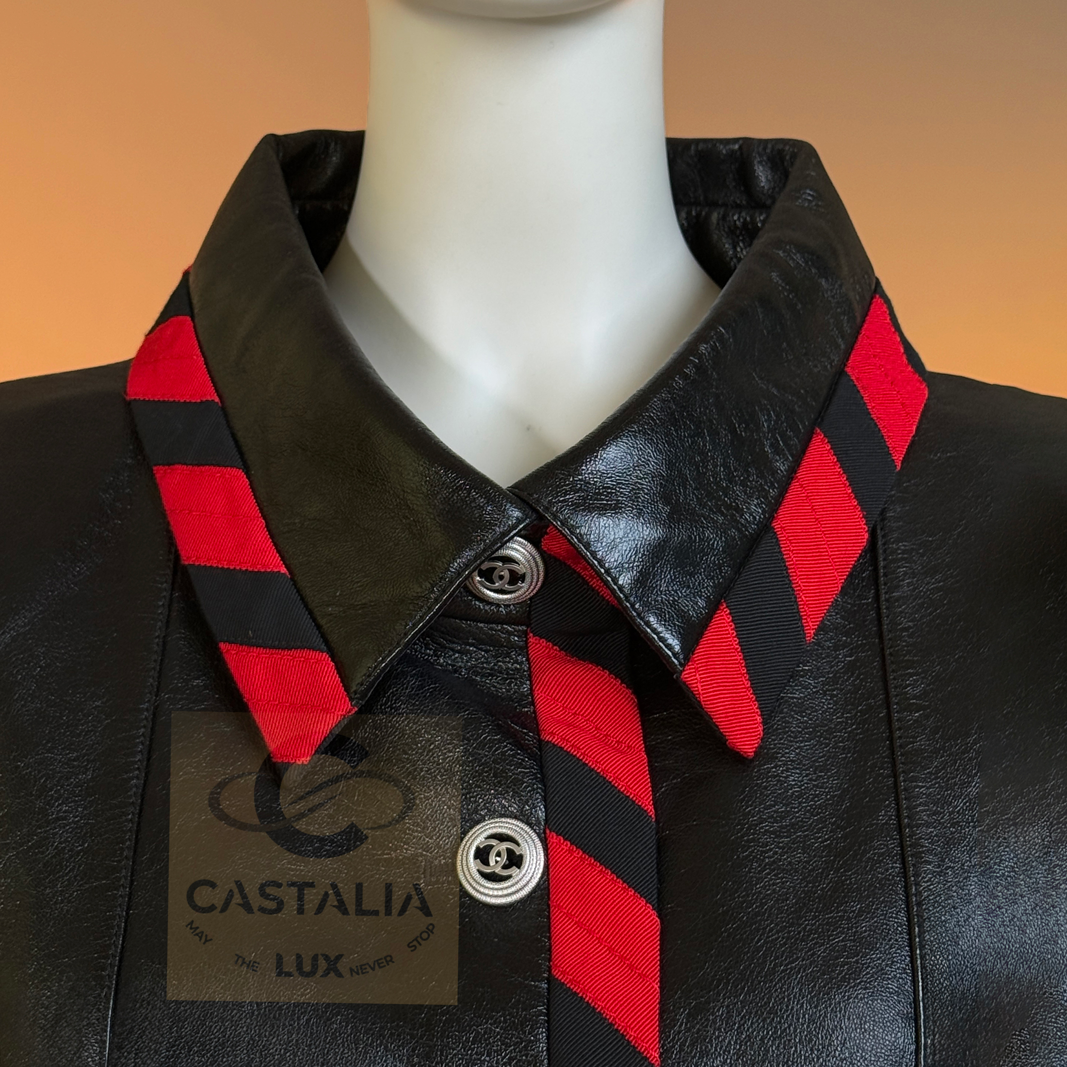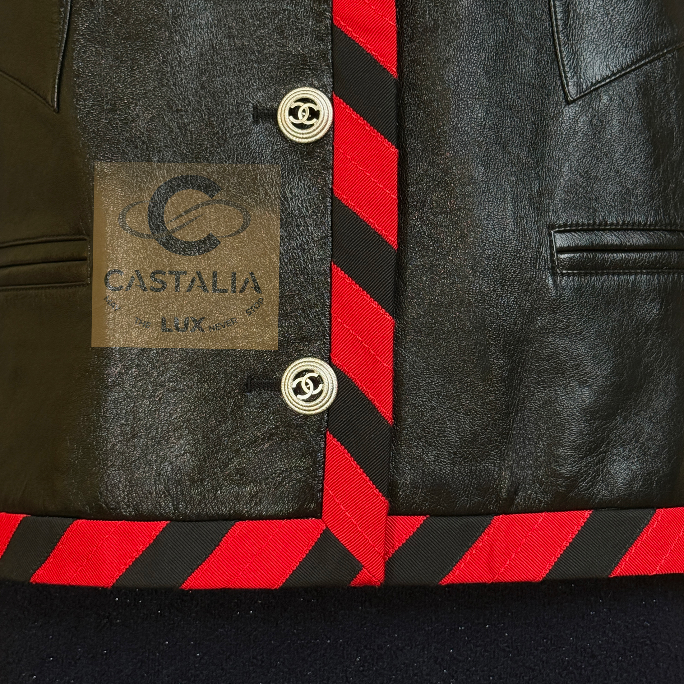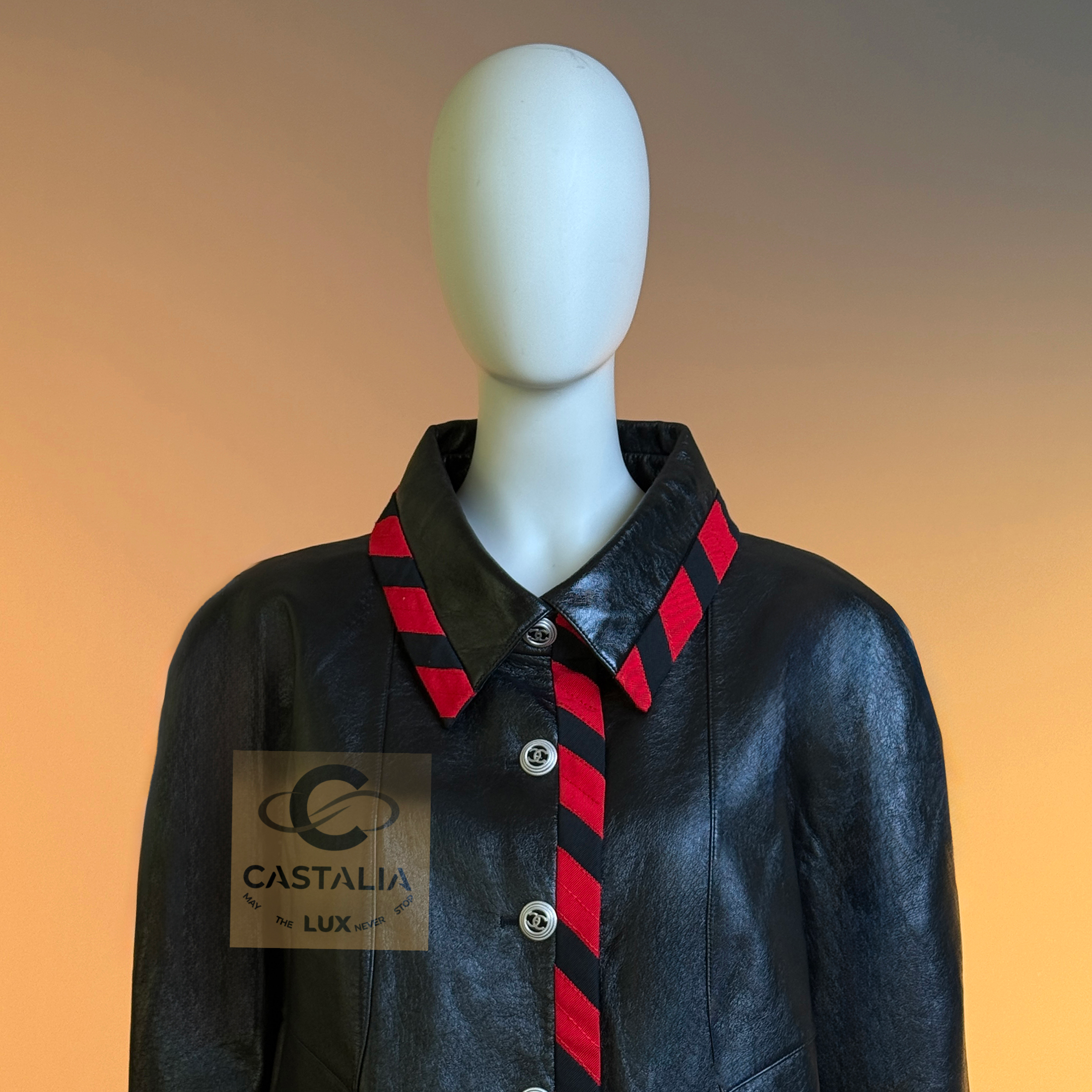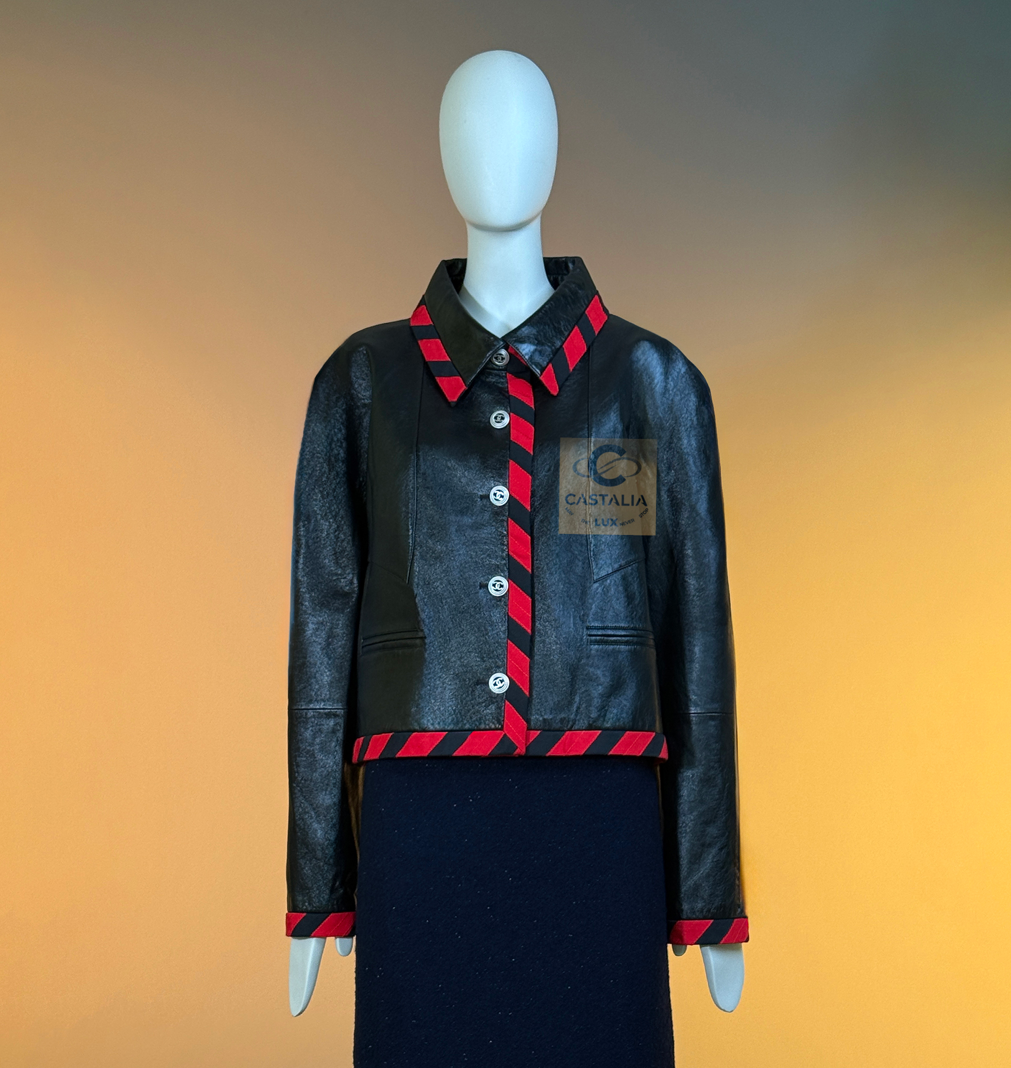 CHANEL · Iconic Ad Campaign Black Leather Jacket with CC Buttons — Spring 2020 “PARIS ROOFTOPS” Runway, Virginie Viard • Boutique value: over $15,000 — This is the Viard-era icon that became campaign image and magazine citation, worn by Kristen Stewart and Nana Komatsu because it reads instantly: sharp, urban, unmistakably Chanel Why this piece matters — Spring 2020 “Paris Rooftop” is Chanel at contemporary precision — Viard translating the House into a harder, sharper urban register without losing one syllable of its code // Size mark 50 FR / Condition: never worn // — House Codes · Material Authority — • Finest black leather — dense, supple, and nocturnal, with a lived sheen that catches light like rooftop asphalt after rain • Contrast red stripe trim — graphic, disciplined, and aggressive in its clarity; a Chanel border rewritten as urban signage • A composition that feels cinematic: minimal surface, maximal statement — Jewels · Seals · Talisman Hardware — • CC logo buttons down the front — metallic punctuation, functioning as official stamps rather than ornament — Silhouette · Presence — • Modernist cropped architecture — clean lines, decisive collar, precise proportions designed to photograph with authority. • Black silk lining inside — the private completion, calm against the skin, exact in drape