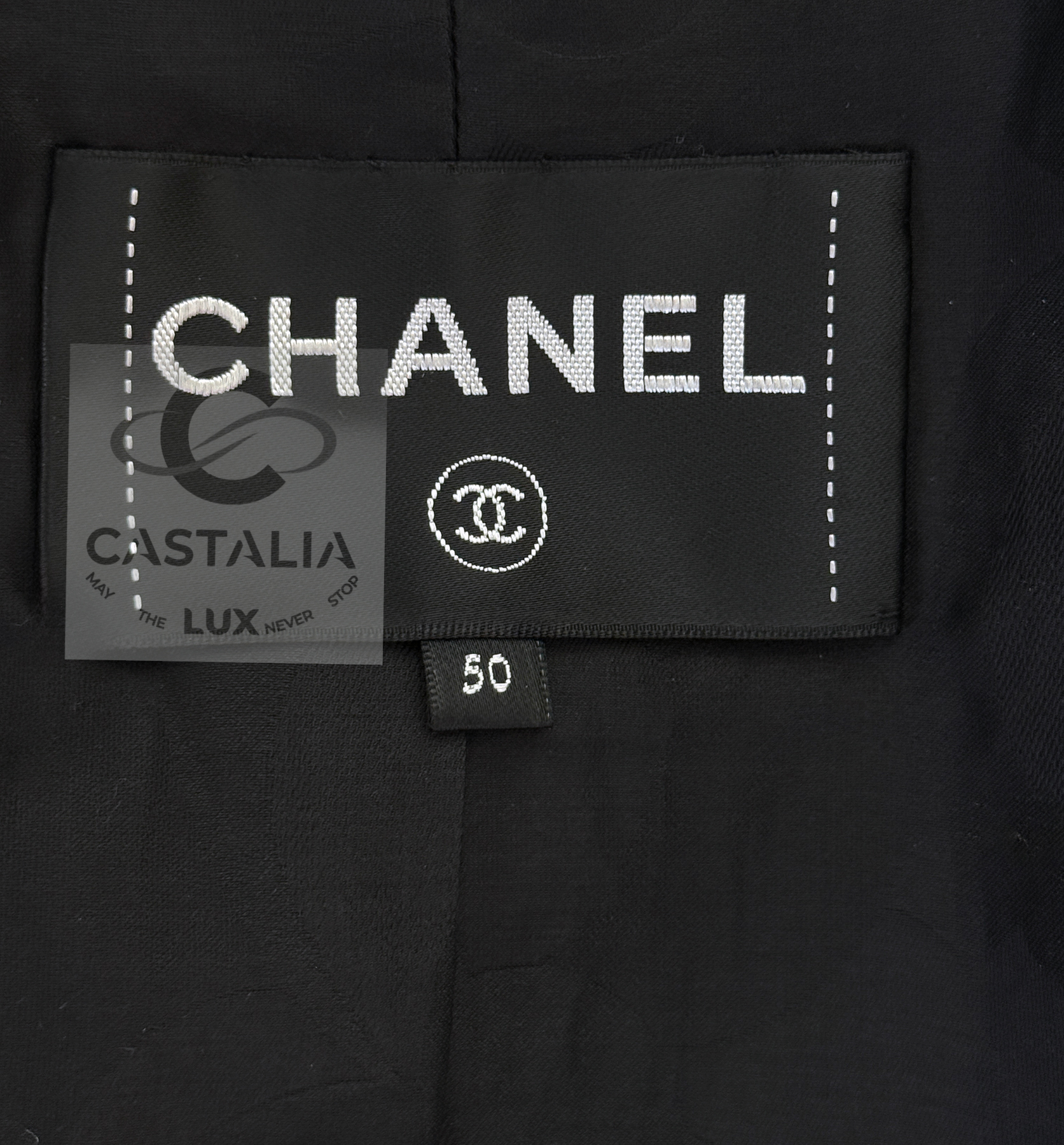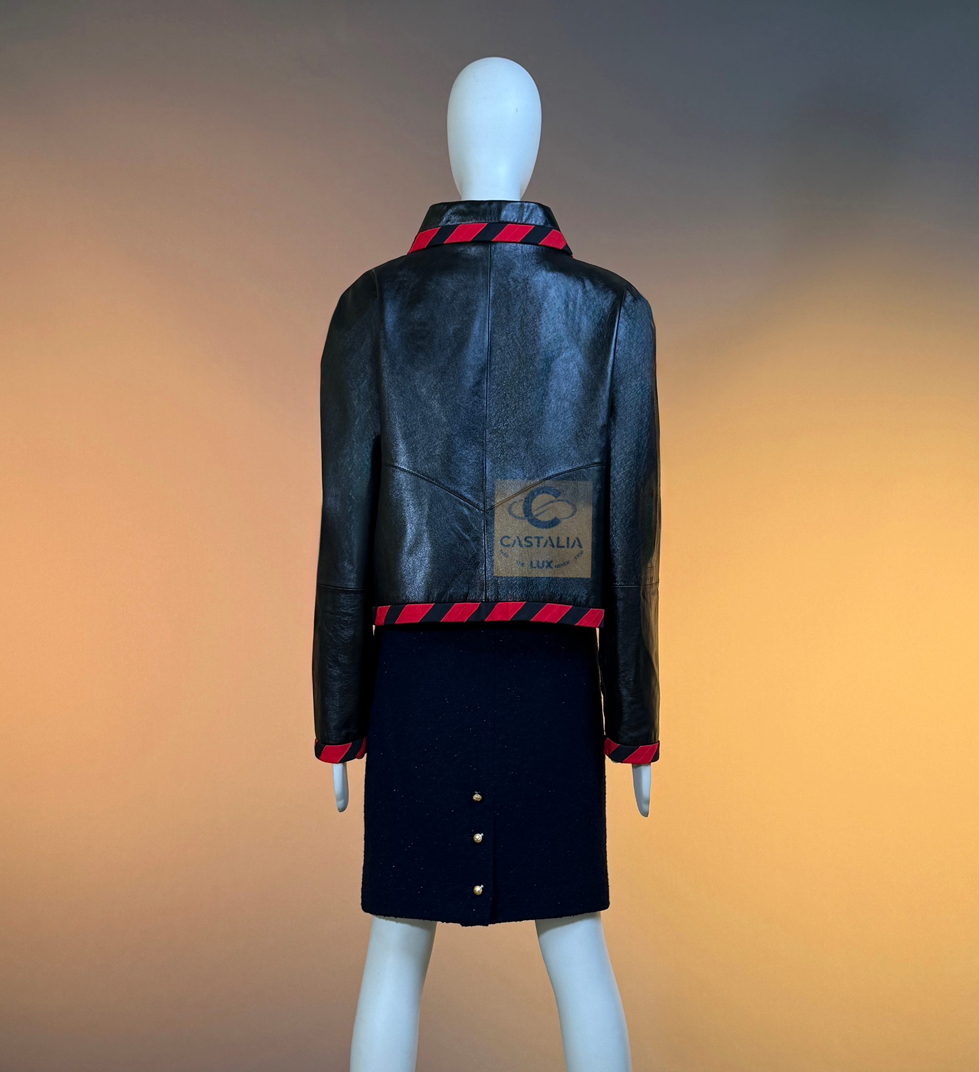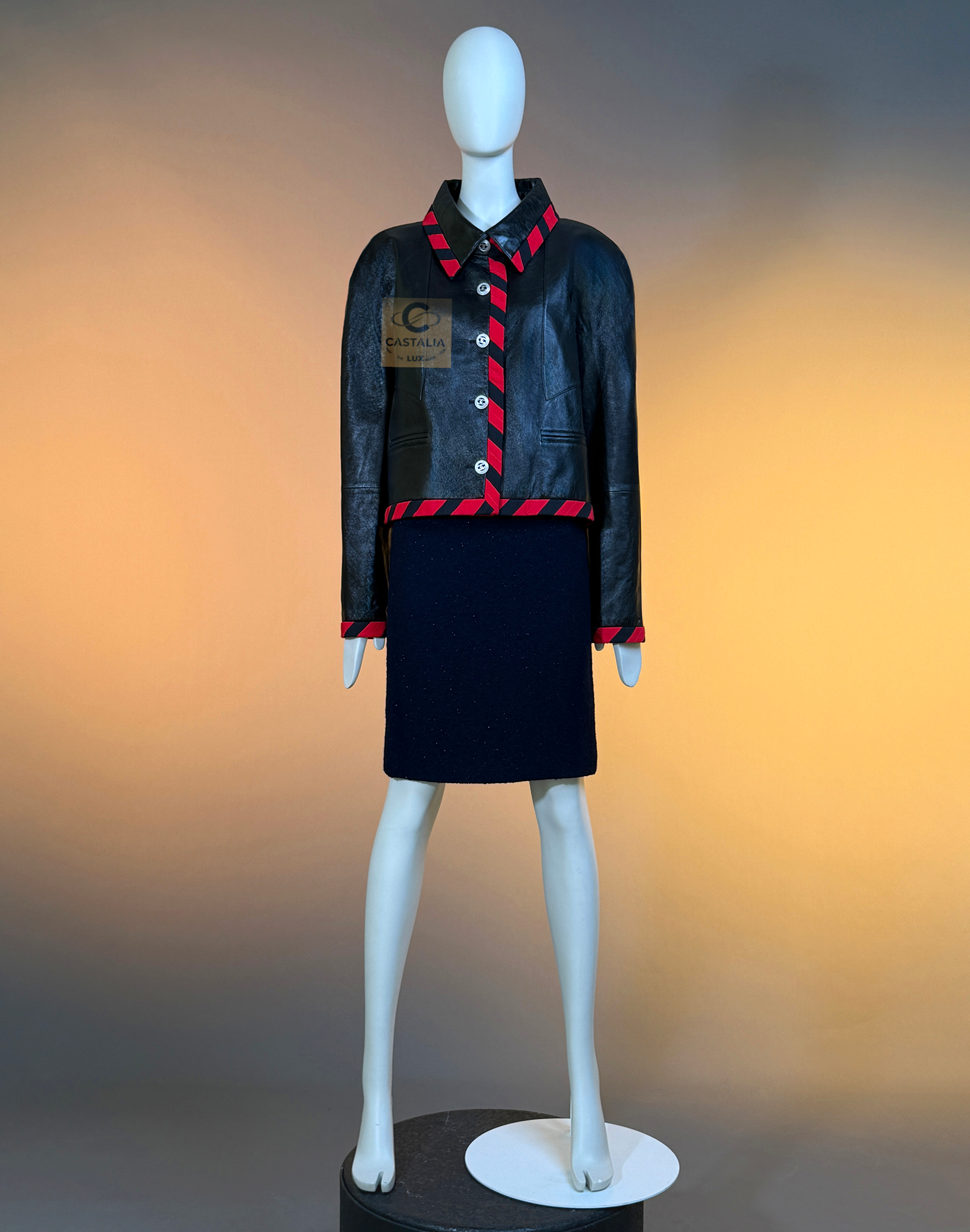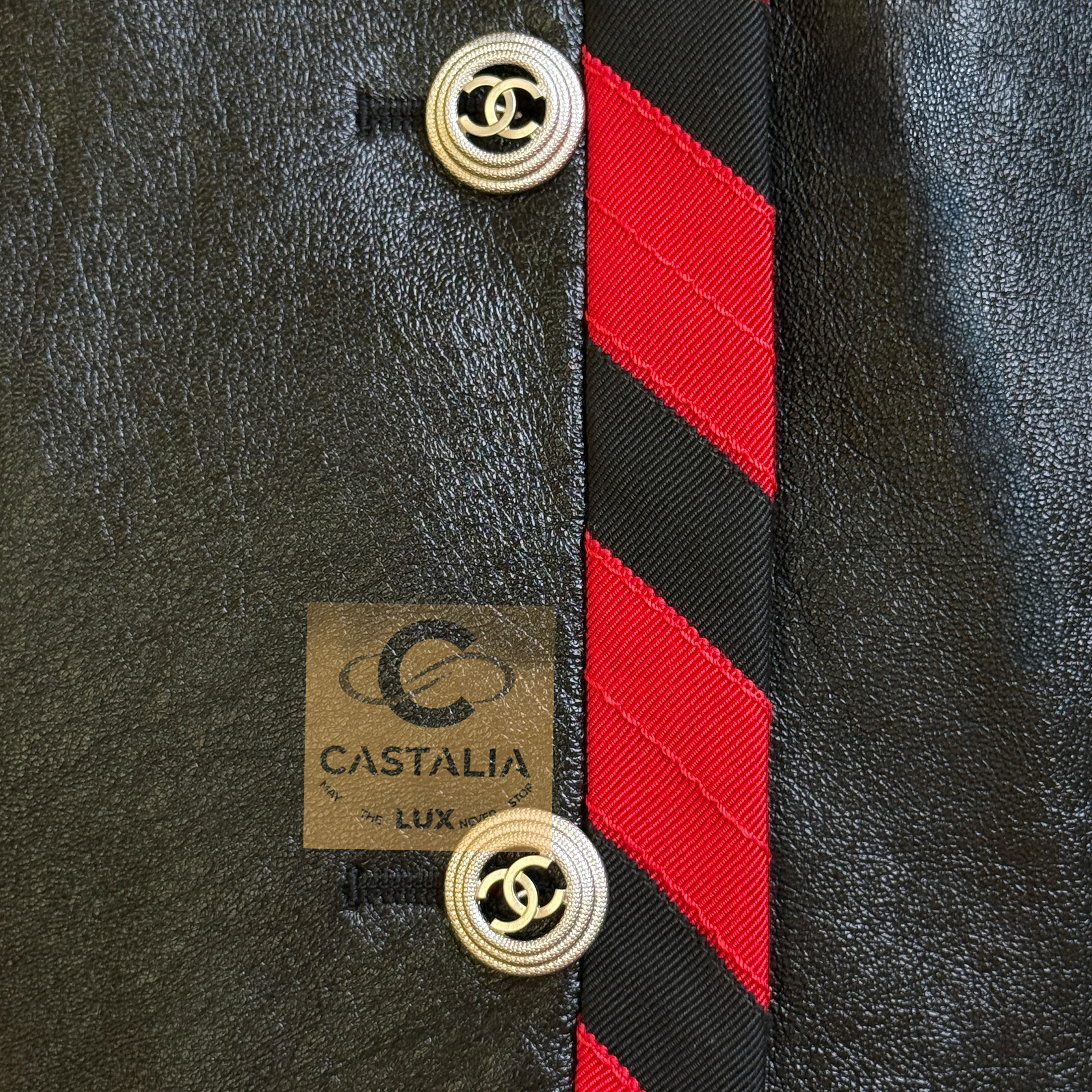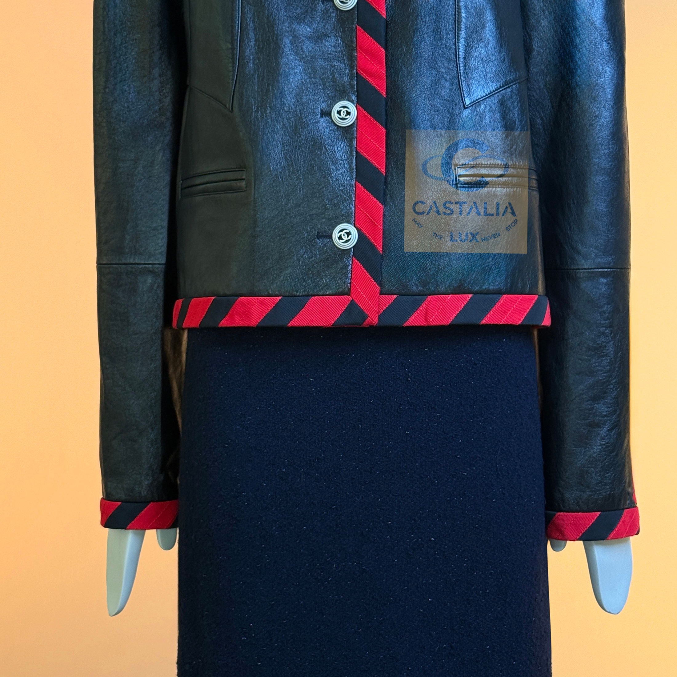 CHANEL · Iconic Ad Campaign Black Leather Jacket with CC Buttons — Spring 2020 “PARIS ROOFTOPS” Runway, Virginie Viard • Boutique value: over $15,000 — This is the Viard-era icon that became campaign image and magazine citation, worn by Kristen Stewart and Nana Komatsu because it reads instantly: sharp, urban, unmistakably Chanel Why this piece matters — Spring 2020 “Paris Rooftop” is Chanel at contemporary precision — Viard translating the House into a harder, sharper urban register without losing one syllable of its code // Size mark 50 FR / Condition: never worn // — House Codes · Material Authority — • Finest black leather — dense, supple, and nocturnal, with a lived sheen that catches light like rooftop asphalt after rain • Contrast red stripe trim — graphic, disciplined, and aggressive in its clarity; a Chanel border rewritten as urban signage • A composition that feels cinematic: minimal surface, maximal statement — Jewels · Seals · Talisman Hardware — • CC logo buttons down the front — metallic punctuation, functioning as official stamps rather than ornament — Silhouette · Presence — • Modernist cropped architecture — clean lines, decisive collar, precise proportions designed to photograph with authority. • Black silk lining inside — the private completion, calm against the skin, exact in drape