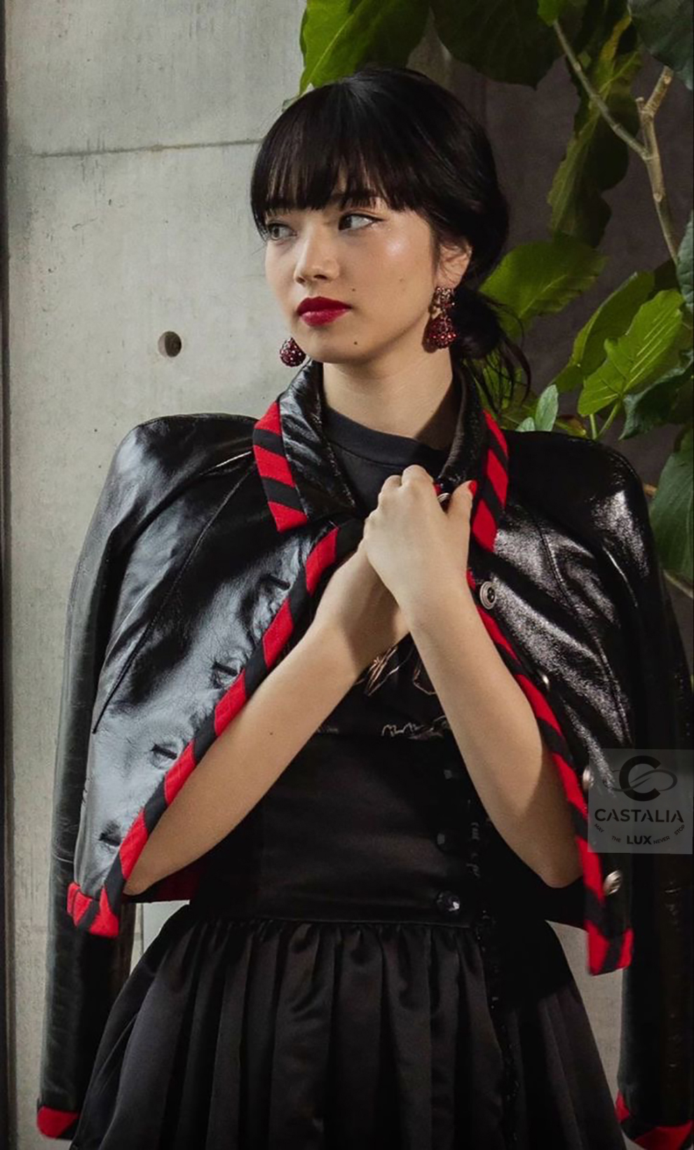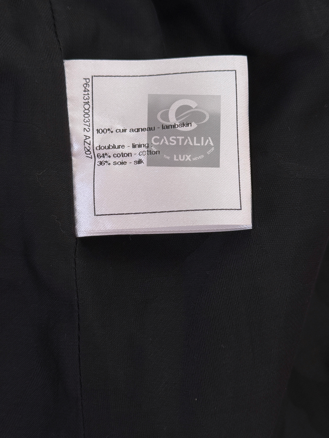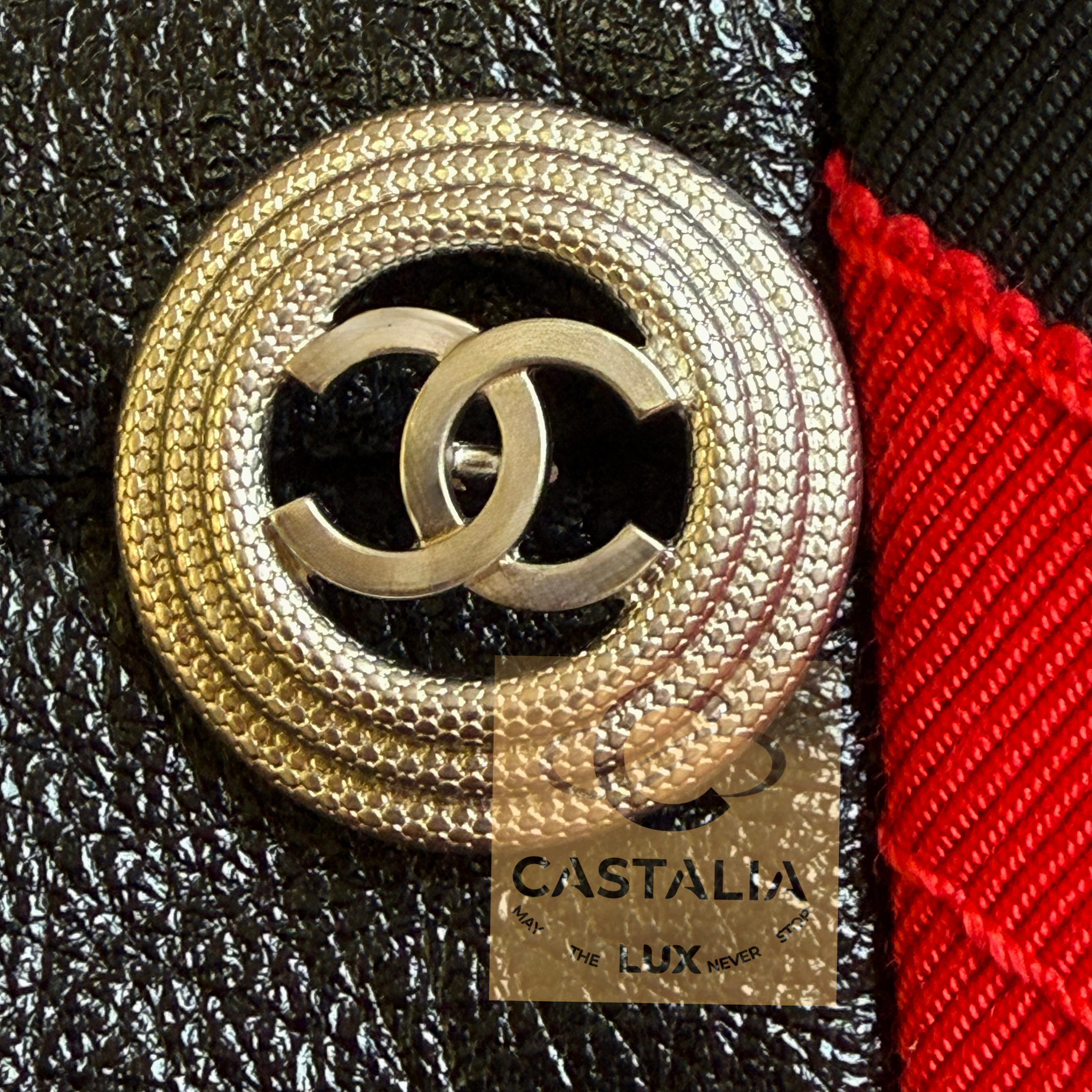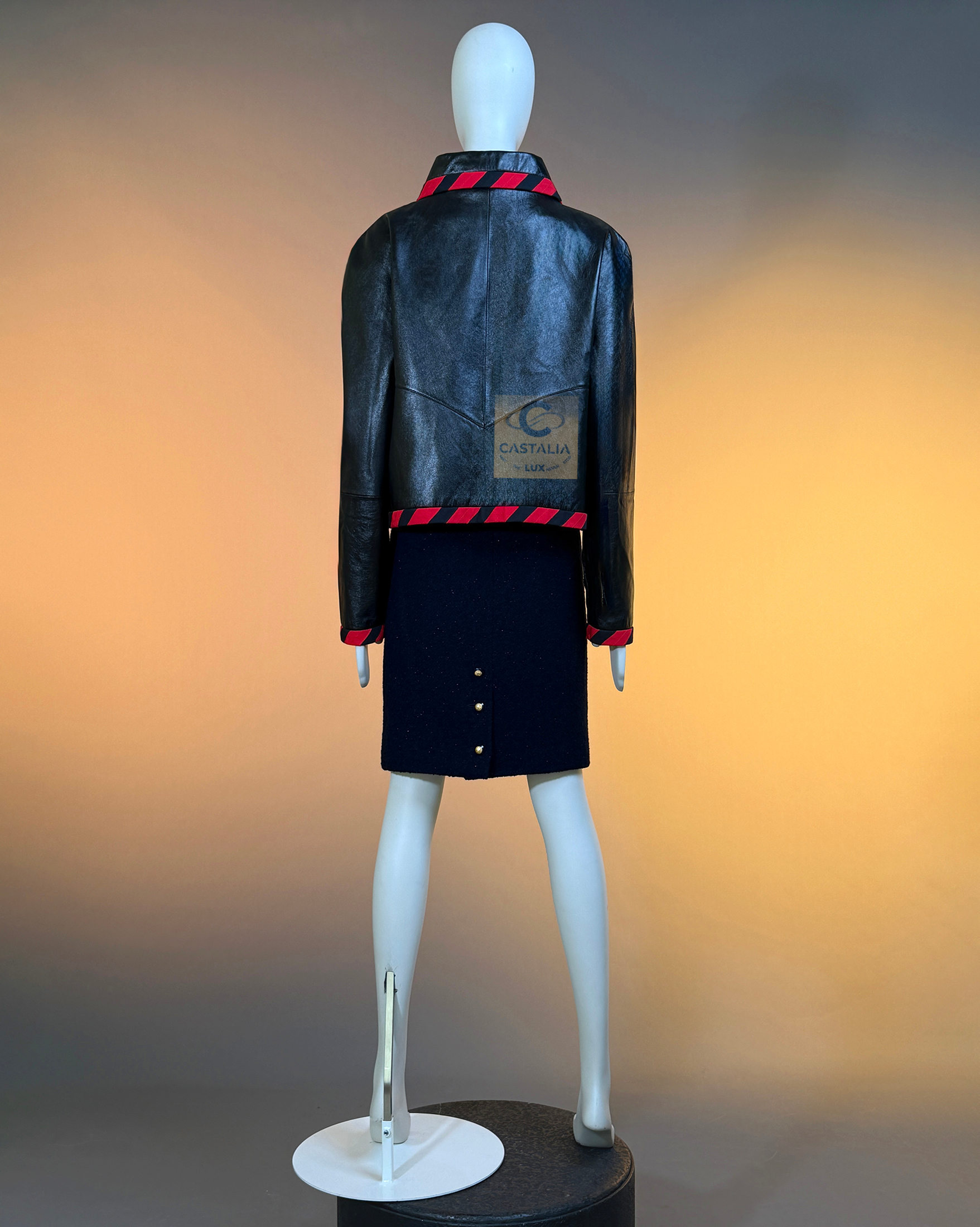 CHANEL · Iconic Ad Campaign Black Leather Jacket with CC Buttons — Spring 2020 “PARIS ROOFTOPS” Runway, Virginie Viard • Boutique value: over $15,000 — This is the Viard-era icon that became campaign image and magazine citation, worn by Kristen Stewart and Nana Komatsu because it reads instantly: sharp, urban, unmistakably Chanel Why this piece matters — Spring 2020 “Paris Rooftop” is Chanel at contemporary precision — Viard translating the House into a harder, sharper urban register without losing one syllable of its code // Size mark 50 FR / Condition: never worn // — House Codes · Material Authority — • Finest black leather — dense, supple, and nocturnal, with a lived sheen that catches light like rooftop asphalt after rain • Contrast red stripe trim — graphic, disciplined, and aggressive in its clarity; a Chanel border rewritten as urban signage • A composition that feels cinematic: minimal surface, maximal statement — Jewels · Seals · Talisman Hardware — • CC logo buttons down the front — metallic punctuation, functioning as official stamps rather than ornament — Silhouette · Presence — • Modernist cropped architecture — clean lines, decisive collar, precise proportions designed to photograph with authority. • Black silk lining inside — the private completion, calm against the skin, exact in drape