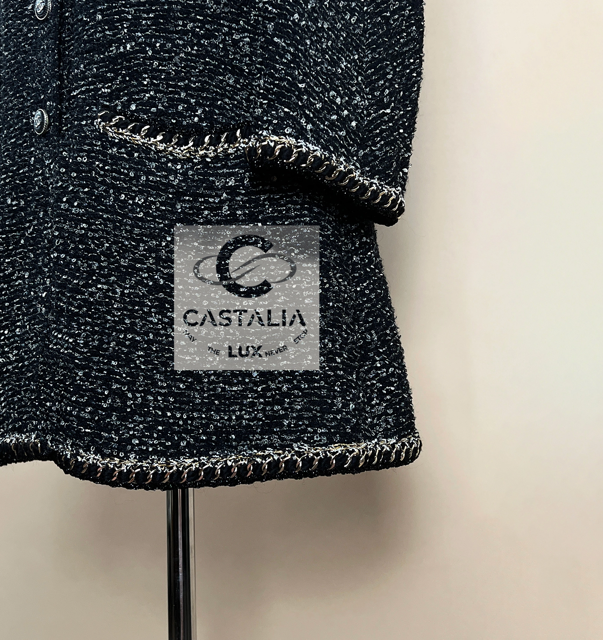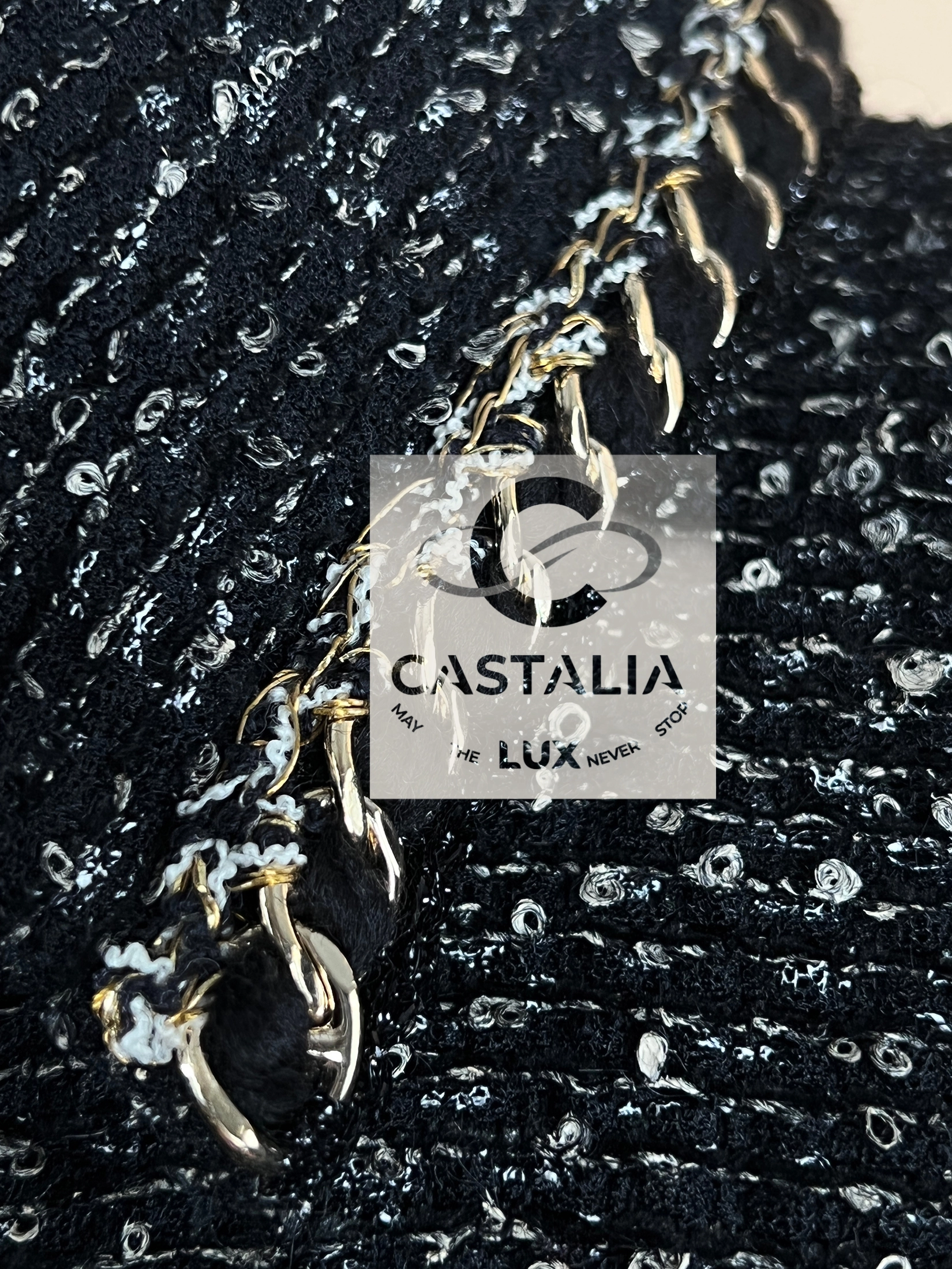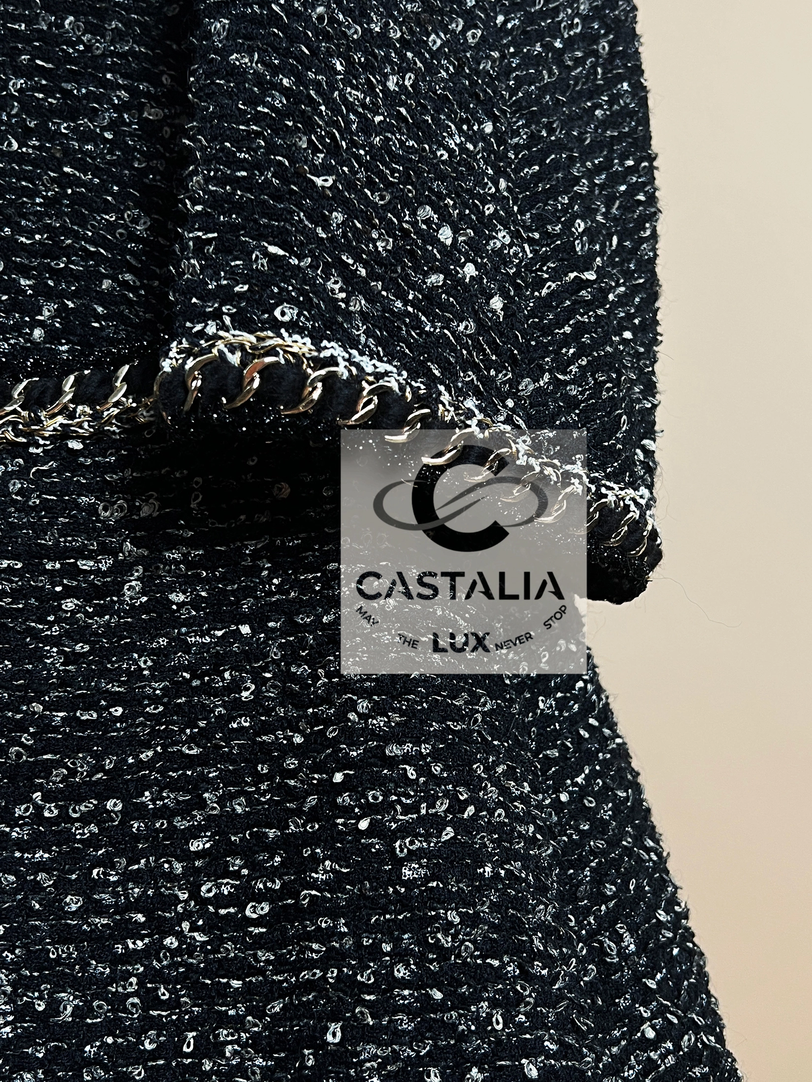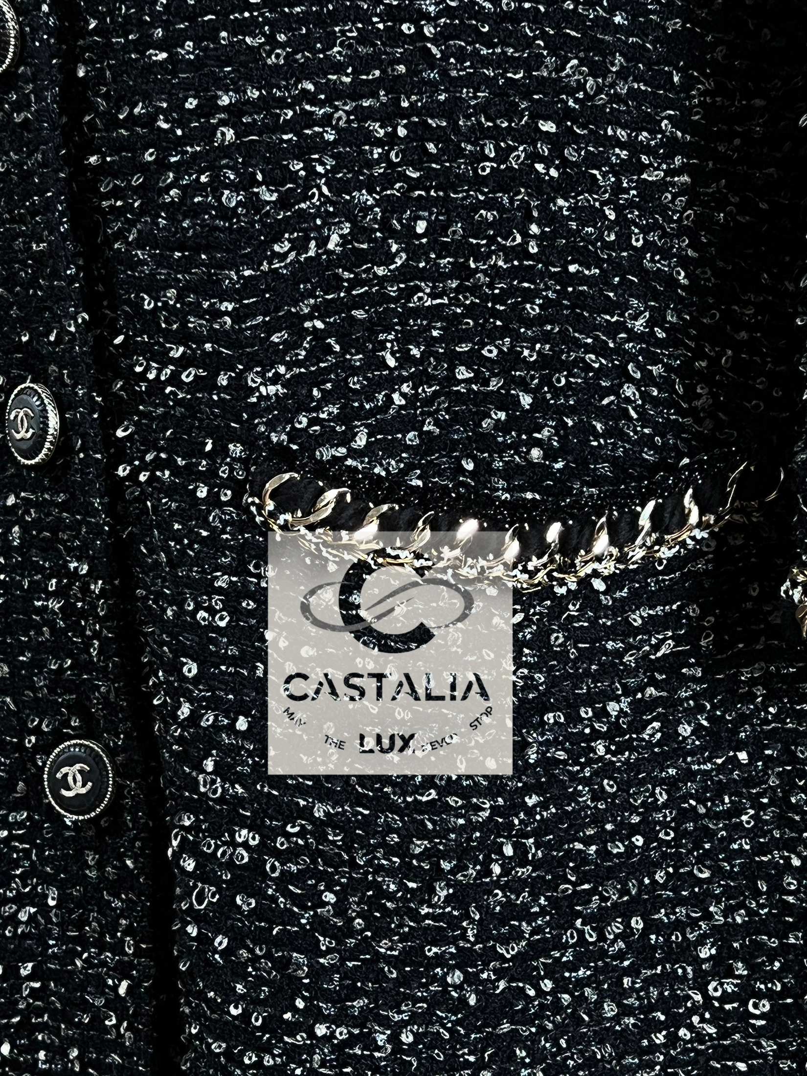 — Embellished with metallic chain link trim, each link recalling the very codes Gabrielle Chanel once fastened to the hems of her jackets, here transfigured into jewelry for the garment itself