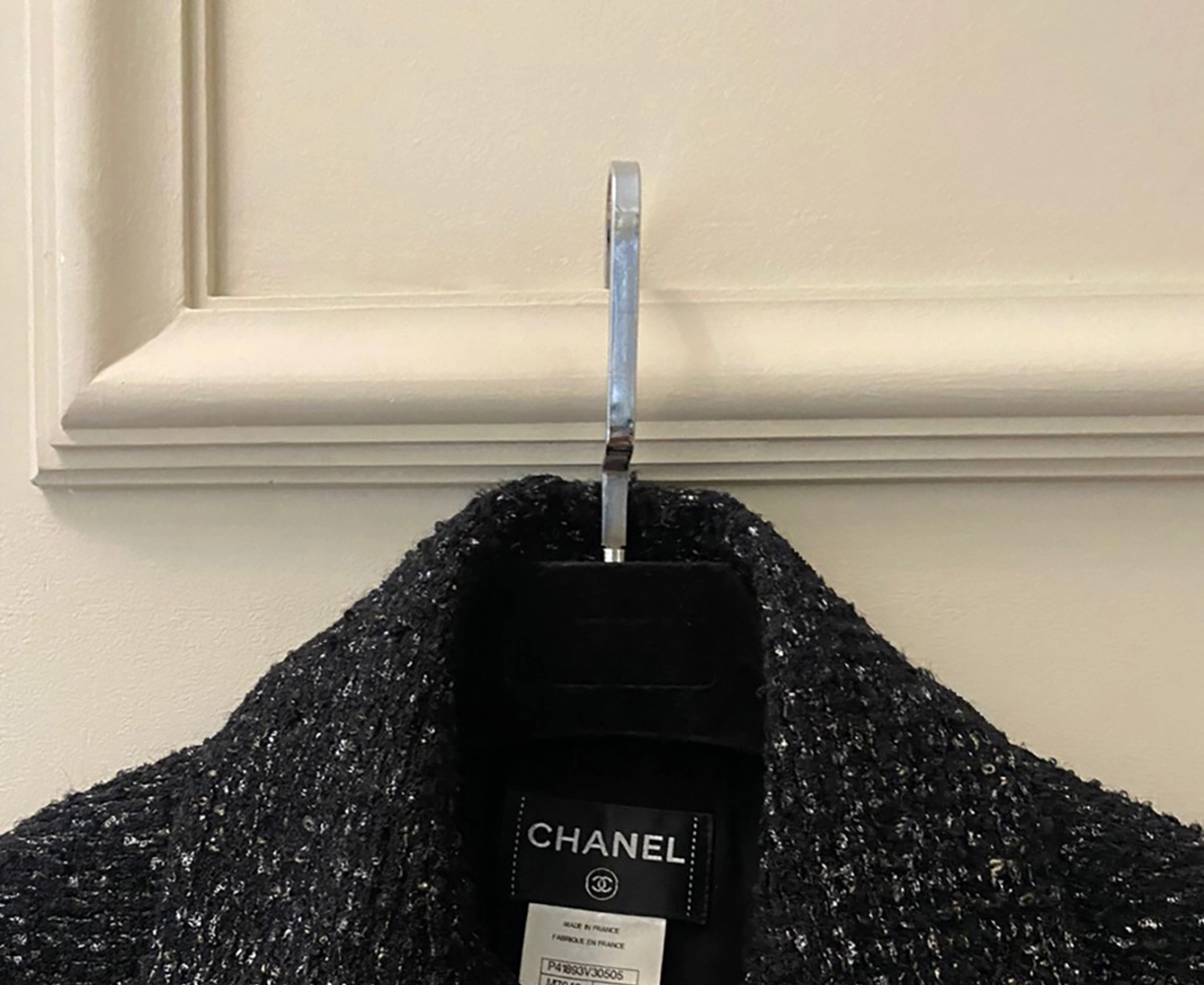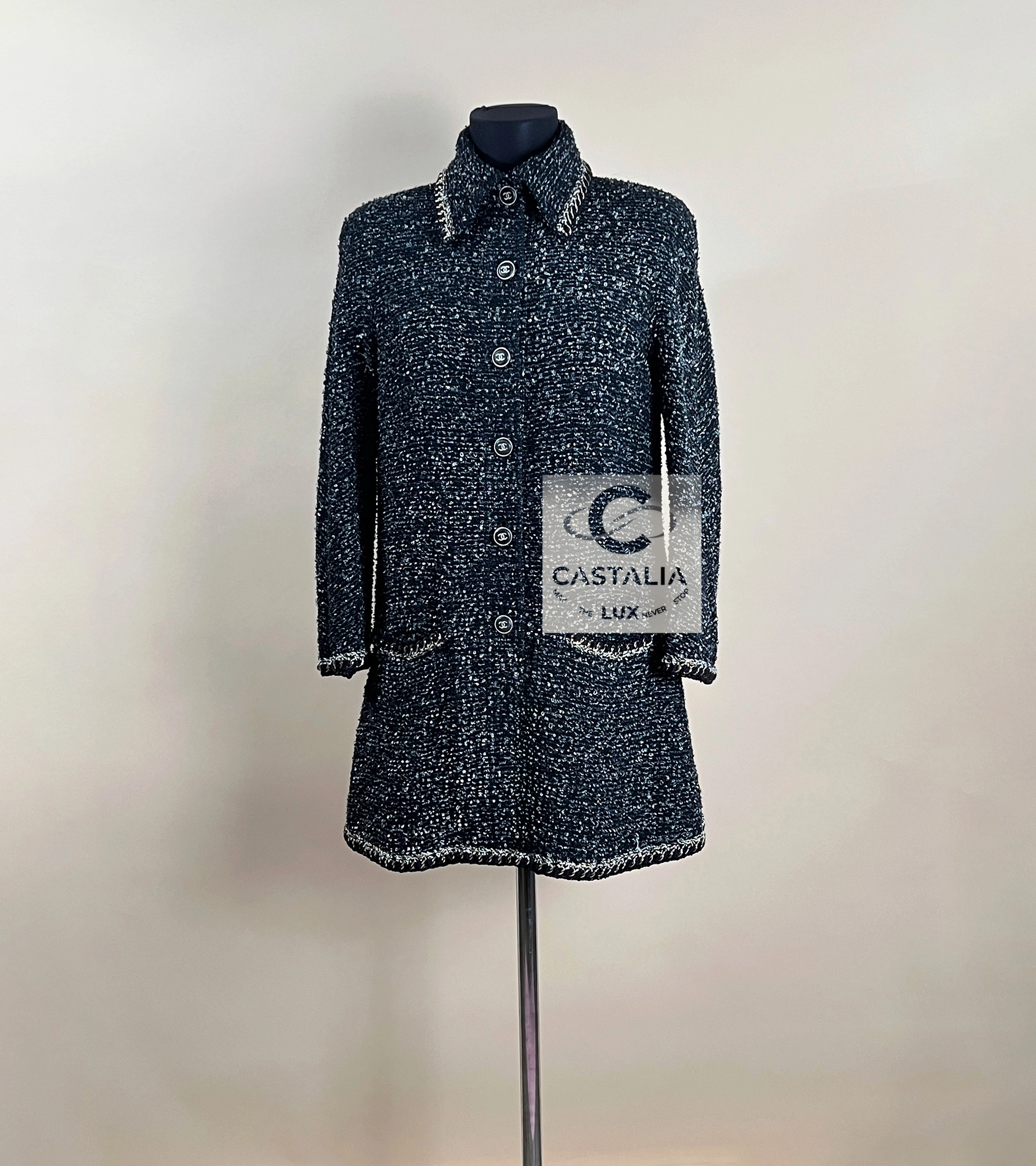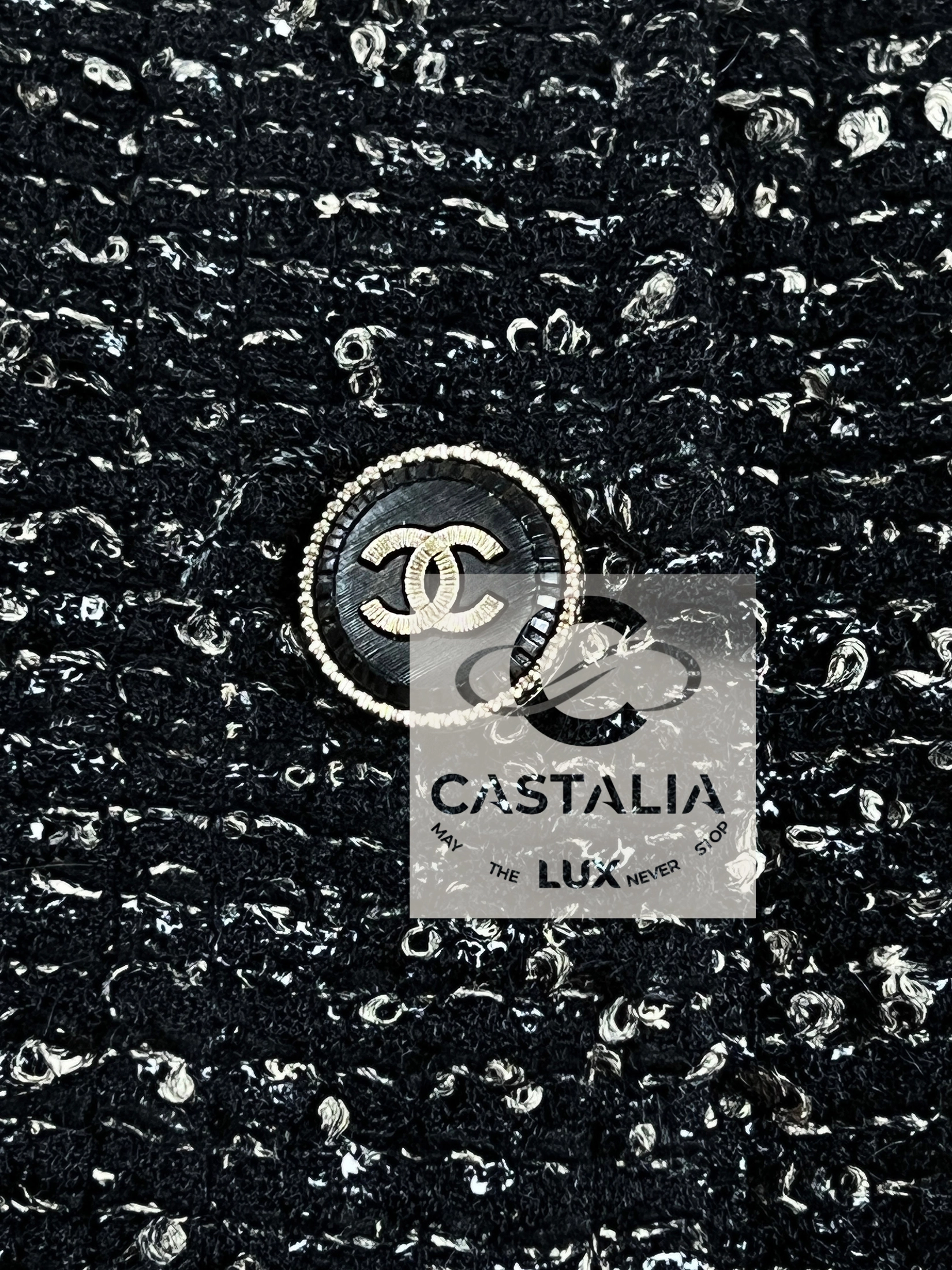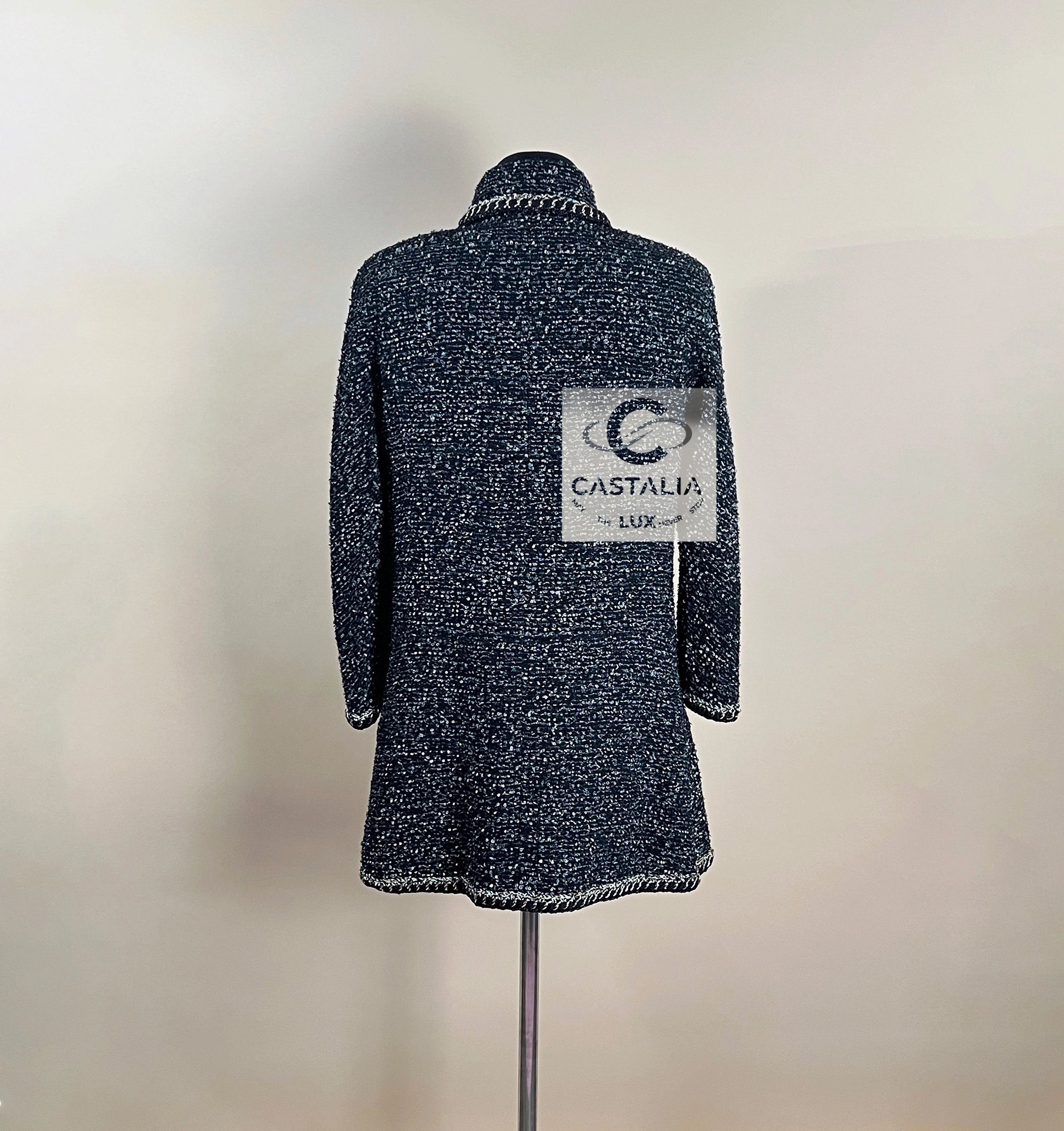 — Embellished with metallic chain link trim, each link recalling the very codes Gabrielle Chanel once fastened to the hems of her jackets, here transfigured into jewelry for the garment itself