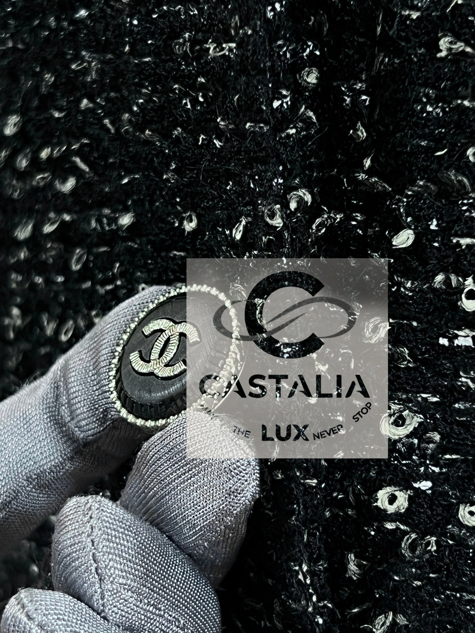 — Forged in anthracite black bouclé tweed, its weave is a night sky captured in fabric — textured, infinite, and alive with subtle light