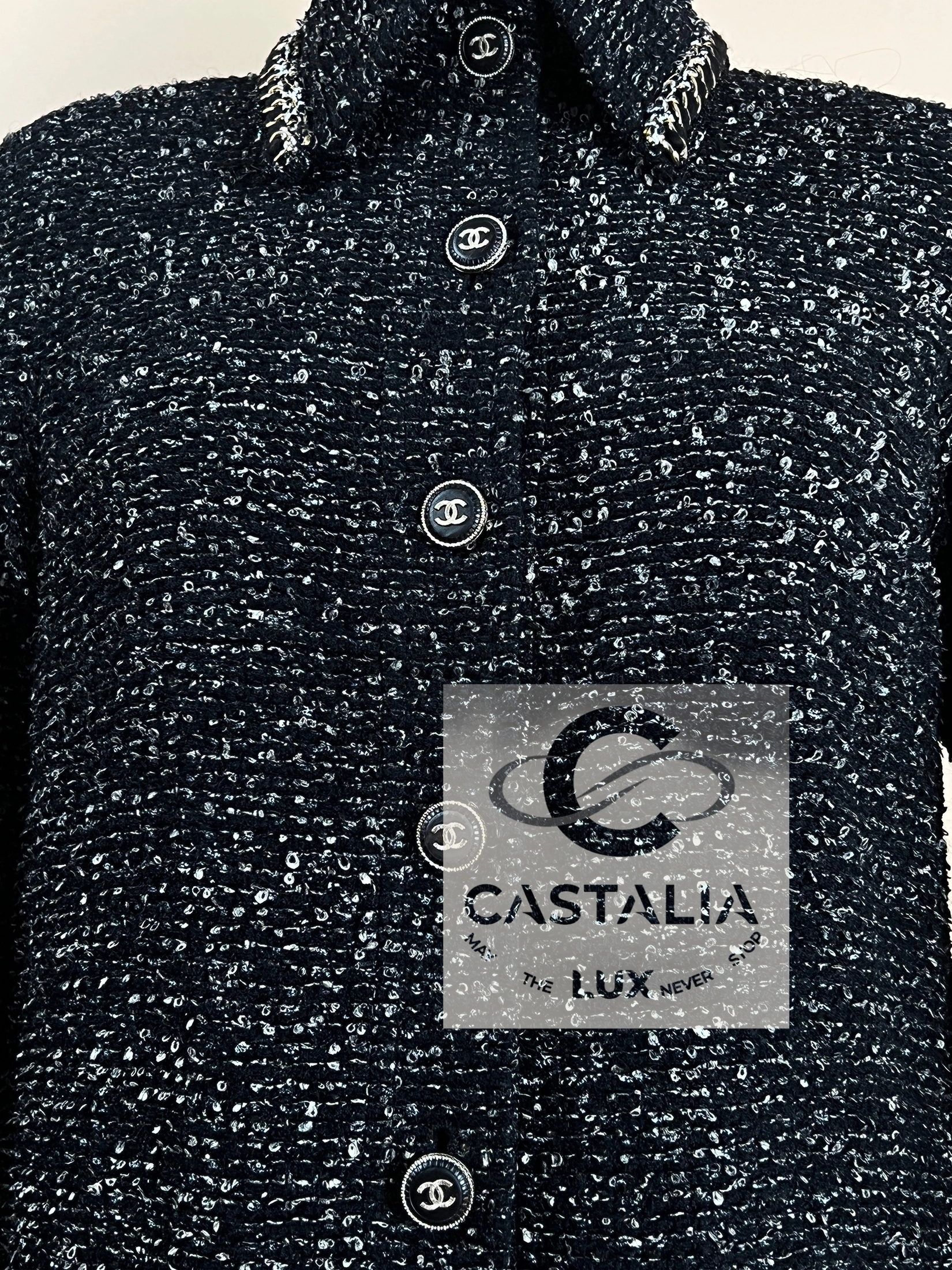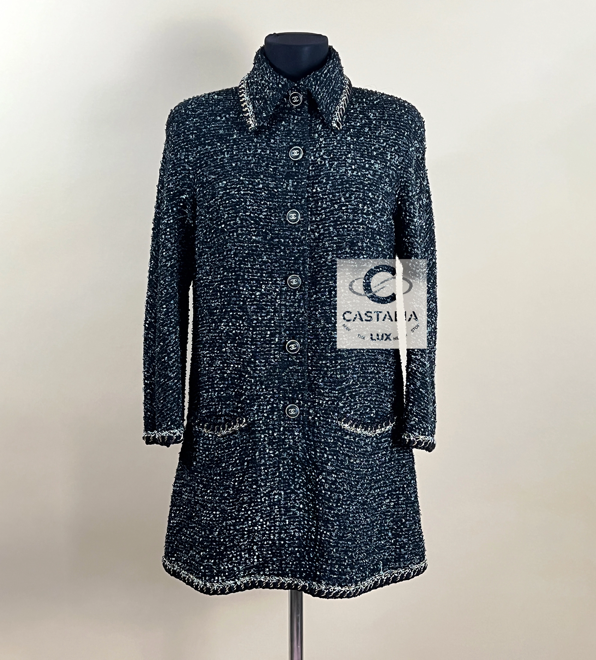 CHANEL 11K$ Collectible Anthracite Bouclé Tweed Dress — With Signature Chain Link Trim ~ A creation where couture becomes architecture, this CHANEL dress is an unmistakable testament to the Maison’s eternal grammar of design ~ A piece destined for the collector who understands Chanel not as fashion, but as living eternity in cloth // Size mark 34 FR / Condition: never worn // — Forged in anthracite black bouclé tweed, its weave is a night sky captured in fabric — textured, infinite, and alive with subtle light — Embellished with metallic chain link trim, each link recalling the very codes Gabrielle Chanel once fastened to the hems of her jackets, here transfigured into jewelry for the garment itself — Massive wooden buttons, each crowned with the silver-tone CC logo, stand like oracular seals, fastening history into modernity — tonal silk lining within preserves the secret touch of couture against the skin