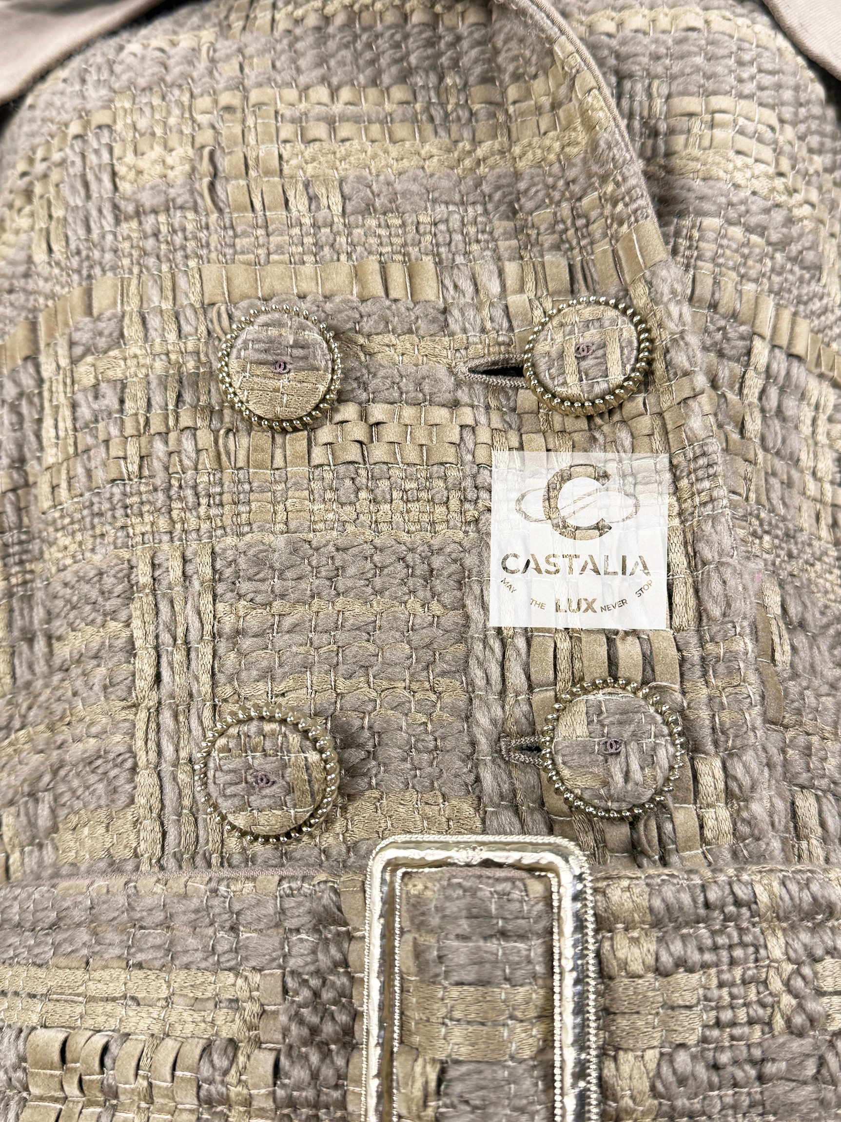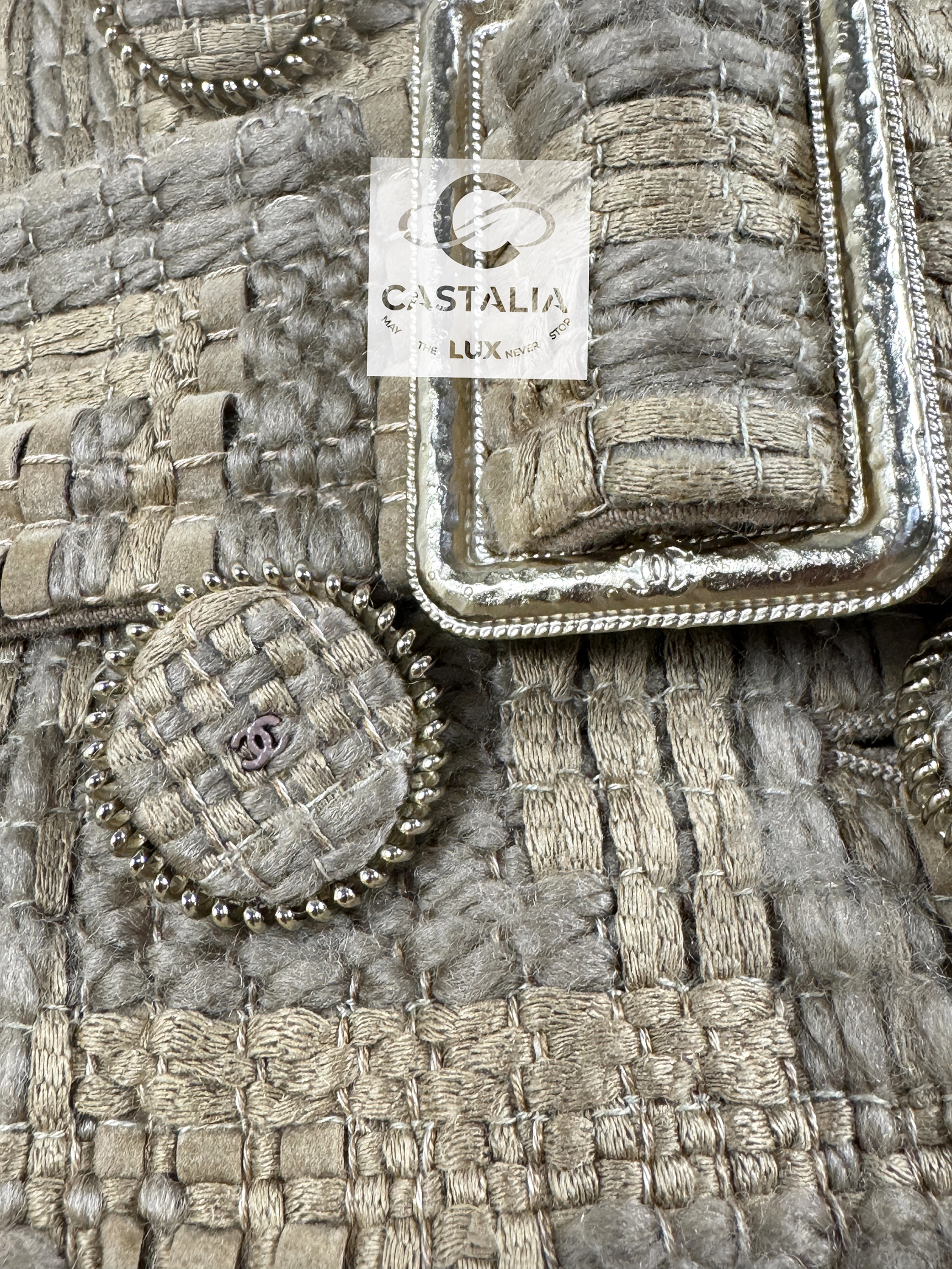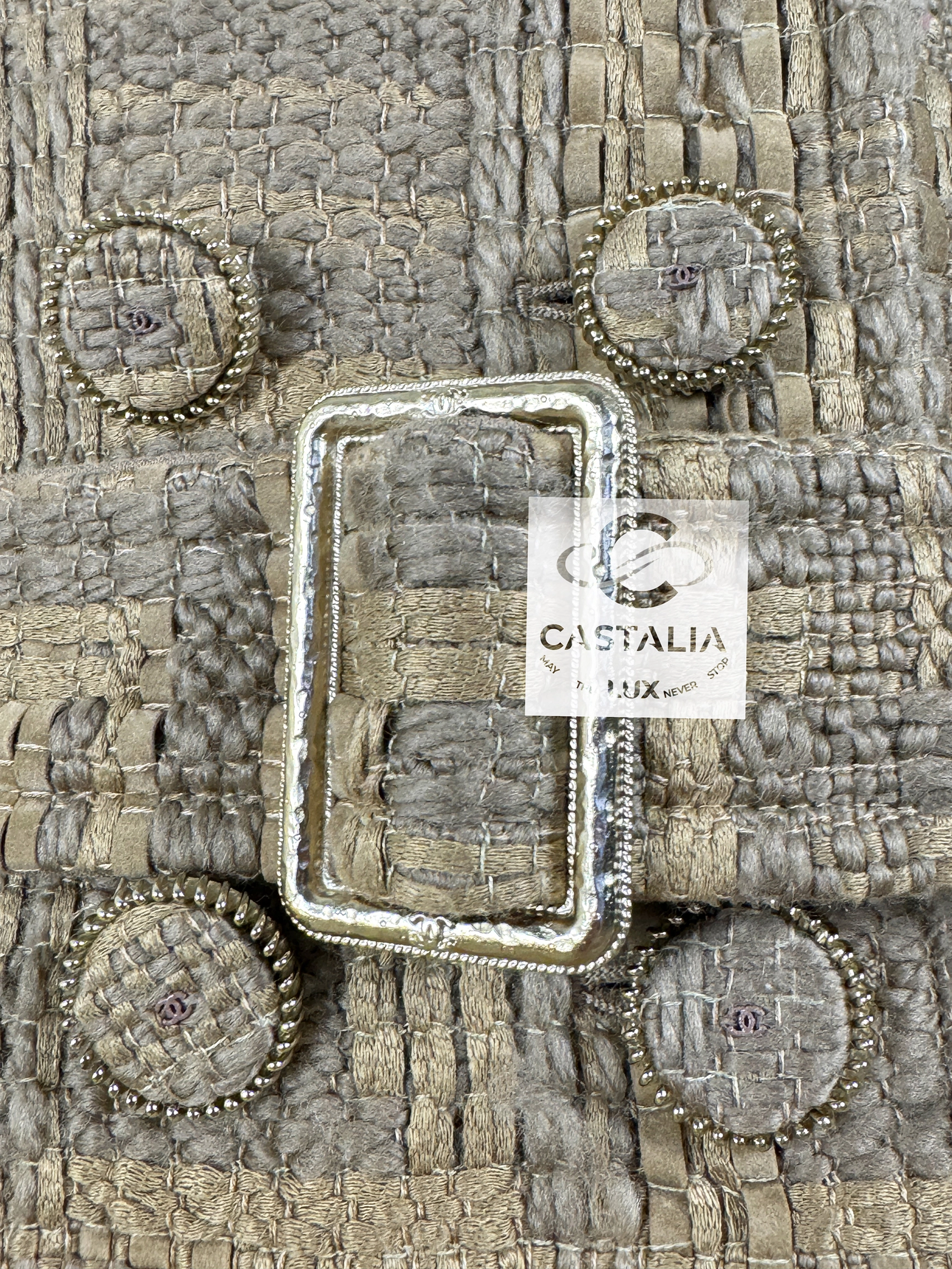 — The double-breasted front closes with CC logo tweed buttons, miniature monuments of the House’s enduring codes, echoed again at the epaulettes