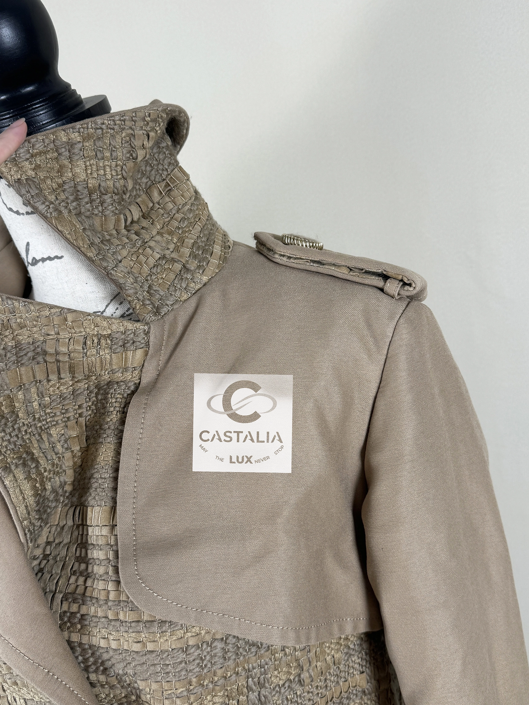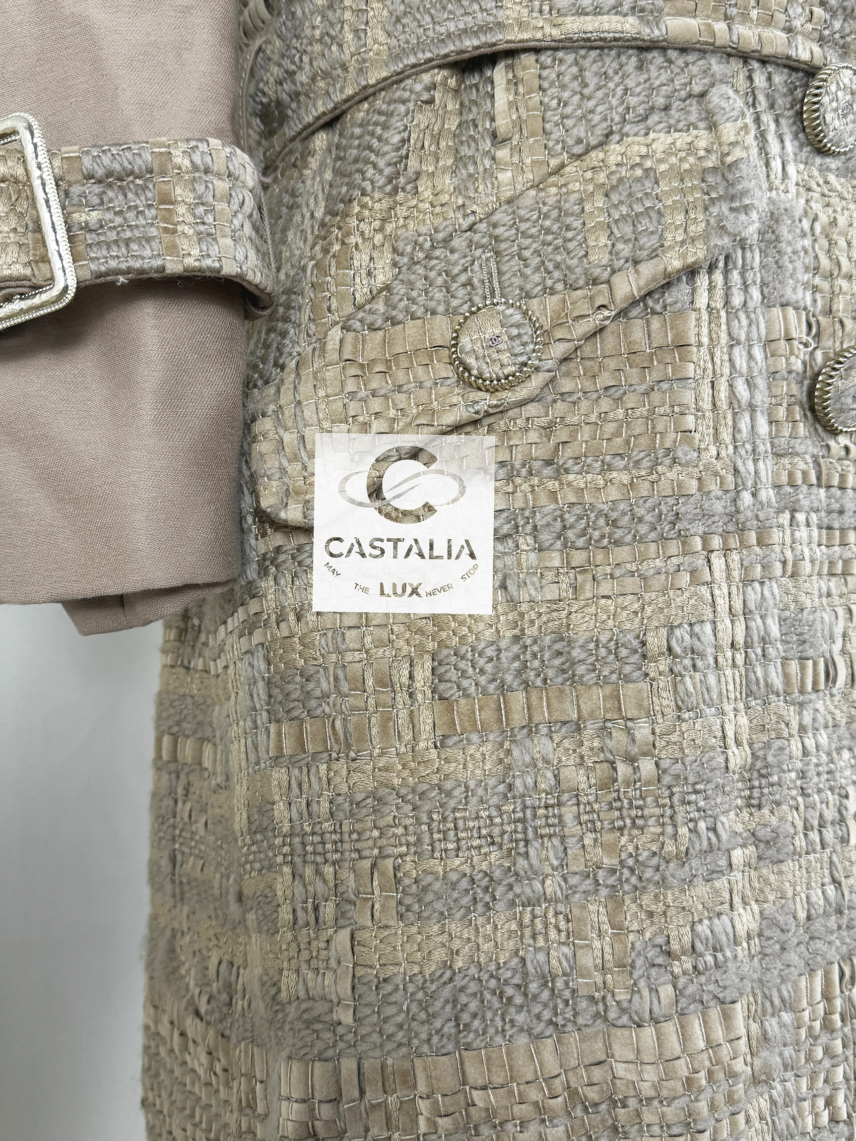 — Fashioned from the softest sand-beige Lesage ribbon tweed, the coat shimmers with quiet luminosity — like sunlight caught upon ancient stone