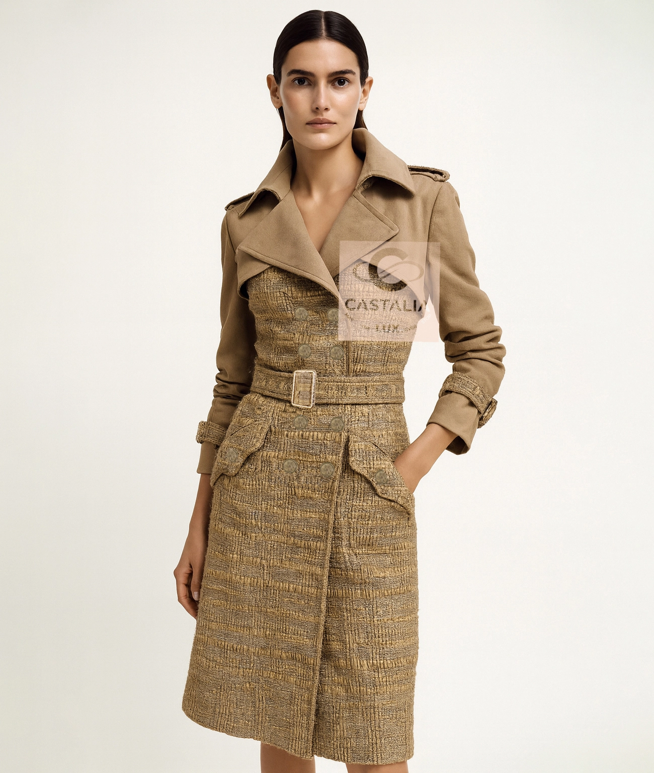 — A matching belt cinches the waist with a CC-signed buckle, balancing strength and grace