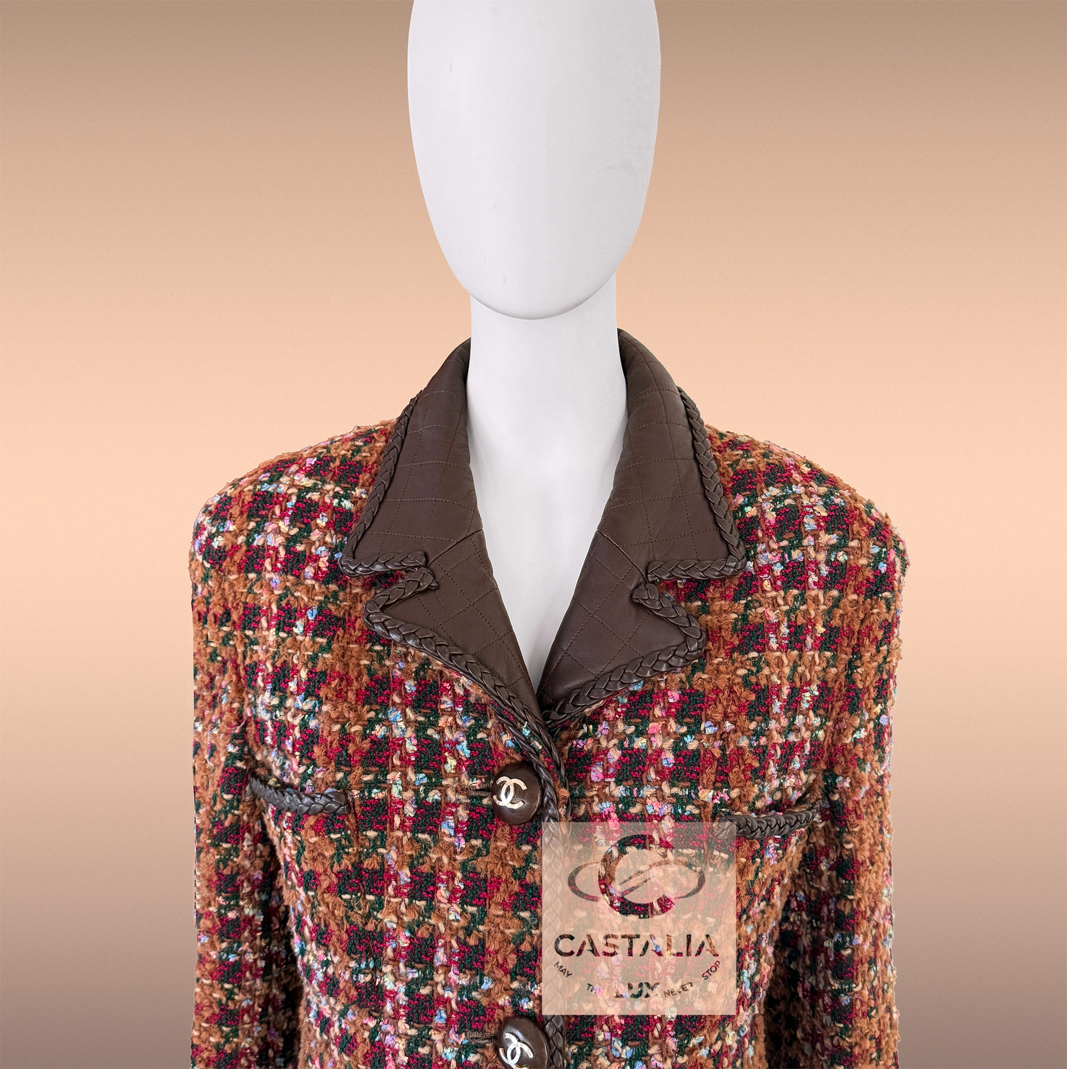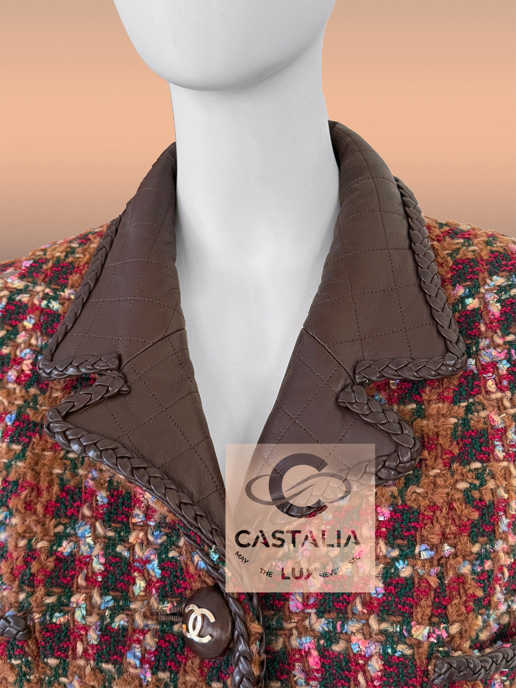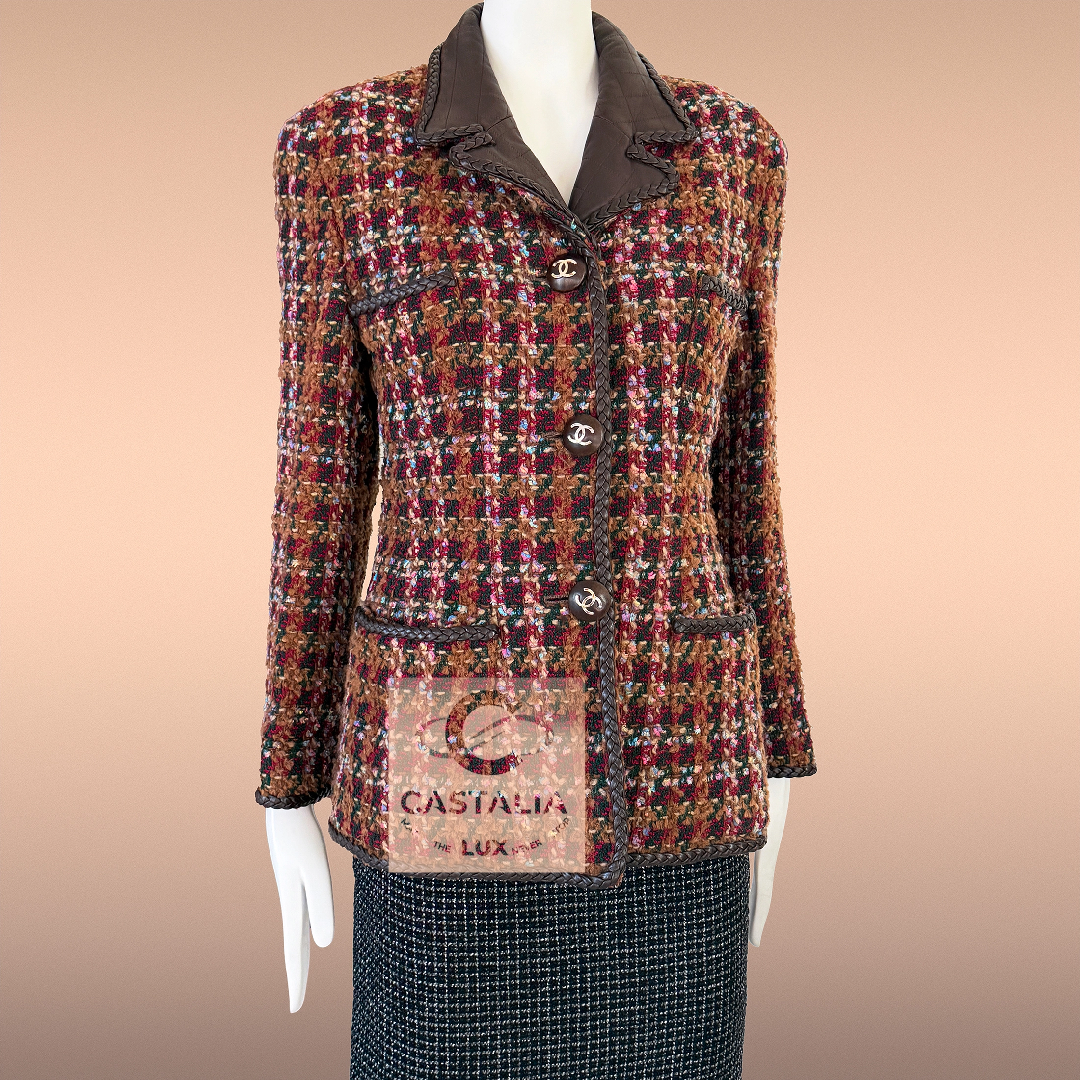 — Woven by Lesage in a palette worthy of a canvas—burnished copper, sienna brown, deep chestnut, ember red, forest green, and flecks of cerulean—its tweed is a textural symphony of light and shadow