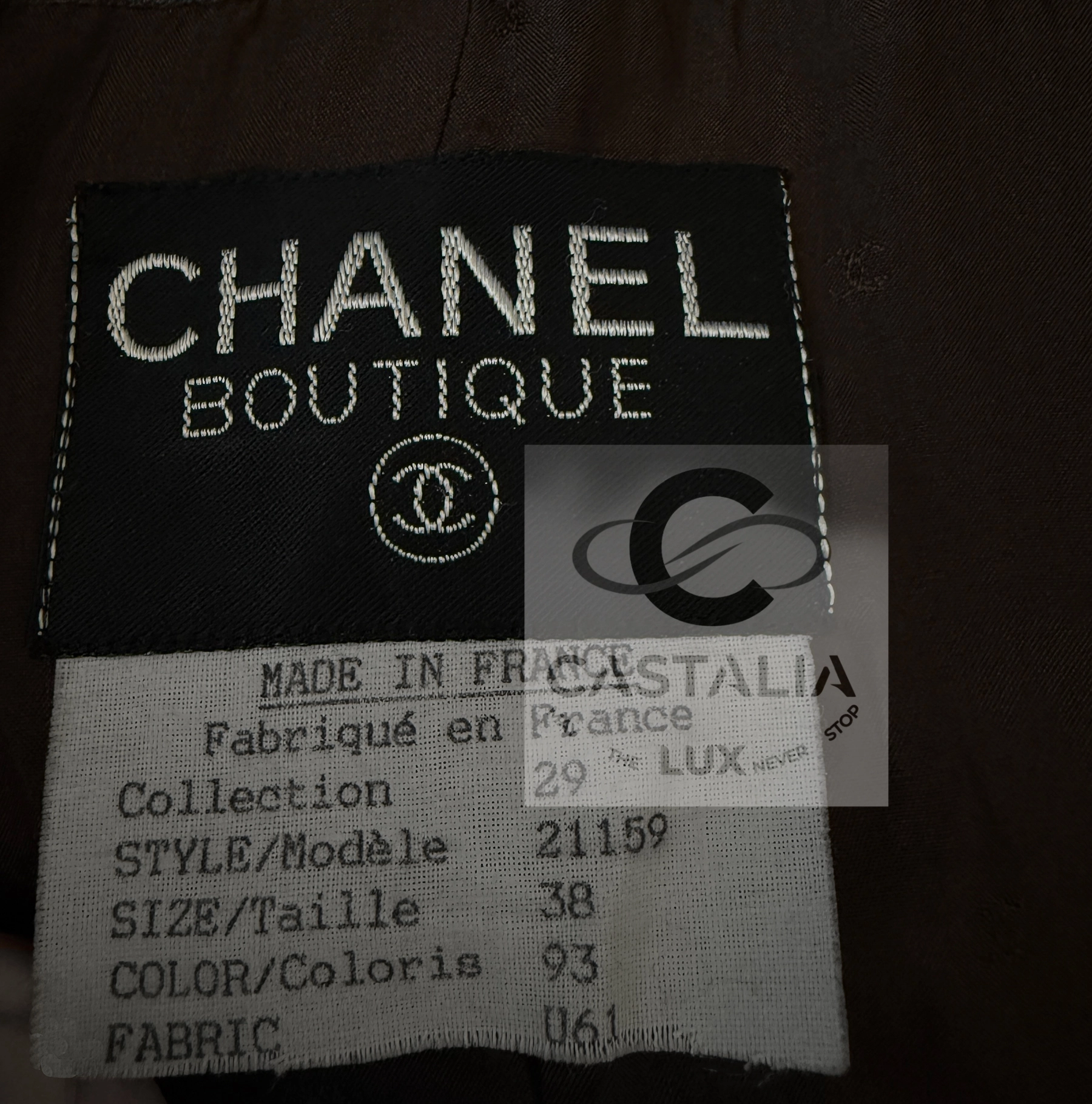 — Inside, the tonal silk lining—patterned with interwoven CC logos—meets the signature chain-linked interior hem, ensuring the perfect drape that has become a Chanel hallmark.