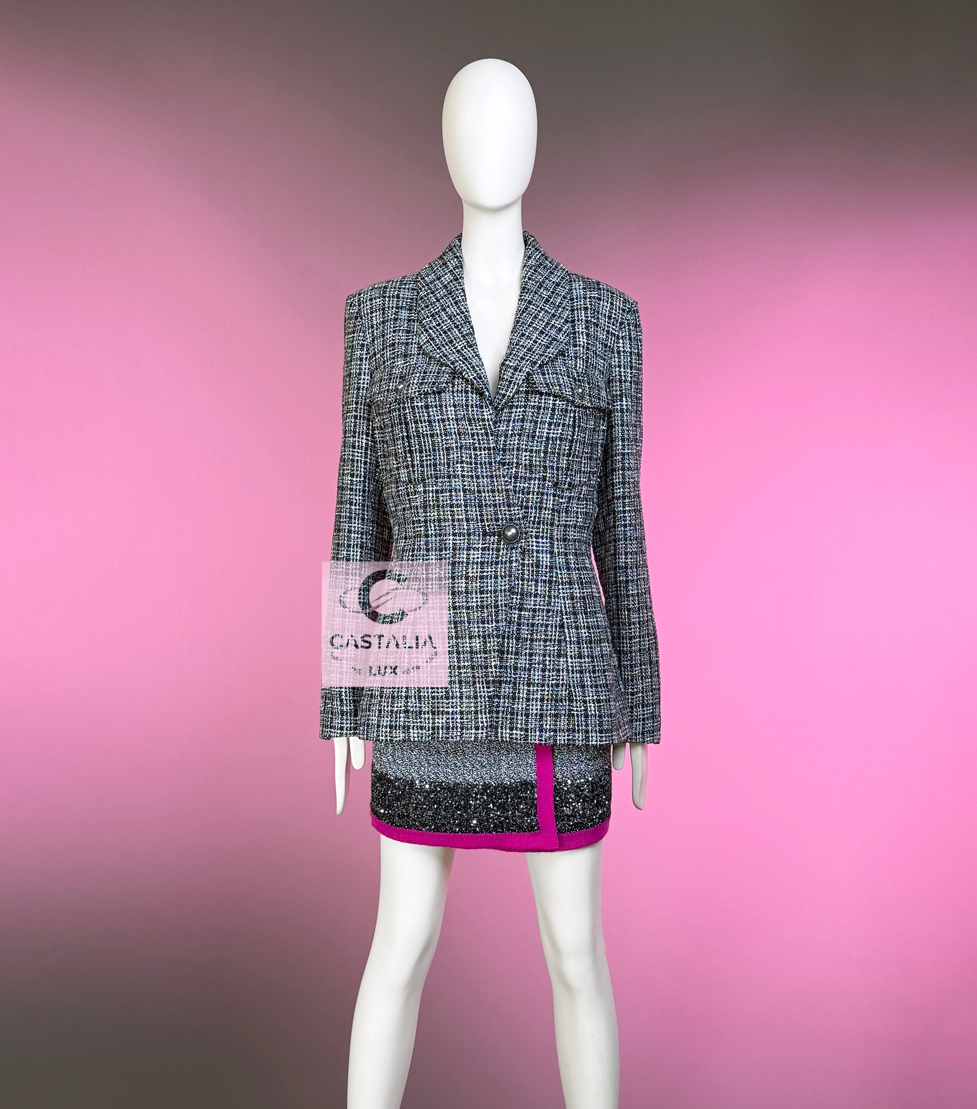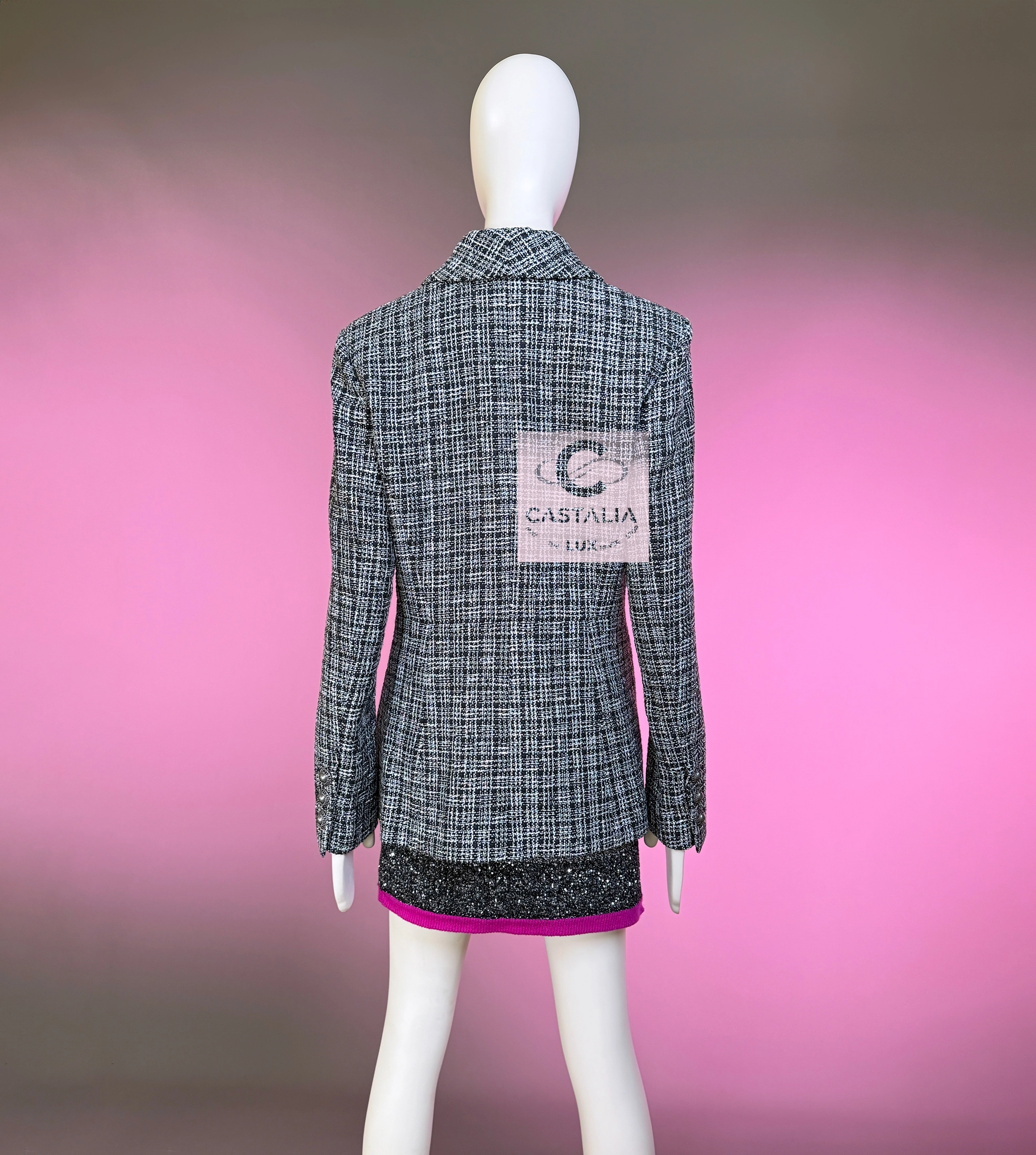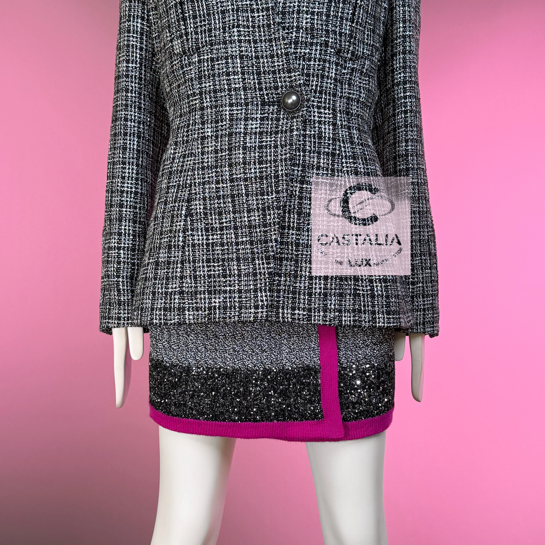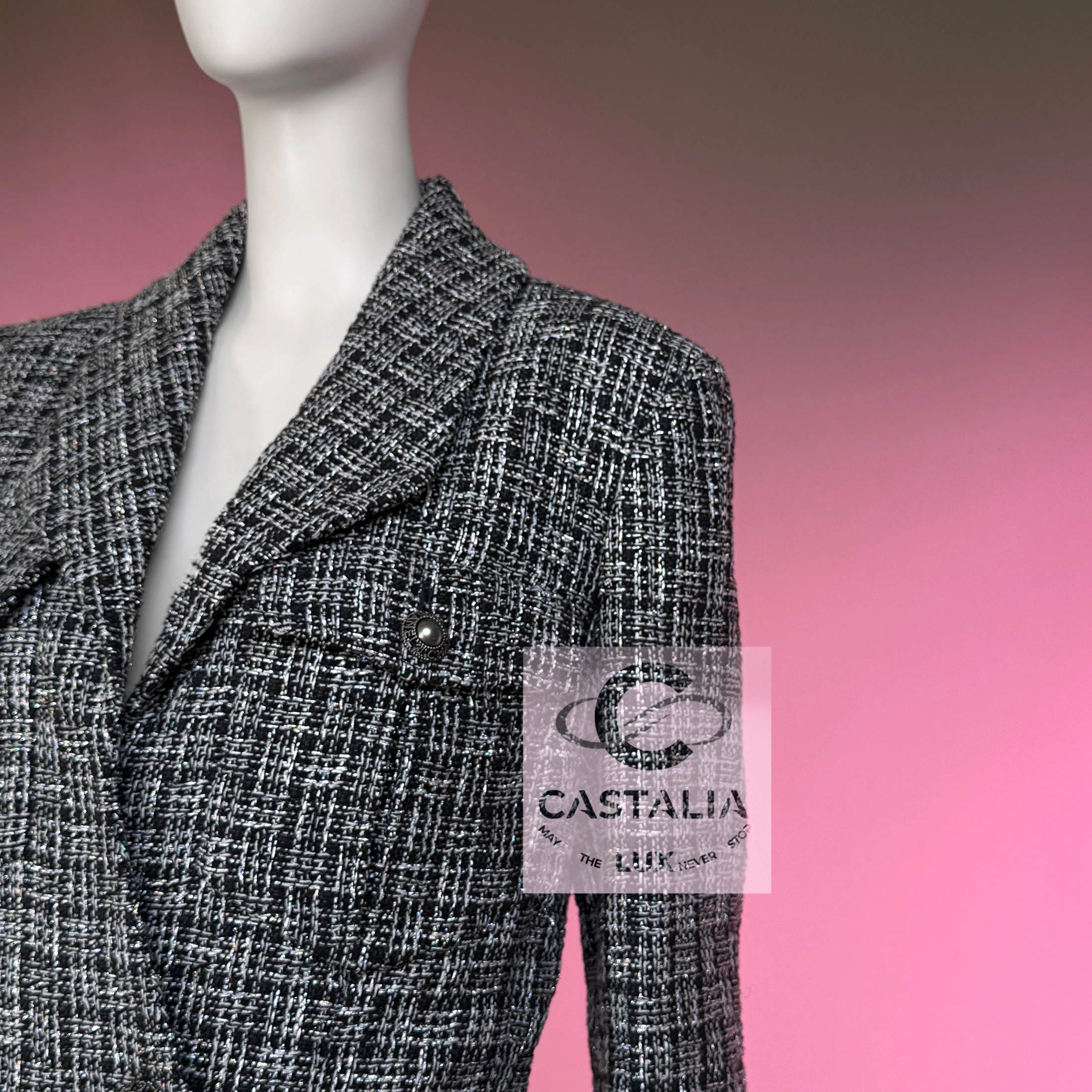 — Woven by the ateliers of Lesage, this jacket glows in rich black tweed laced with silver filaments,