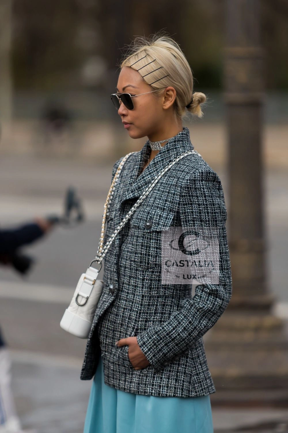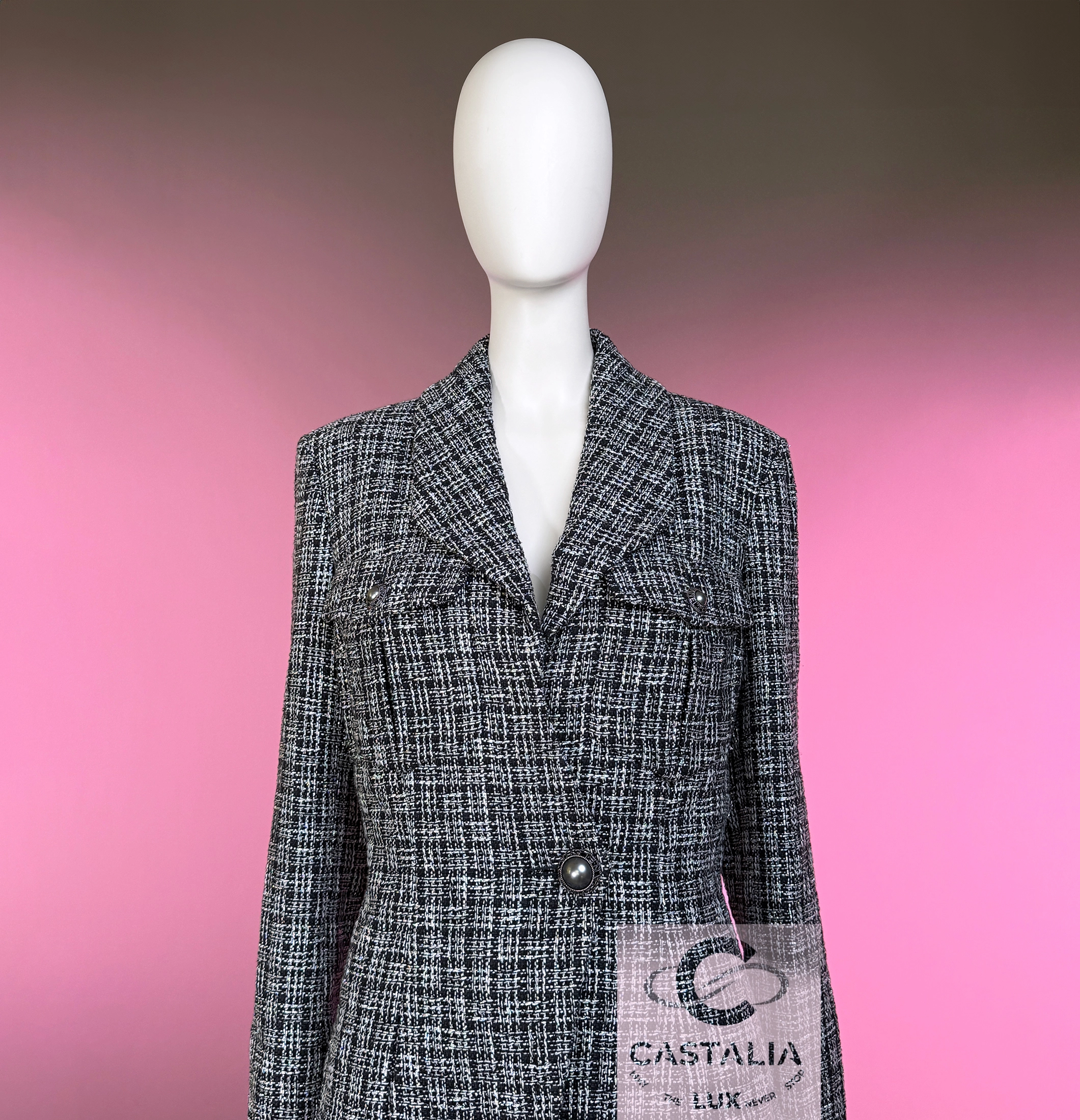 — majestic pearl-shaped buttons, circled in CHANEL lettering like orbiting planets, turning the garment into an axis of gravity and grace