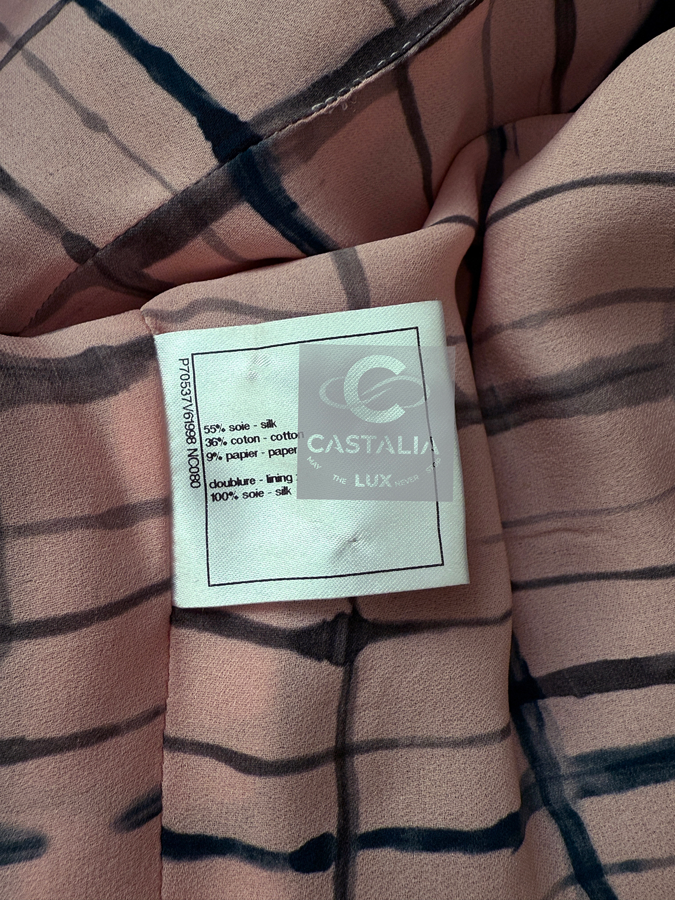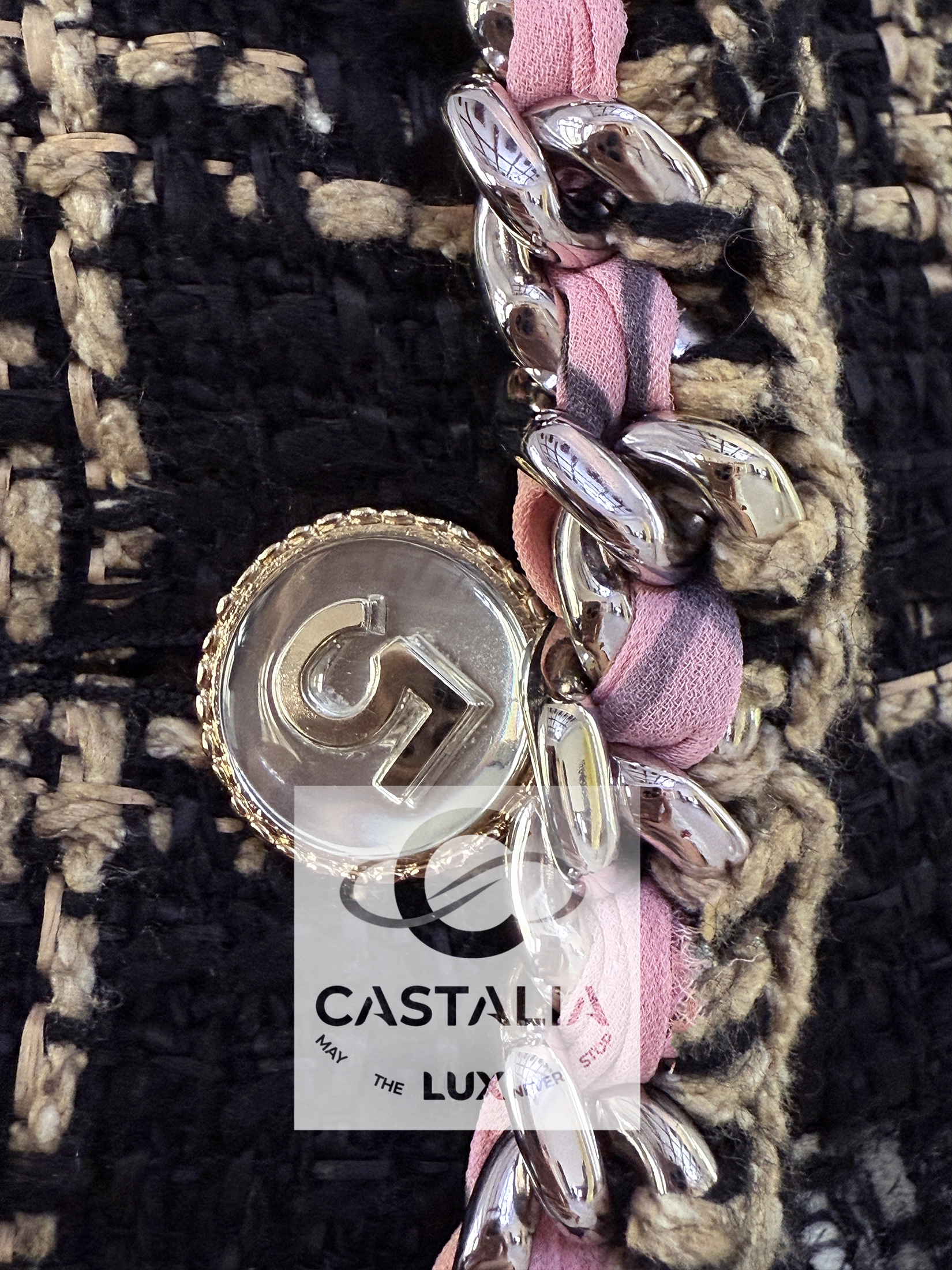 — Inside, a blush-pink silk lining hums with soft light, grounded by the signature chain link anchoring the hem