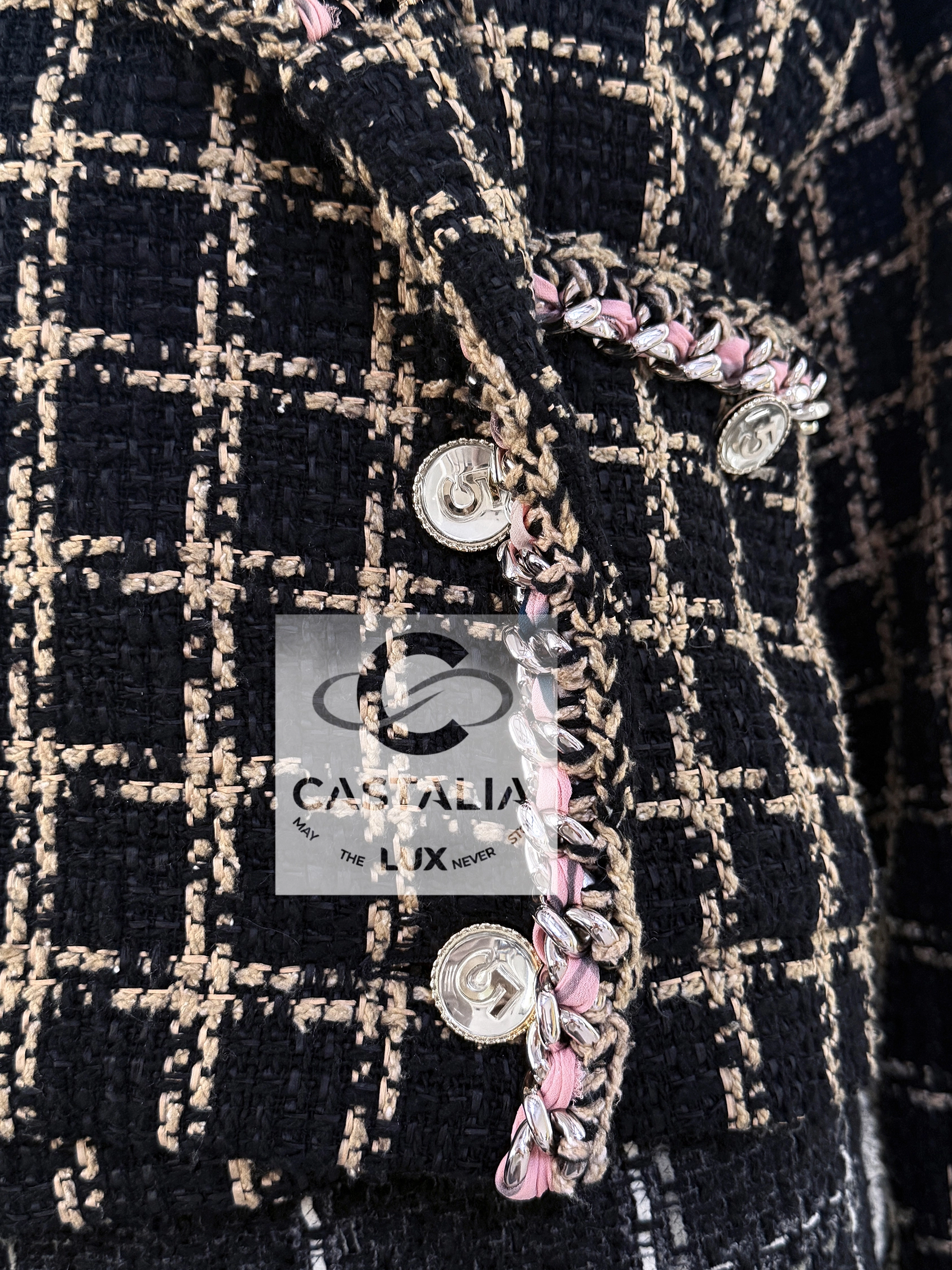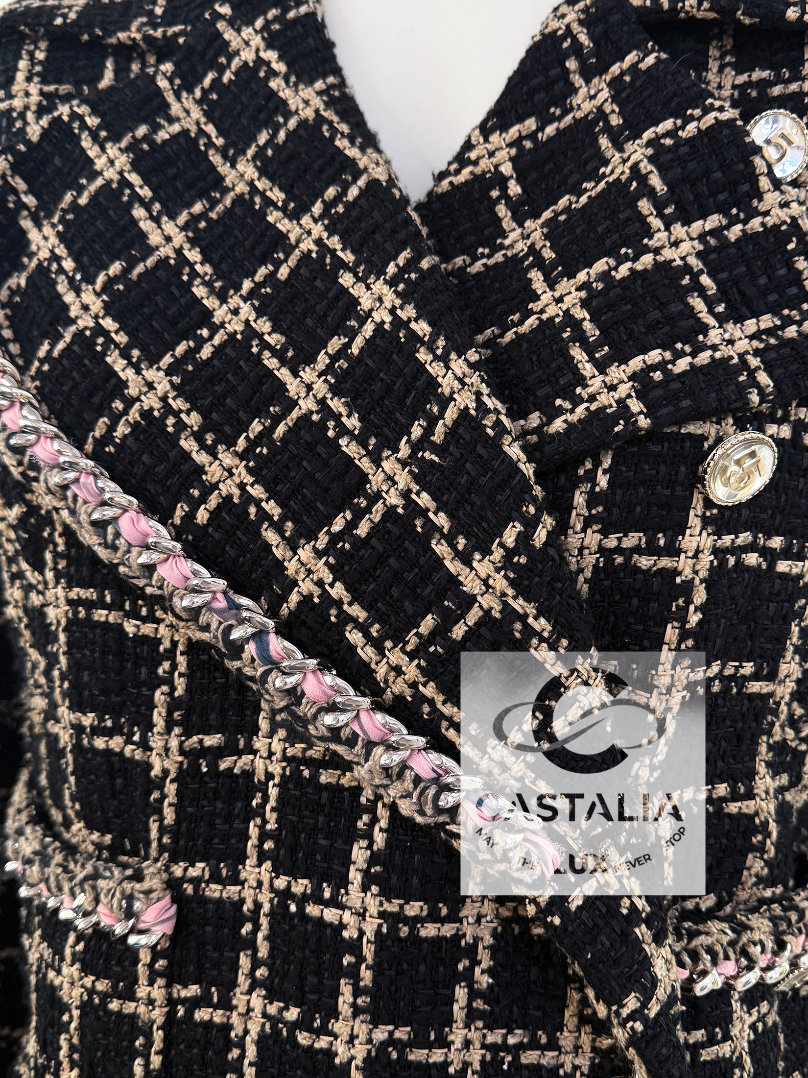 — Each jewel-encrusted button glows with the number 5 —Chanel’s most sacred cipher—glinting at the front and cuffs