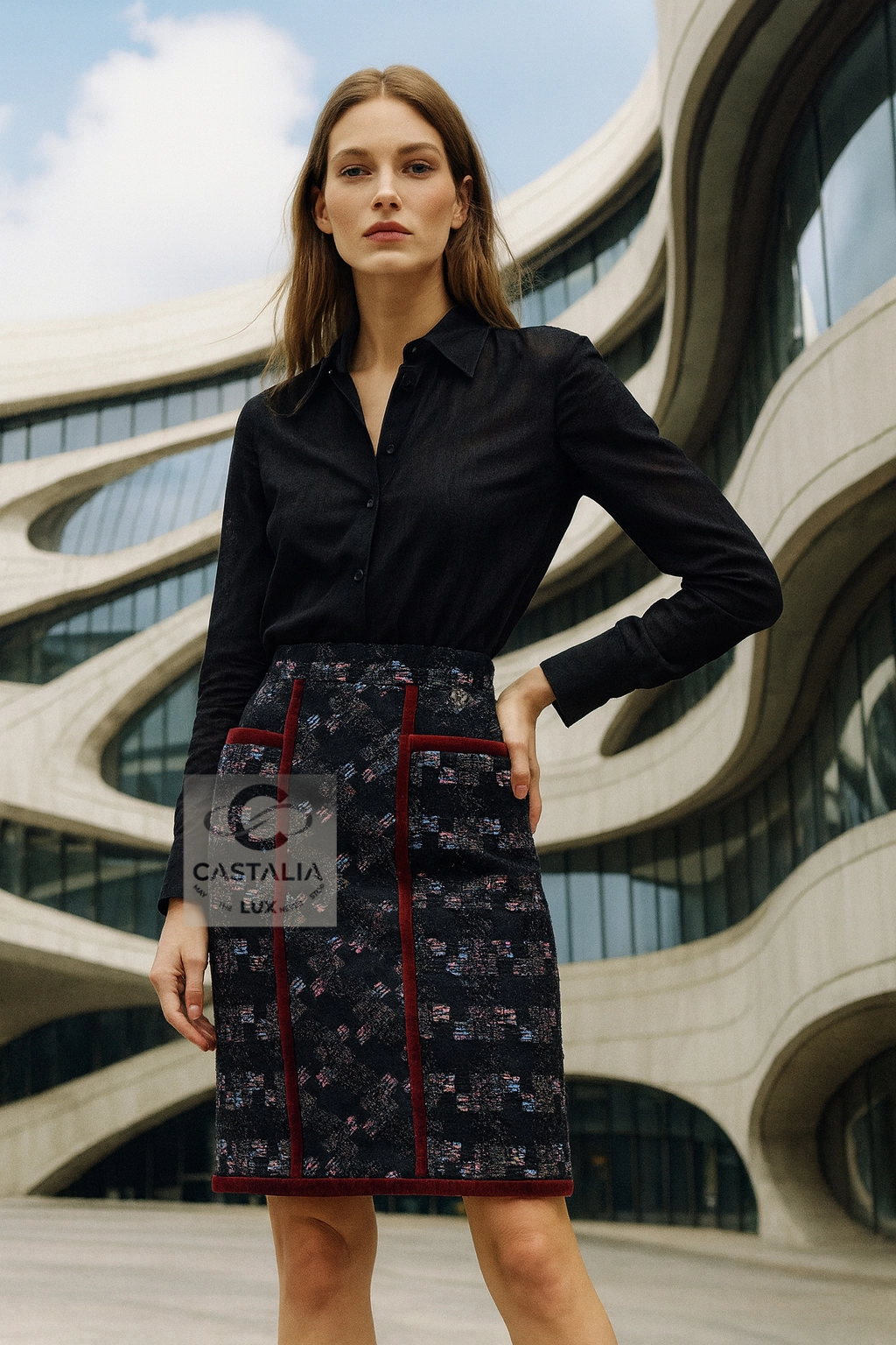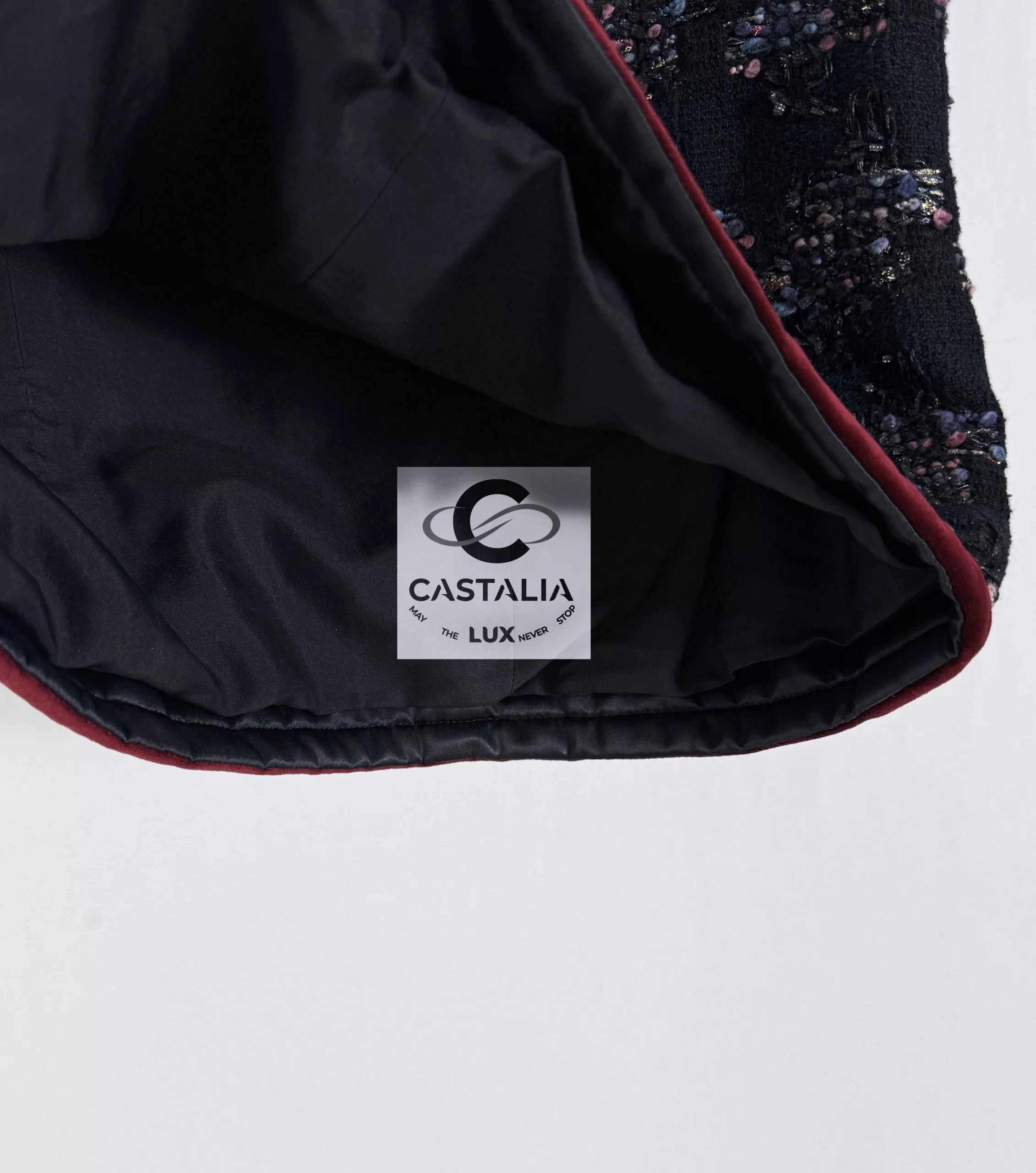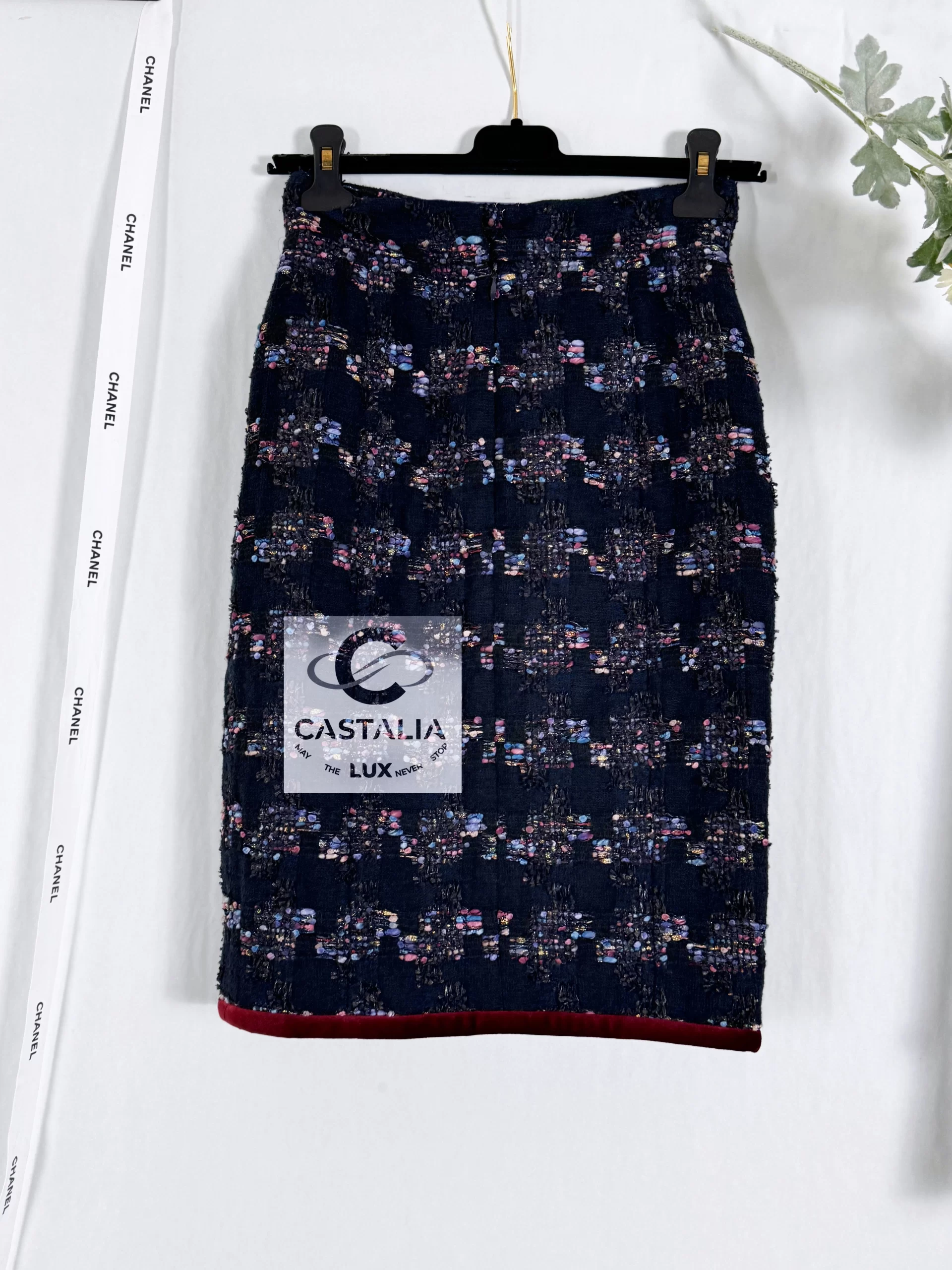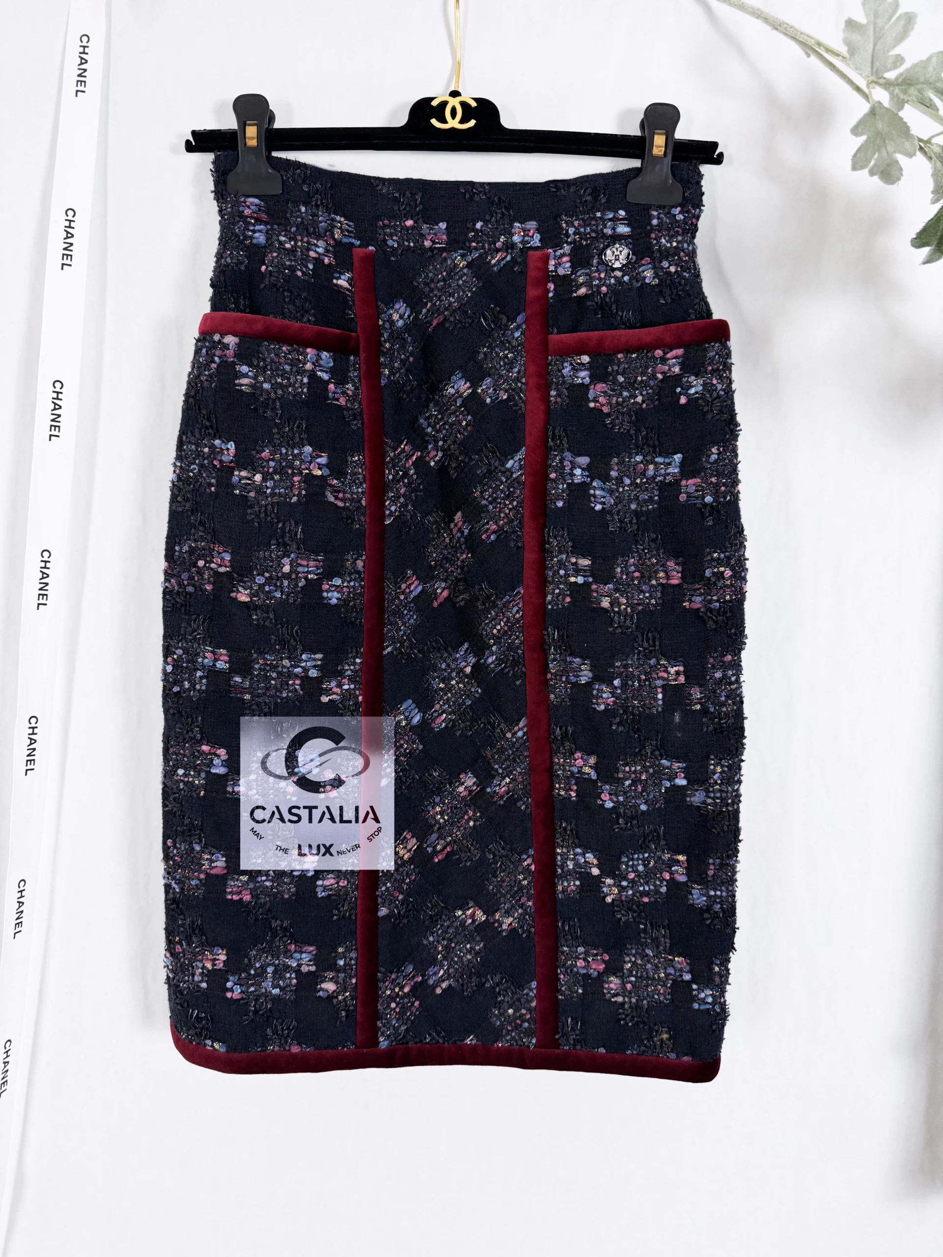 ~Chanel Collector’s Black Lesage Tweed Skirt with Eagle CC Charm — As Seen on Keira Knightley — Boutique value 3,840$ ~ This skirt is not merely attire but a cosmology of Chanel codes: tweed as eternity, velvet as opulence, eagle as transcendence. A collector’s masterpiece where couture ascends into the metaphysical // Size mark 34 FR / Condition: never worn // — Woven from precious Lesage tweed, the fabric itself is a constellation: a black night sky interwoven with shimmering threads that glisten like starlight caught in motion — At the waist, a talismanic detail: the CC logo charm crowned with eagles, symbol of Chanel’s eternal audacity, guarding the wearer like mythic sentinels — Along its architecture runs an exquisite burgundy velvet trim, a tactile frame of richness, sealing the tweed in regal solemnity — Beneath, the body is enveloped in black silk lining, whispering with every step