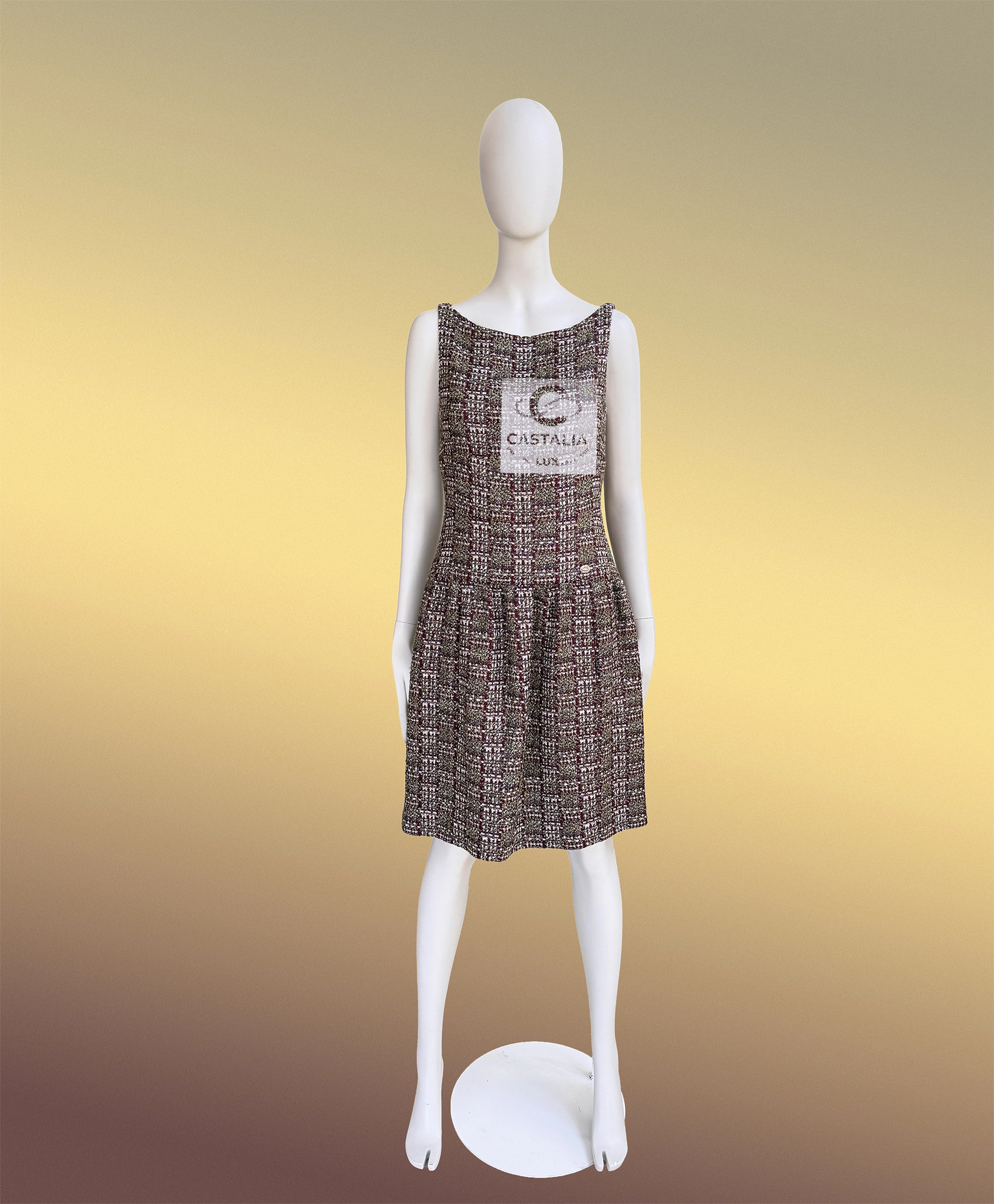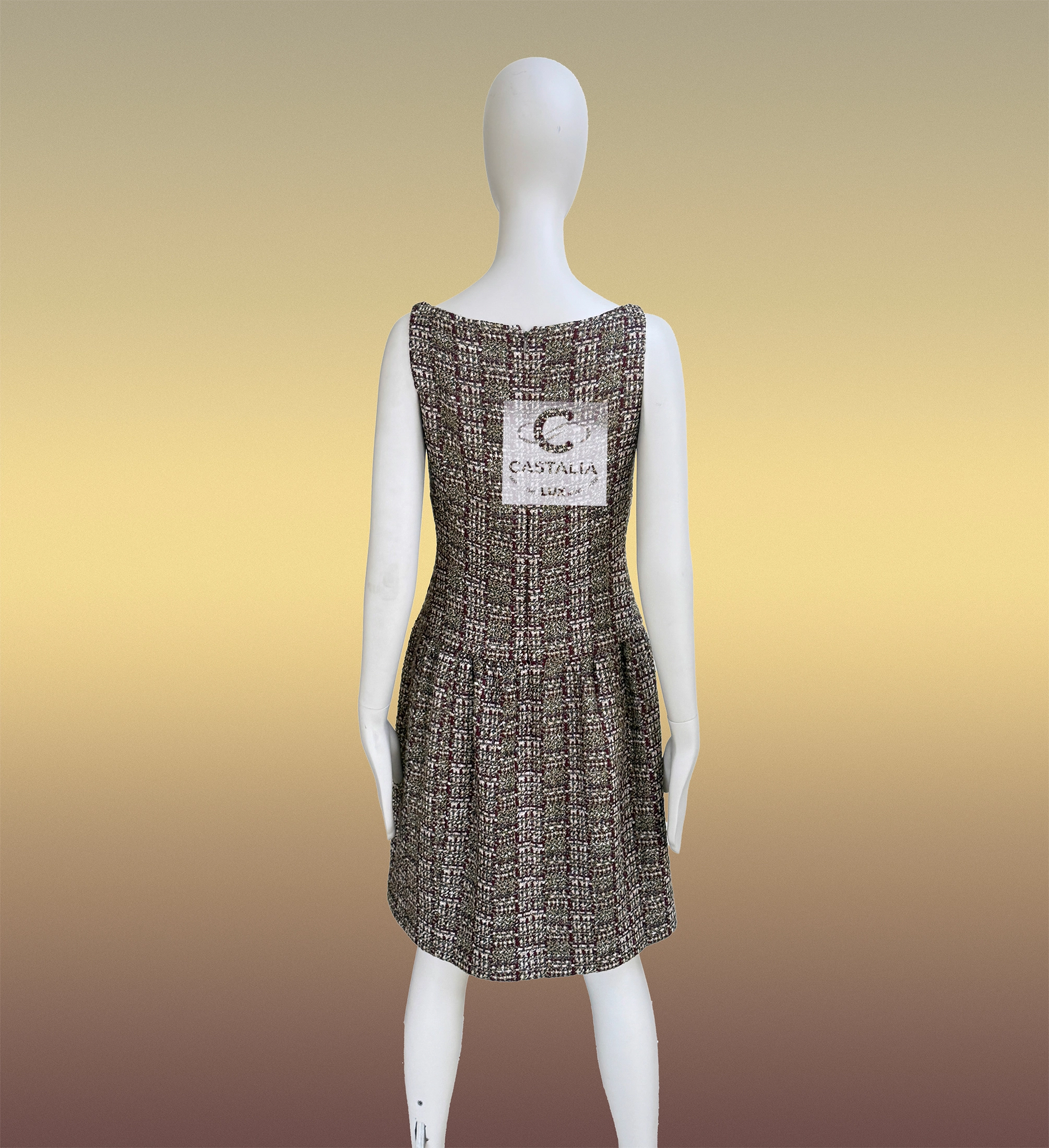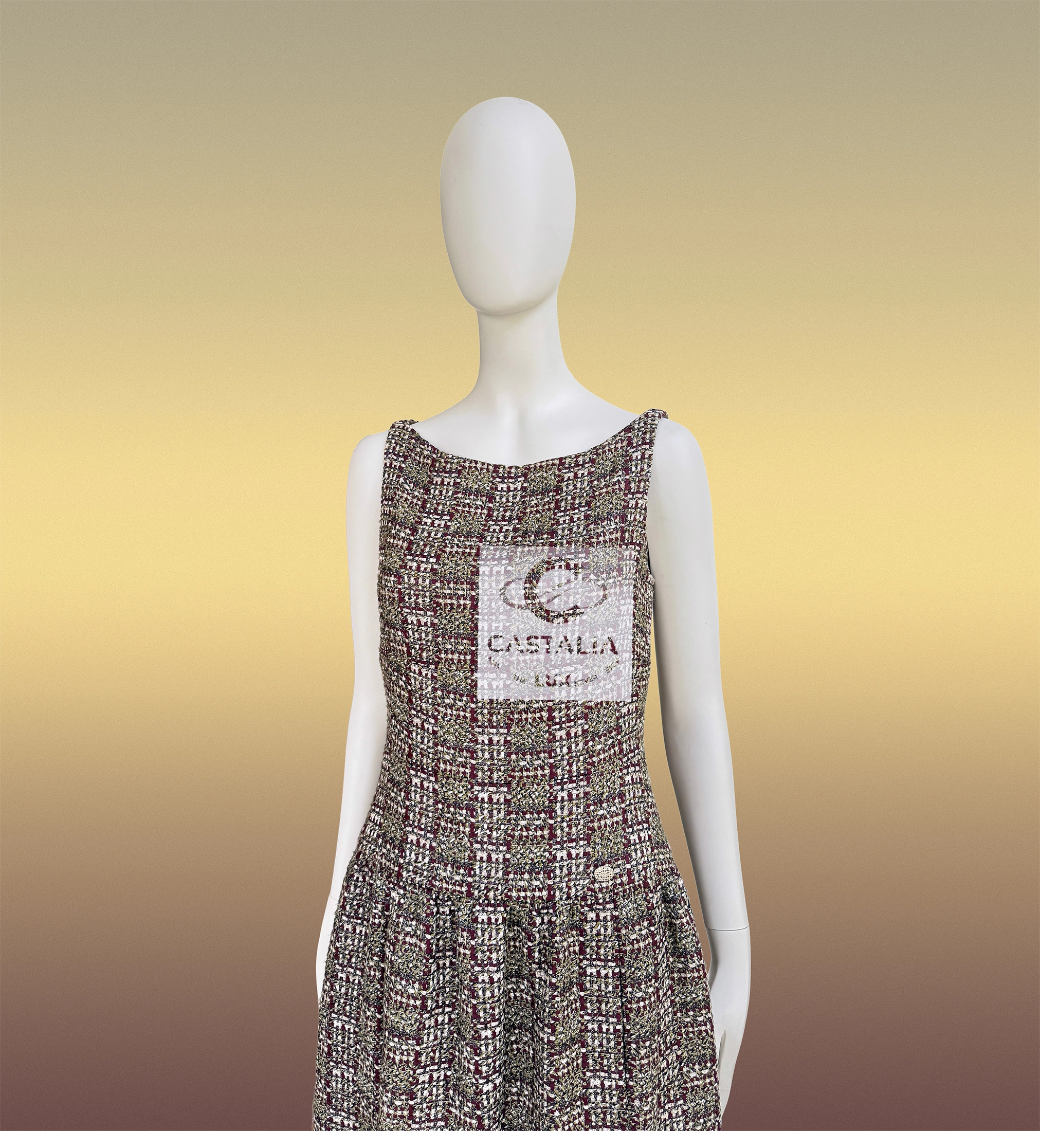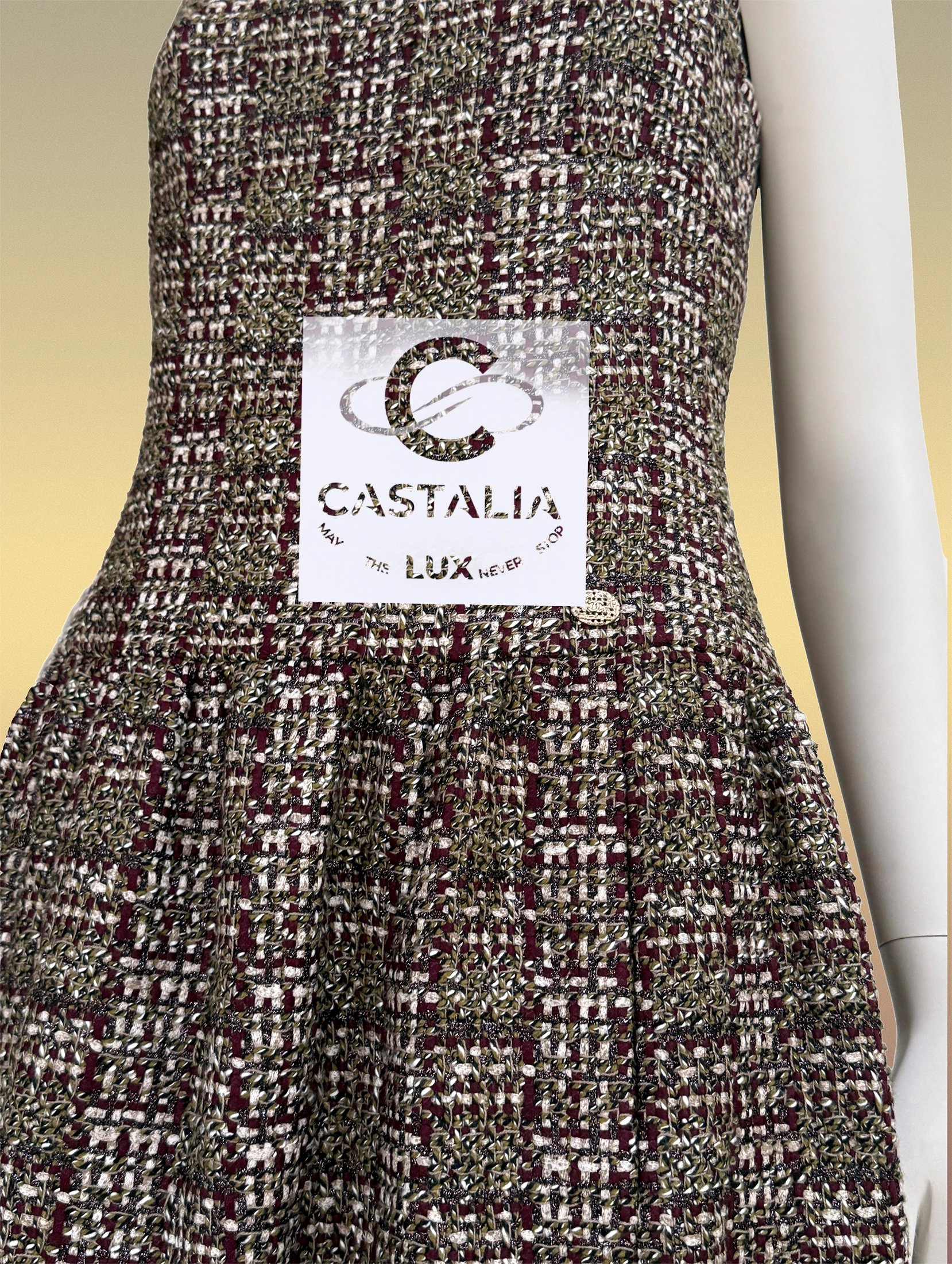 CHANEL Tweed Strapless Dress — Paris / EDINBURGH Métiers d’Art Collection By Karl Lagerfeld / Boutique value 7,680$ / ~ As if cut from the canvas of an autumnal Cézanne, this Chanel strapless tweed dress from the storied Paris / Edinburgh collection evokes the romantic severity of the Highlands, distilled through the lens of haute couture ~ This is not merely a garment — it is an ode to form, discipline, and ornamentation, where architecture meets art in a dialogue of soft inner strength // Size mark 38 FR / Condition: never worn // — sculpted corset bodice and structured skirt are hewn from a tapestry of earthy burgundy, peat-moss green, and flickering ivory — a palette so rich in texture and nuance, it speaks in brushstrokes — At the waist, a subtle CC logo jewel charm gleams like a hidden sigil, whispering allegiance to the House's eternal codes — Each thread interlaces like a Highland fugue, woven with the solemn poetry of rain-soaked stones and ancestral heraldry — Lined in tonal silk adorned with camellias — quiet luxury, spoken in the language of myth.