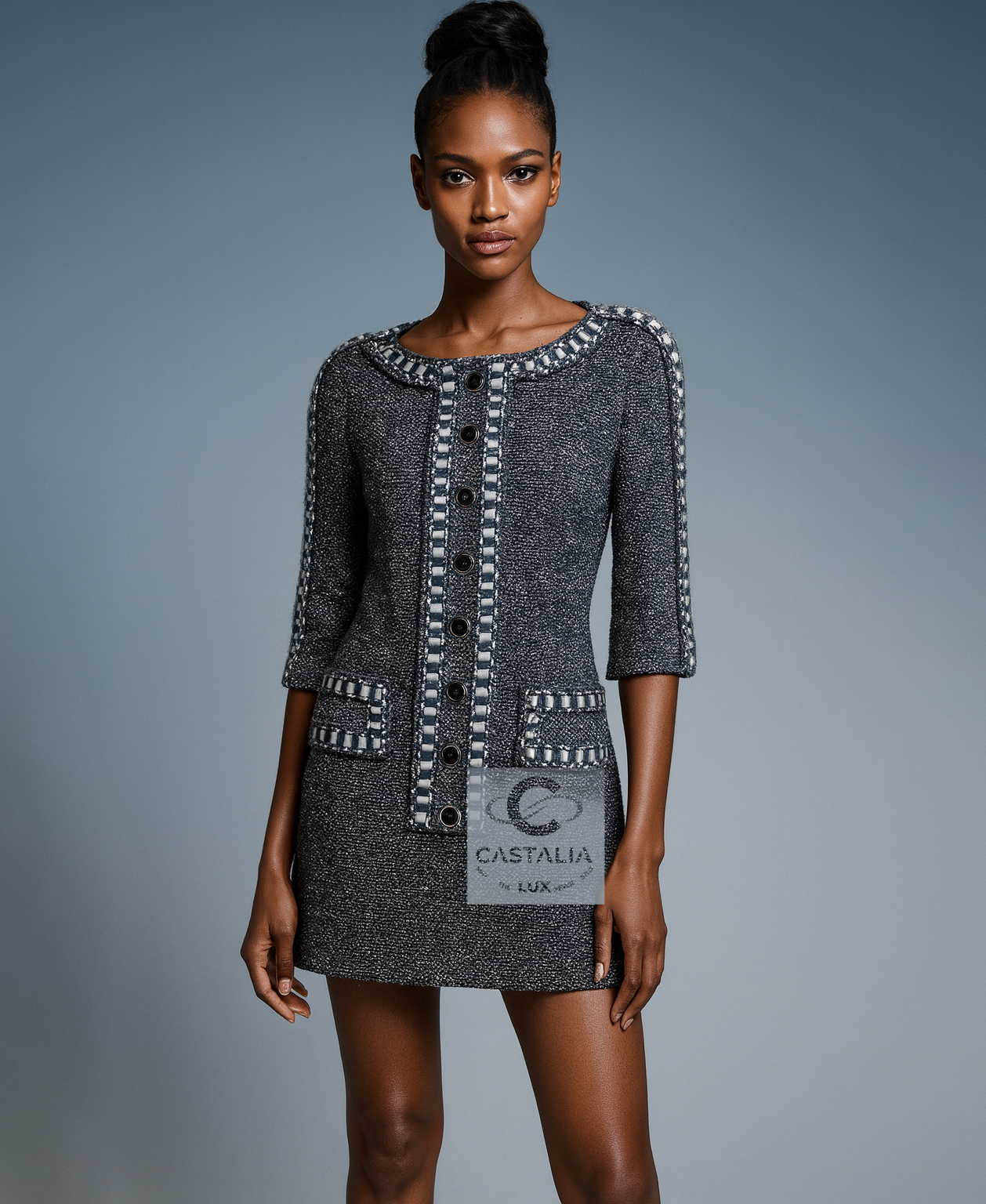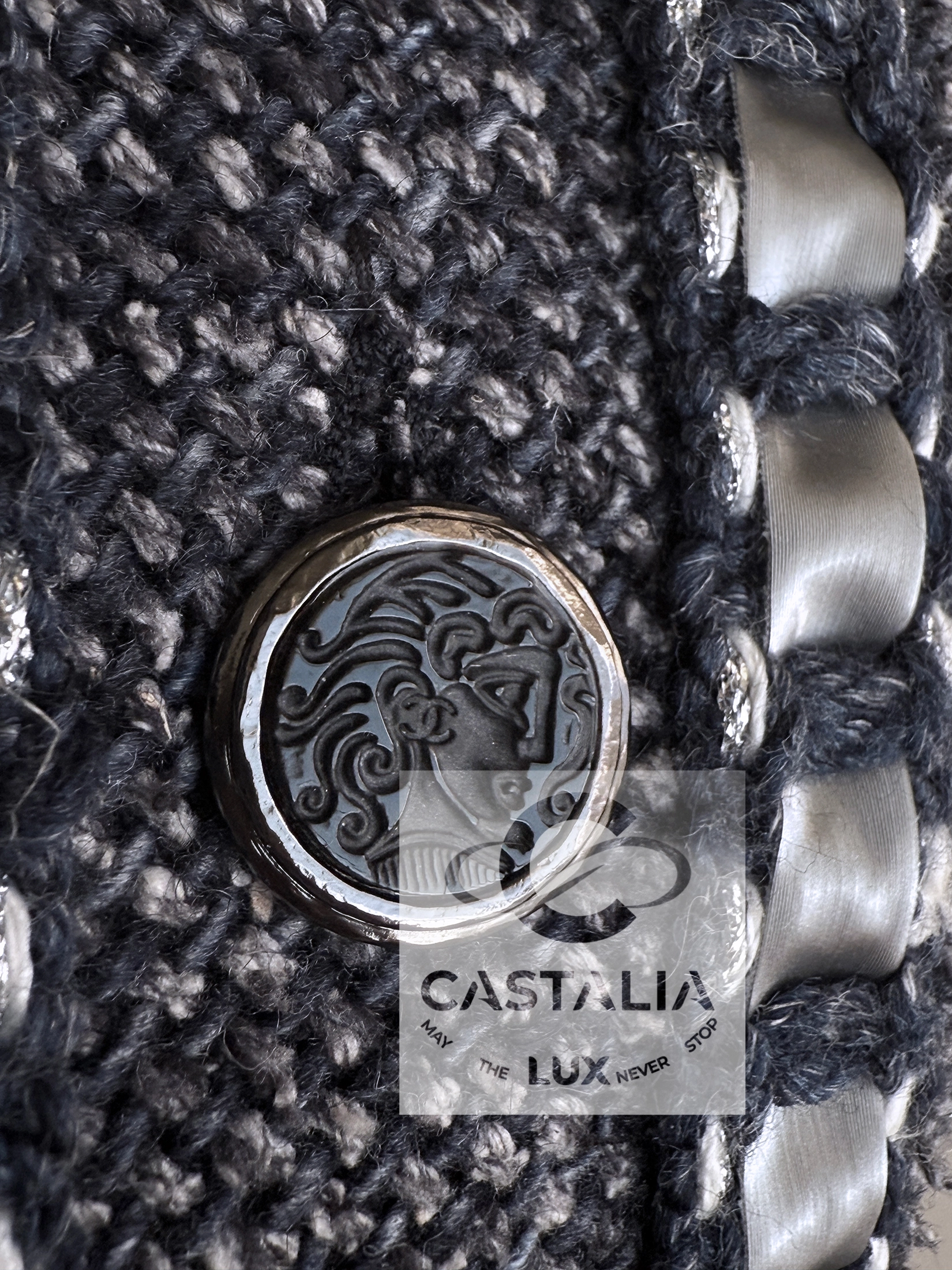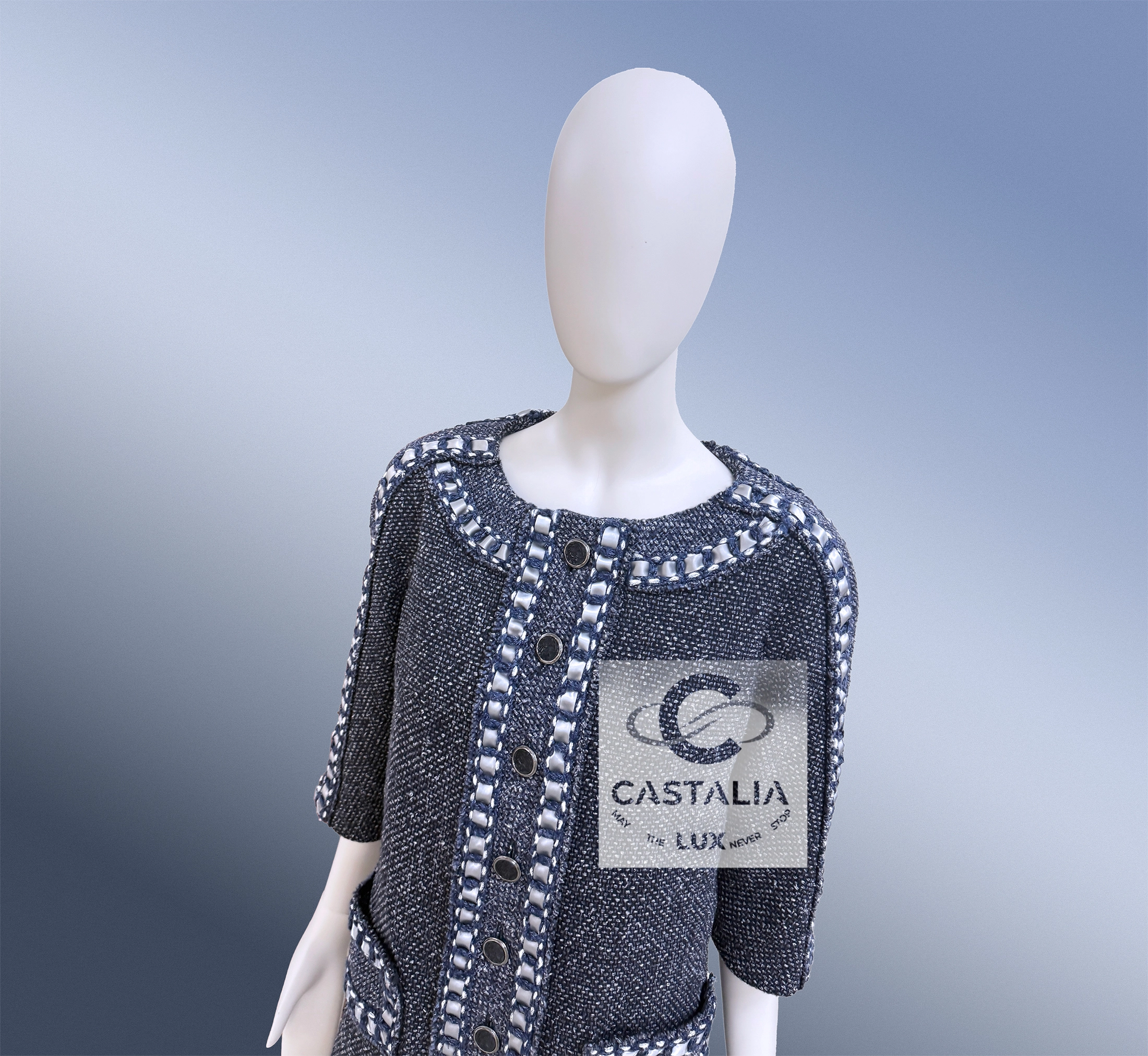 CHANEL · Collectible Silk Tweed Dress — “Paris / ROME” Métiers d’Art Collection 2016 · by Karl Lagerfeld // Boutique Value Over $8,000 // ~ In this masterpiece, Chanel translates cinema into couture — the woven light of a film becomes texture, the echo of Rome becomes fabric ~ A museum-grade collectible and a meditation on movement, memory, and the alchemy of craft // Size mark 34 FR / Condition: never worn // — a dress woven in precious silk tweed, in a noble steel bluish-gray tone, it captures the nocturnal mystique of Cinecittà and the eternal city’s poetry — The iconic cassette-link trim, interlacing satin and tweed, pays homage to the reels of Italian cinematography — a motif of memory and movement — Decorated with CC-logo buttons featuring Roman profiles, each a tiny medallion of antique splendor — lined in tonal silk that anchors the dress in architectural perfection — Half-sleeve cut and straight silhouette evoke the maison’s discipline in form, balancing structure with soft luminosity