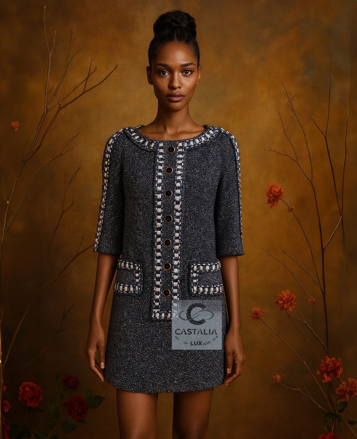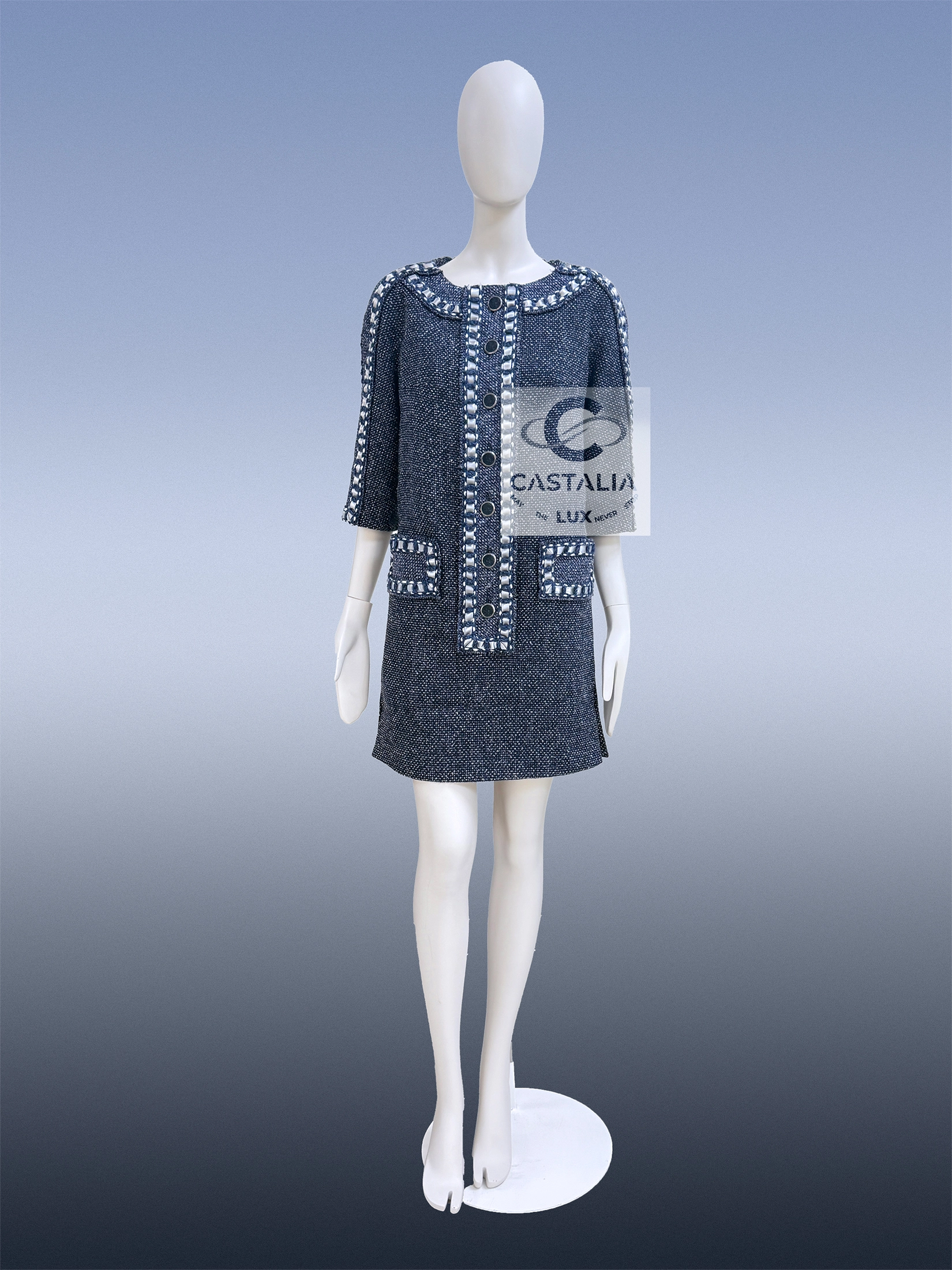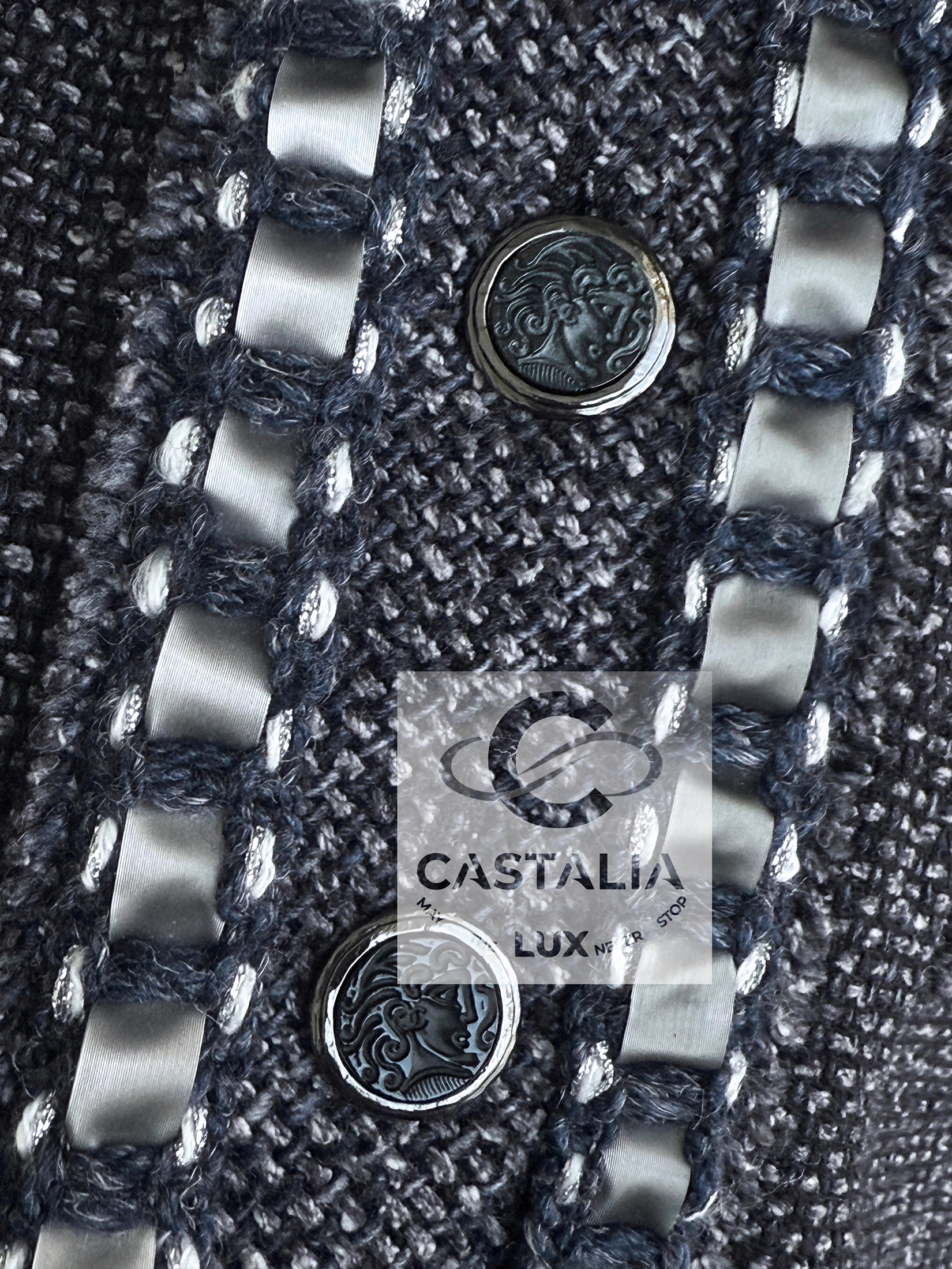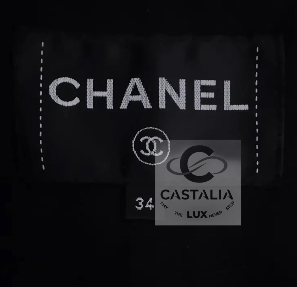CHANEL · Collectible Silk Tweed Dress — “Paris / ROME” Métiers d’Art Collection 2016 · by Karl Lagerfeld // Boutique Value Over $8,000 // ~ In this masterpiece, Chanel translates cinema into couture — the woven light of a film becomes texture, the echo of Rome becomes fabric ~ A museum-grade collectible and a meditation on movement, memory, and the alchemy of craft // Size mark 34 FR / Condition: never worn // — a dress woven in precious silk tweed, in a noble steel bluish-gray tone, it captures the nocturnal mystique of Cinecittà and the eternal city’s poetry — The iconic cassette-link trim, interlacing satin and tweed, pays homage to the reels of Italian cinematography — a motif of memory and movement — Decorated with CC-logo buttons featuring Roman profiles, each a tiny medallion of antique splendor — lined in tonal silk that anchors the dress in architectural perfection — Half-sleeve cut and straight silhouette evoke the maison’s discipline in form, balancing structure with soft luminosity