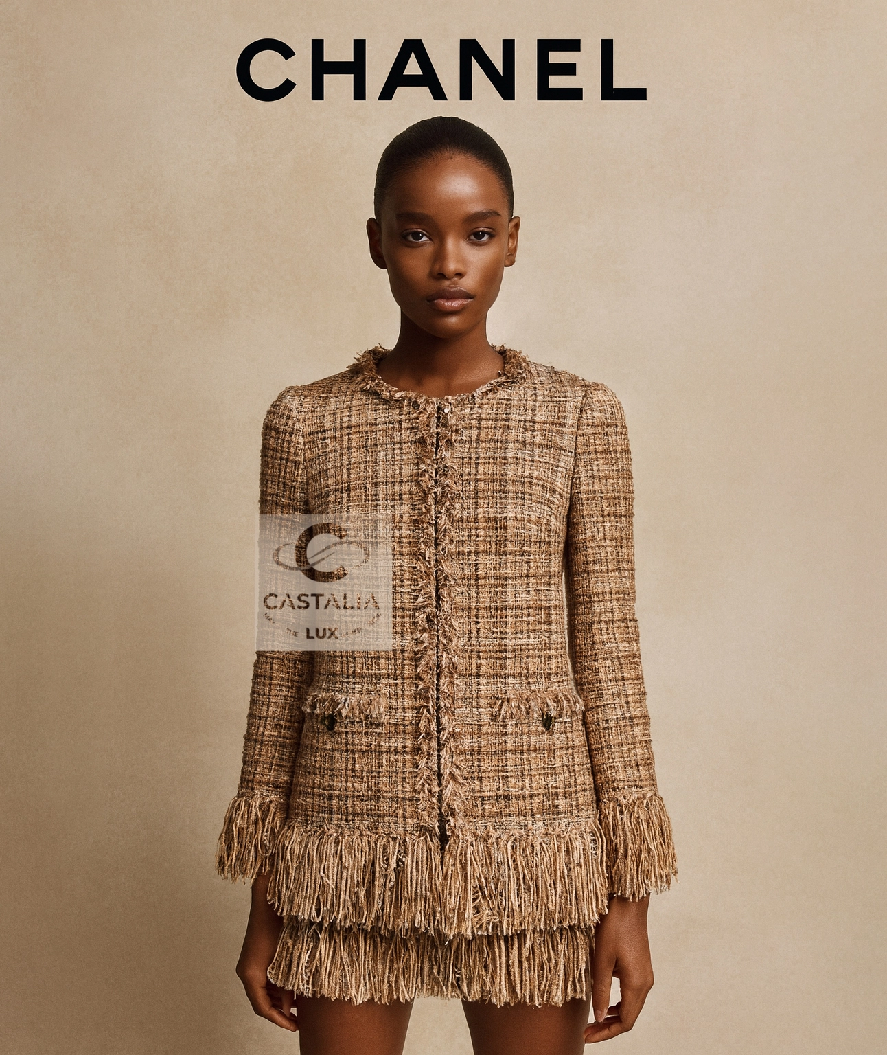 ~ This jacket, emerging from Lagerfeld’s Arctic ICE vision, distills the poetry of sand and frost: a palette of hushed beige woven with interlacing suede and leather ribbons, each strand a frozen whisper of the atelier