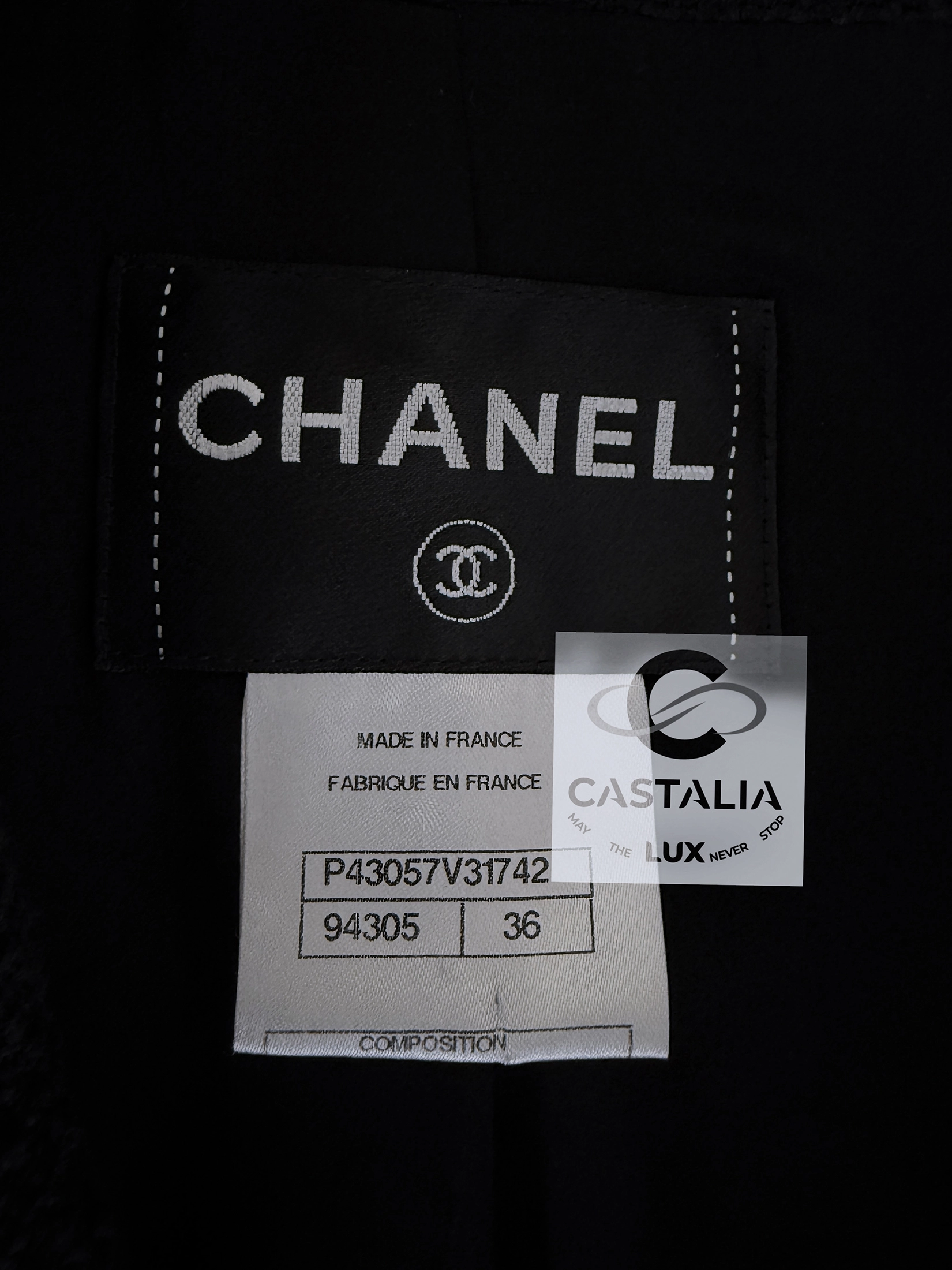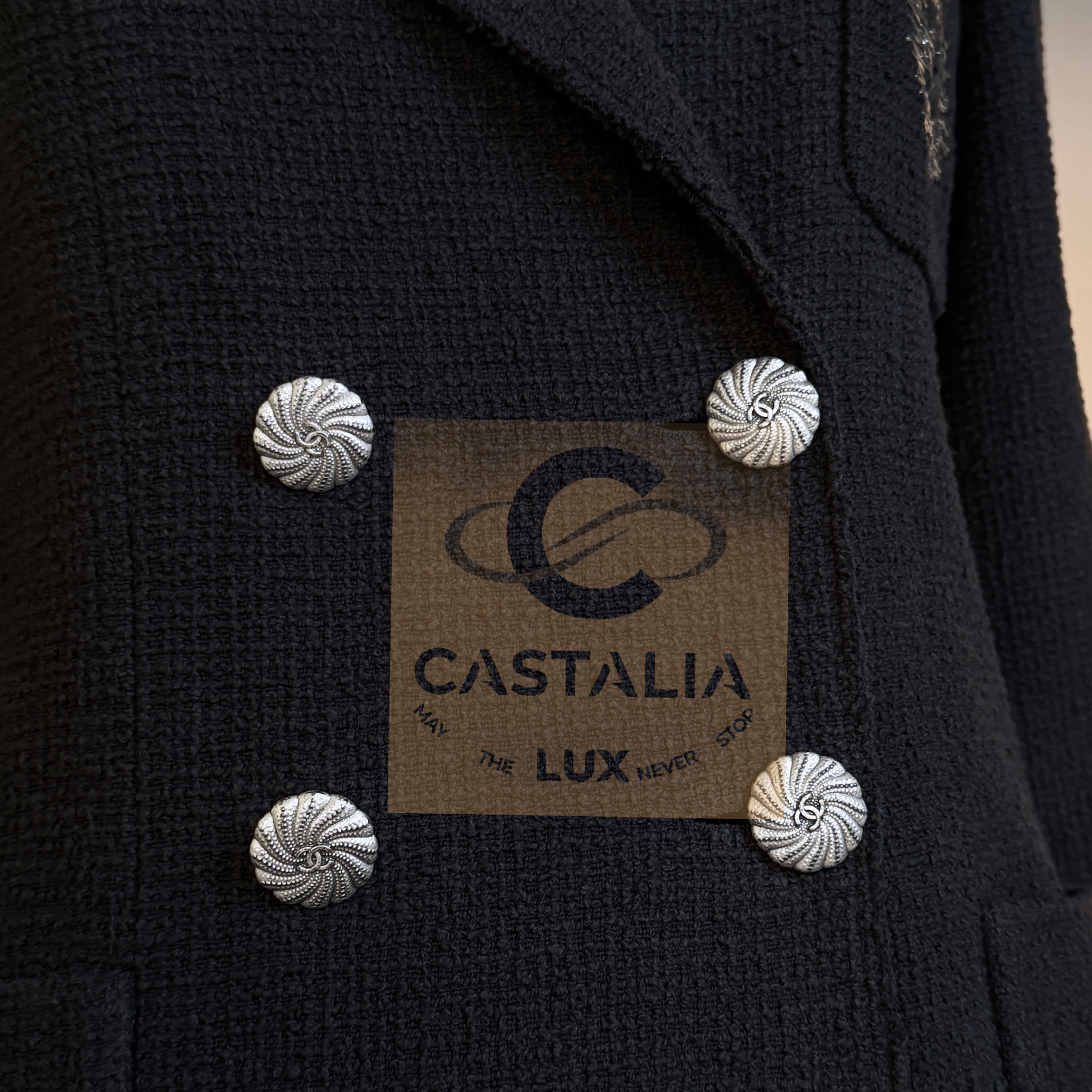 Iconic Chanel black tweed jacket with CC Embroidered Patch, A museum-worthy investment in wearable heritage, merging function with the metaphysical poise of an artifact destined to outlast its century. // Size mark 36 FR / Condition: never worn // — Crafted in the Maison’s signature black tweed , the silhouette is double-breasted and — adorned with four silver-tone CC shell buttons, their sculptural relief catching light like tide on polished stone — left pocket bears an embroidered CC logo crest—an emblem of Chanel’s enduring lineage—executed with intricate metallic threadwork upon the patch pocket — Fully lined in tonal silk and weighted at the hem with the hallmark chain link for perfect fall, this piece carries the quiet authority of the atelier’s hand.