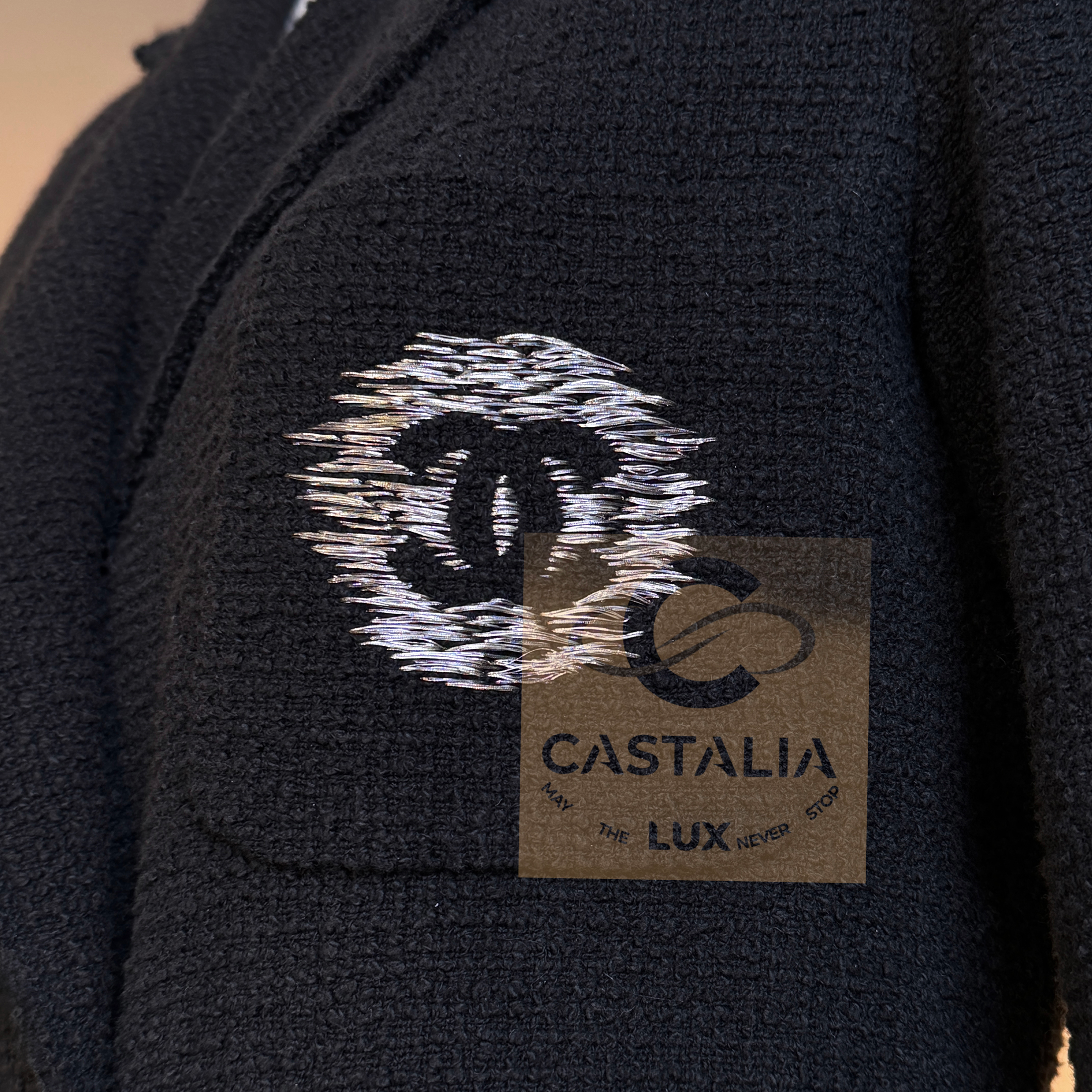— left pocket bears an embroidered CC logo crest—an emblem of Chanel’s enduring lineage—executed with intricate metallic threadwork upon the patch pocket