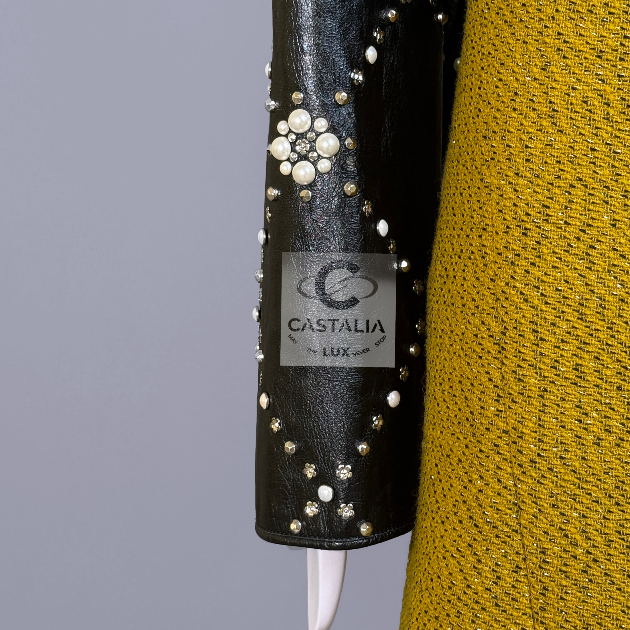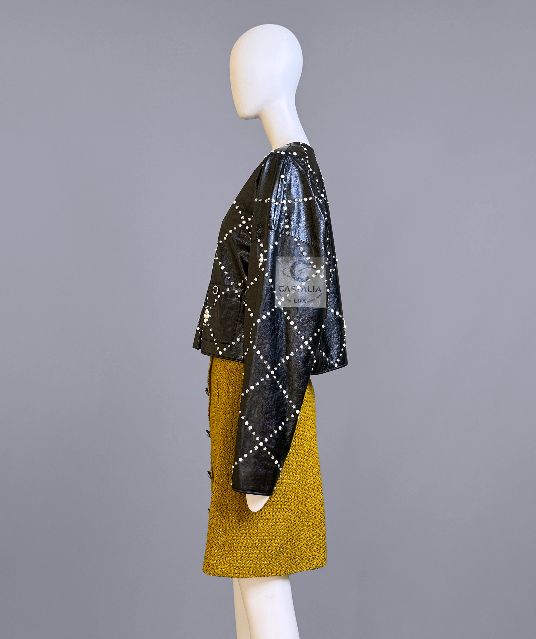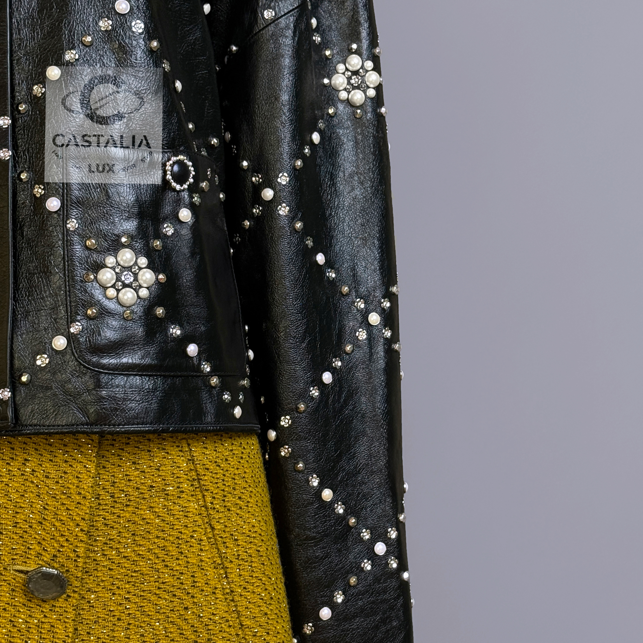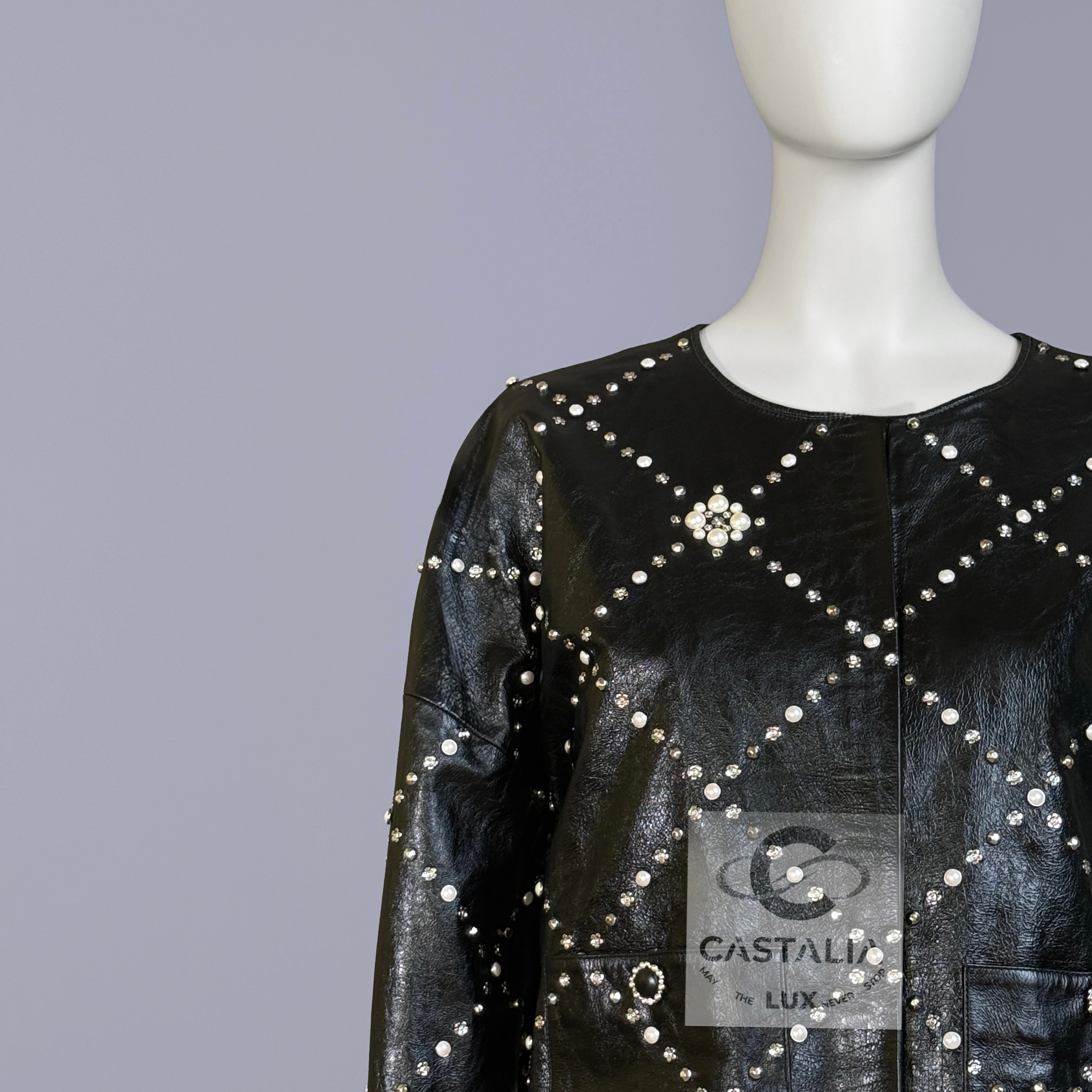 CHANEL · Black Leather Jacket with Jewel & Pearls Embellishment — 2021 Métiers d’Art ‘’CHATEAU Des DAMMES”, Virginie Viard • Boutique value: over $25,000 — As appeared on Kristen Stewart in AD Campaign, this is one of those modern Chanel pieces that enters the cultural record immediately: not trend, but trophy — Métiers d’Art 2021 is Chanel in its modern reliquary mode — craft elevated into cultural document — Designed to be worn as a statement. Kept as evidence. Archived as cultural material. // Size mark 50 FR / Condition: never worn // — House Codes · Material Authority — • Exquisite black leather — dense, supple, and architectural — with Quilted jewel lattice across the entire surface — a disciplined geometry of radiance • Pearls and stones applied as controlled constellations — shimmer as craft, not spectacle — Jewels · Seals · Talisman Hardware — • Masterpiece CC logo jewel Gripoix buttons at the pockets — official seals placed at the points of touch •. Front fastening with CC logo zipper — Silhouette · Presence • Clean, eternal cut — elegant and composed, allowing the embellished surface to speak without noise • Tonal silk lining inside — the private completion that stabilizes drape and confirms Métiers discipline