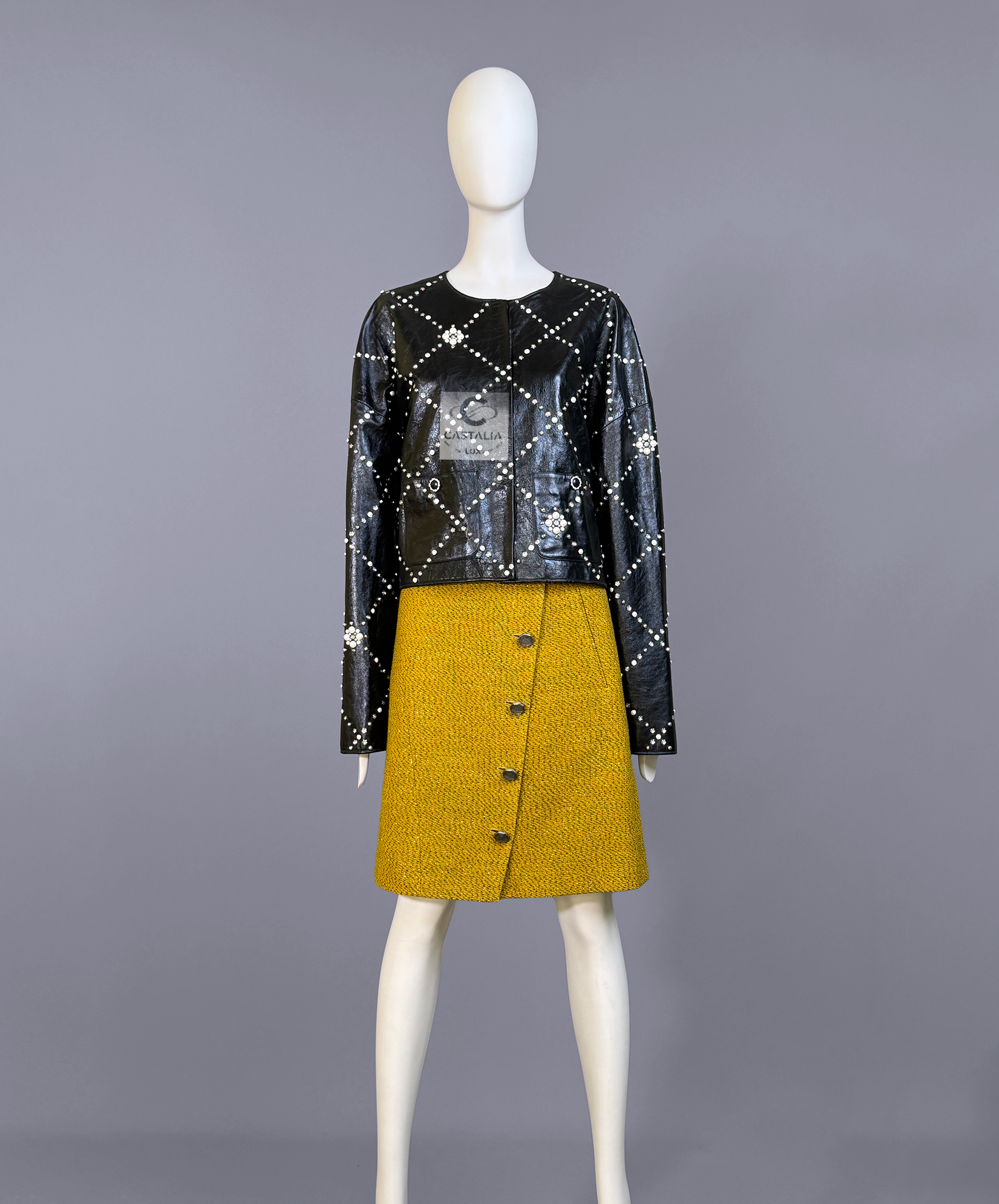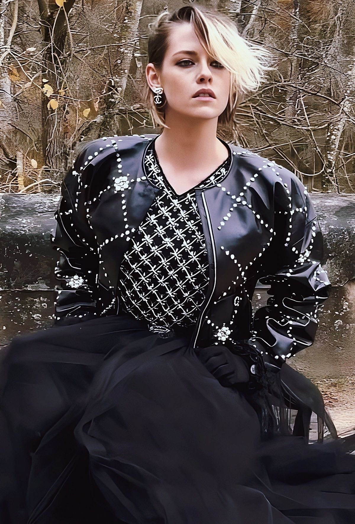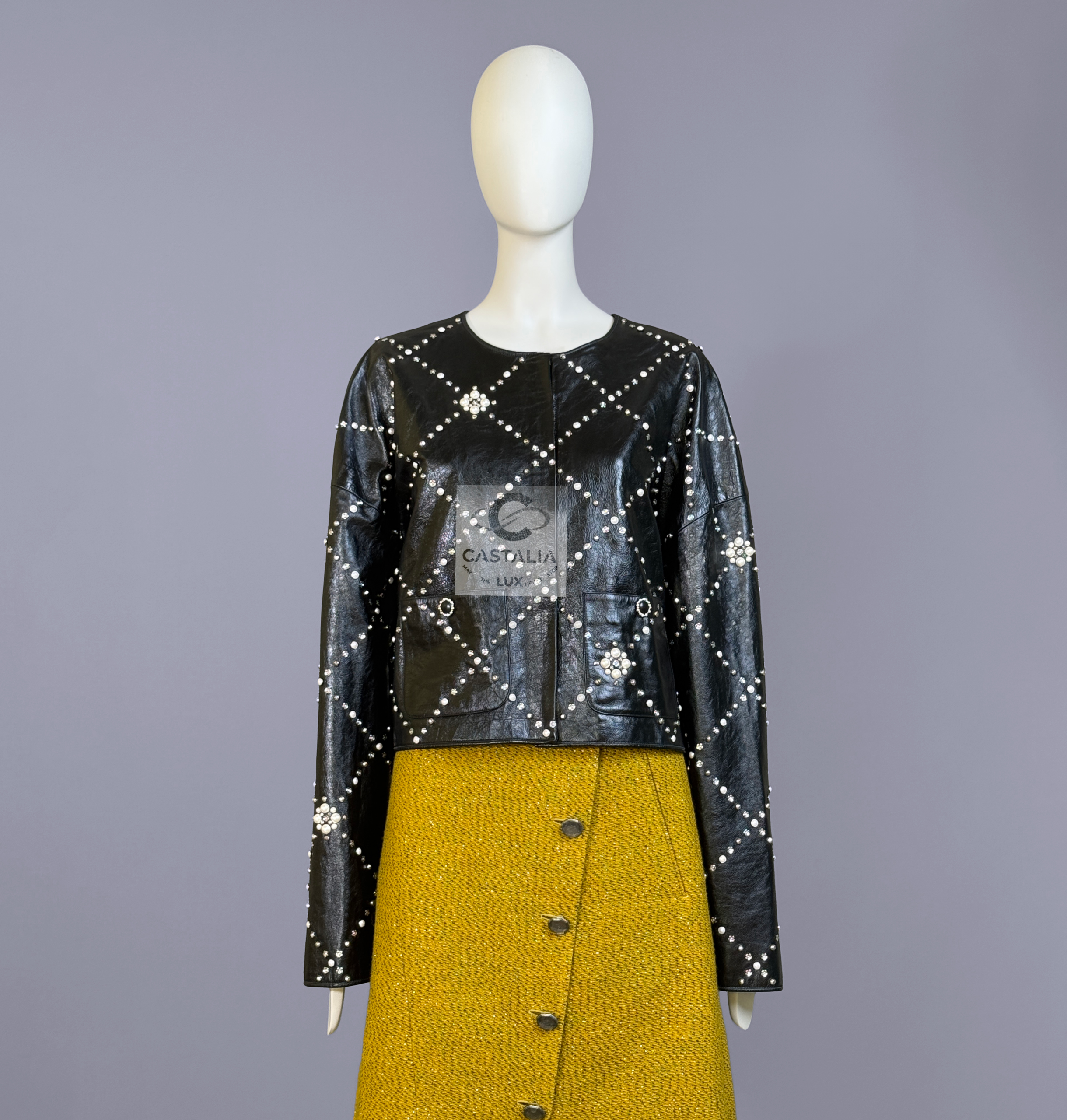 CHANEL · Black Leather Jacket with Jewel & Pearls Embellishment — 2021 Métiers d’Art ‘’CHATEAU Des DAMMES”, Virginie Viard • Boutique value: over $25,000 — As appeared on Kristen Stewart in AD Campaign, this is one of those modern Chanel pieces that enters the cultural record immediately: not trend, but trophy — Métiers d’Art 2021 is Chanel in its modern reliquary mode — craft elevated into cultural document — Designed to be worn as a statement. Kept as evidence. Archived as cultural material. // Size mark 50 FR / Condition: never worn // — House Codes · Material Authority — • Exquisite black leather — dense, supple, and architectural — with Quilted jewel lattice across the entire surface — a disciplined geometry of radiance • Pearls and stones applied as controlled constellations — shimmer as craft, not spectacle — Jewels · Seals · Talisman Hardware — • Masterpiece CC logo jewel Gripoix buttons at the pockets — official seals placed at the points of touch •. Front fastening with CC logo zipper — Silhouette · Presence • Clean, eternal cut — elegant and composed, allowing the embellished surface to speak without noise • Tonal silk lining inside — the private completion that stabilizes drape and confirms Métiers discipline