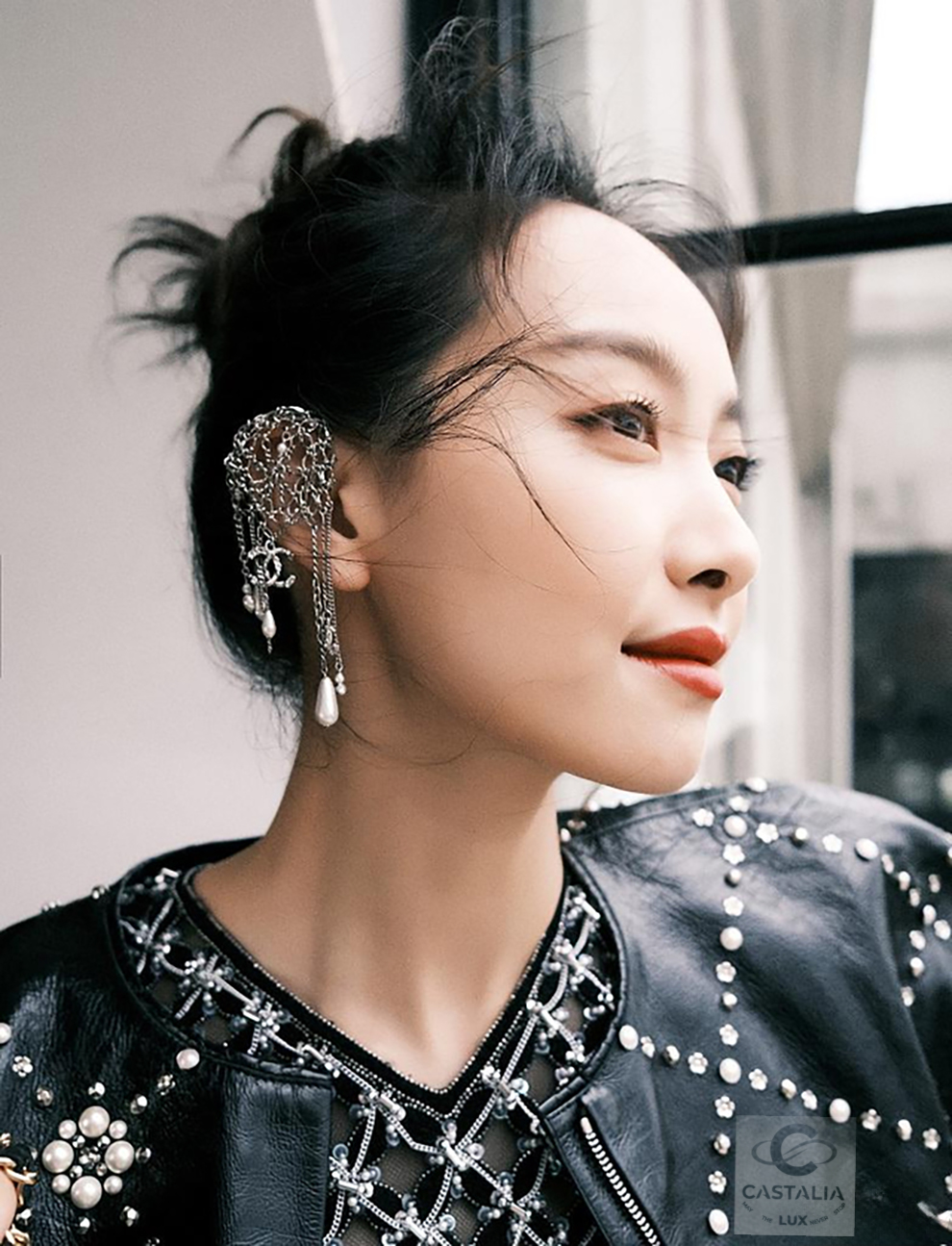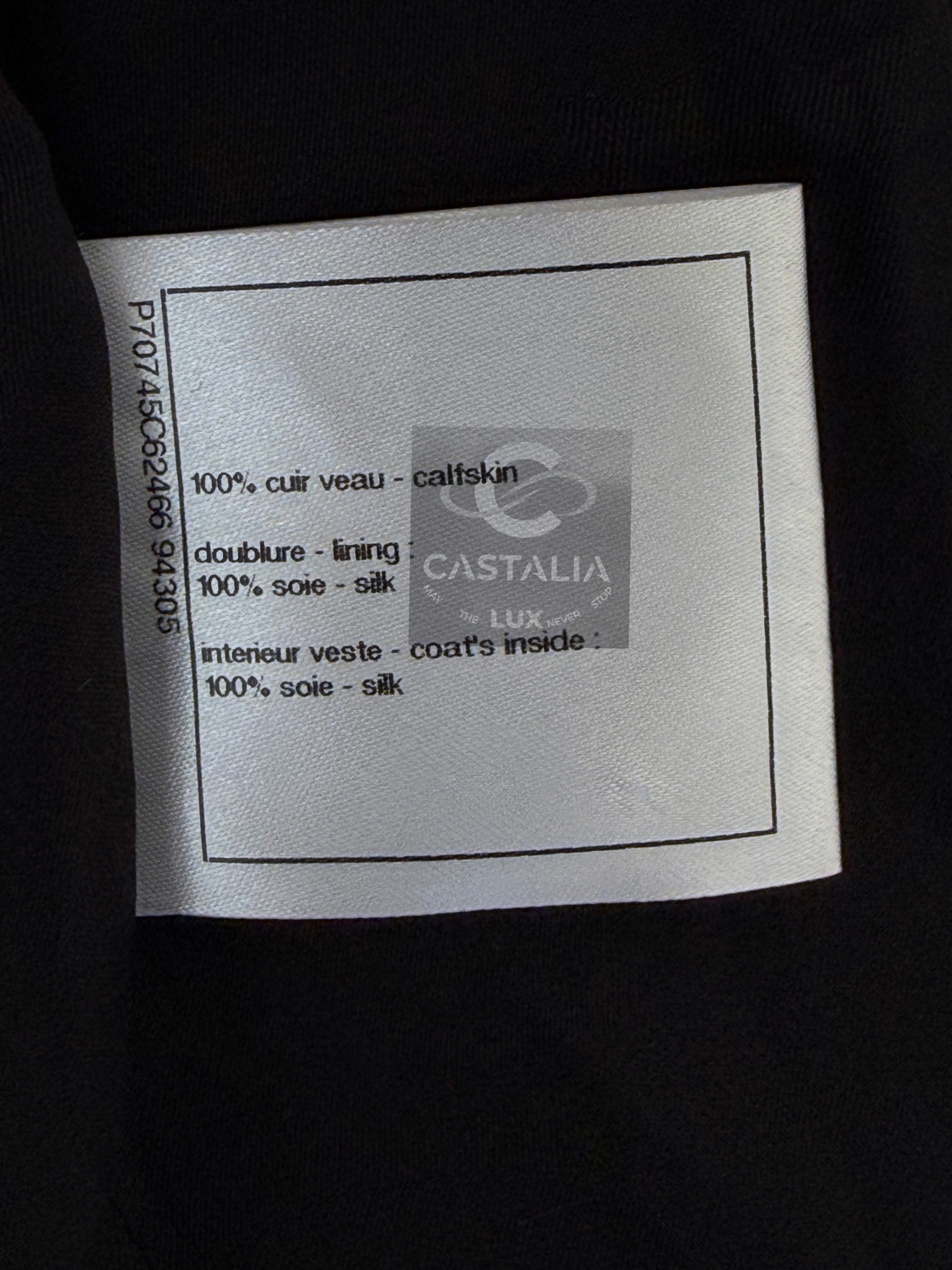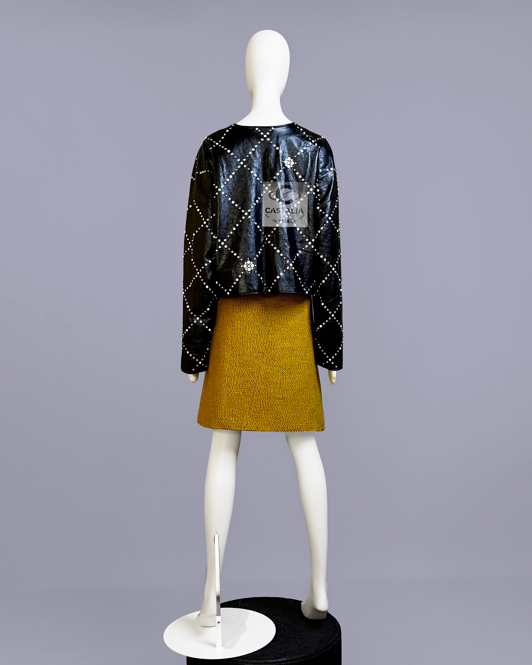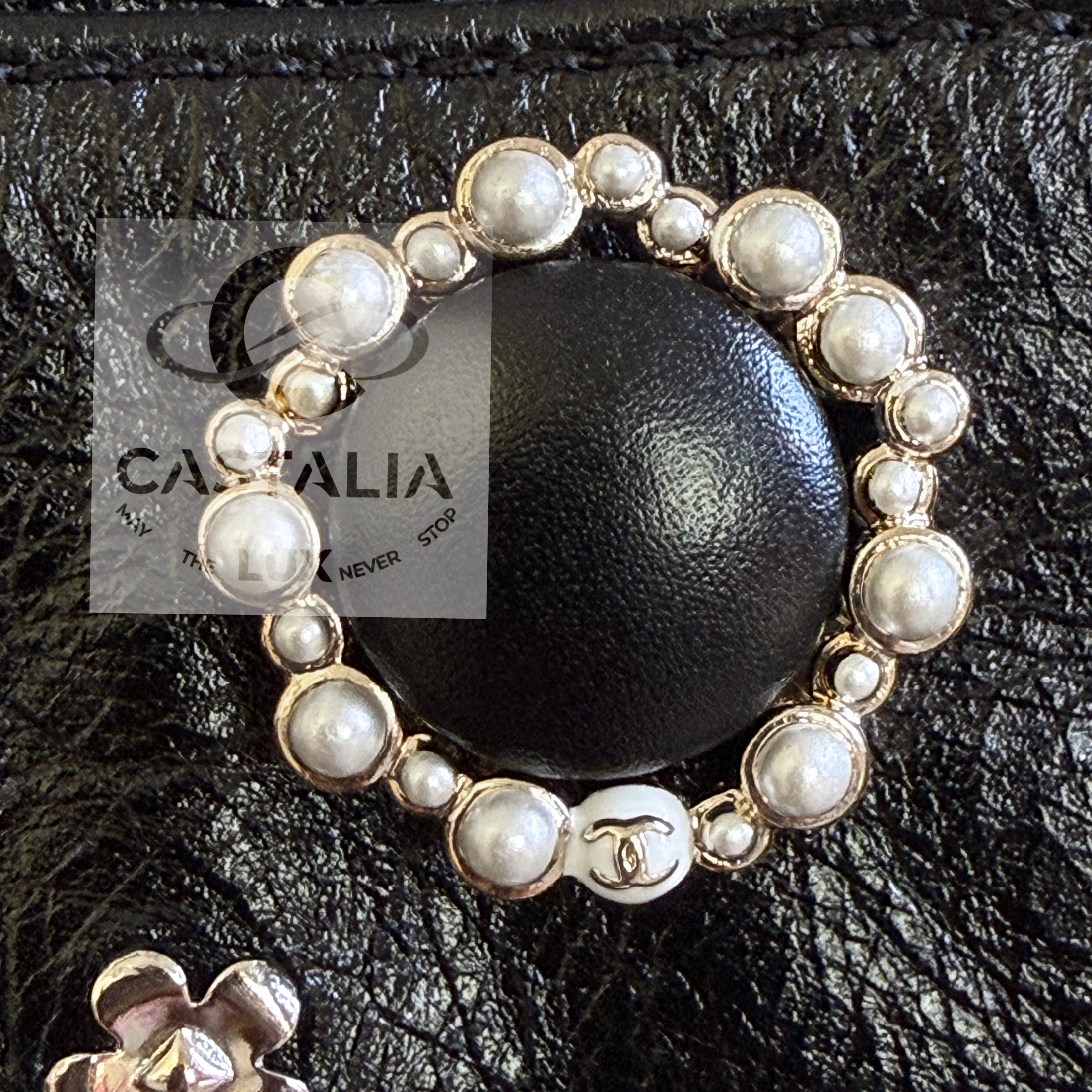 CHANEL · Black Leather Jacket with Jewel & Pearls Embellishment — 2021 Métiers d’Art ‘’CHATEAU Des DAMMES”, Virginie Viard • Boutique value: over $25,000 — As appeared on Kristen Stewart in AD Campaign, this is one of those modern Chanel pieces that enters the cultural record immediately: not trend, but trophy — Métiers d’Art 2021 is Chanel in its modern reliquary mode — craft elevated into cultural document — Designed to be worn as a statement. Kept as evidence. Archived as cultural material. // Size mark 50 FR / Condition: never worn // — House Codes · Material Authority — • Exquisite black leather — dense, supple, and architectural — with Quilted jewel lattice across the entire surface — a disciplined geometry of radiance • Pearls and stones applied as controlled constellations — shimmer as craft, not spectacle — Jewels · Seals · Talisman Hardware — • Masterpiece CC logo jewel Gripoix buttons at the pockets — official seals placed at the points of touch •. Front fastening with CC logo zipper — Silhouette · Presence • Clean, eternal cut — elegant and composed, allowing the embellished surface to speak without noise • Tonal silk lining inside — the private completion that stabilizes drape and confirms Métiers discipline