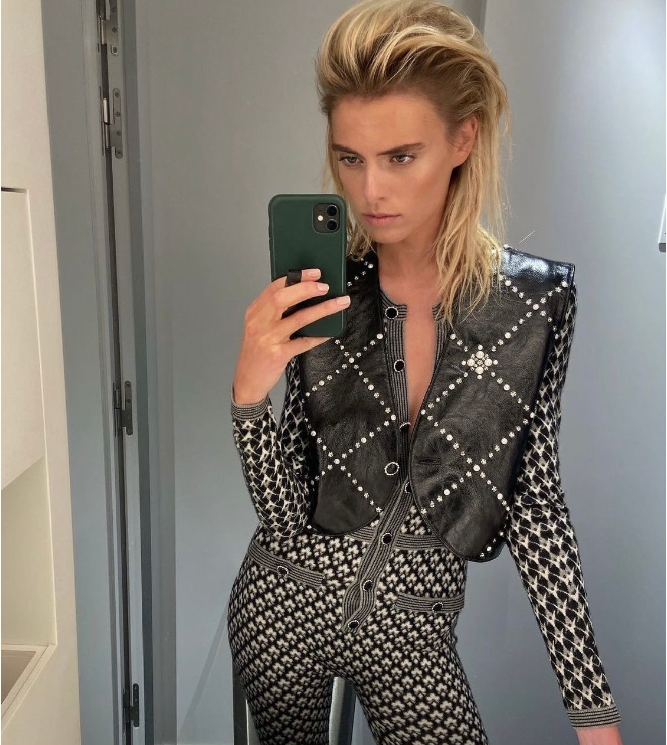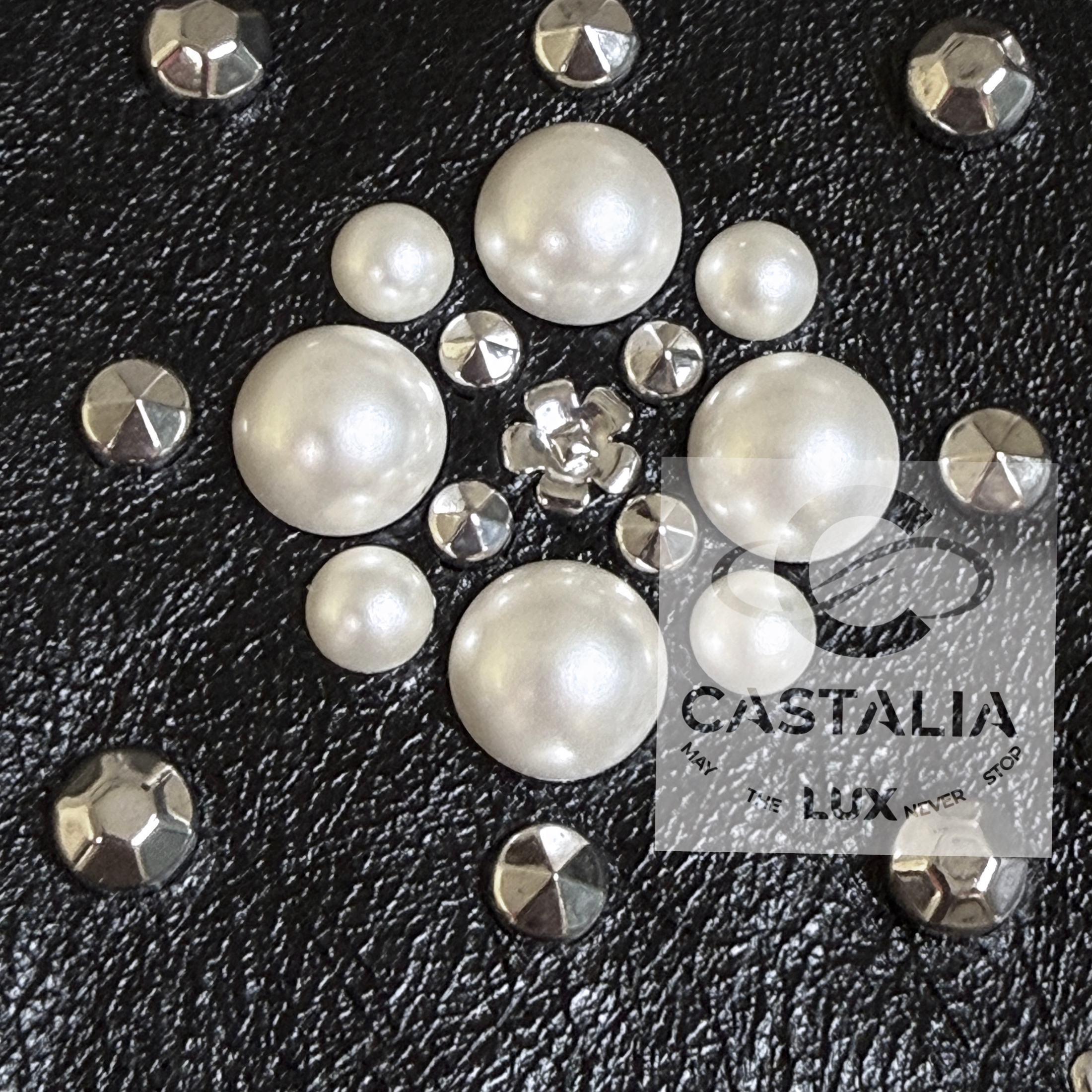 • Exquisite black leather — dense, supple, and architectural — with Quilted jewel lattice across the entire surface — a disciplined geometry of radiance
