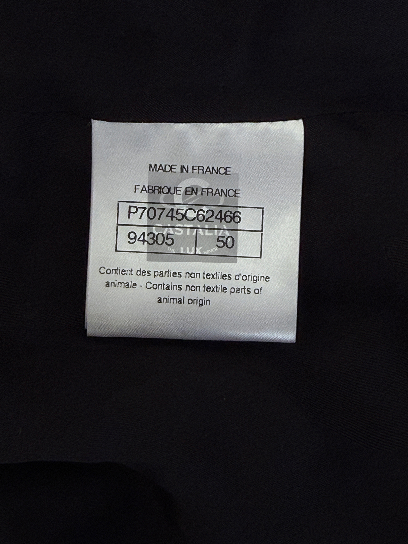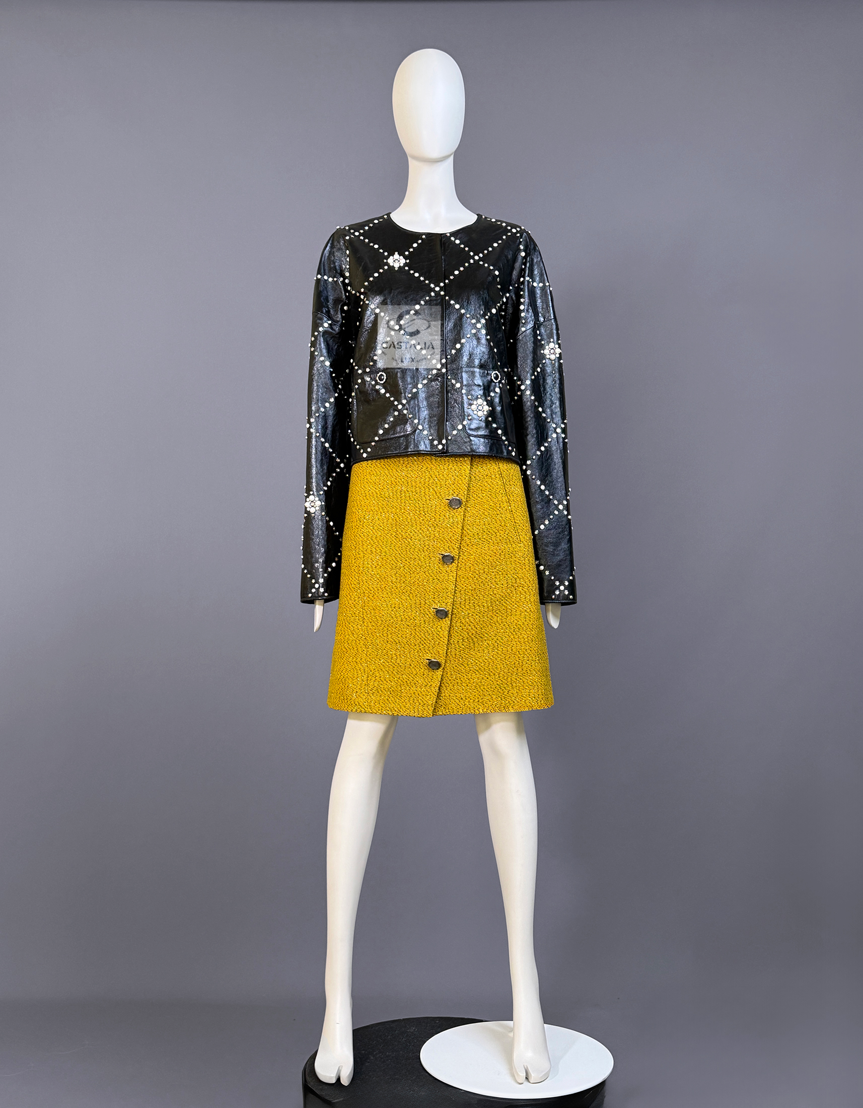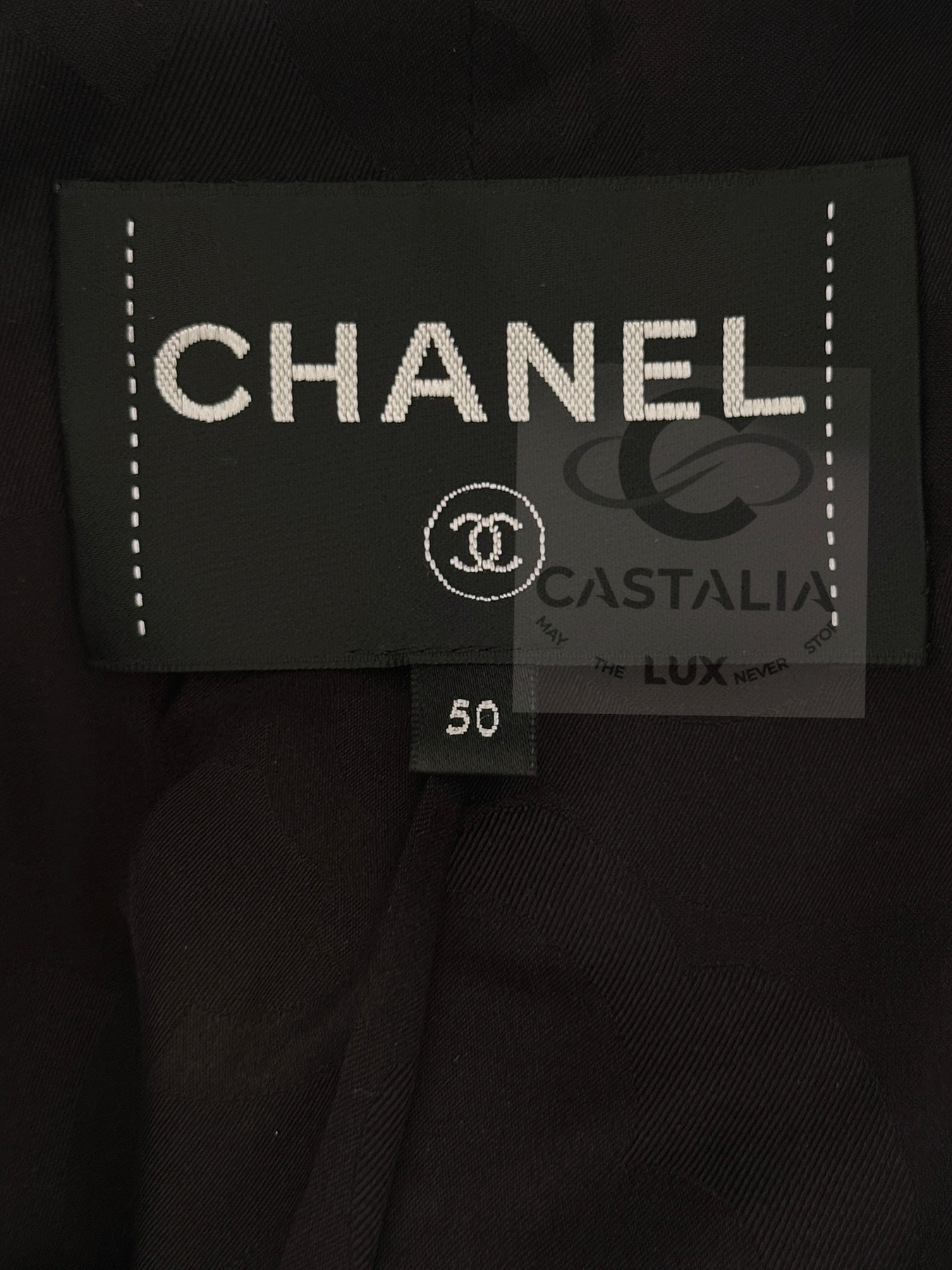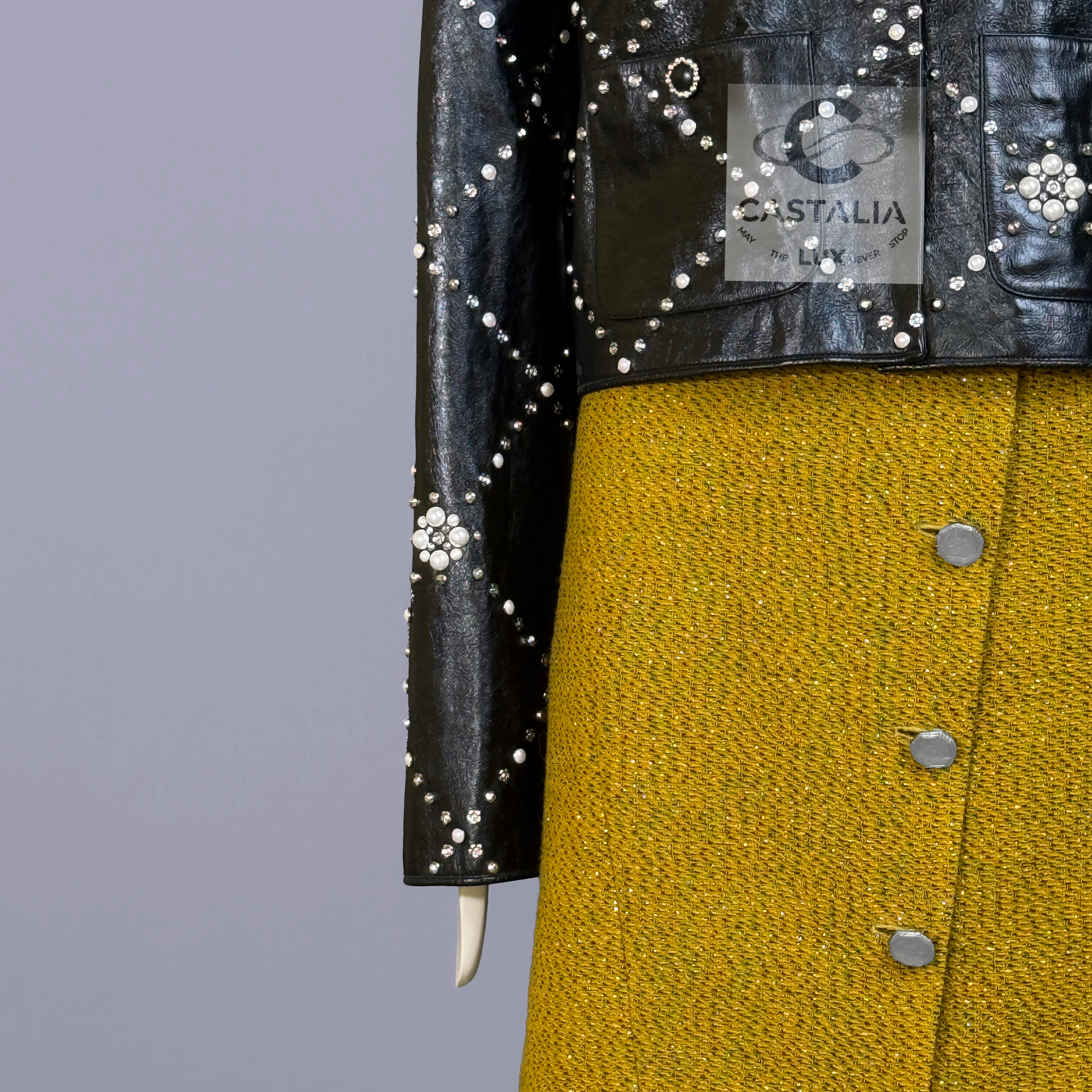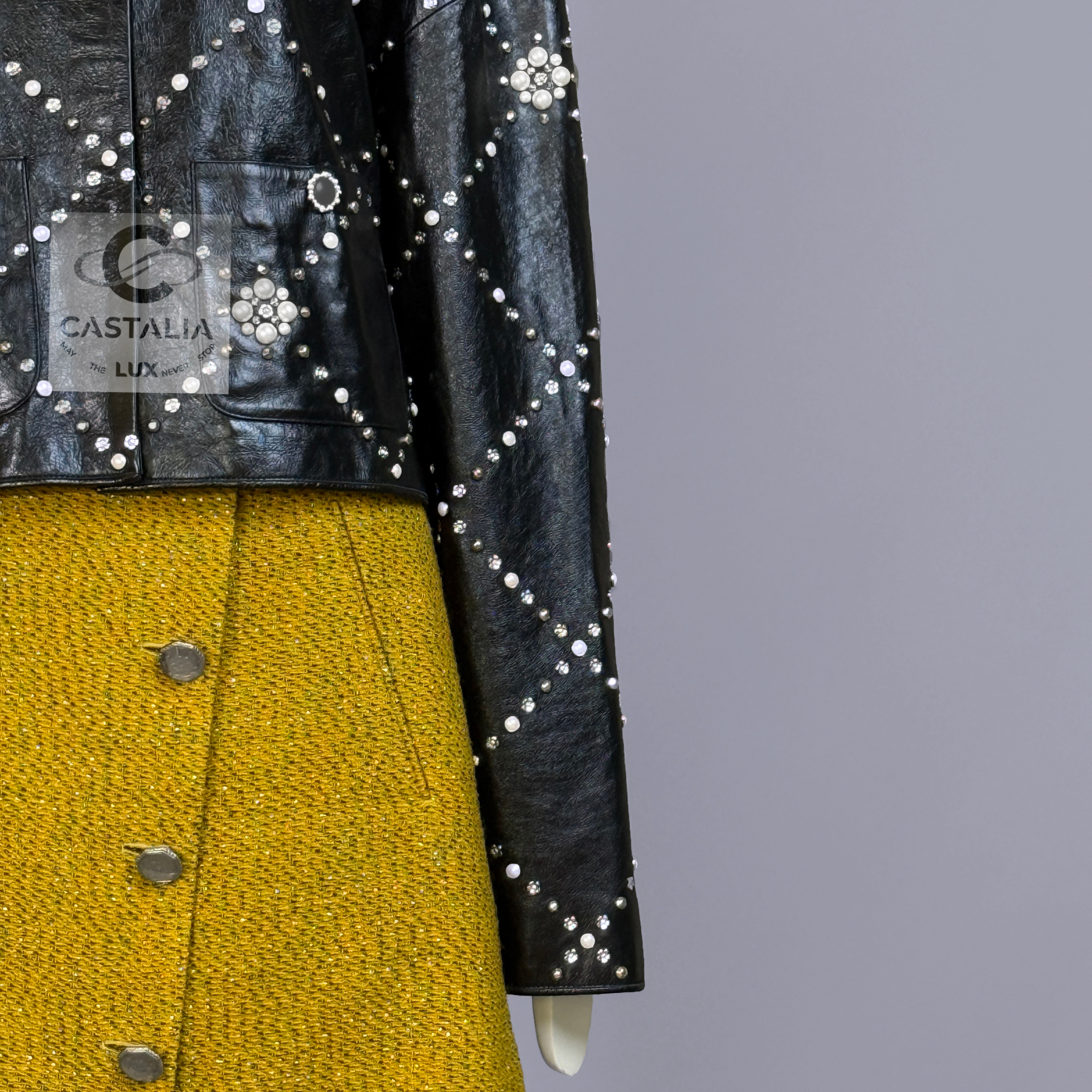 • Masterpiece CC logo jewel Gripoix buttons at the pockets — official seals placed at the points of touch
