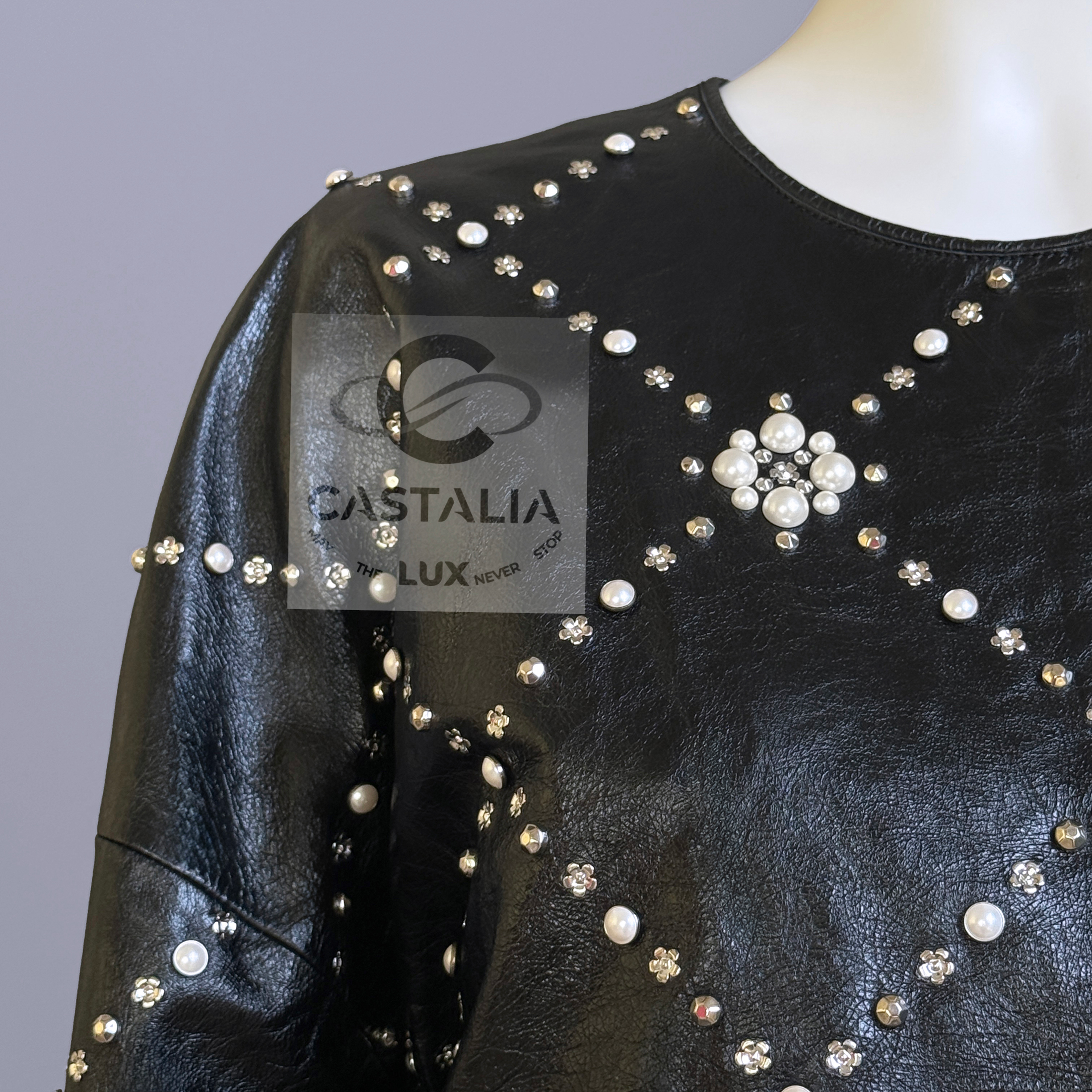 CHANEL · Black Leather Jacket with Jewel & Pearls Embellishment