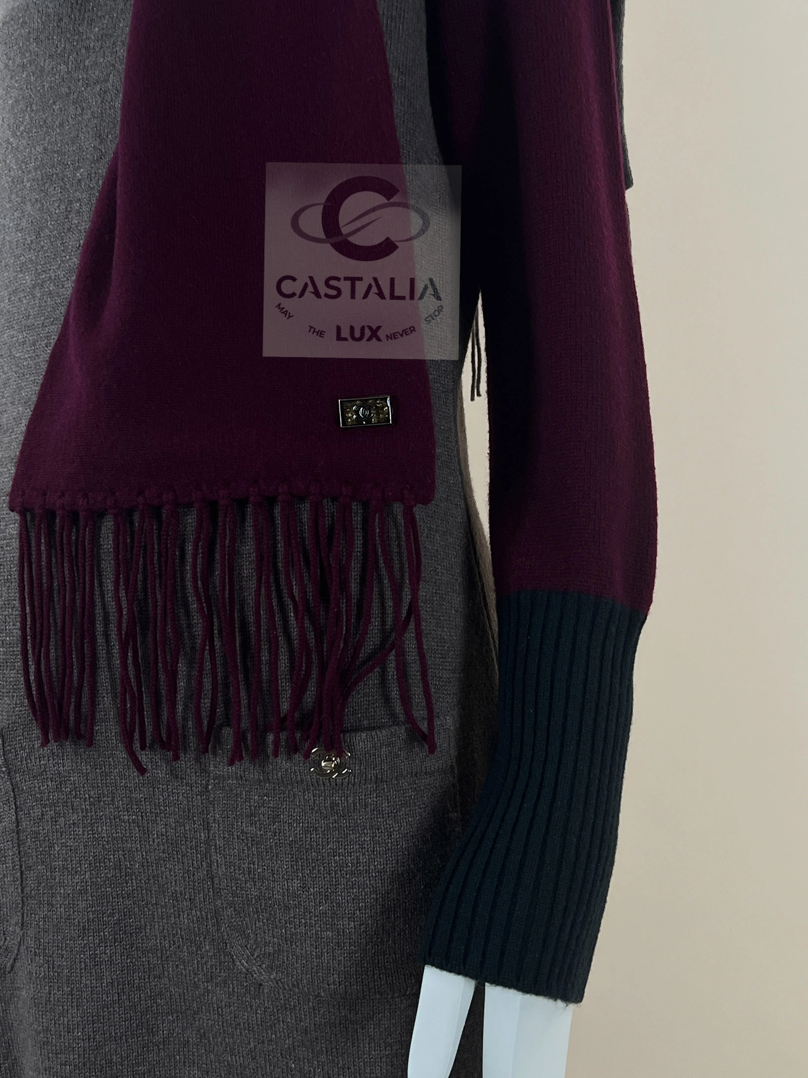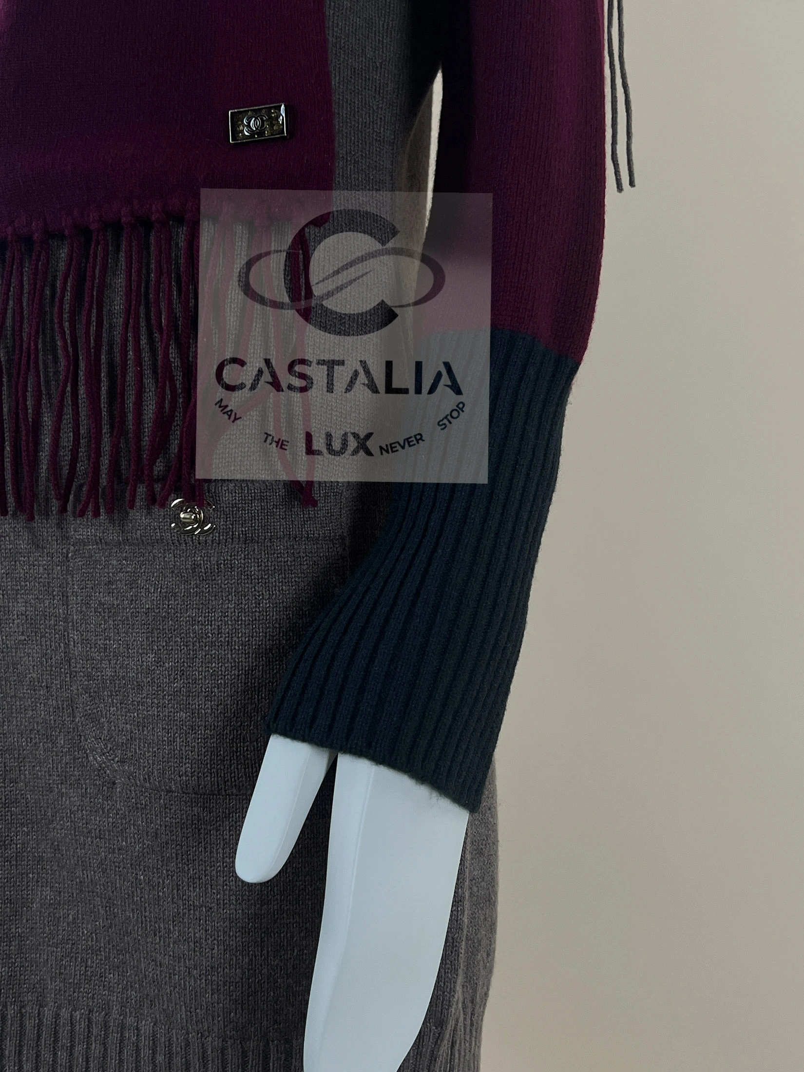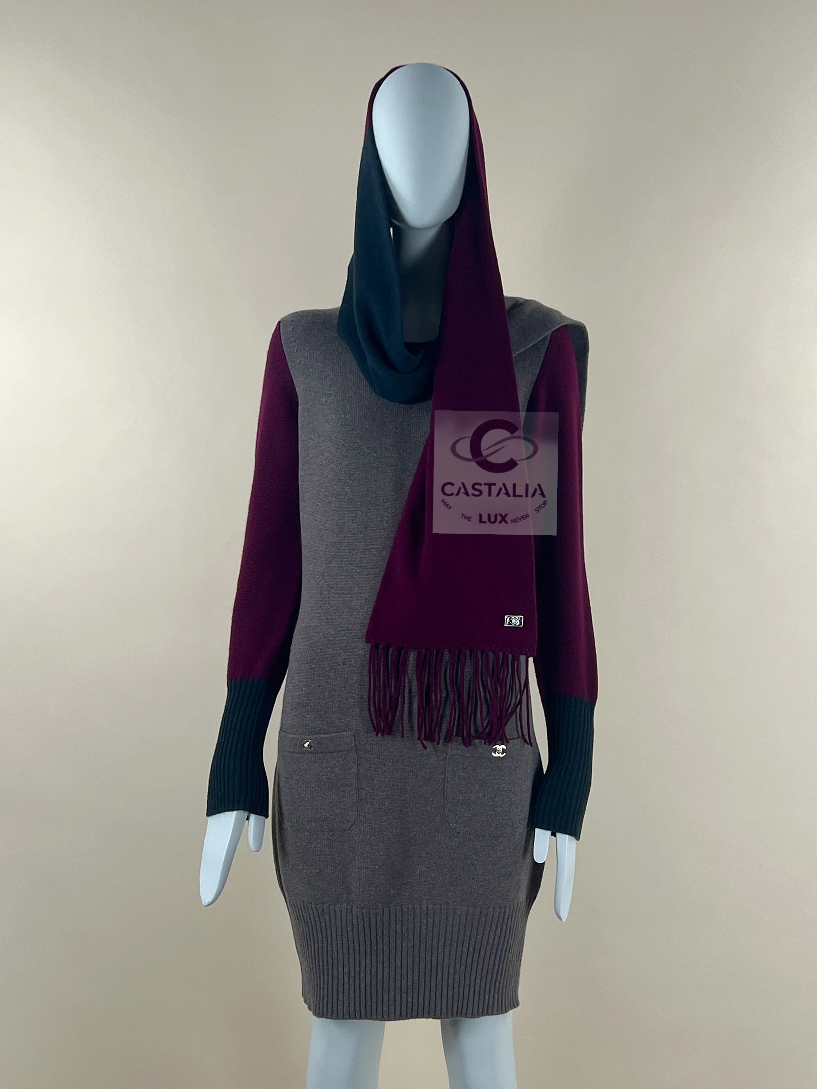 Chanel Cashmere Ensemble — The Trinitarian Harmony of Shade and Form ~ An extraordinary Chanel creation, this ensemble unites a sculpted cashmere dress with a flowing scarf, embodying Karl Lagerfeld’s gift for weaving the everyday into realms of art ~ More than a garment, it is a metaphysical composition — a dialogue of colors, textures, and symbols where fashion becomes liturgy // Size mark 36 FR / Condition: never worn // — The silhouette is enriched with iconic CC turn-lock closures at the dress’s pockets — miniature monuments of Chanel’s architectural precision — while the scarf, adorned with a CC jewel charm, descends like a banner of devotion. — chromatic triad is sublime: muted beige as grounding earth, deep burgundy as the pulse of life, and emerald accents as hidden depths of spirit — Ribbed trims contour the form, lending rhythm and structure