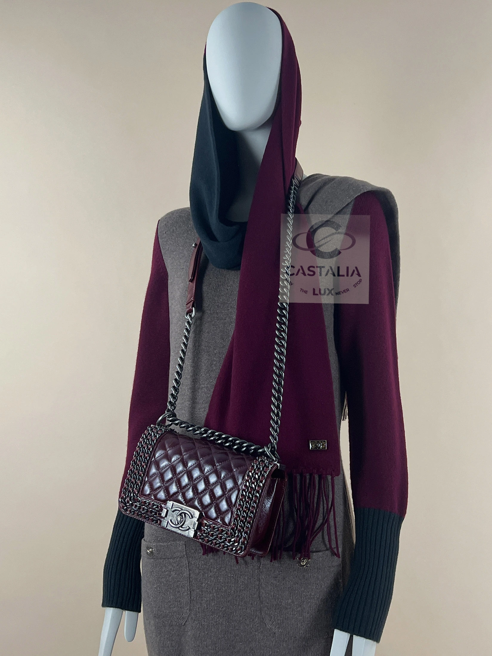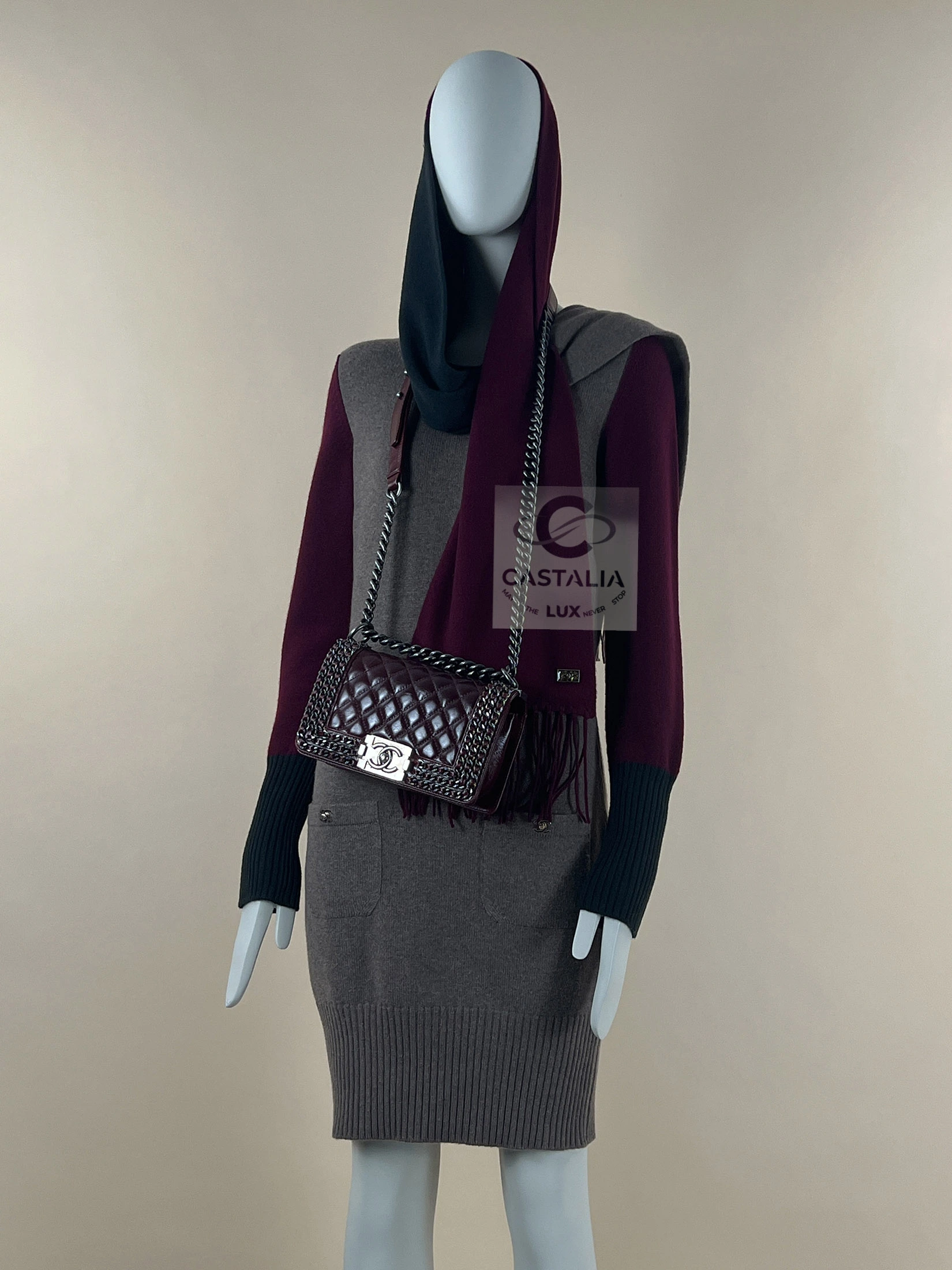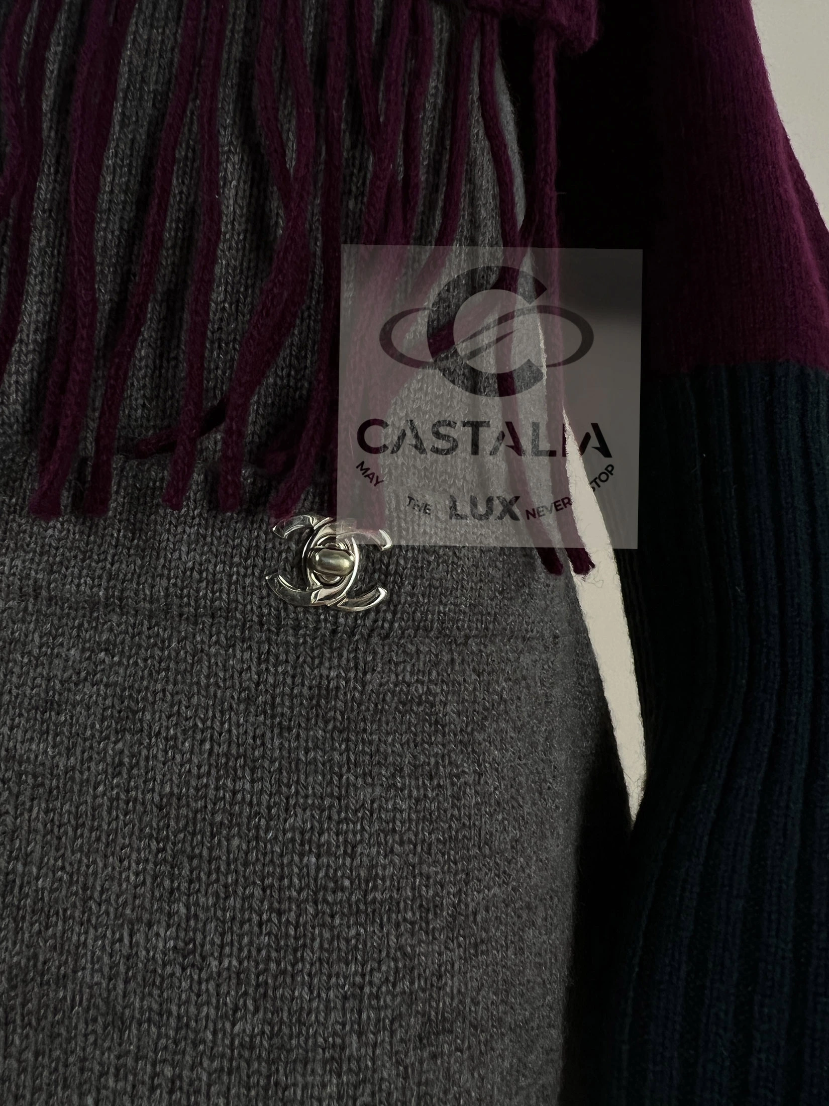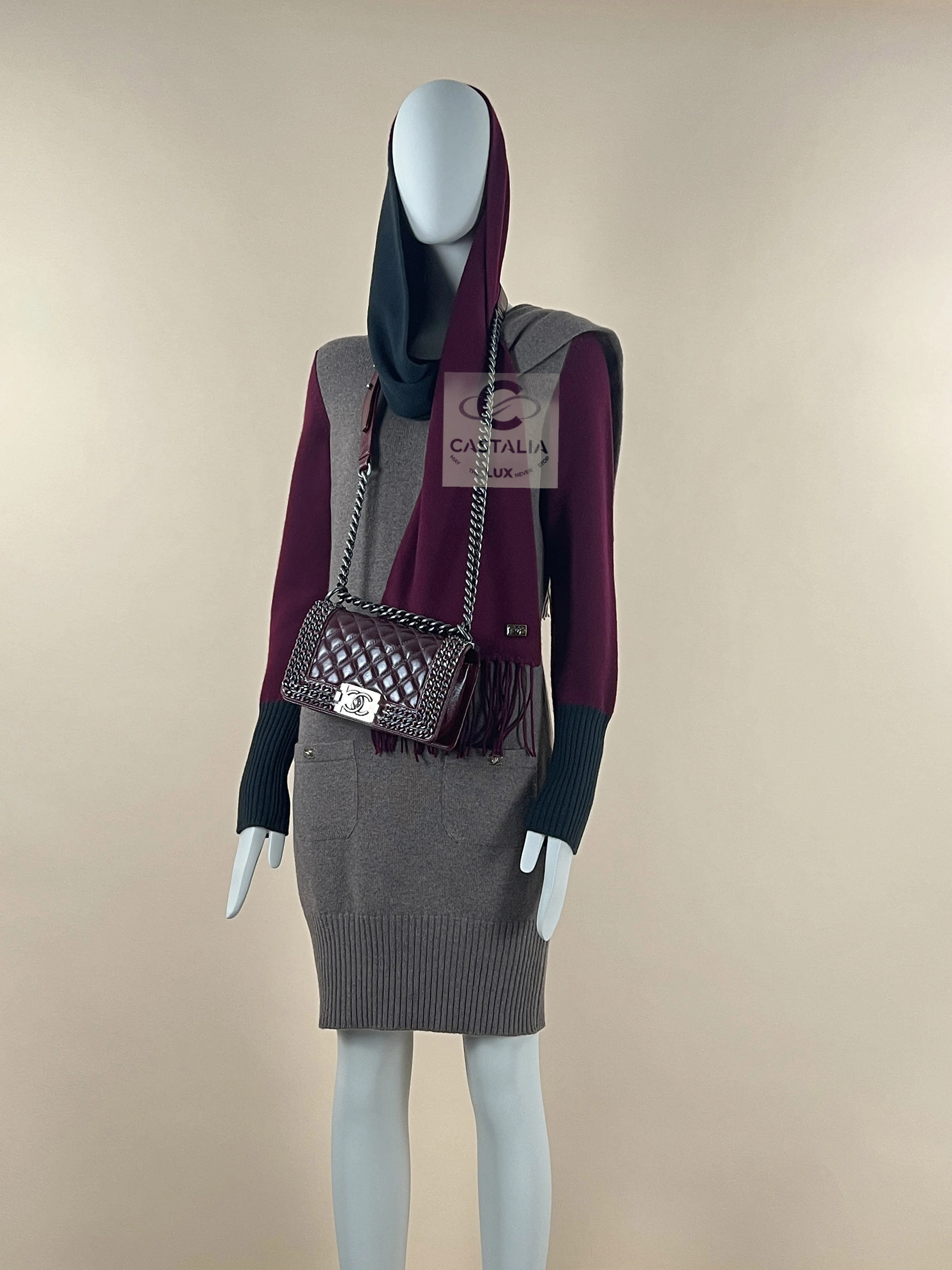 Chanel Cashmere Ensemble — The Trinitarian Harmony of Shade and Form ~ An extraordinary Chanel creation, this ensemble unites a sculpted cashmere dress with a flowing scarf, embodying Karl Lagerfeld’s gift for weaving the everyday into realms of art ~ More than a garment, it is a metaphysical composition — a dialogue of colors, textures, and symbols where fashion becomes liturgy // Size mark 36 FR / Condition: never worn // — The silhouette is enriched with iconic CC turn-lock closures at the dress’s pockets — miniature monuments of Chanel’s architectural precision — while the scarf, adorned with a CC jewel charm, descends like a banner of devotion. — chromatic triad is sublime: muted beige as grounding earth, deep burgundy as the pulse of life, and emerald accents as hidden depths of spirit — Ribbed trims contour the form, lending rhythm and structure