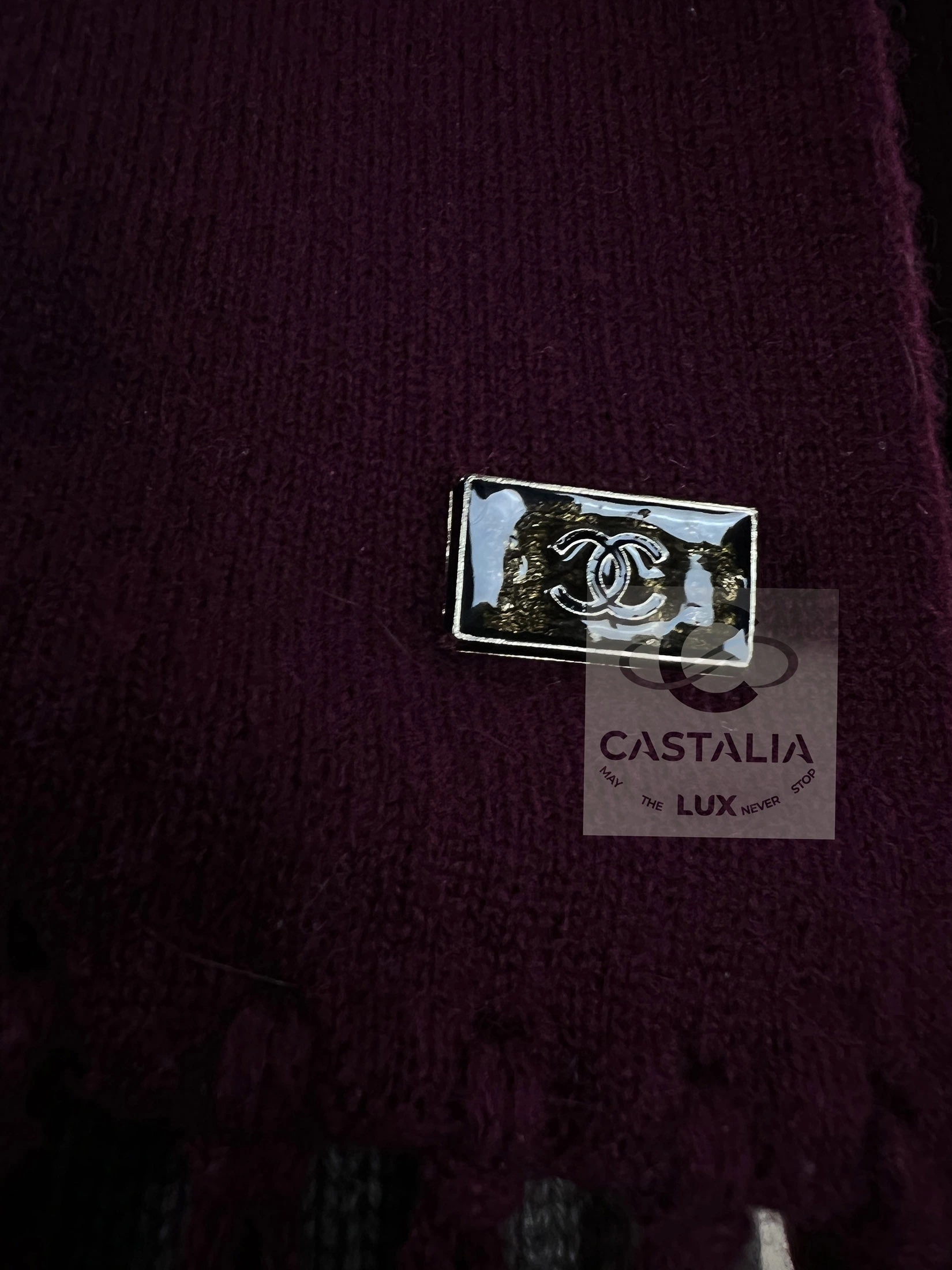 — while the scarf, adorned with a CC jewel charm, descends like a banner of devotion.