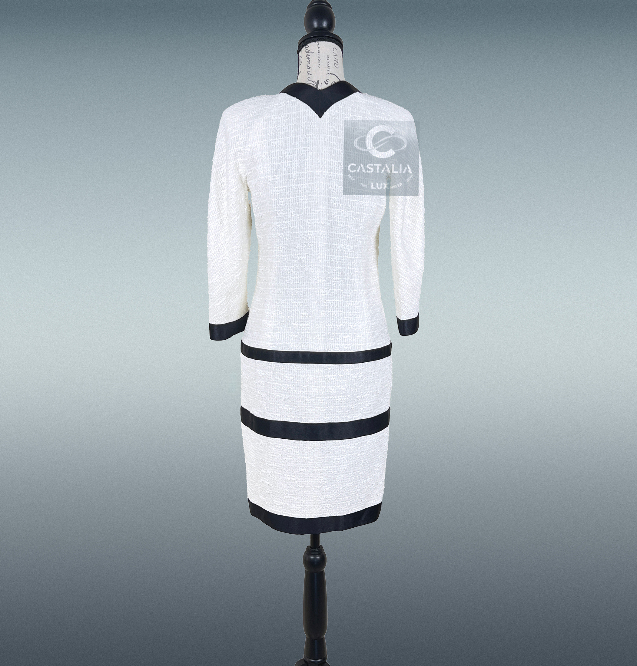 Chanel Collectible Tweed Dress with Bow As Seen on Claudia Schiffer — Paris / MIAMI Cruise Collection By Karl Lagerfeld ~ To acquire it is to claim not merely a garment, but a fragment of Chanel’s mythology ~ Worn memorably by supermodel Claudia Schiffer, this piece ascends beyond attire into living iconography // Size mark 34 FR / Condition: never worn // — Cut in refined ecru tweed and structured with bold black contrasts, it carries the sharp duality of light and shadow, simplicity and spectacle — At the chest rests the signature Bow, a sculptural flourish anchoring the silhouette with both softness and comman — Jewel Gripoix CC logo Heart shaped buttons glimmer as talismans of devotion to the House — Within, a tonal silk lining offers hidden intimacy, the unseen luxury that cocoons the body in quiet grace