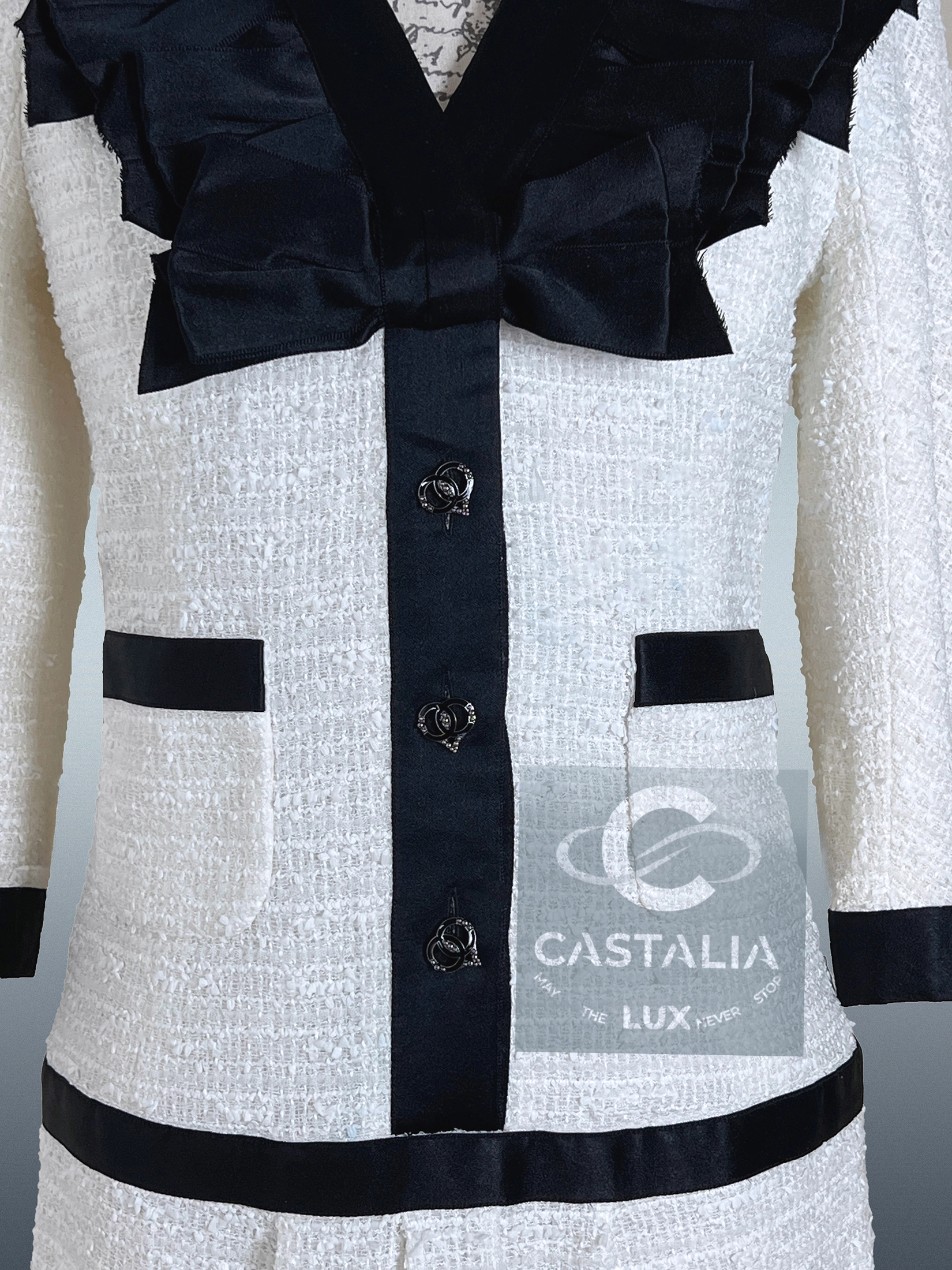 — Cut in refined ecru tweed and structured with bold black contrasts, it carries the sharp duality of light and shadow, simplicity and spectacle