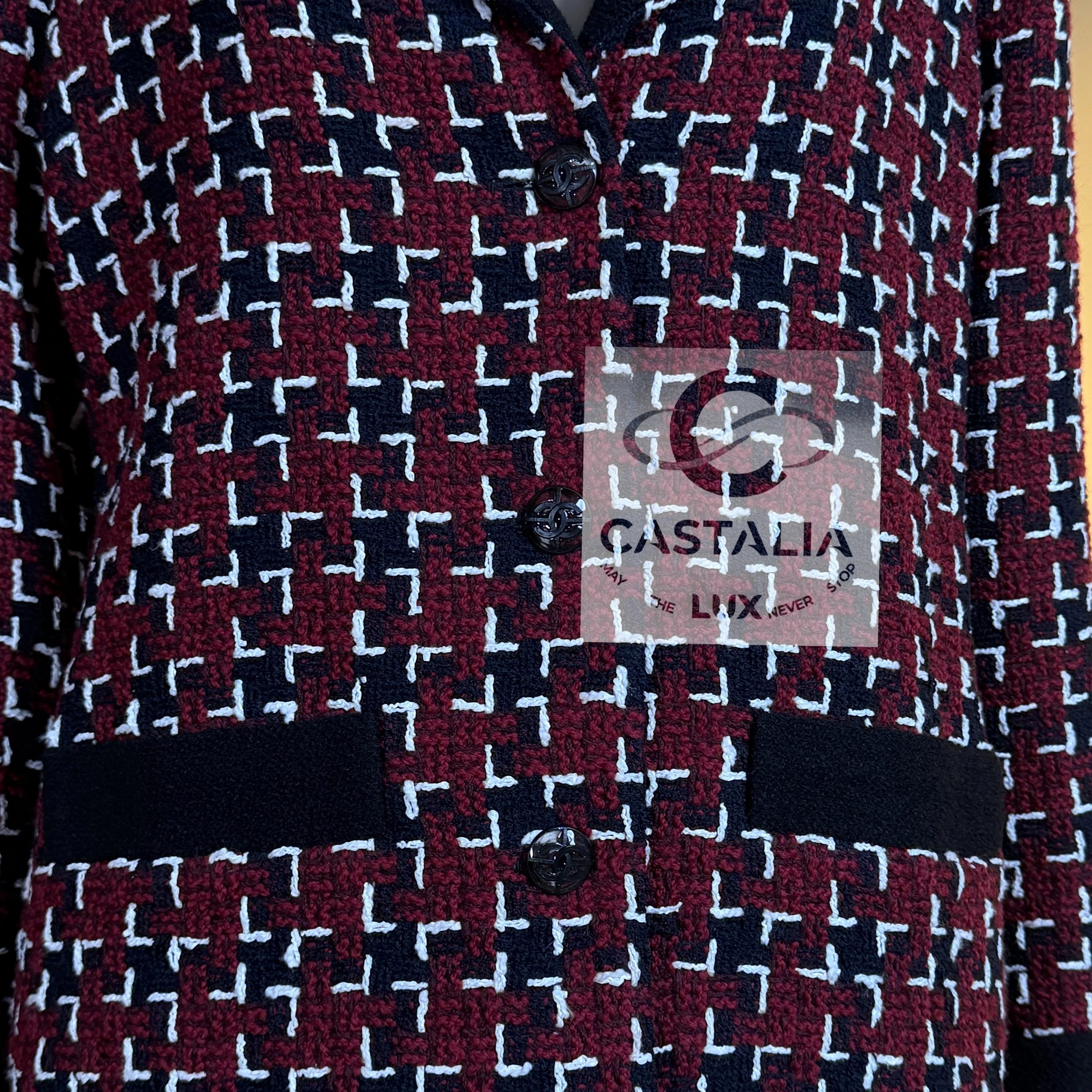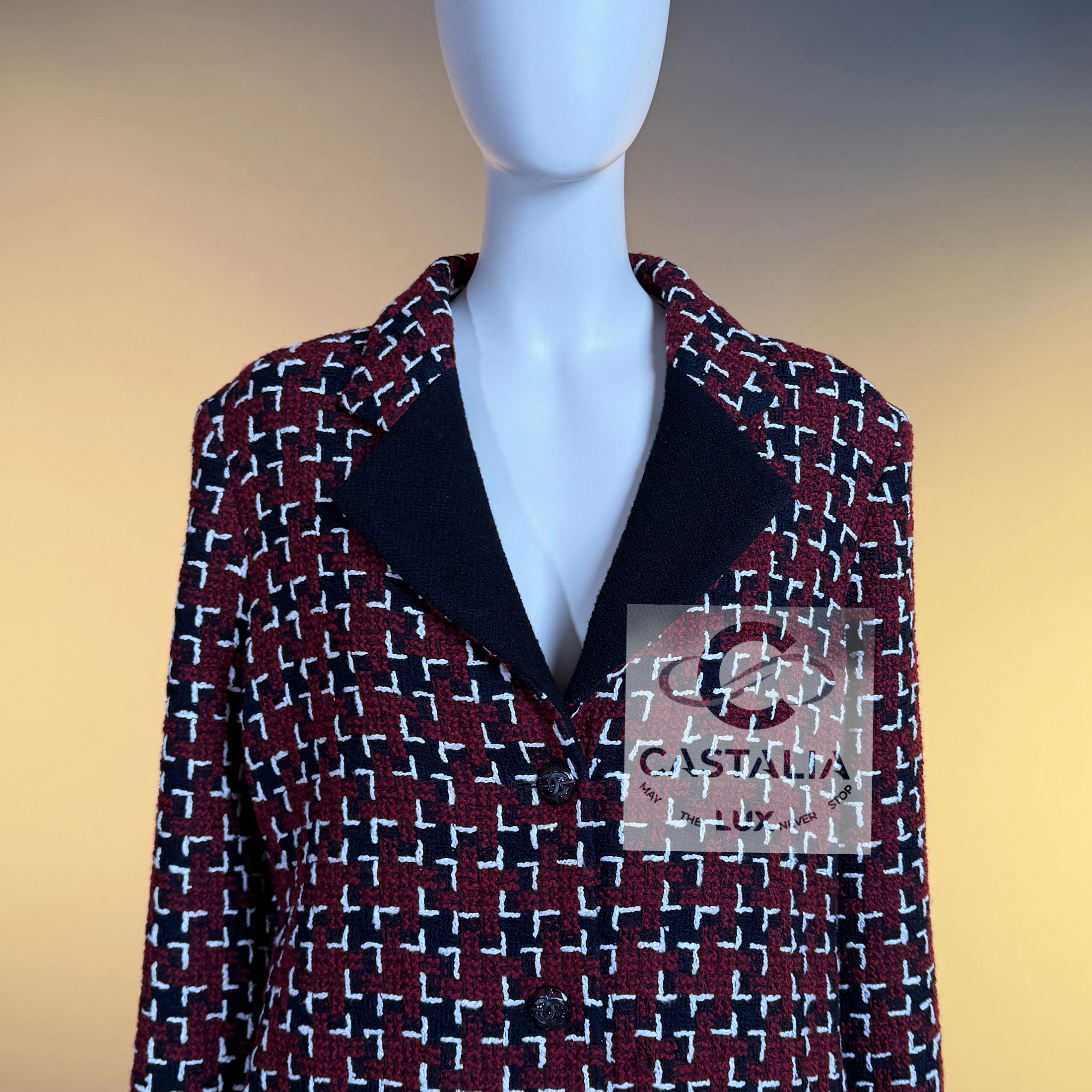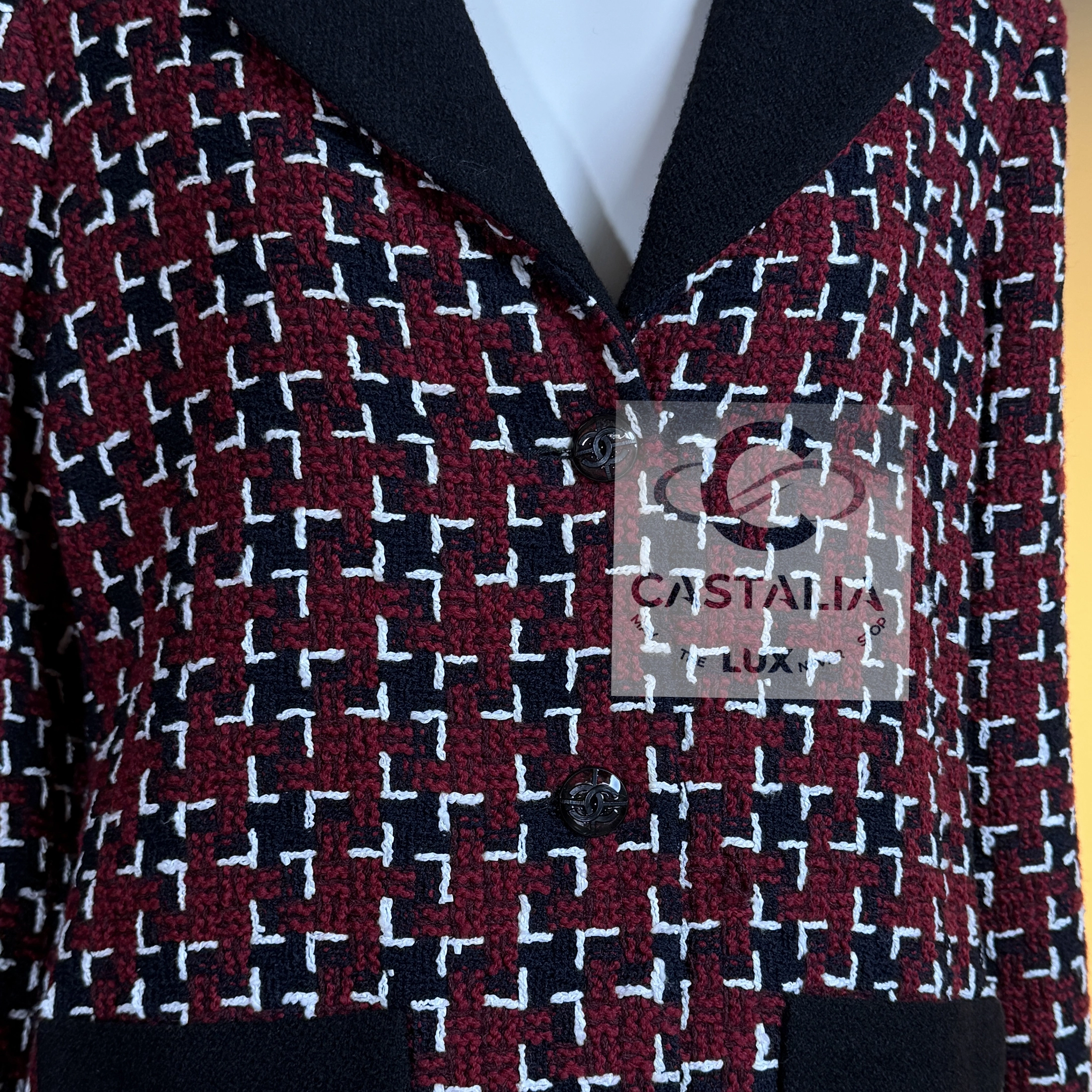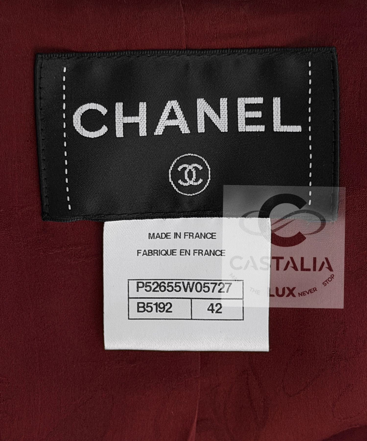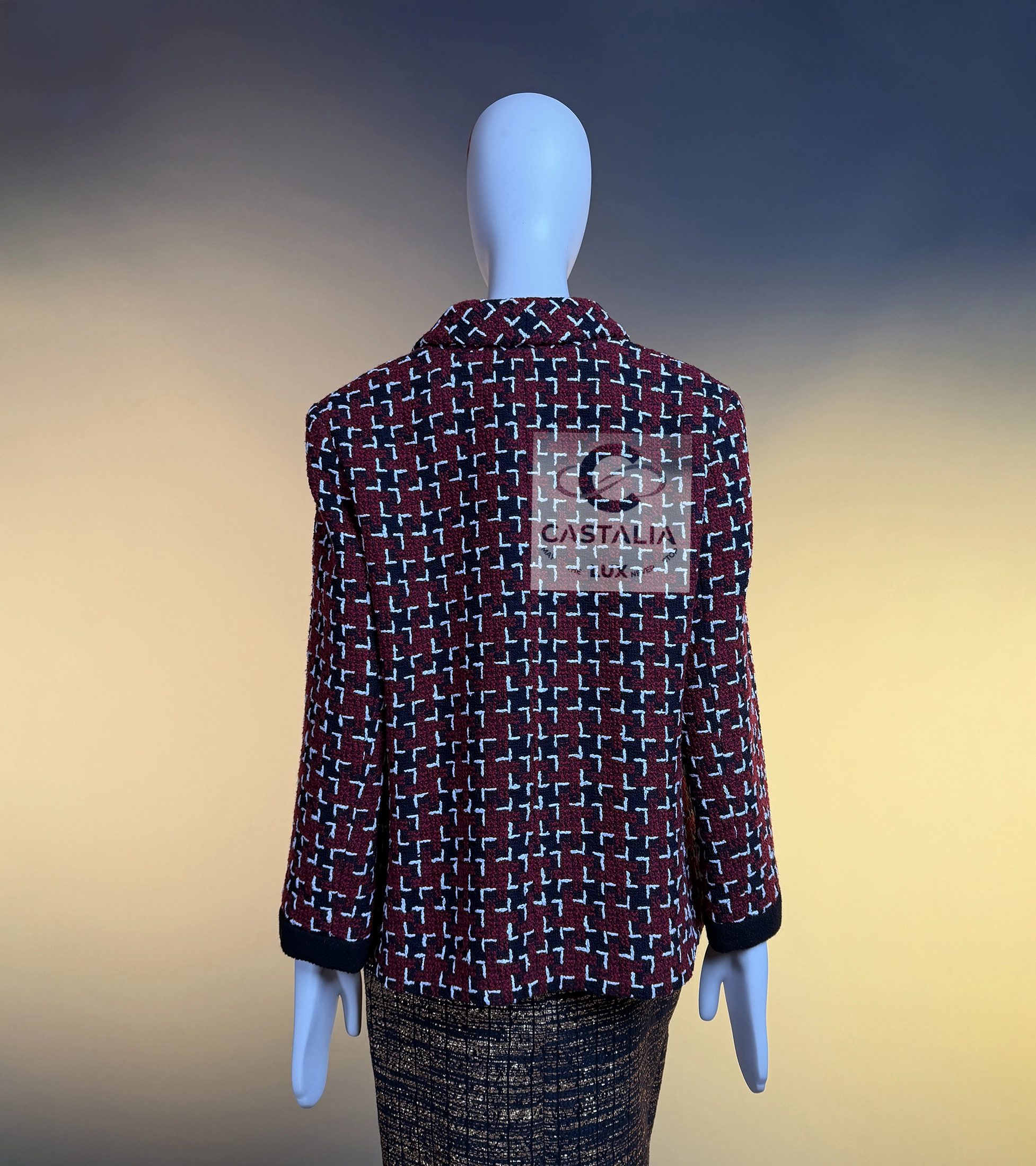 CHANEL “Coco Brasserie” Collection — The Burgundy Reverie Jacket — An Iconic Masterpiece by Karl Lagerfeld, as Seen on Kristen Stewart dorned the covers of major fashion magazines worldwide — ~ An emblem of the “Coco Brasserie” narrative, this jacket stands not only as a garment but as a metaphor of timeless Parisian spirit — tactile, intellectual, and eternal. // Size mark 42 FR / Condition: never worn // — Woven in signature Lesage tweed of deep burgundy interlaced with black and ivory threads, the texture evokes the warmth of lacquered café wood and the quiet rhythm of a Paris afternoon — The structure, framed by black trim accents, holds the perfect balance between precision and ease — a silhouette that moves like conversation, effortless yet composed — CC logo buttons anchor the front closure, glinting subtly like café lights reflected in wine glasses — symbols of continuity within Lagerfeld’s eternal dialogue between modernity and tradition — Inside, a tonal silk lining reaffirm the maison’s architectural mastery — the hidden geometry that gives Chanel its poetic gravity