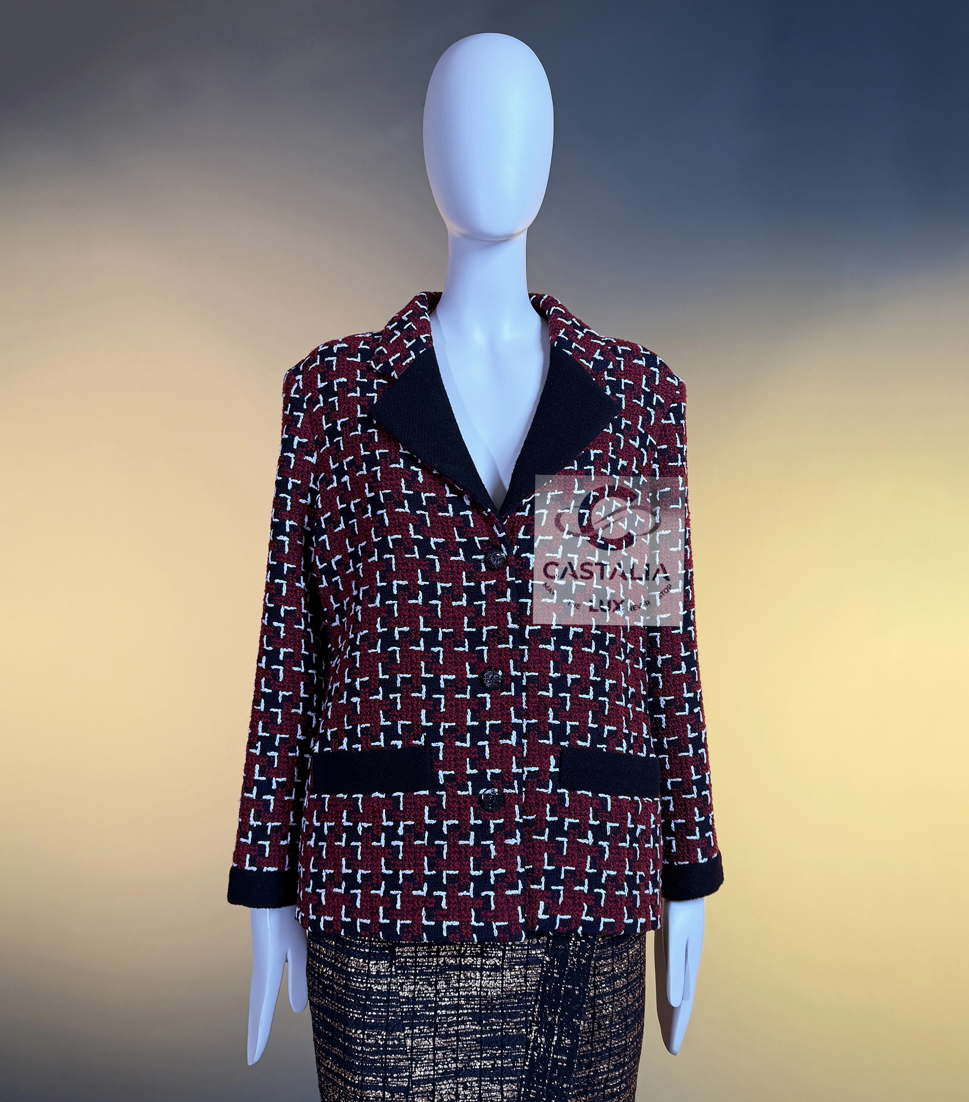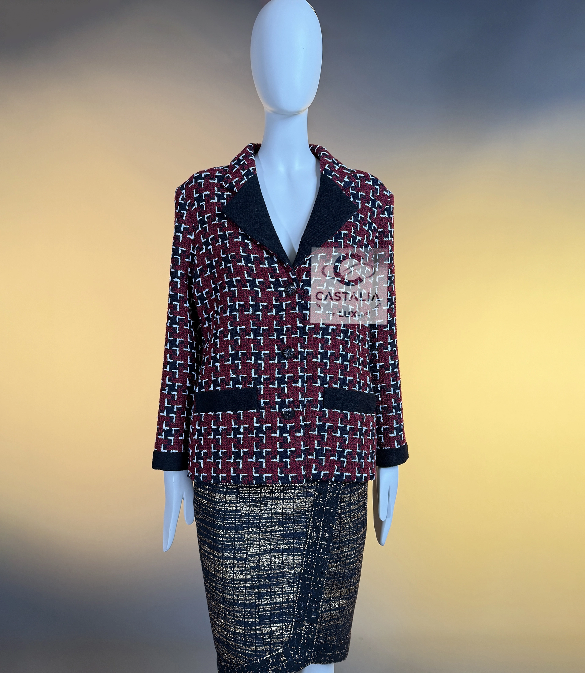 — Woven in signature Lesage tweed of deep burgundy interlaced with black and ivory threads, the texture evokes the warmth of lacquered café wood and the quiet rhythm of a Paris afternoon