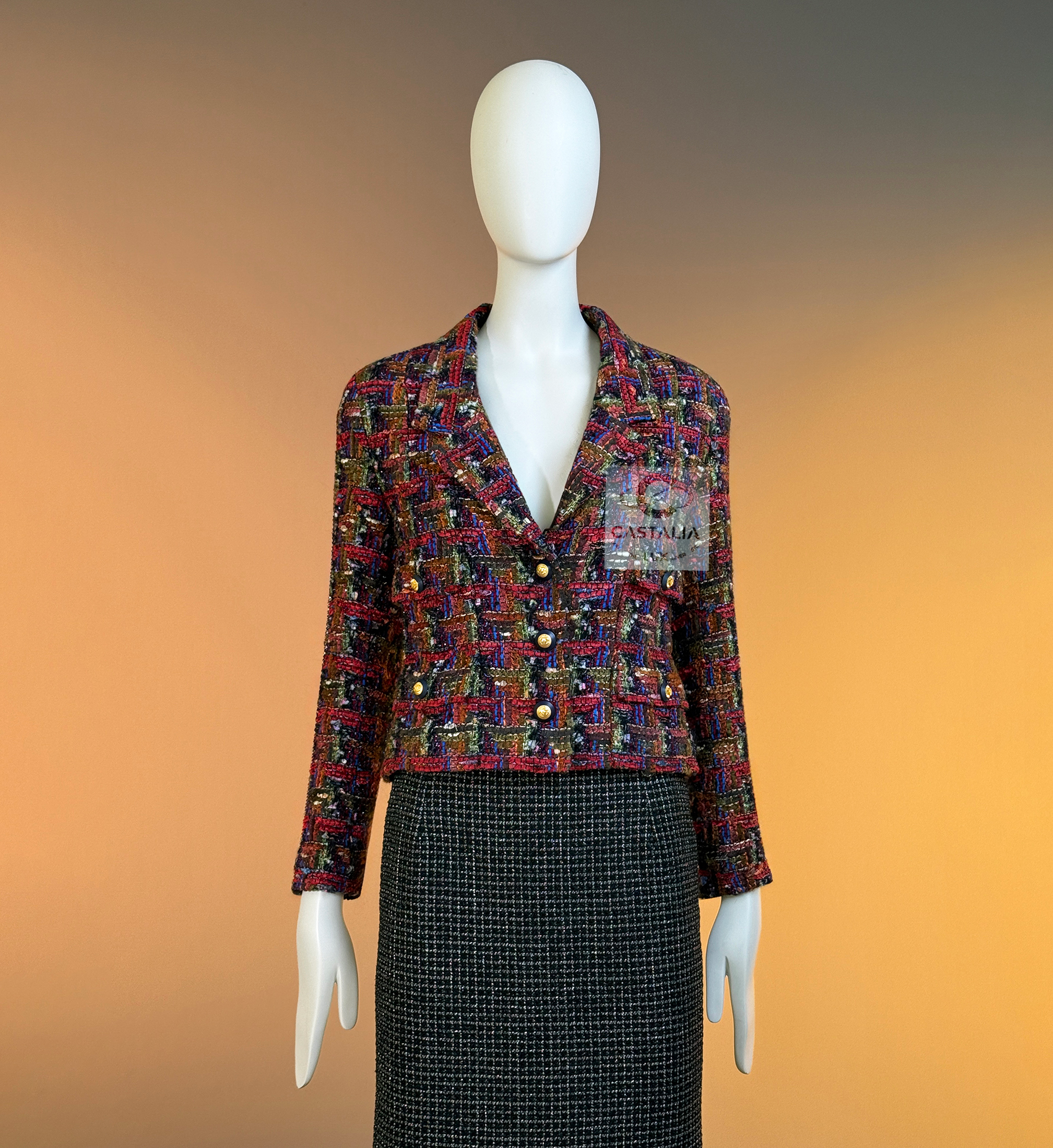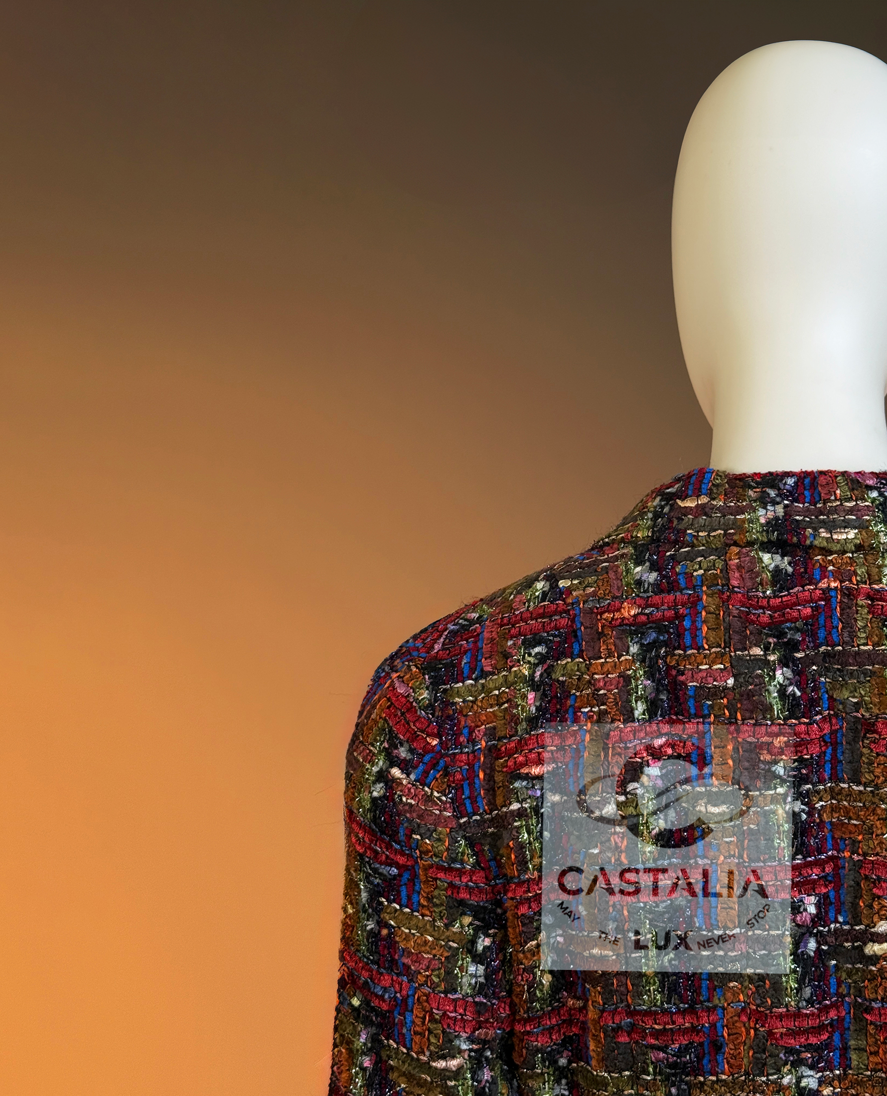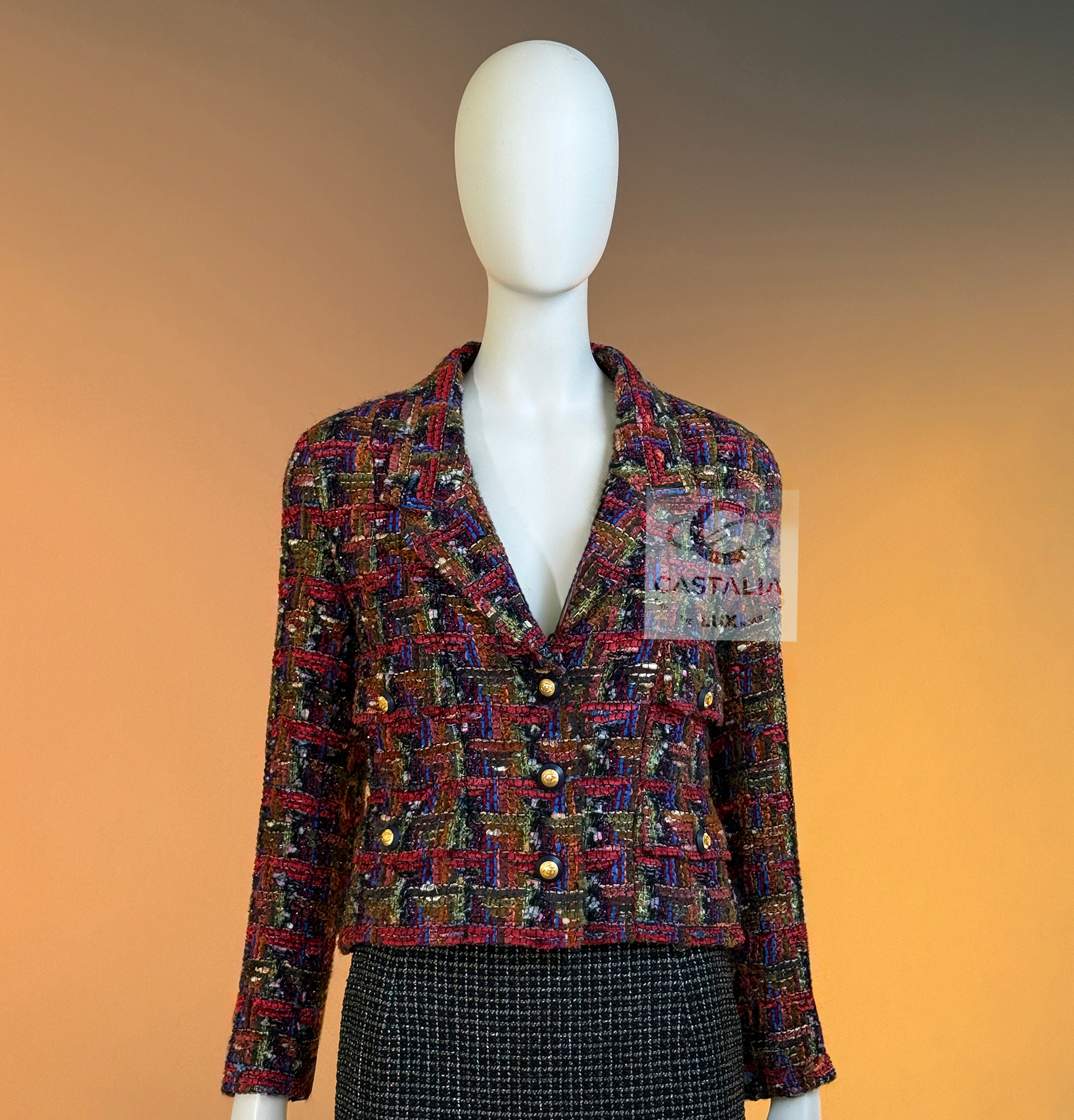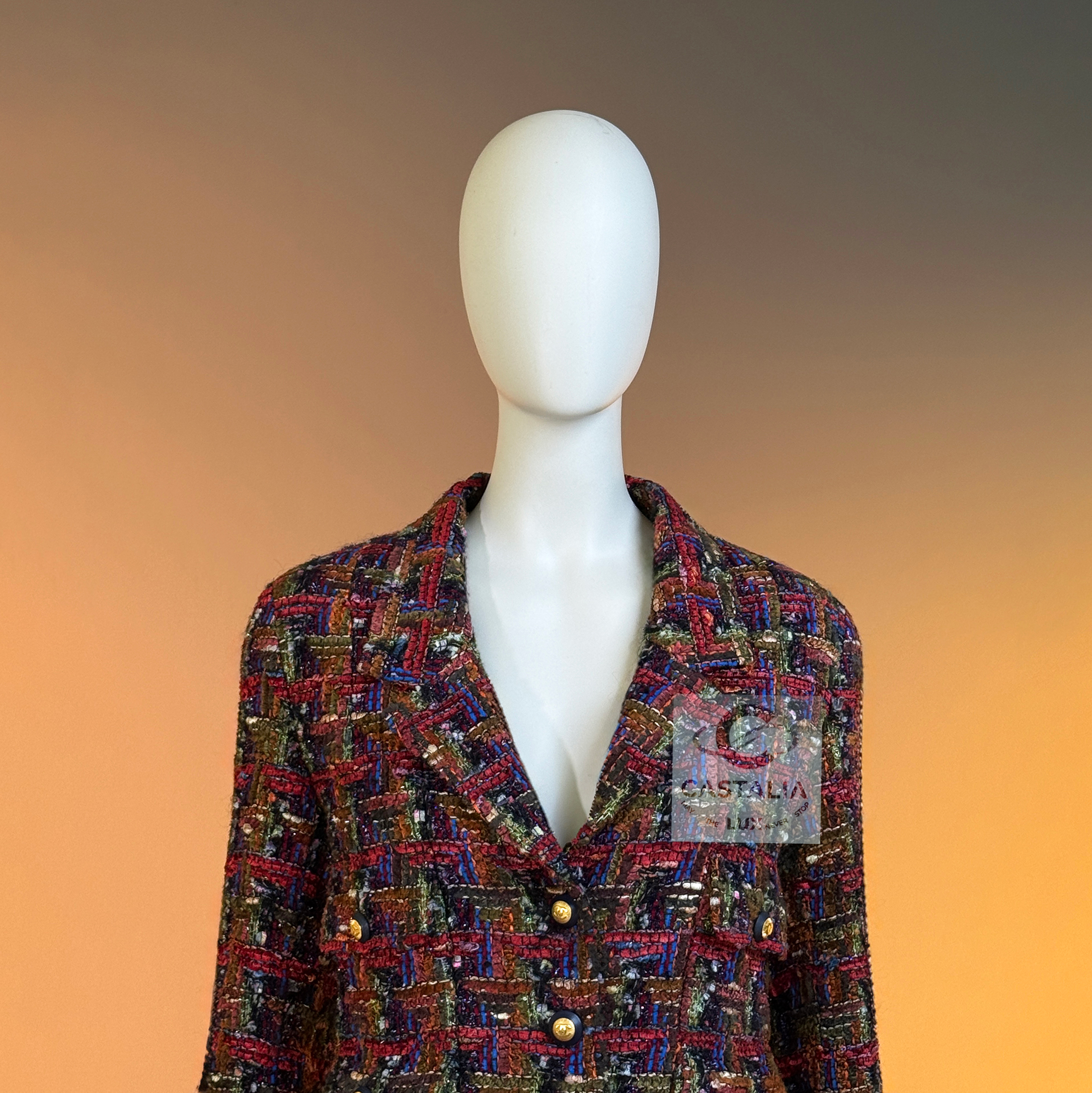 CHANEL · Lesage Ribbon Tweed Jacket — Fall 1993 Runway, Karl Lagerfeld ~ Fall 1993 is Chanel at maximal clarity — Lagerfeld as the architect of power— not simply a jacket, but a woven document from the era when Lagerfeld wrote Chanel in bold, intelligible sentences and sent it down the catwalk on supermodels like a decree — This is the House at full articulation — craft elevated into language, silhouette elevated into authority // Size mark 34 FR / Condition: never worn // • Precious Lesage ribbon tweed — structured like a miniature tapestry, with ribbon threads and tactile relief forming a rhythmic, painterly matrix • Noble earthy pastels — clay, ember, bark, muted jewel-dust tones — an aristocratic spectrum designed to age into legend rather than trend • Masterpiece CC logo jewel buttons with 64-karat gold coating — not decoration, but seals: the official punctuation of identity — Silhouette · Presence — • The iconic four-pocket architecture — two chest flaps, two hip flaps — Chanel’s most recognizable code of disciplined utility turned ceremonial • Unmistakably Chanel: the balance of strict geometry and sumptuous surface, austerity and radiance held in one object. • Tonal silk lining — the hidden completion, quiet against the skin, exact in weight and fall, chain link at the interior hem