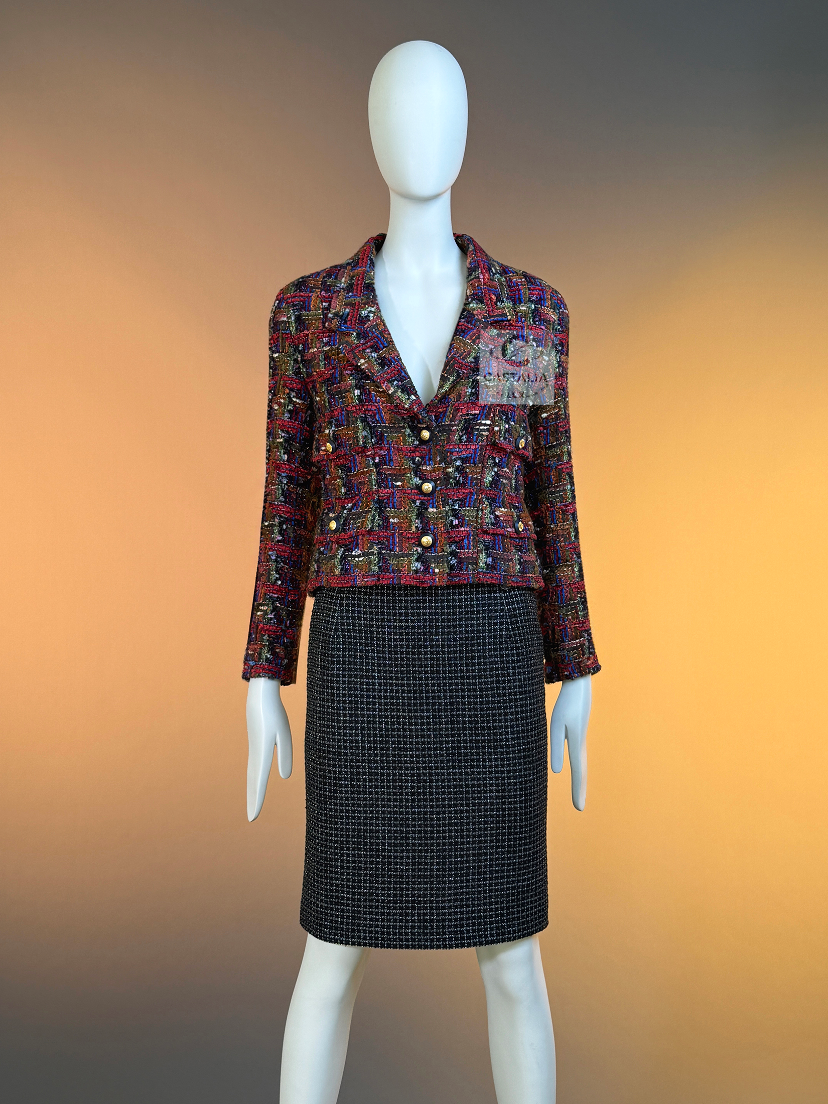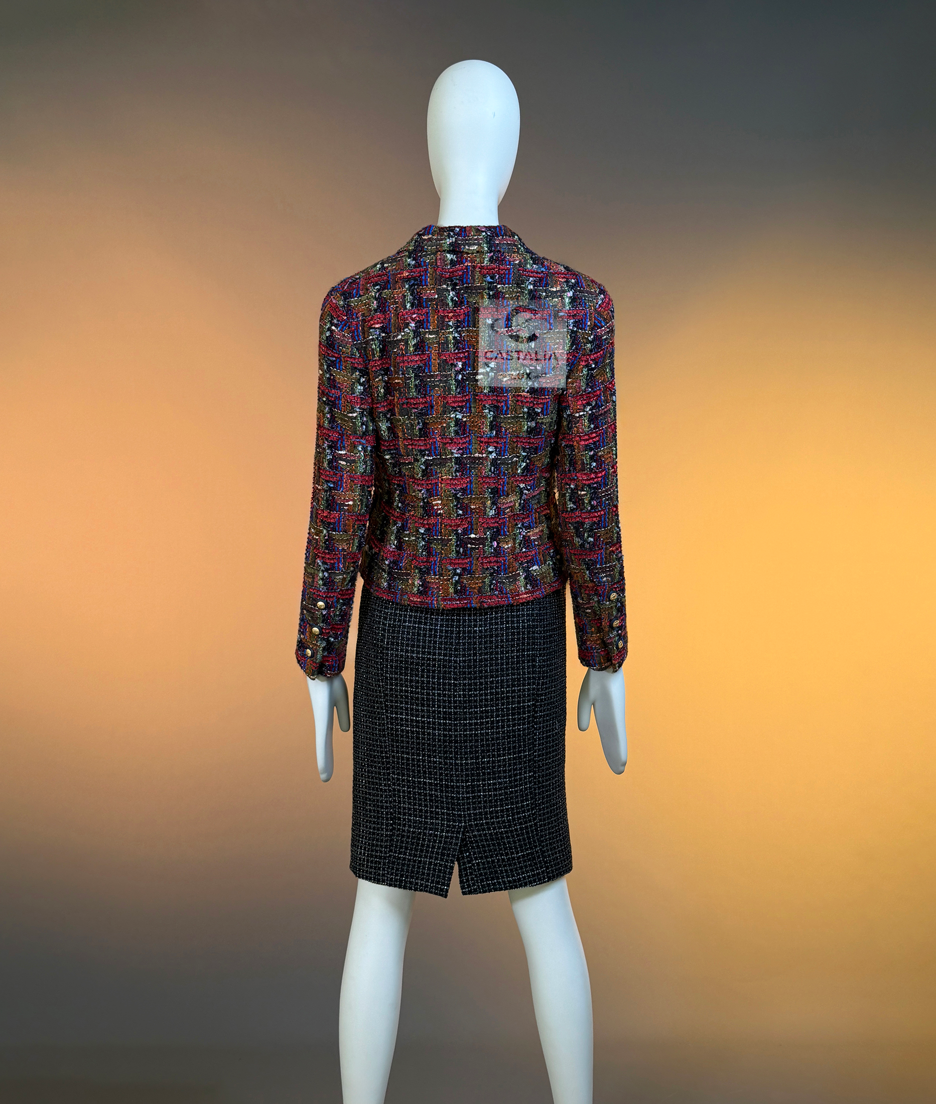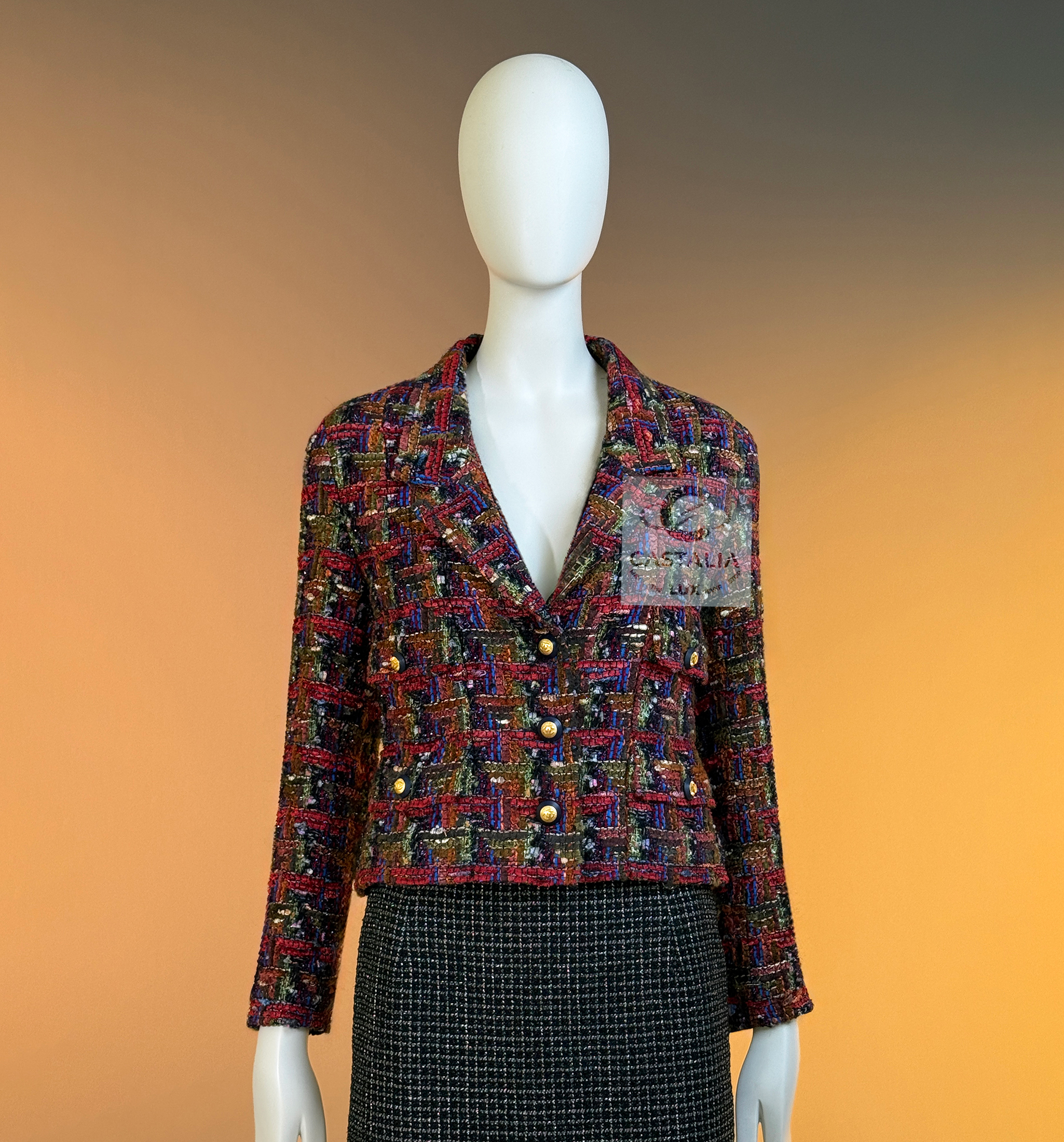 CHANEL · Lesage Ribbon Tweed Jacket — Fall 1993 Runway, Karl Lagerfeld ~ Fall 1993 is Chanel at maximal clarity — Lagerfeld as the architect of power— not simply a jacket, but a woven document from the era when Lagerfeld wrote Chanel in bold, intelligible sentences and sent it down the catwalk on supermodels like a decree — This is the House at full articulation — craft elevated into language, silhouette elevated into authority // Size mark 34 FR / Condition: never worn // • Precious Lesage ribbon tweed — structured like a miniature tapestry, with ribbon threads and tactile relief forming a rhythmic, painterly matrix • Noble earthy pastels — clay, ember, bark, muted jewel-dust tones — an aristocratic spectrum designed to age into legend rather than trend • Masterpiece CC logo jewel buttons with 64-karat gold coating — not decoration, but seals: the official punctuation of identity — Silhouette · Presence — • The iconic four-pocket architecture — two chest flaps, two hip flaps — Chanel’s most recognizable code of disciplined utility turned ceremonial • Unmistakably Chanel: the balance of strict geometry and sumptuous surface, austerity and radiance held in one object. • Tonal silk lining — the hidden completion, quiet against the skin, exact in weight and fall, chain link at the interior hem