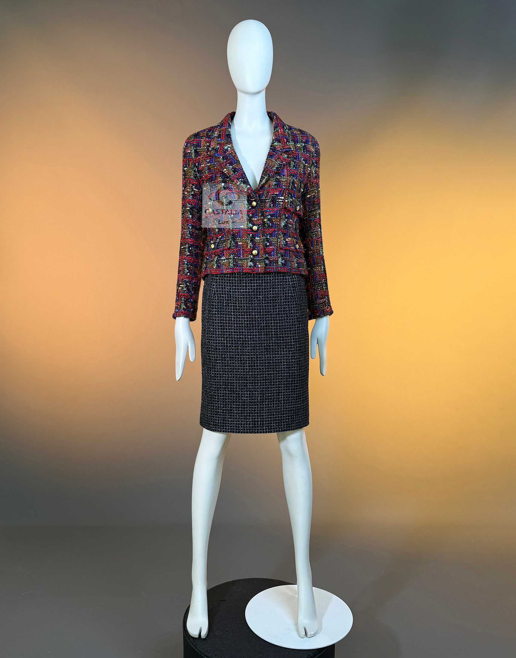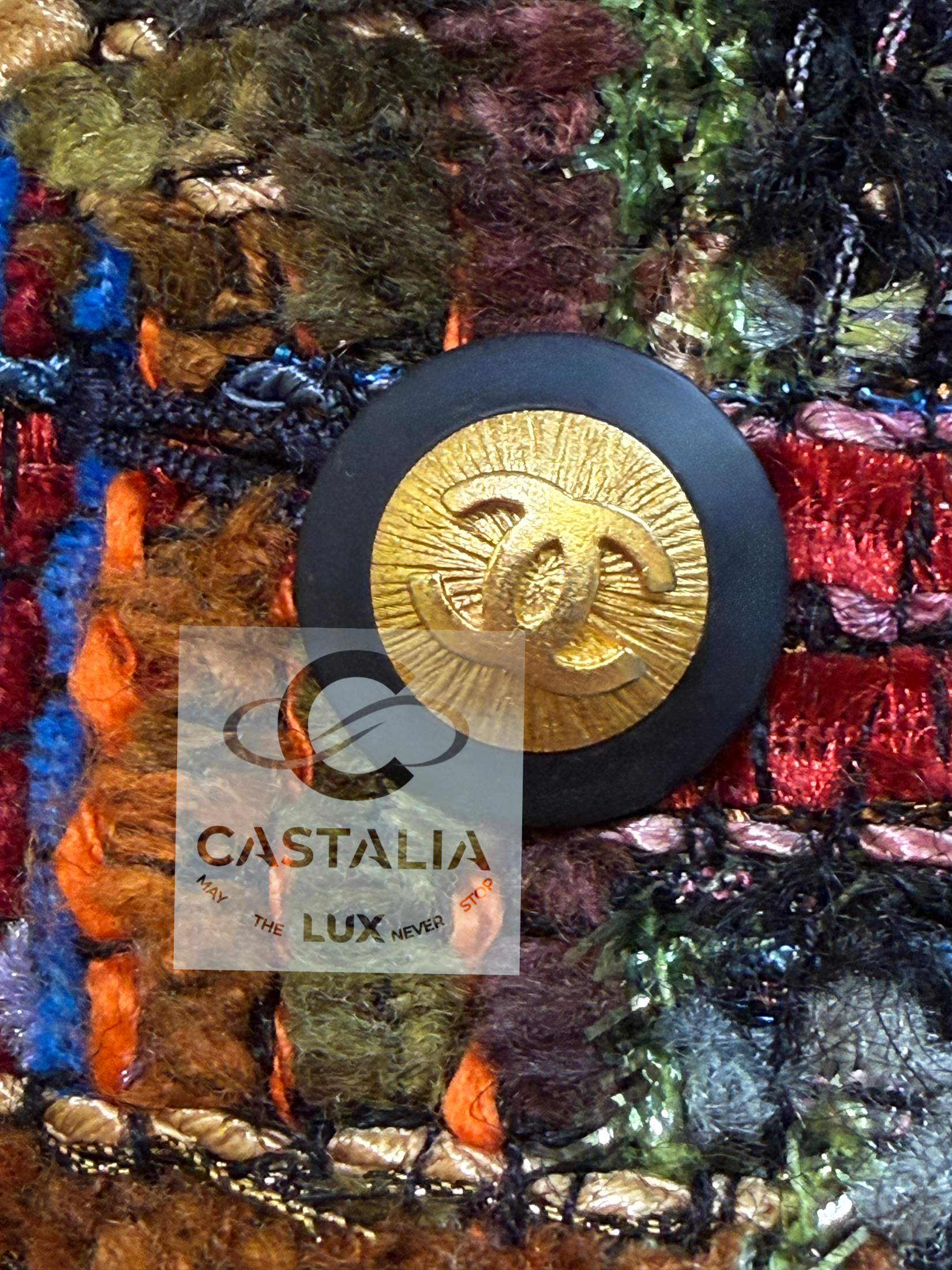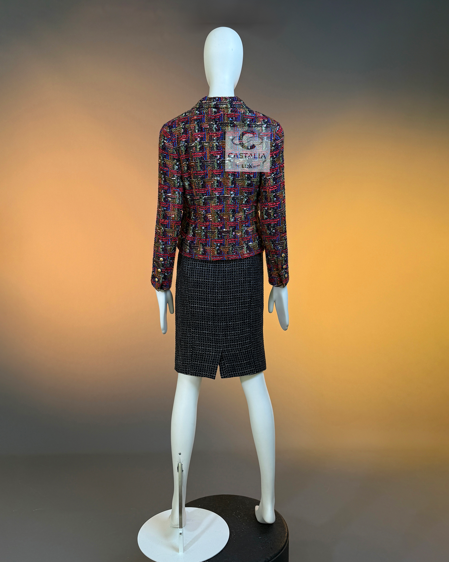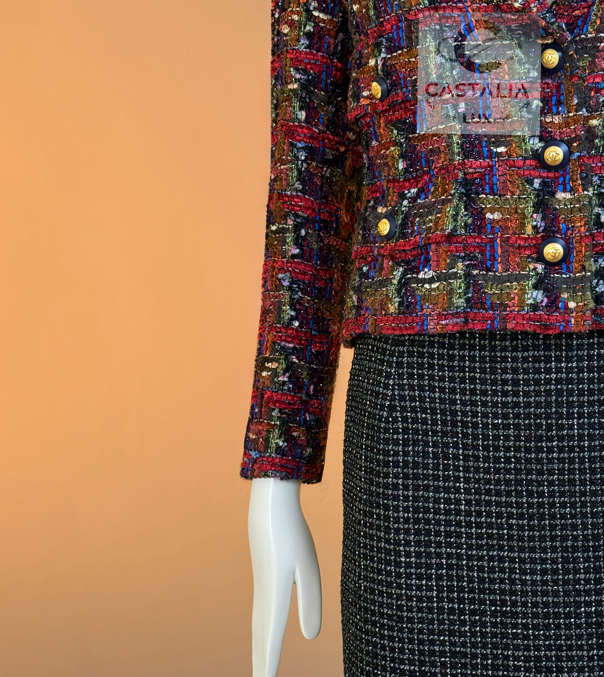 CHANEL · Lesage Ribbon Tweed Jacket — Fall 1993 Runway, Karl Lagerfeld ~ Fall 1993 is Chanel at maximal clarity — Lagerfeld as the architect of power— not simply a jacket, but a woven document from the era when Lagerfeld wrote Chanel in bold, intelligible sentences and sent it down the catwalk on supermodels like a decree — This is the House at full articulation — craft elevated into language, silhouette elevated into authority // Size mark 34 FR / Condition: never worn // • Precious Lesage ribbon tweed — structured like a miniature tapestry, with ribbon threads and tactile relief forming a rhythmic, painterly matrix • Noble earthy pastels — clay, ember, bark, muted jewel-dust tones — an aristocratic spectrum designed to age into legend rather than trend • Masterpiece CC logo jewel buttons with 64-karat gold coating — not decoration, but seals: the official punctuation of identity — Silhouette · Presence — • The iconic four-pocket architecture — two chest flaps, two hip flaps — Chanel’s most recognizable code of disciplined utility turned ceremonial • Unmistakably Chanel: the balance of strict geometry and sumptuous surface, austerity and radiance held in one object. • Tonal silk lining — the hidden completion, quiet against the skin, exact in weight and fall, chain link at the interior hem