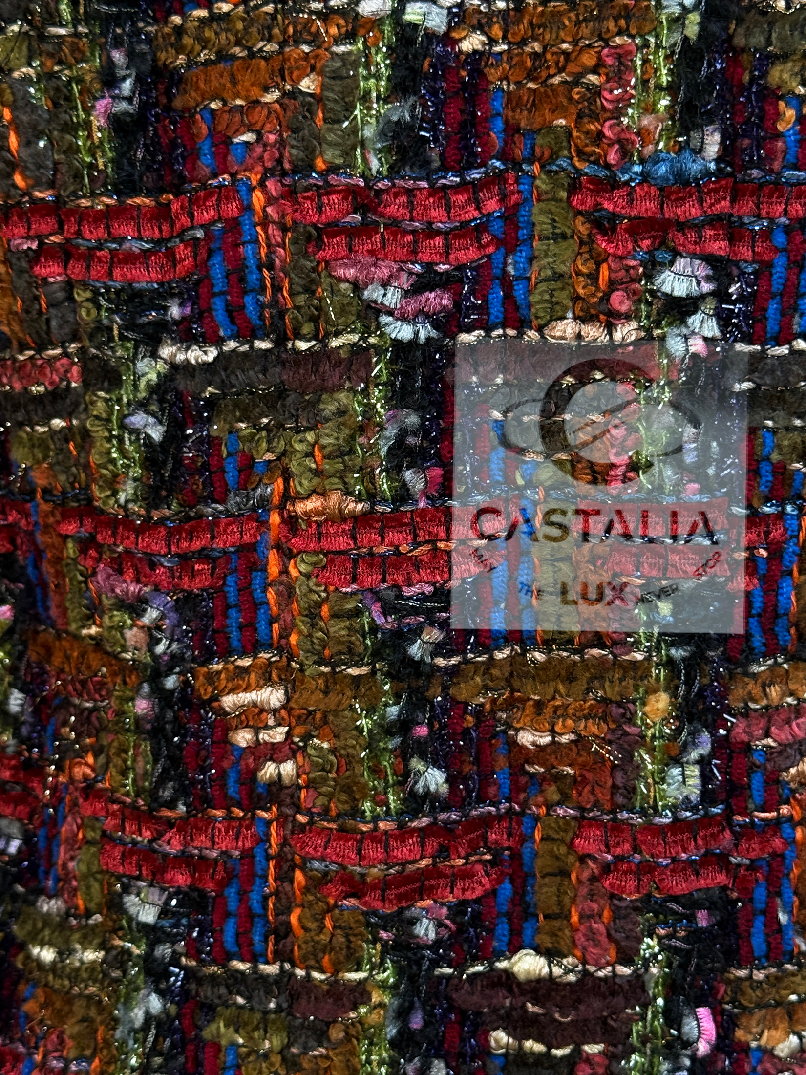 • Precious Lesage ribbon tweed — structured like a miniature tapestry, with ribbon threads and tactile relief forming a rhythmic, painterly matrix