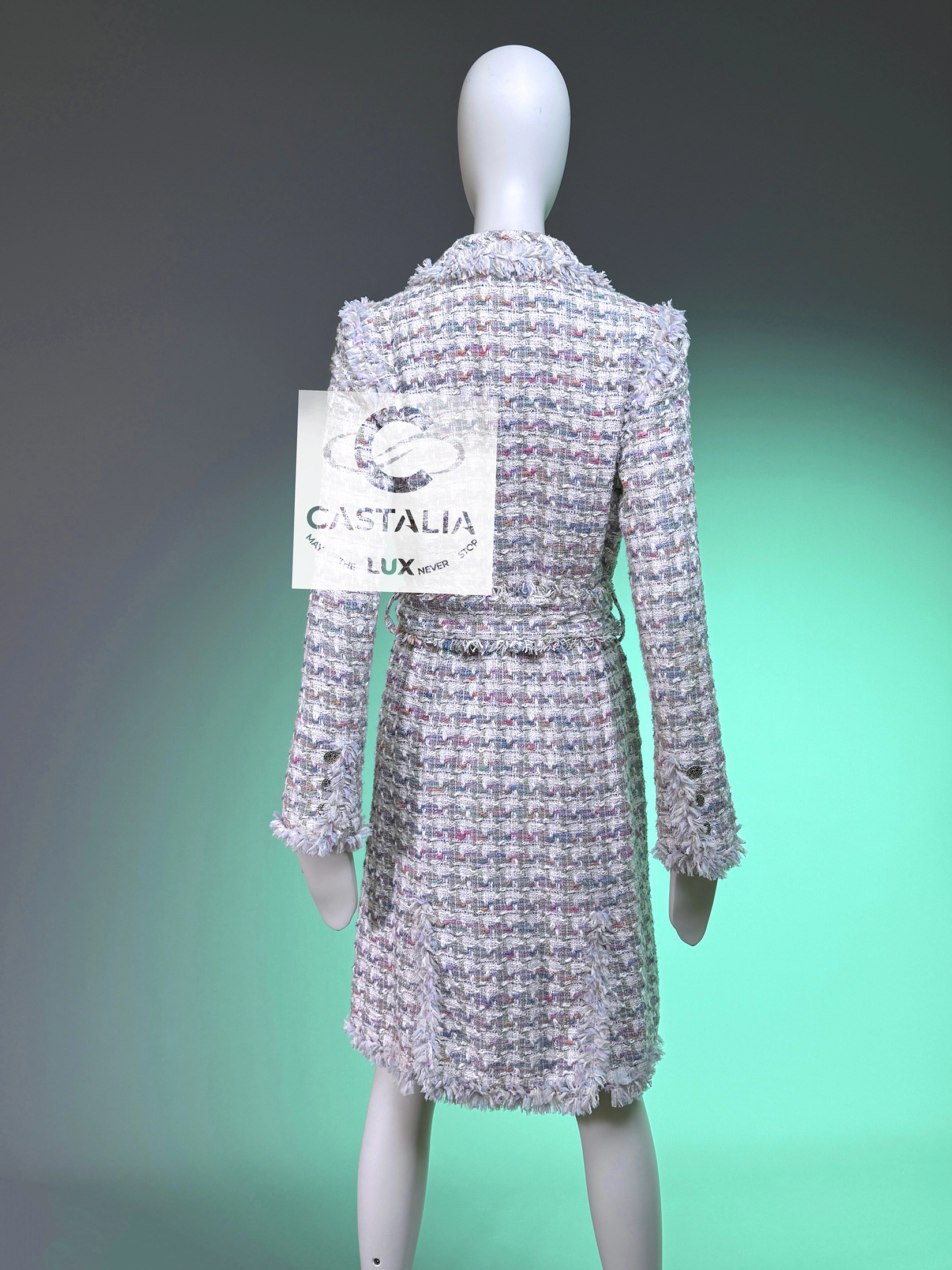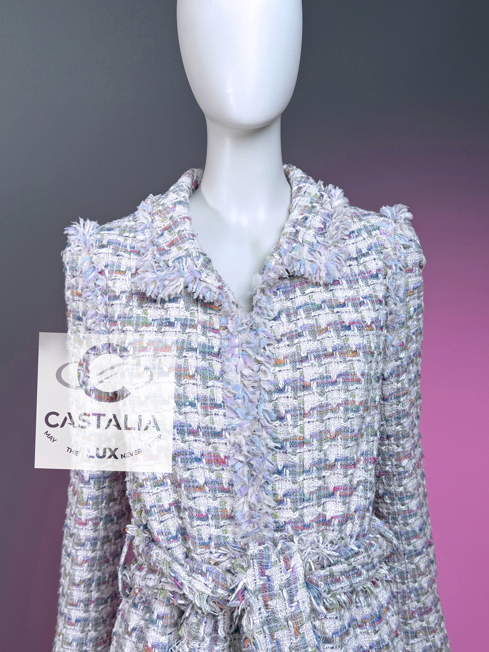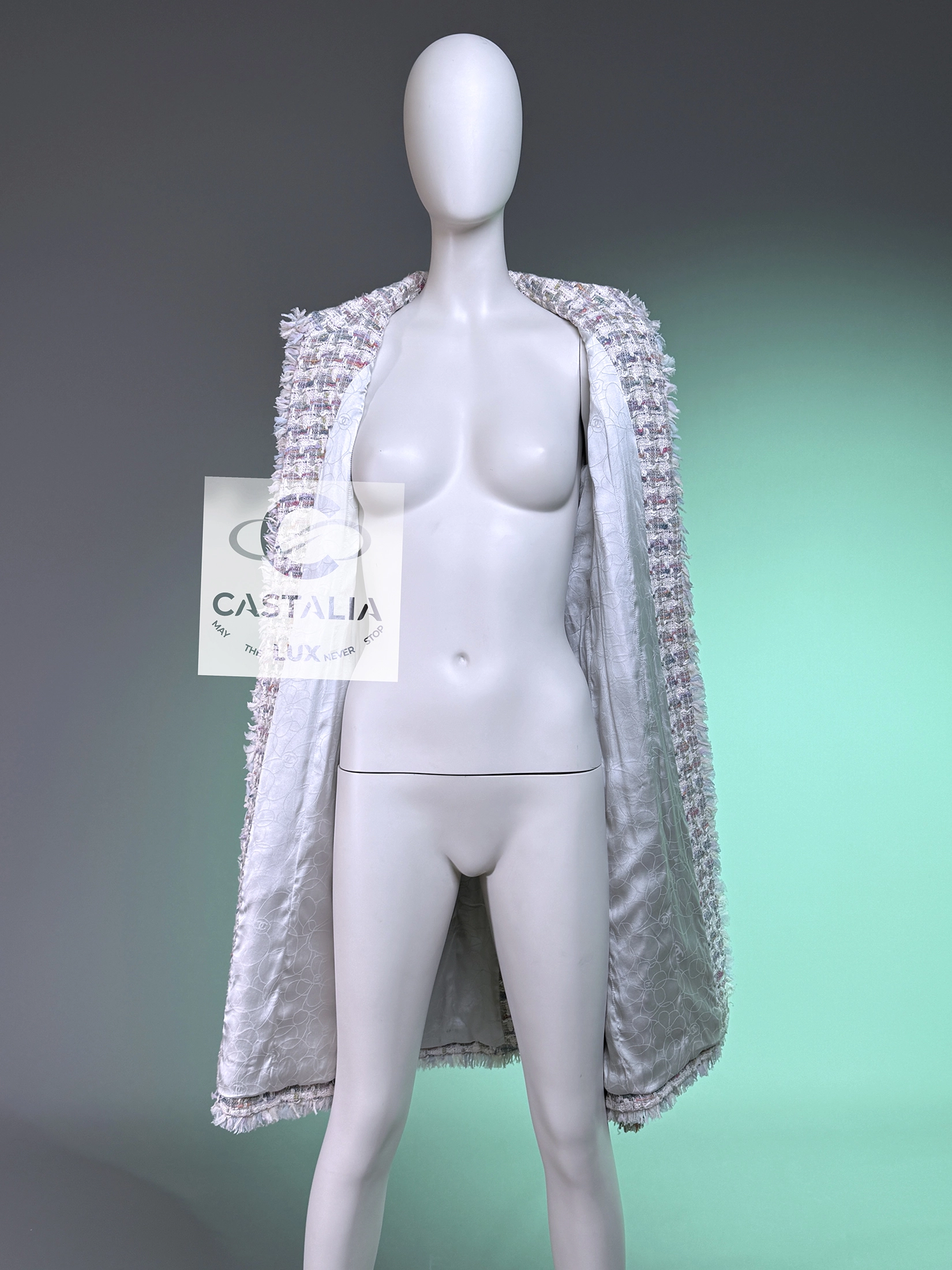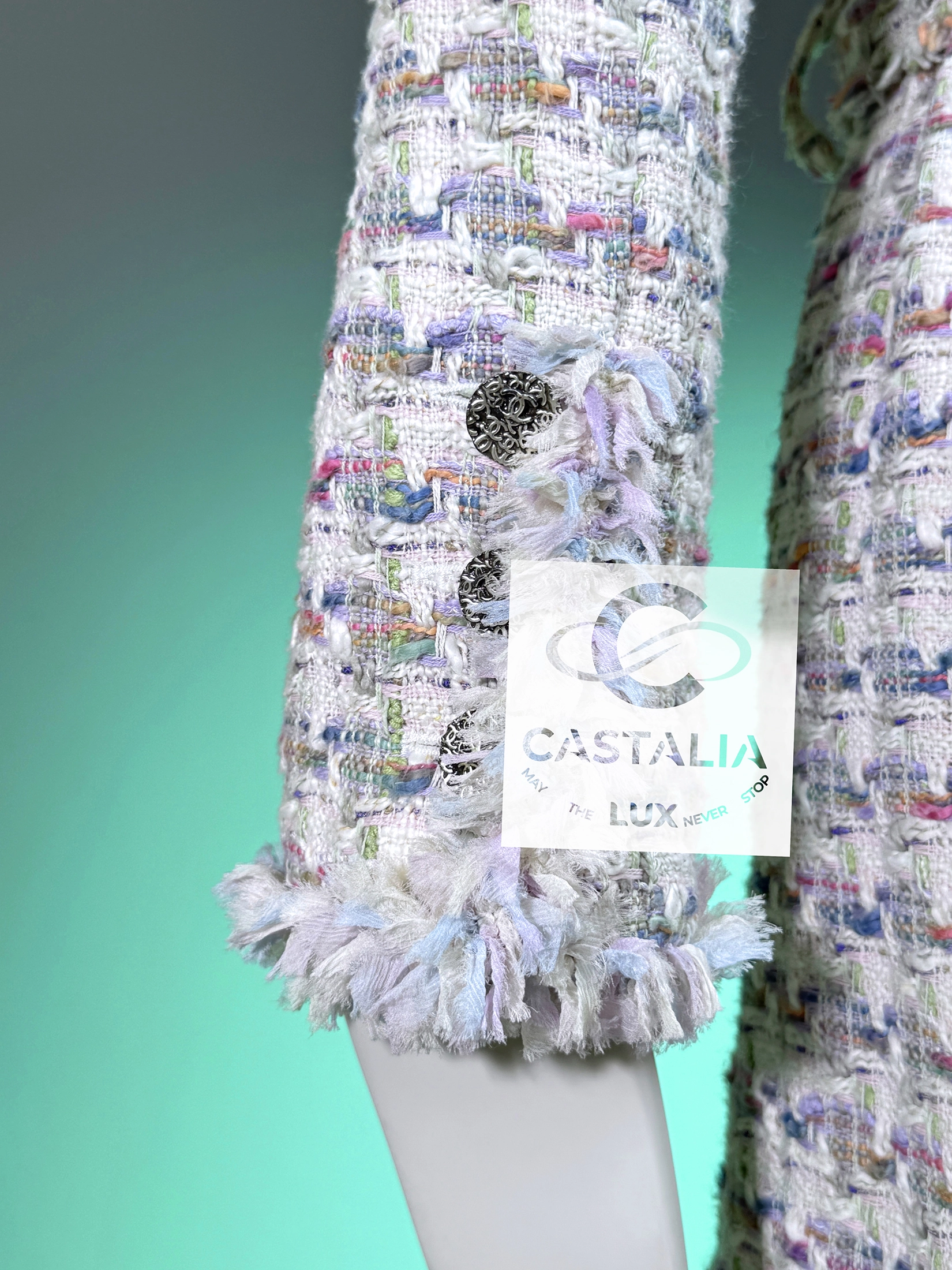 — Woven in soft pastel threads that echo the first bloom of Parisian spring, the coat features Chanel’s signature Lesage tweed—textured, nuanced, and intricately alive