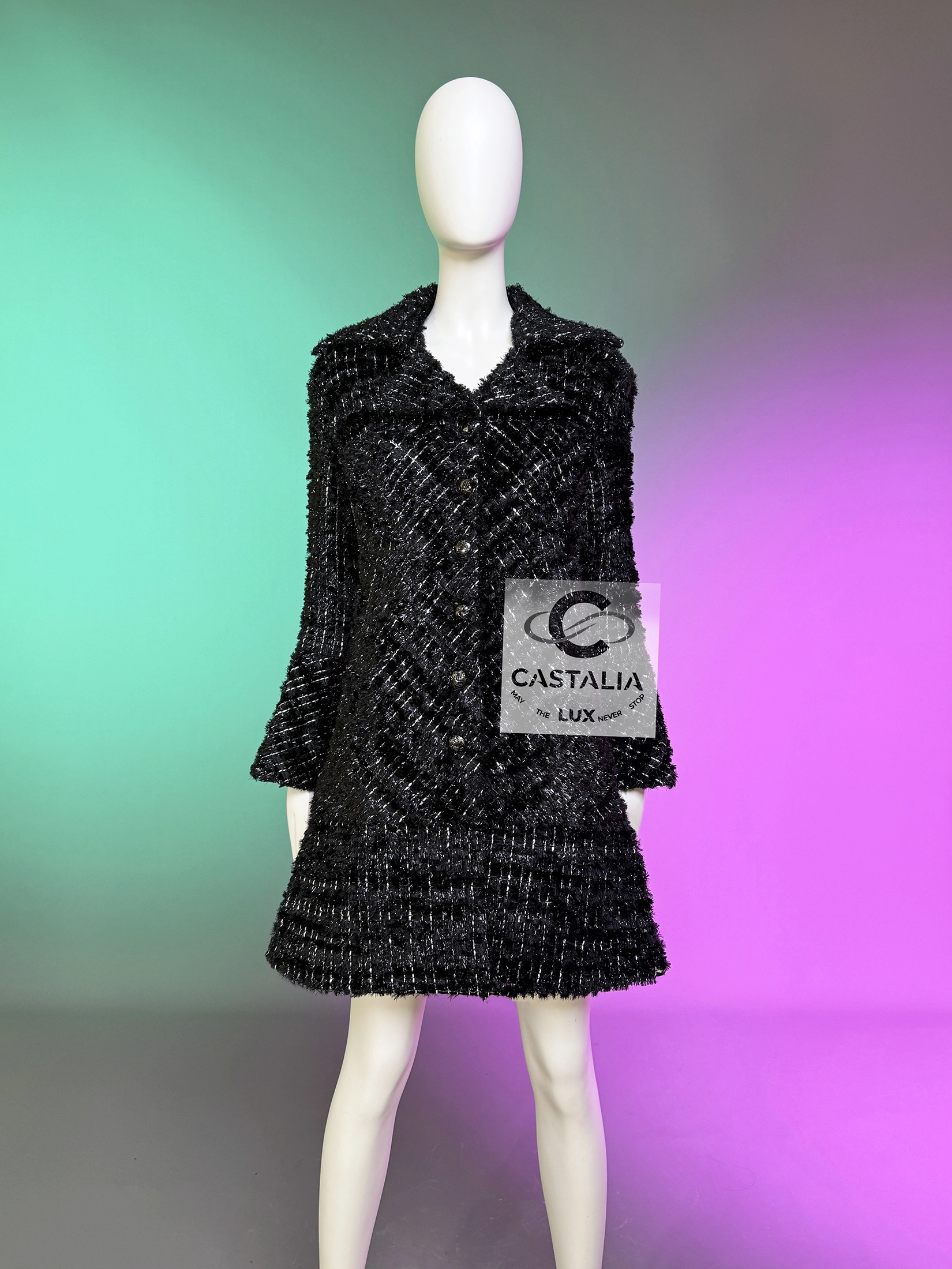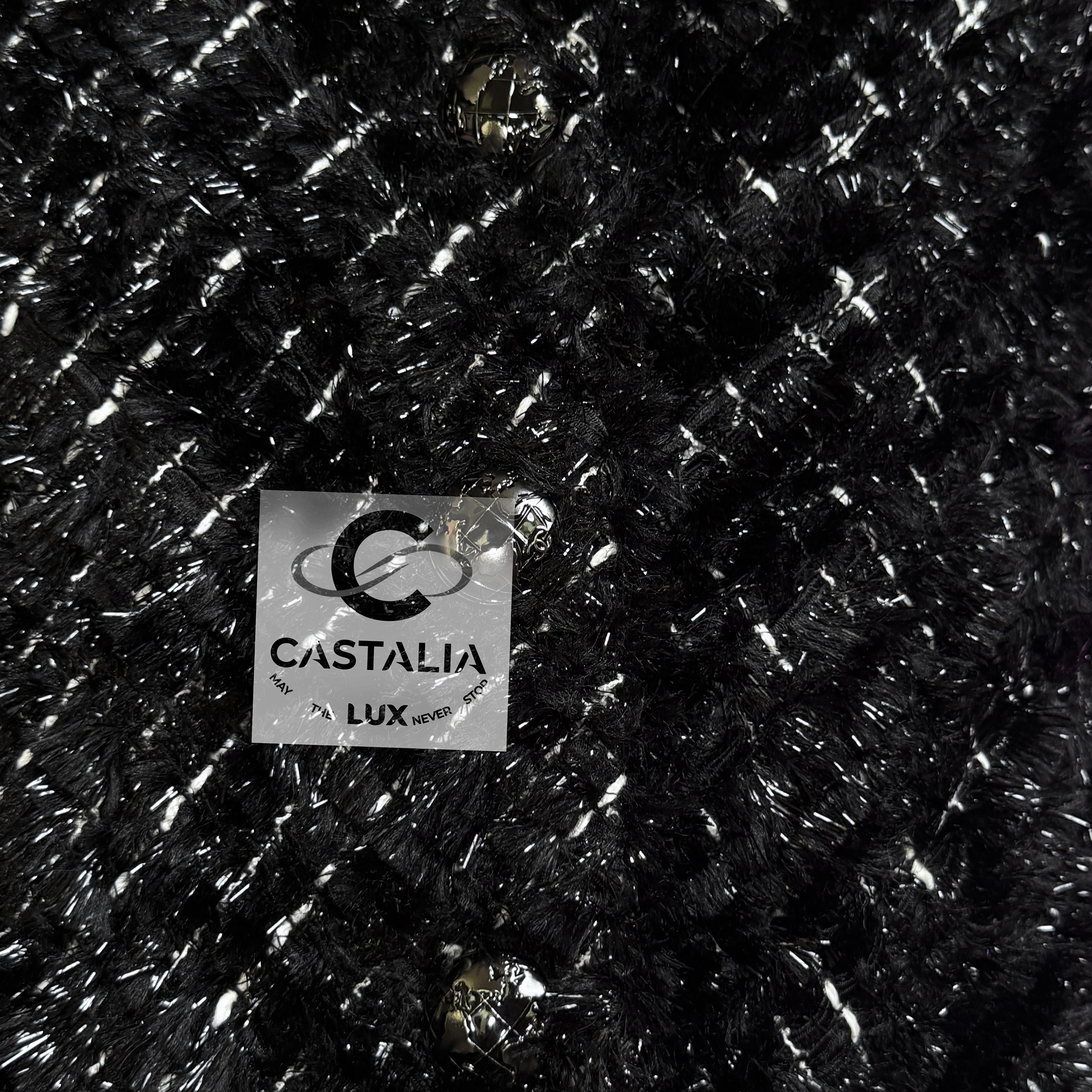 Its black fluffy tweed glimmers with shimmer threads, capturing the silent dance of stardust across velvet skies