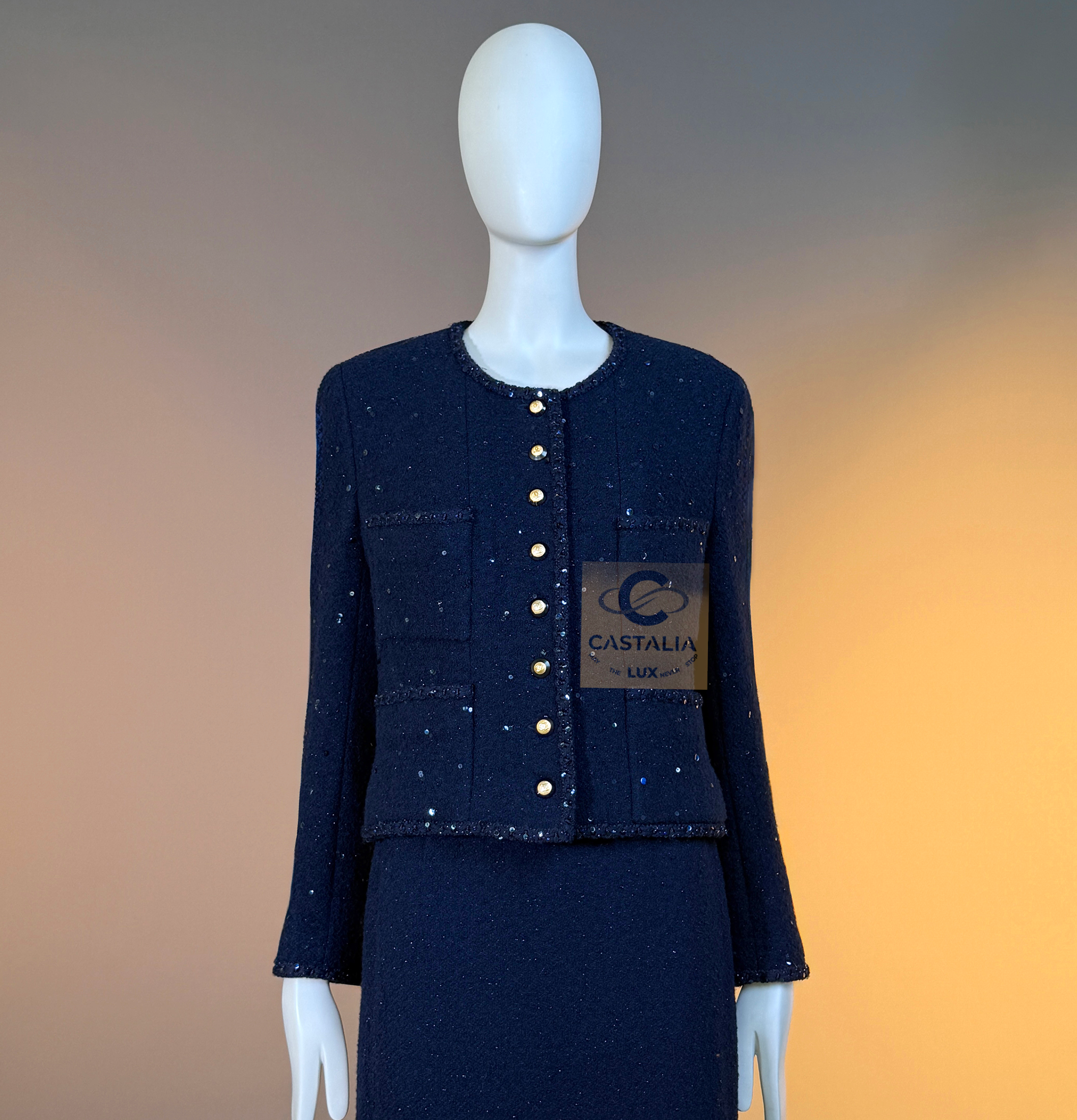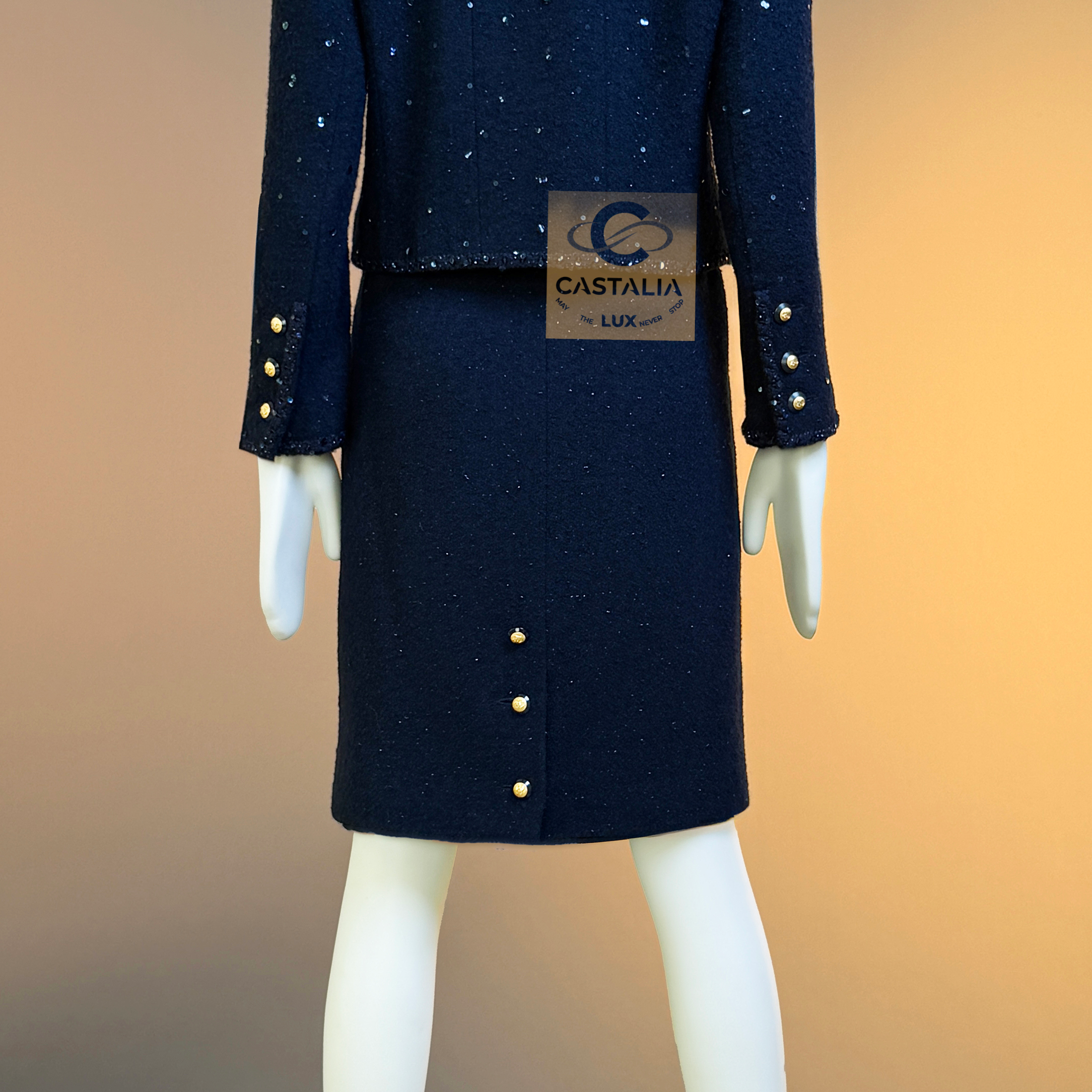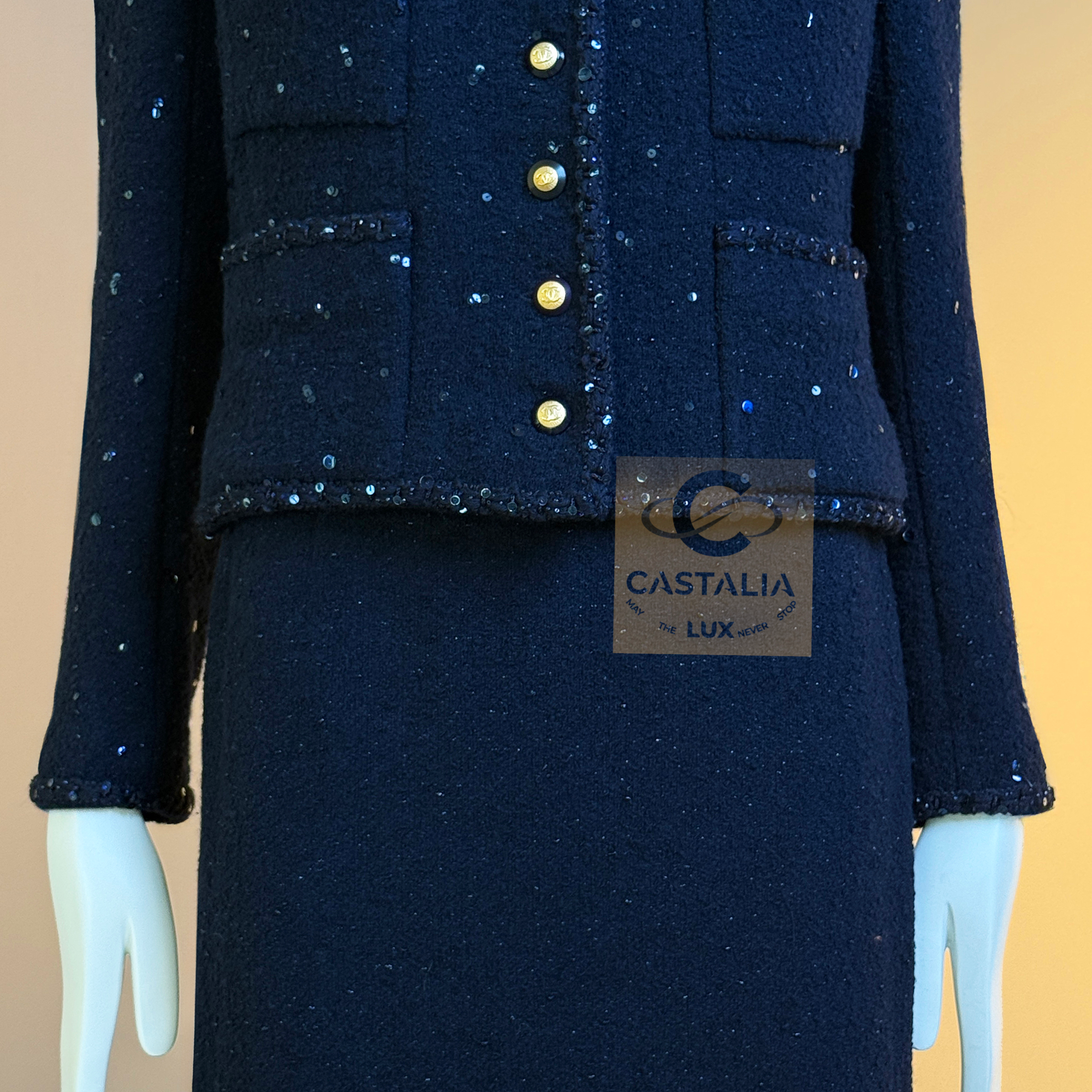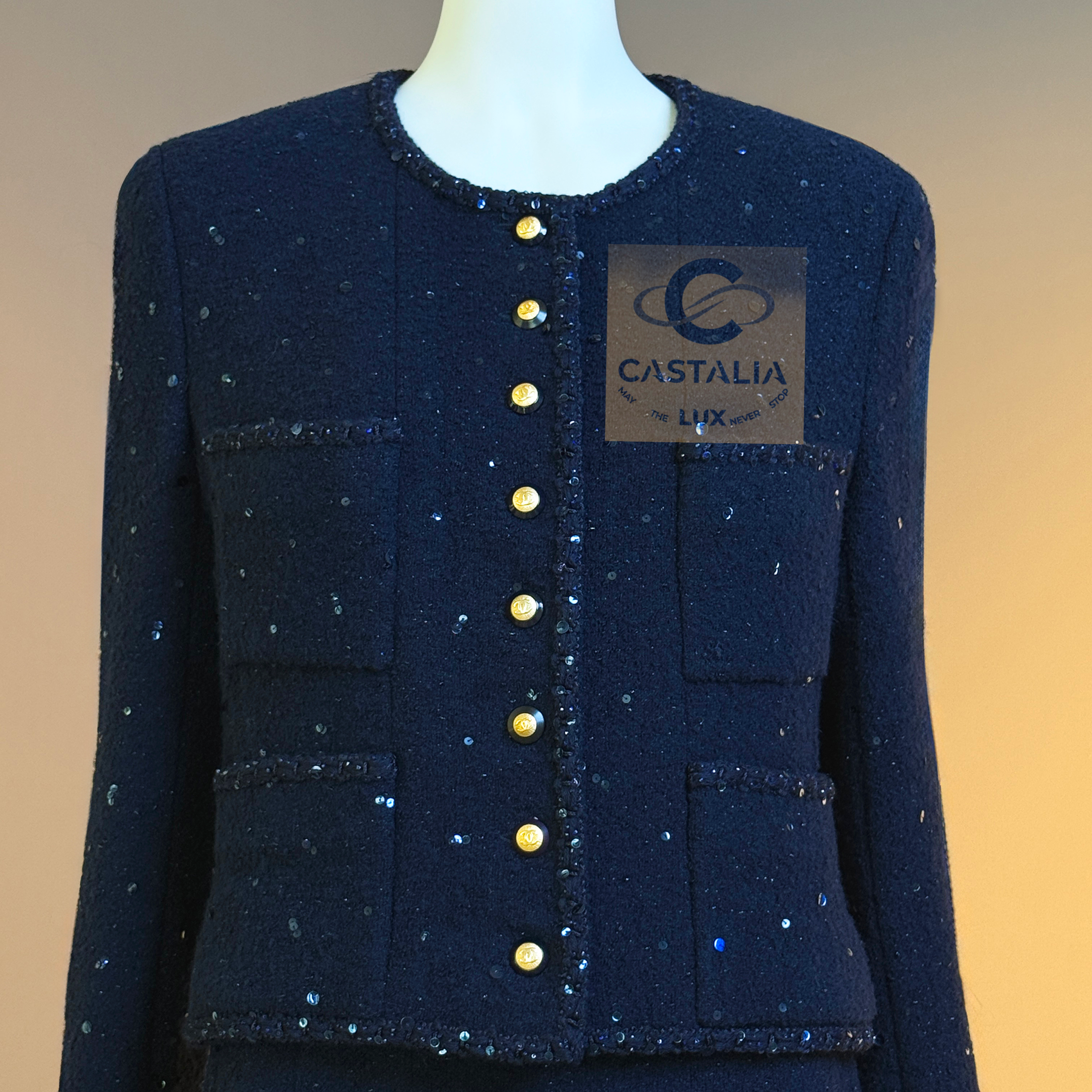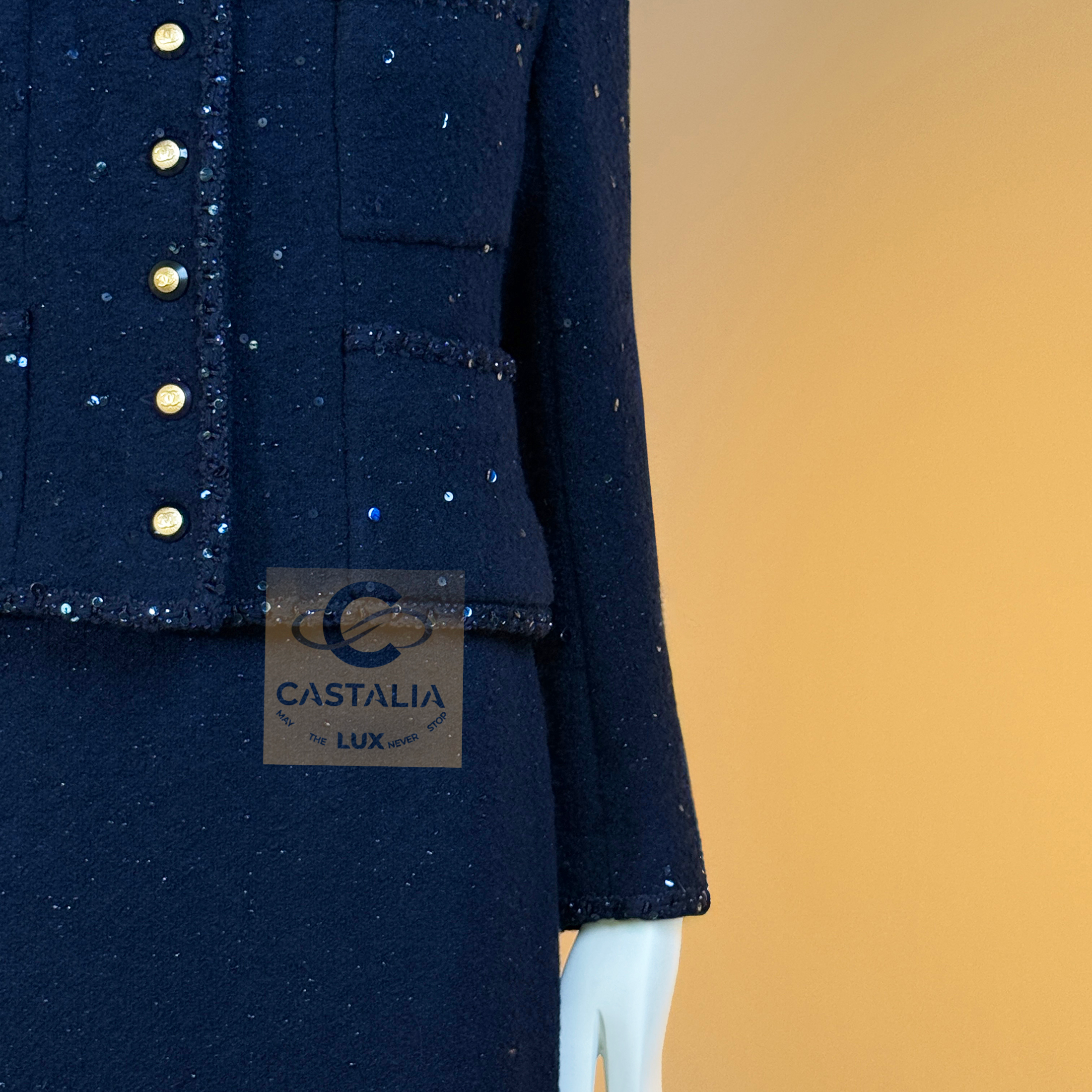 CHANEL · Navy Sequin Tweed Suit with 64-karat Gold Plated CC Buttons — Fall 1993 Runway by Karl Lagerfeld • Museum level value, rarest connoisseur’s find — A Fall 1993 relic in two pieces — Chanel’s navy written as night architecture, then salted with sequins like starlight caught in cloth — This is the Supermodel-era code at full strength — a suit so complete in its language it becomes hard to replace, hard to repeat, and nearly impossible to truly find again // Size mark 44 FR / Condition: never worn // — House Codes · Material Authority — • Signature tweed in noble dark navy — dense, disciplined, and materially deep, built to hold shape like doctrine • Hand-embellished shimmering sequins — constellation scatter across the surface, controlled rather than loud • Signature braided trim throughout — the couture border that frames edges with unmistakable Chanel grammar. — Jewels · Seals · Talisman Hardware — • Masterpiece jewel CC buttons, 64-karat gold-plated — not decoration, but seals: official punctuation down the front — Silhouette · Presence — • Classic Chanel jacket-and-skirt architecture — balanced, formal, and irrevocably legible from across a room • Four-pocket façade on the jacket — the House blueprint, turned ceremonial by sparkle and gold • Tonal silk lining inside — private completion, calm against the skin, exact in drape Please note, the inside labes are detached from the skirt; on the jacket everything intact - size for both pieces 44 FR - may fit 40-42 FR sizes