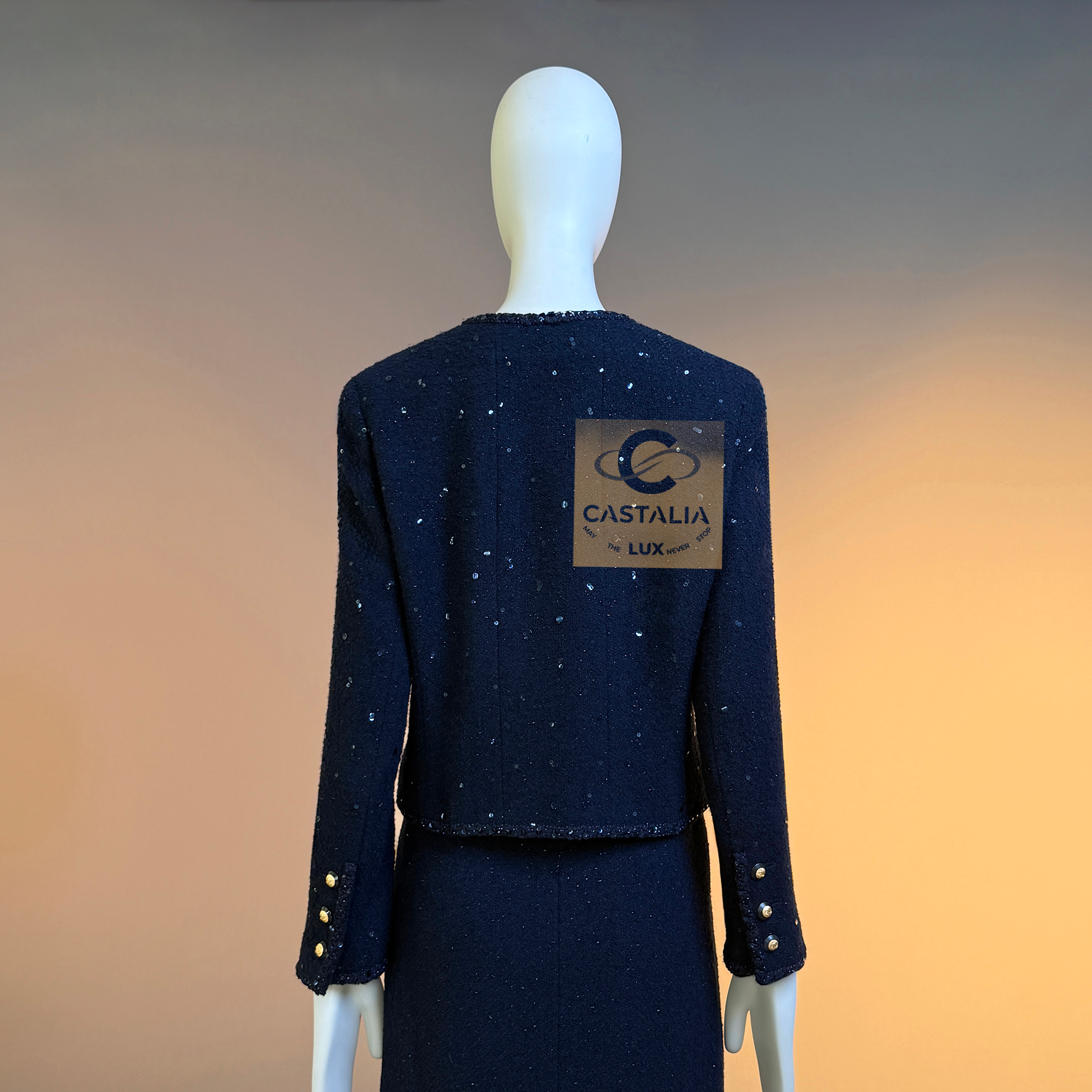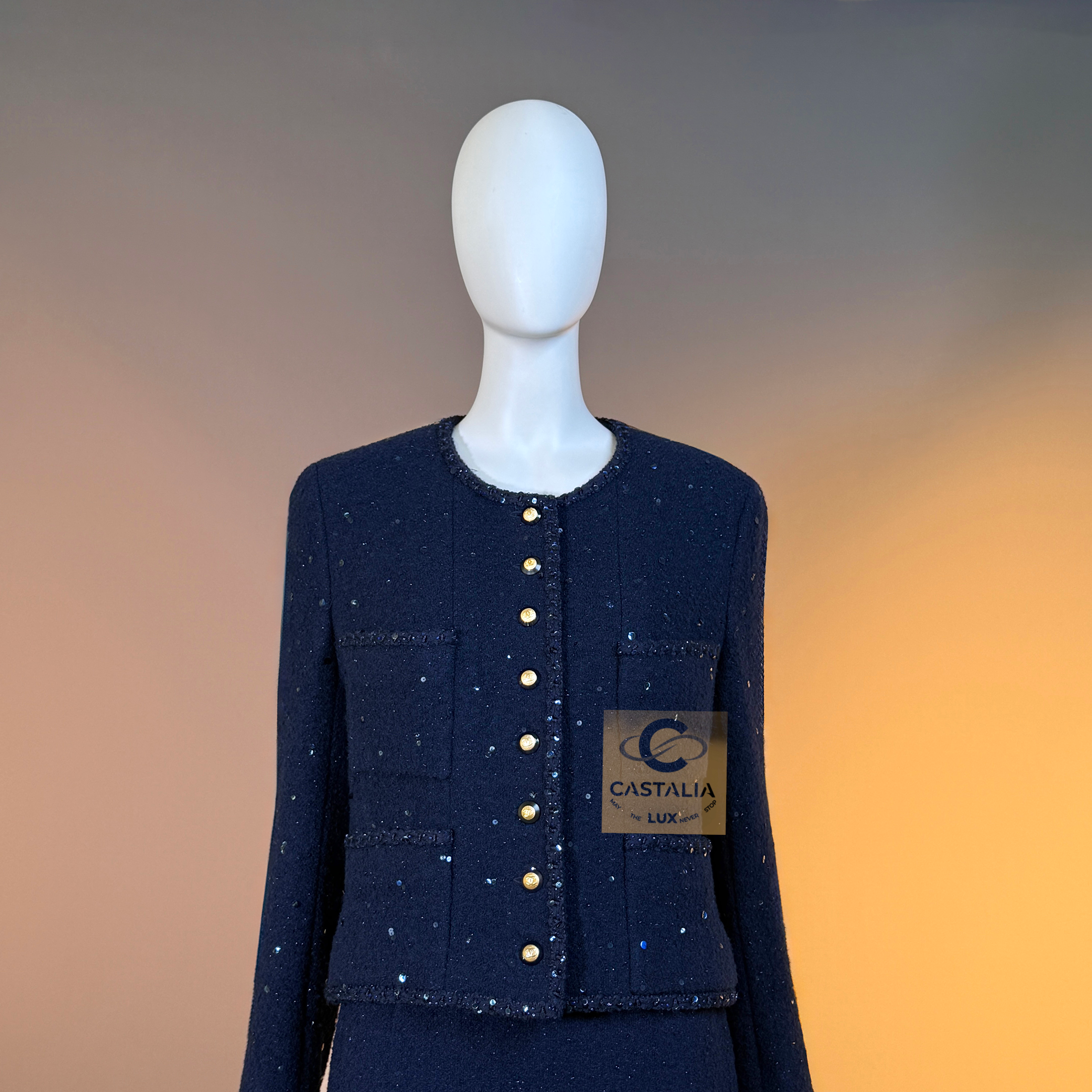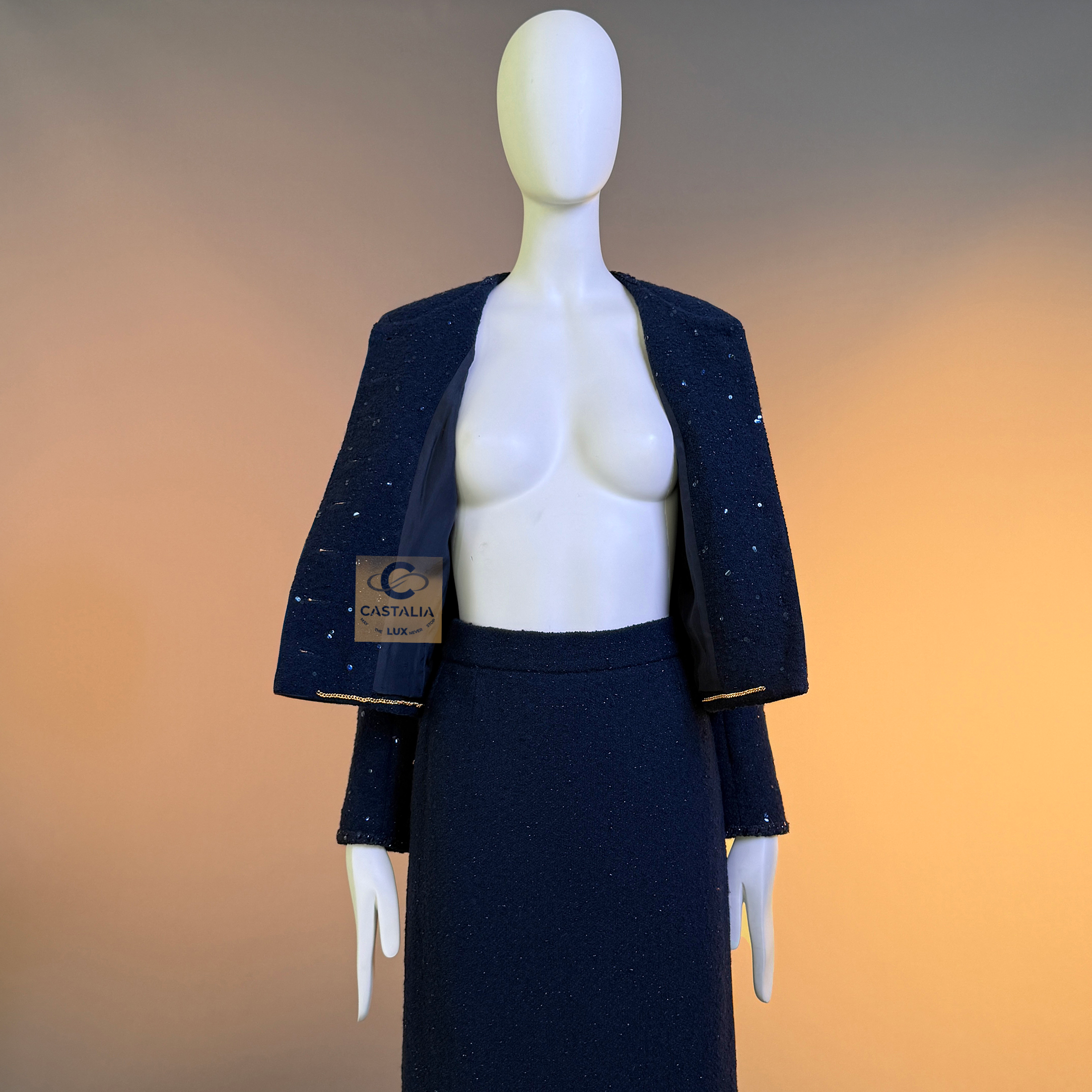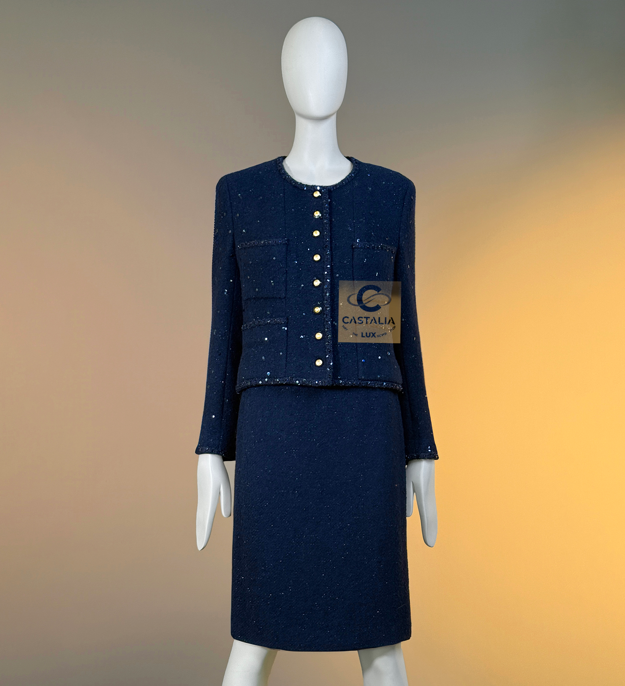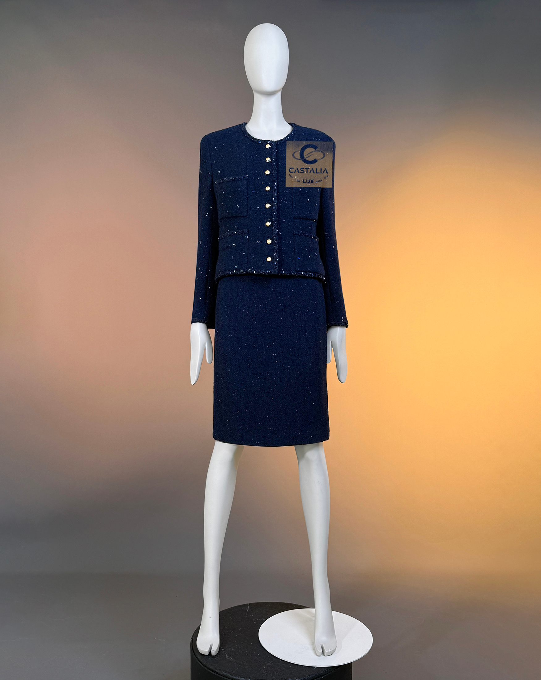 CHANEL · Navy Sequin Tweed Suit with 64-karat Gold Plated CC Buttons — Fall 1993 Runway by Karl Lagerfeld • Museum level value, rarest connoisseur’s find — A Fall 1993 relic in two pieces — Chanel’s navy written as night architecture, then salted with sequins like starlight caught in cloth — This is the Supermodel-era code at full strength — a suit so complete in its language it becomes hard to replace, hard to repeat, and nearly impossible to truly find again // Size mark 44 FR / Condition: never worn // — House Codes · Material Authority — • Signature tweed in noble dark navy — dense, disciplined, and materially deep, built to hold shape like doctrine • Hand-embellished shimmering sequins — constellation scatter across the surface, controlled rather than loud • Signature braided trim throughout — the couture border that frames edges with unmistakable Chanel grammar. — Jewels · Seals · Talisman Hardware — • Masterpiece jewel CC buttons, 64-karat gold-plated — not decoration, but seals: official punctuation down the front — Silhouette · Presence — • Classic Chanel jacket-and-skirt architecture — balanced, formal, and irrevocably legible from across a room • Four-pocket façade on the jacket — the House blueprint, turned ceremonial by sparkle and gold • Tonal silk lining inside — private completion, calm against the skin, exact in drape Please note, the inside labes are detached from the skirt; on the jacket everything intact - size for both pieces 44 FR - may fit 40-42 FR sizes