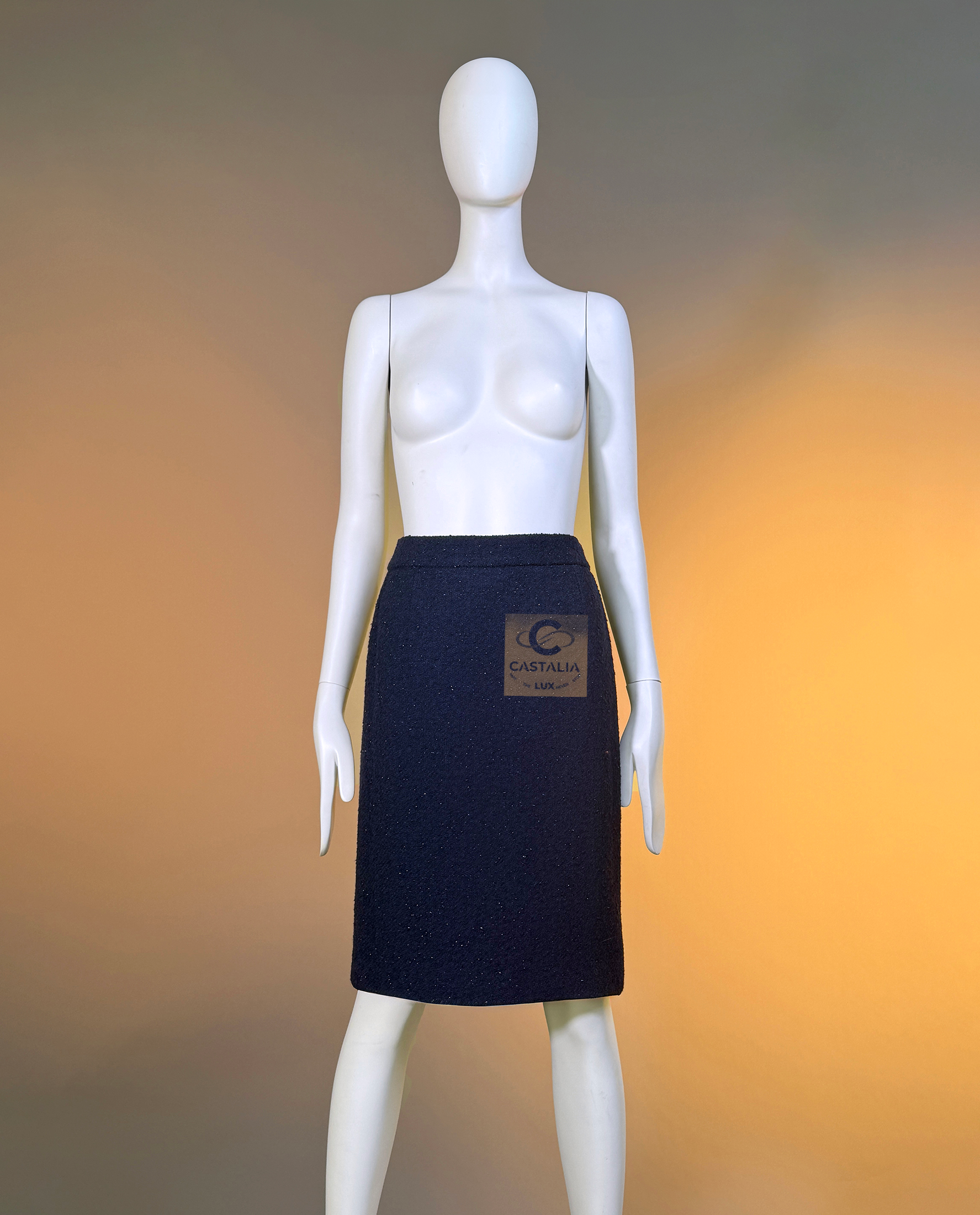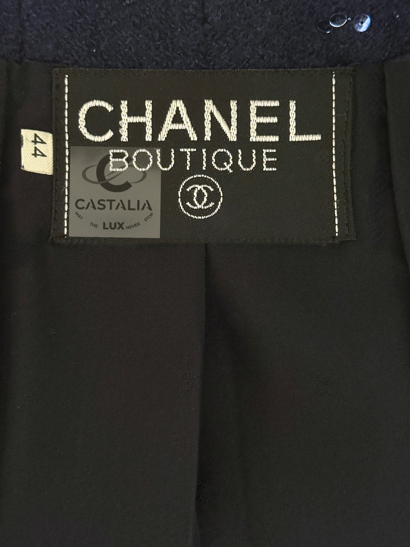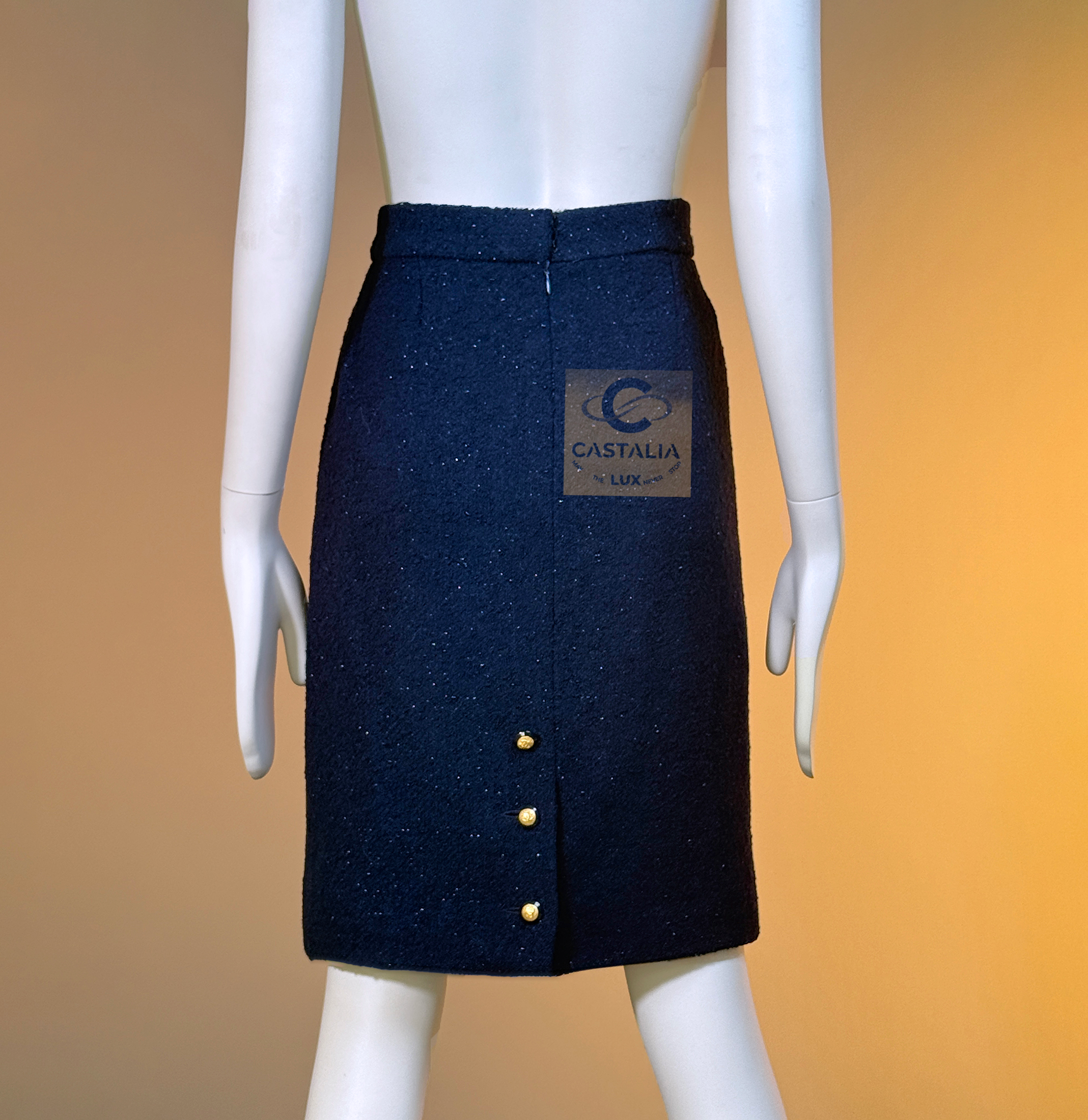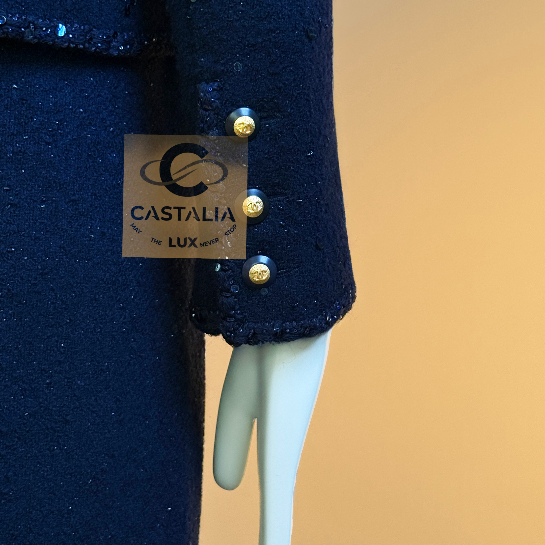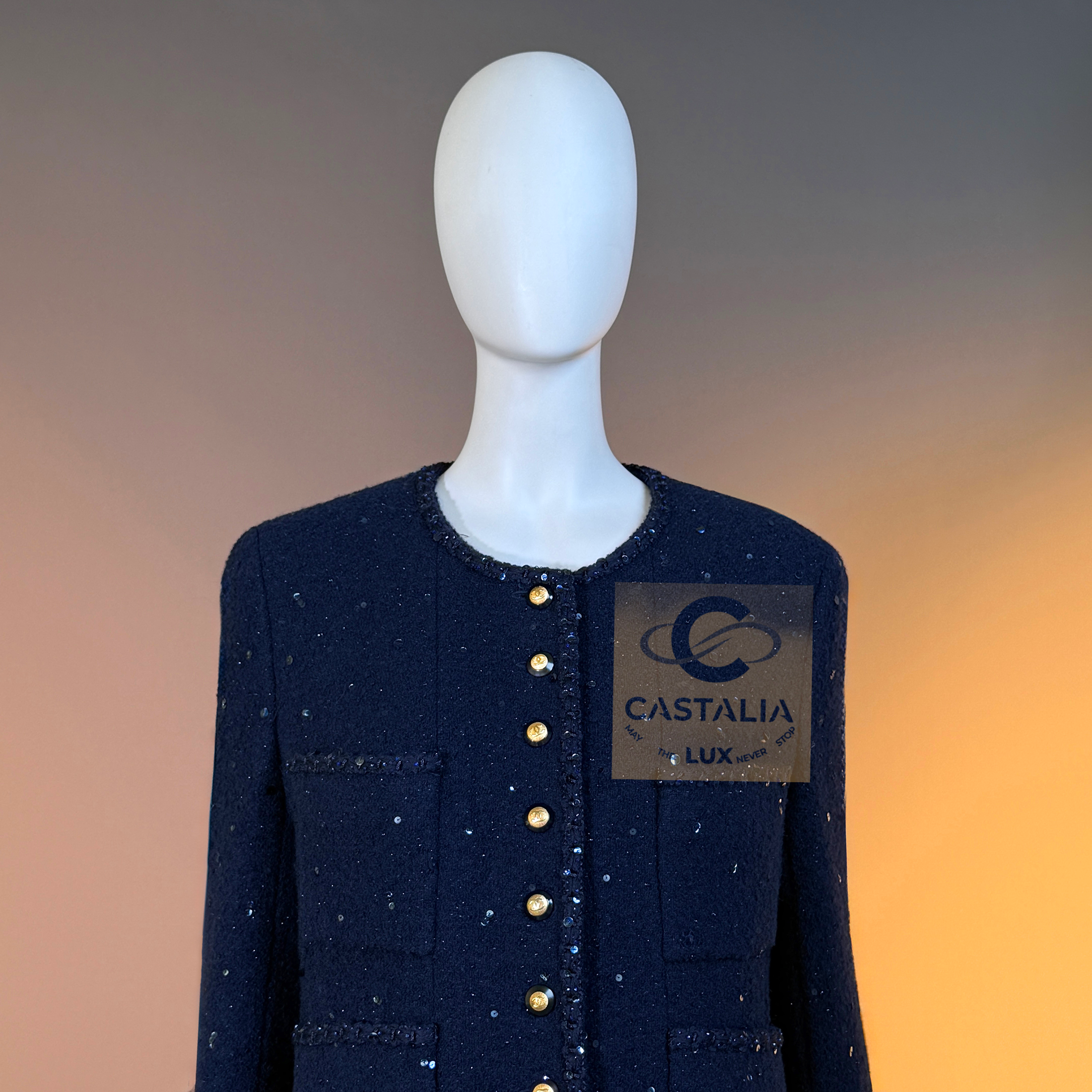 CHANEL · Navy Sequin Tweed Suit with 64-karat Gold Plated CC Buttons — Fall 1993 Runway by Karl Lagerfeld • Museum level value, rarest connoisseur’s find — A Fall 1993 relic in two pieces — Chanel’s navy written as night architecture, then salted with sequins like starlight caught in cloth — This is the Supermodel-era code at full strength — a suit so complete in its language it becomes hard to replace, hard to repeat, and nearly impossible to truly find again // Size mark 44 FR / Condition: never worn // — House Codes · Material Authority — • Signature tweed in noble dark navy — dense, disciplined, and materially deep, built to hold shape like doctrine • Hand-embellished shimmering sequins — constellation scatter across the surface, controlled rather than loud • Signature braided trim throughout — the couture border that frames edges with unmistakable Chanel grammar. — Jewels · Seals · Talisman Hardware — • Masterpiece jewel CC buttons, 64-karat gold-plated — not decoration, but seals: official punctuation down the front — Silhouette · Presence — • Classic Chanel jacket-and-skirt architecture — balanced, formal, and irrevocably legible from across a room • Four-pocket façade on the jacket — the House blueprint, turned ceremonial by sparkle and gold • Tonal silk lining inside — private completion, calm against the skin, exact in drape Please note, the inside labes are detached from the skirt; on the jacket everything intact - size for both pieces 44 FR - may fit 40-42 FR sizes