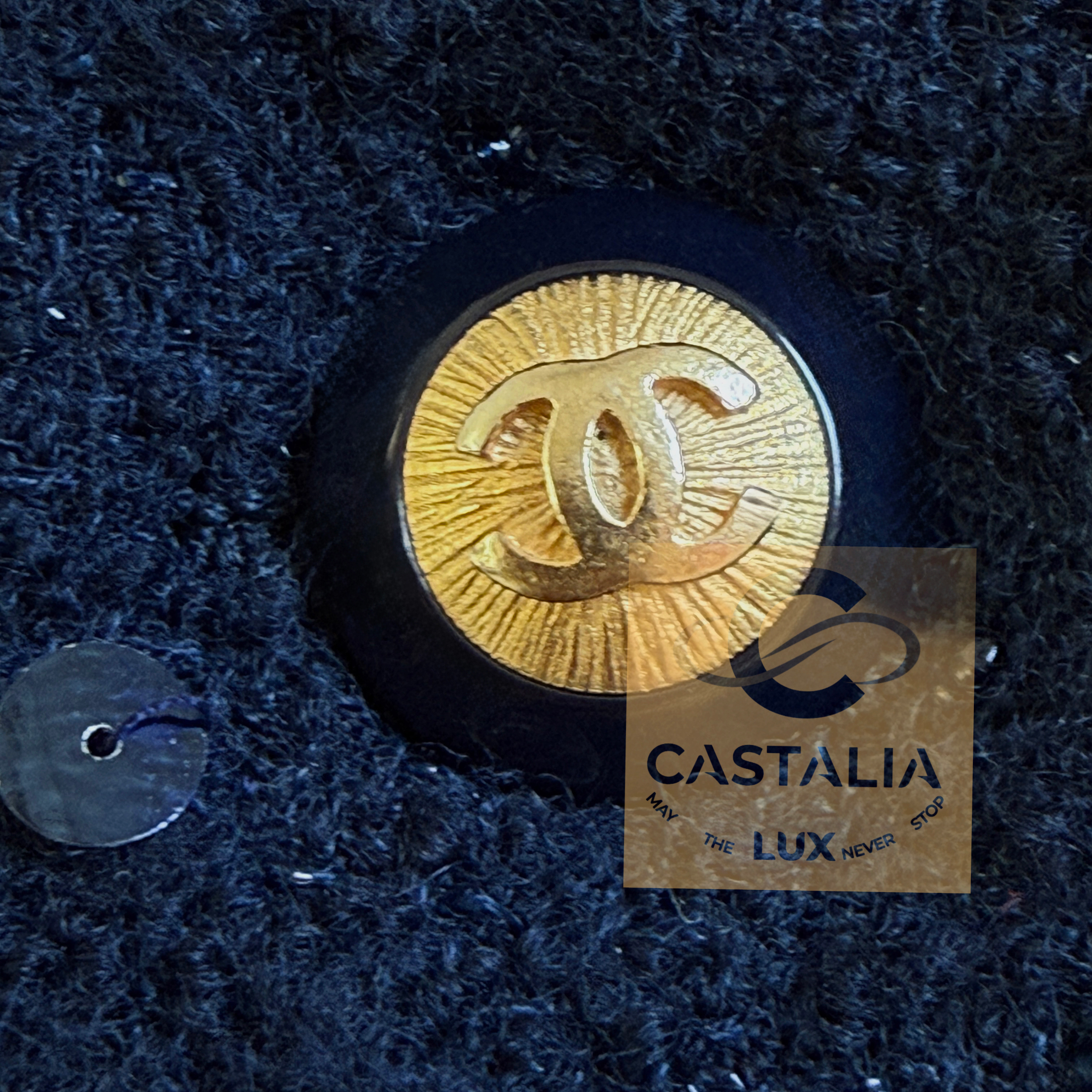 CHANEL · Navy Sequin Tweed Suit with 64-karat Gold Plated CC Buttons