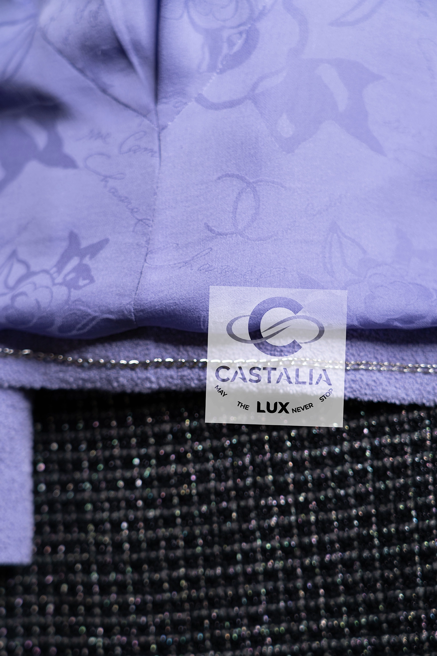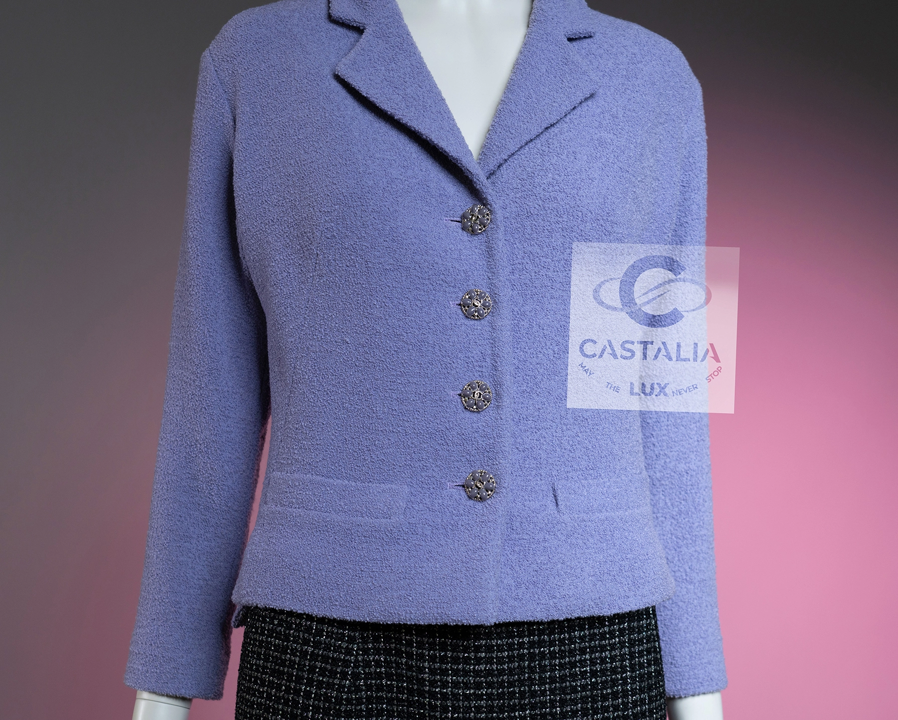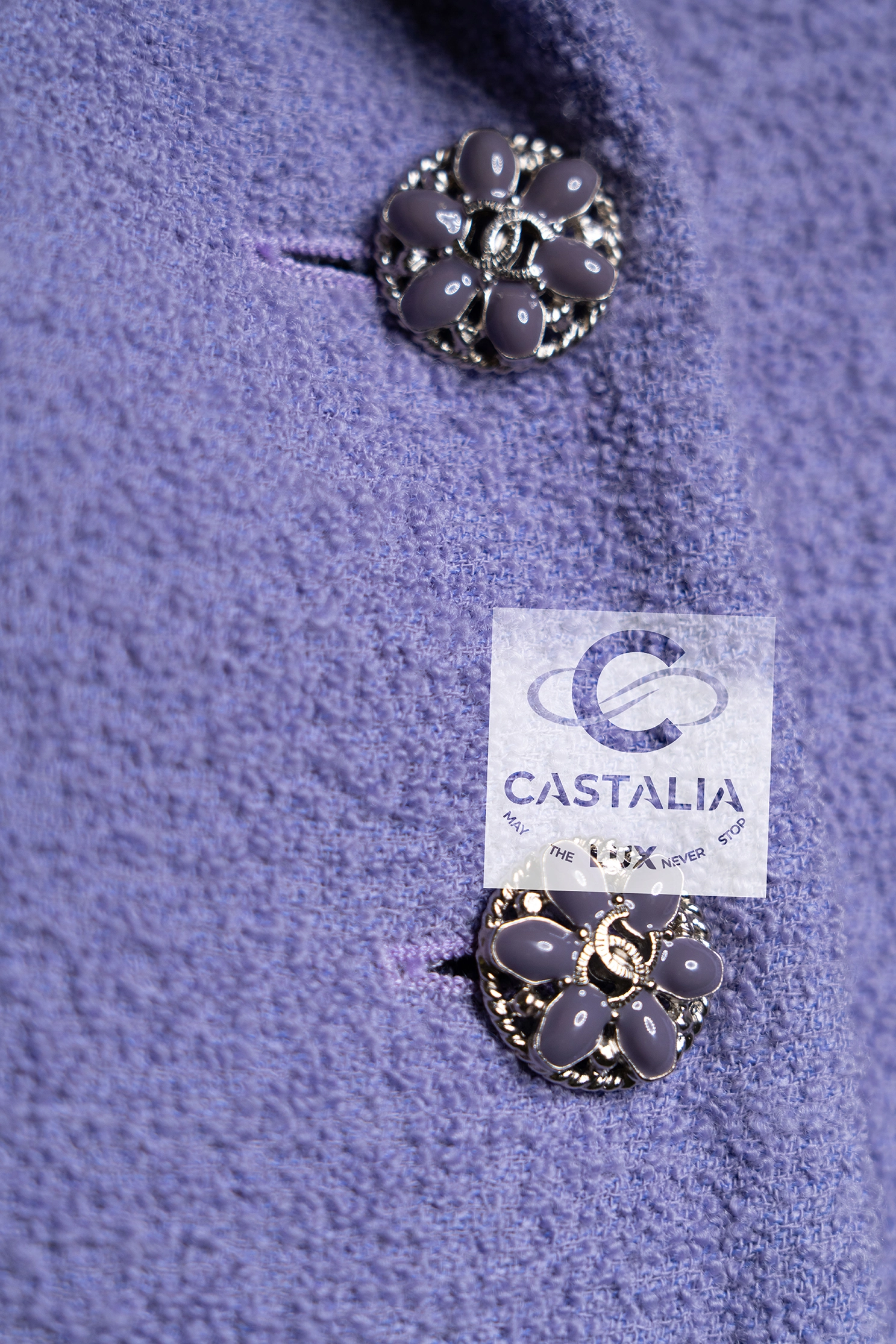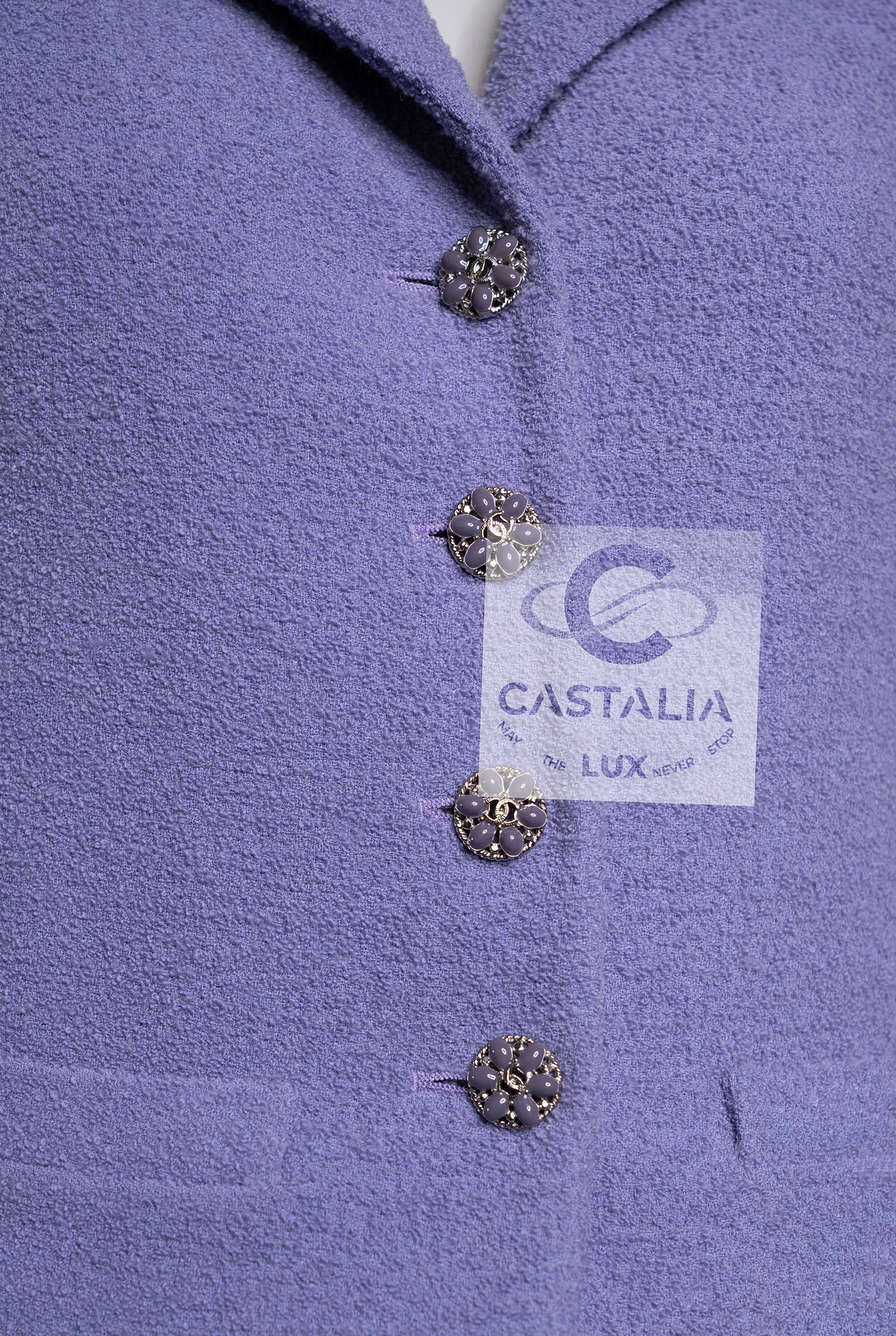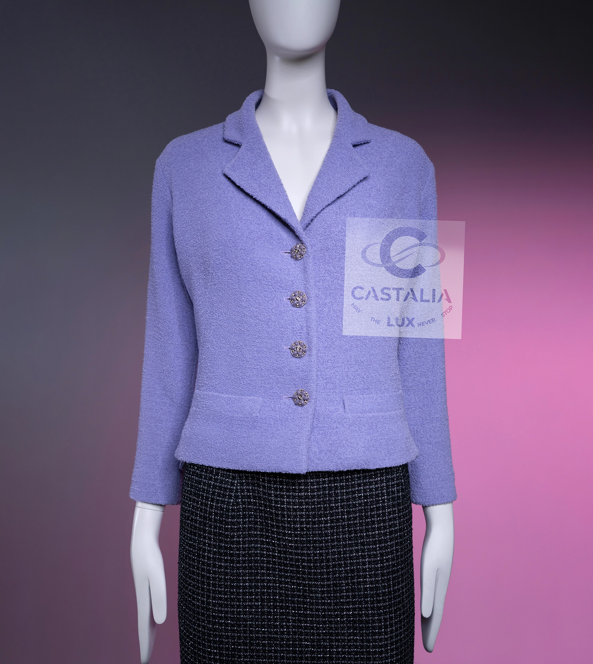 CHANEL · Collector’s Lavender Tweed Jacket with most beautiful Jewel Gripoix Buttons in history — French RIVIERA Cruise Collection by Karl Lagerfeld — A collector’s piece for connoisseurs who understand that in lavender lies not only color, but eternity A rare relic of Karl Lagerfeld’s Riviera vision // Size mark 36 FR / Condition: never worn // — Woven in signature lavender tweed, the jacket radiates the calm clarity of dawn over the Côte d’Azur — Adorned with luminous Gripoix CC jewel buttons, each encircled with stones and crystals like constellations pinned to fabric — Inside, a tonal silk-like lining , anchored by the weight of the chain-link hem, ensuring the eternal drape of couture