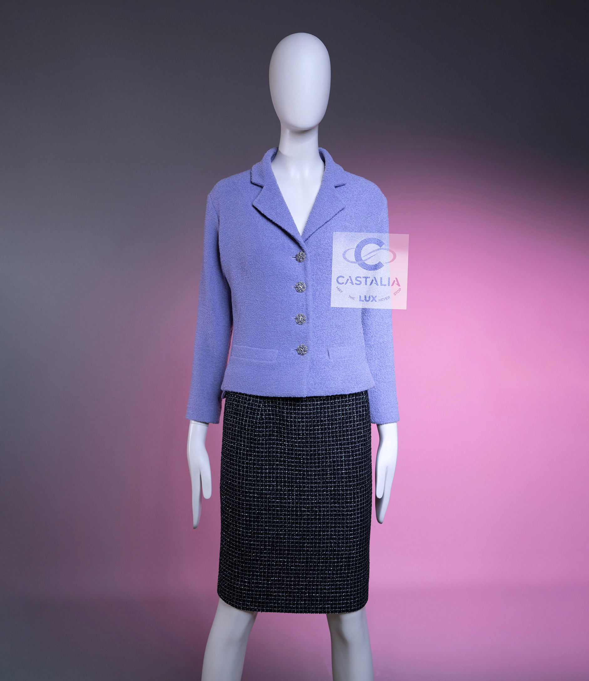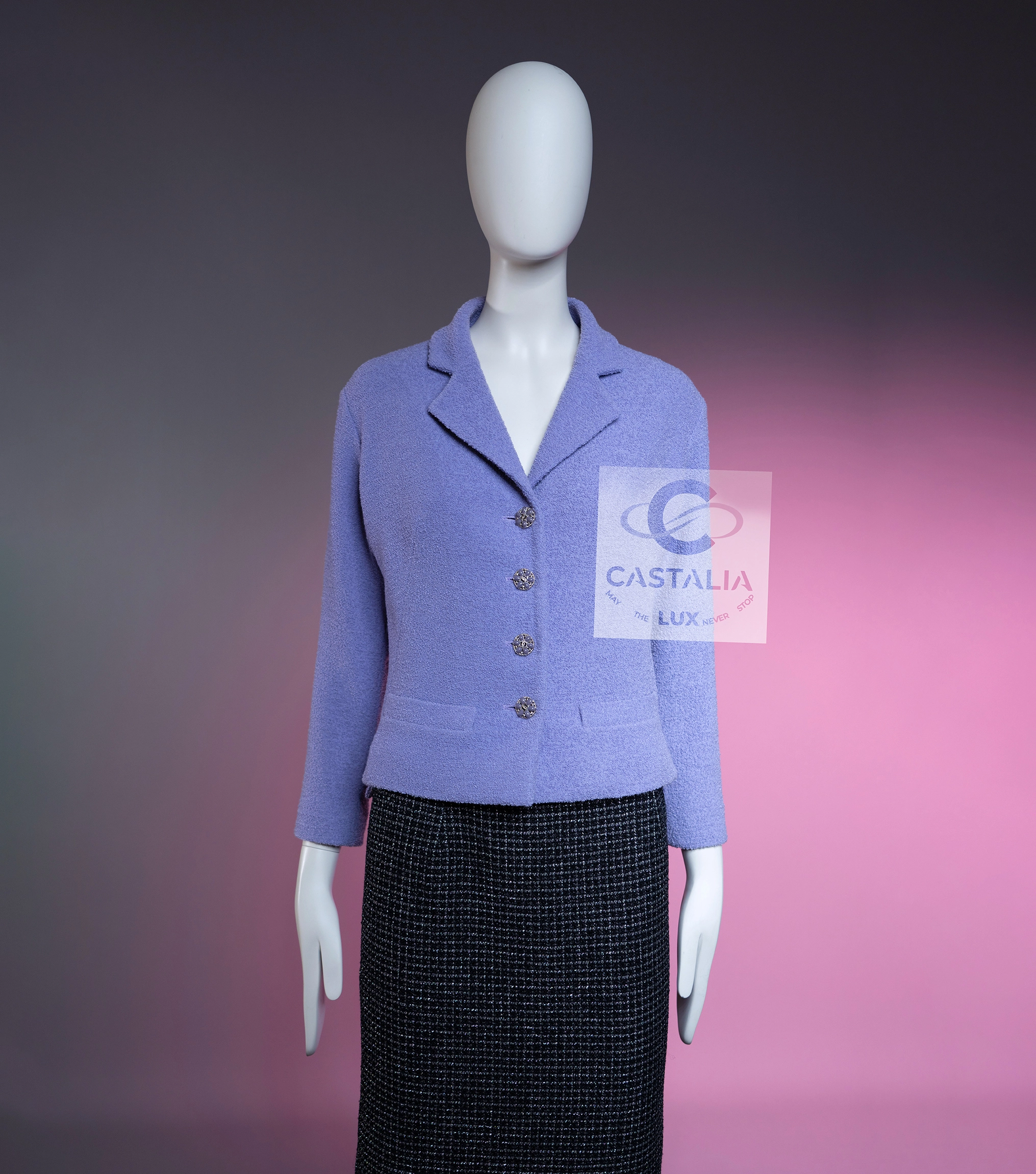 — Woven in signature lavender tweed, the jacket radiates the calm clarity of dawn over the Côte d’Azur