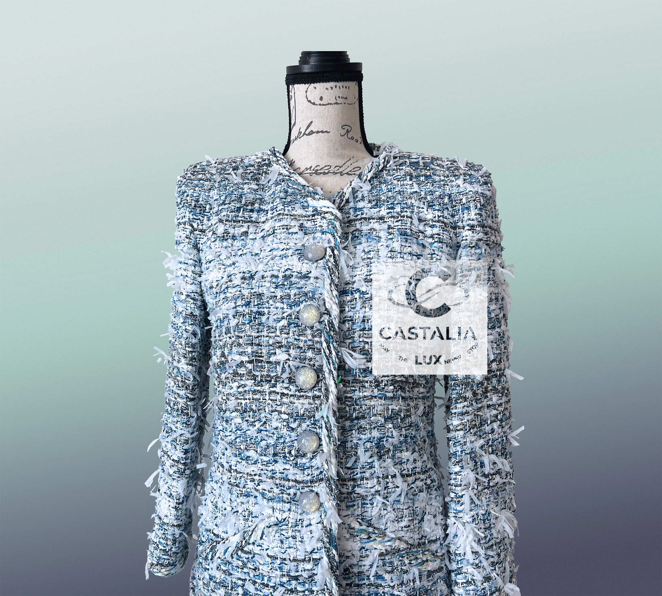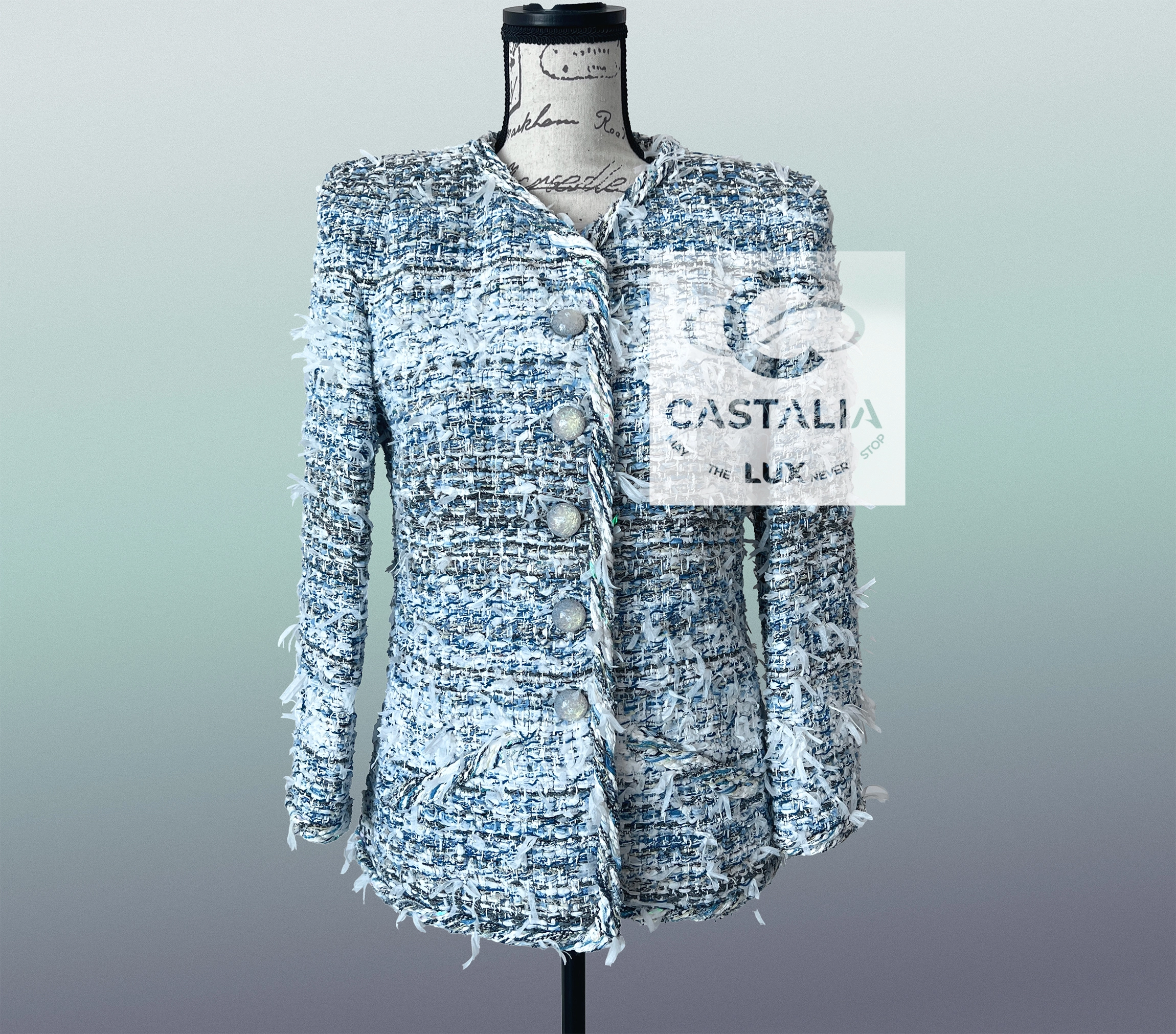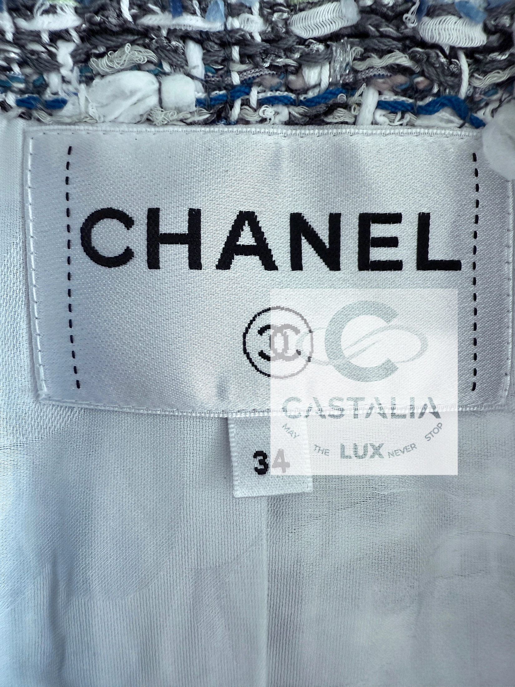 ~ A Garment of Flow, Glimmer, and Eternal Return ~ From the Spring 2018 “Waterfall” Runway — a season where Karl Lagerfeld reimagined the language of nature through couture — emerges this sublime Chanel jacket, sculpted in an extraordinary Lesage eyelash tweed, as if woven from the memory of water itself ~ Original boutique value: Over $13,000 A collector’s dream — this is not merely a jacket, but a metaphysical vestment of liquidity, refinement, and renewal. // Size mark 34 FR / Condition: never worn // — color story evokes a liquid palette — glacial blue, silver mist, crystalline foam — cascading in tonal gradients that echo alpine streams and hidden grottoes — Every thread whispers liquidity; every fringe a drop caught in motion. — Adorned with CC-logo Shimmer Illuminous buttons, these luminous orbs shimmer like sunlit dew on stone, anchoring the jacket’s ethereal presence with silent prestige — lined in tonal silk jacquard with camellias, an intimate signature of Chanel's mythos. A chain link at the hem seals the weight of tradition beneath the surface of lightness