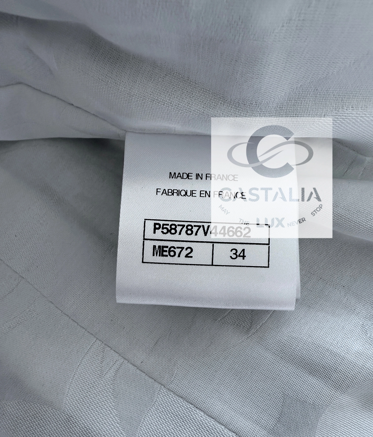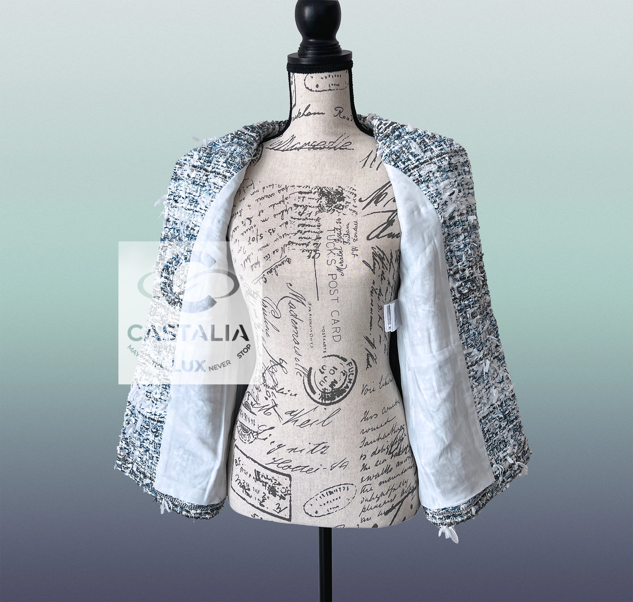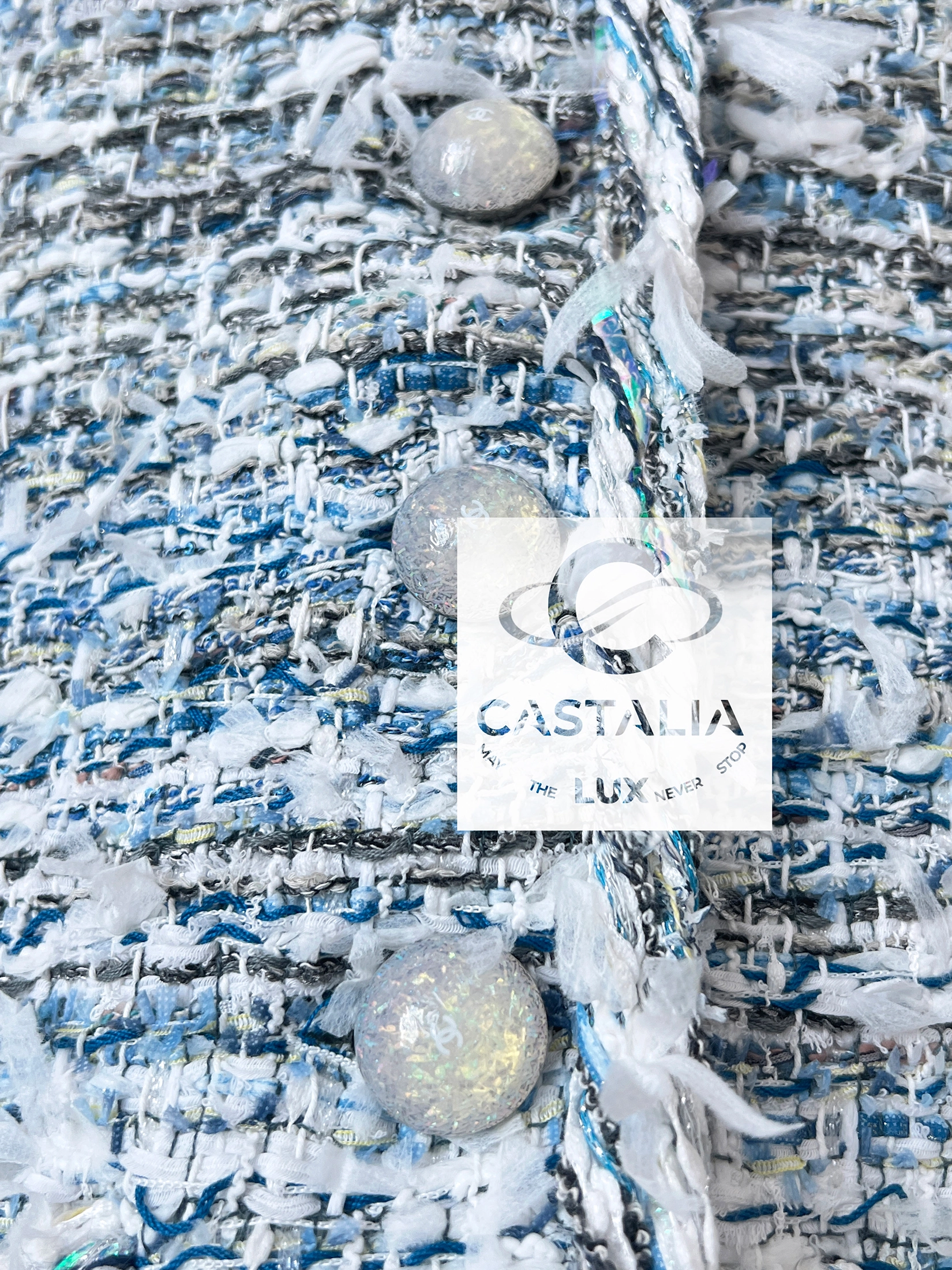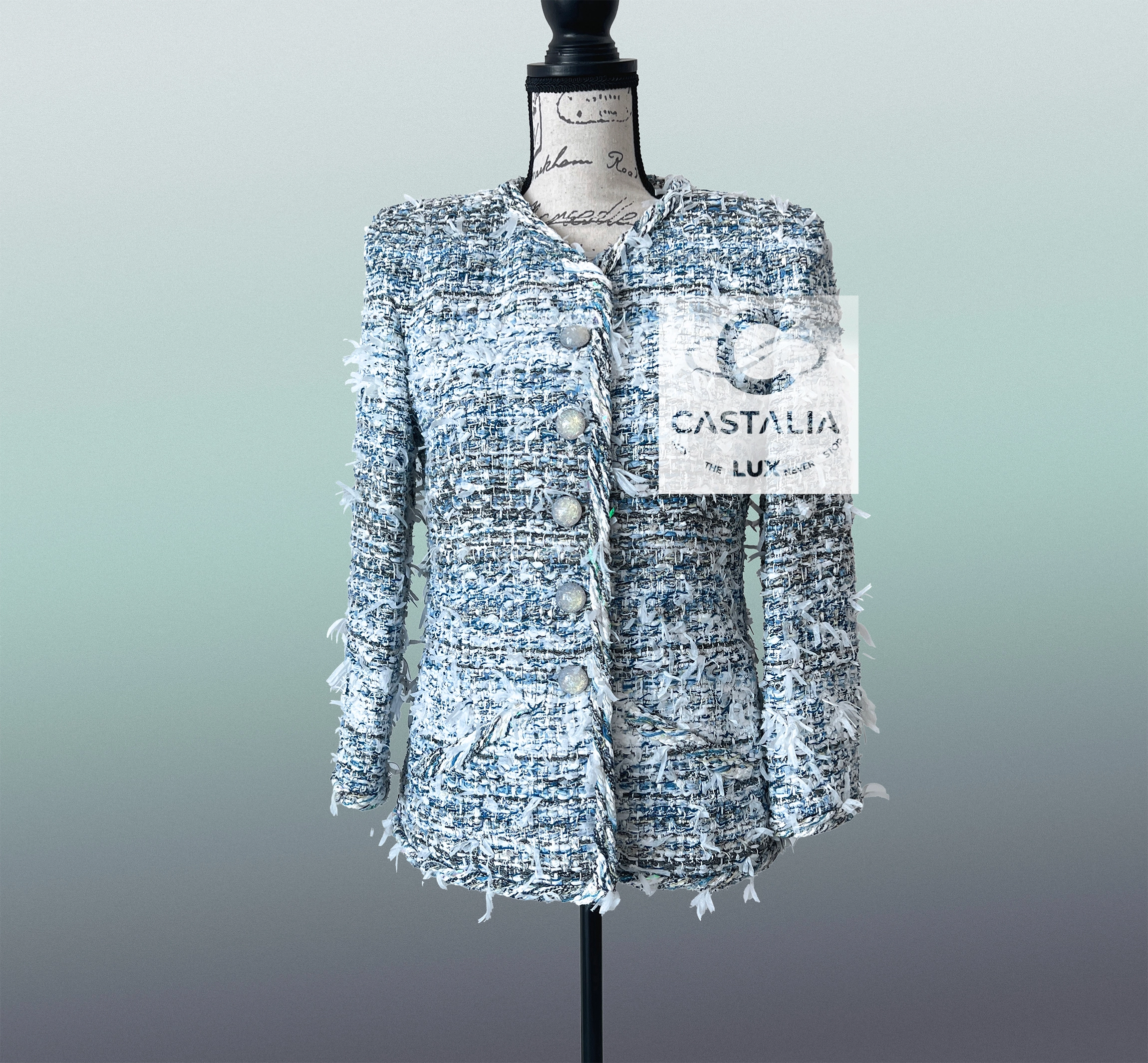 ~ A Garment of Flow, Glimmer, and Eternal Return ~ From the Spring 2018 “Waterfall” Runway — a season where Karl Lagerfeld reimagined the language of nature through couture — emerges this sublime Chanel jacket, sculpted in an extraordinary Lesage eyelash tweed, as if woven from the memory of water itself ~ Original boutique value: Over $13,000 A collector’s dream — this is not merely a jacket, but a metaphysical vestment of liquidity, refinement, and renewal. // Size mark 34 FR / Condition: never worn // — color story evokes a liquid palette — glacial blue, silver mist, crystalline foam — cascading in tonal gradients that echo alpine streams and hidden grottoes — Every thread whispers liquidity; every fringe a drop caught in motion. — Adorned with CC-logo Shimmer Illuminous buttons, these luminous orbs shimmer like sunlit dew on stone, anchoring the jacket’s ethereal presence with silent prestige — lined in tonal silk jacquard with camellias, an intimate signature of Chanel's mythos. A chain link at the hem seals the weight of tradition beneath the surface of lightness